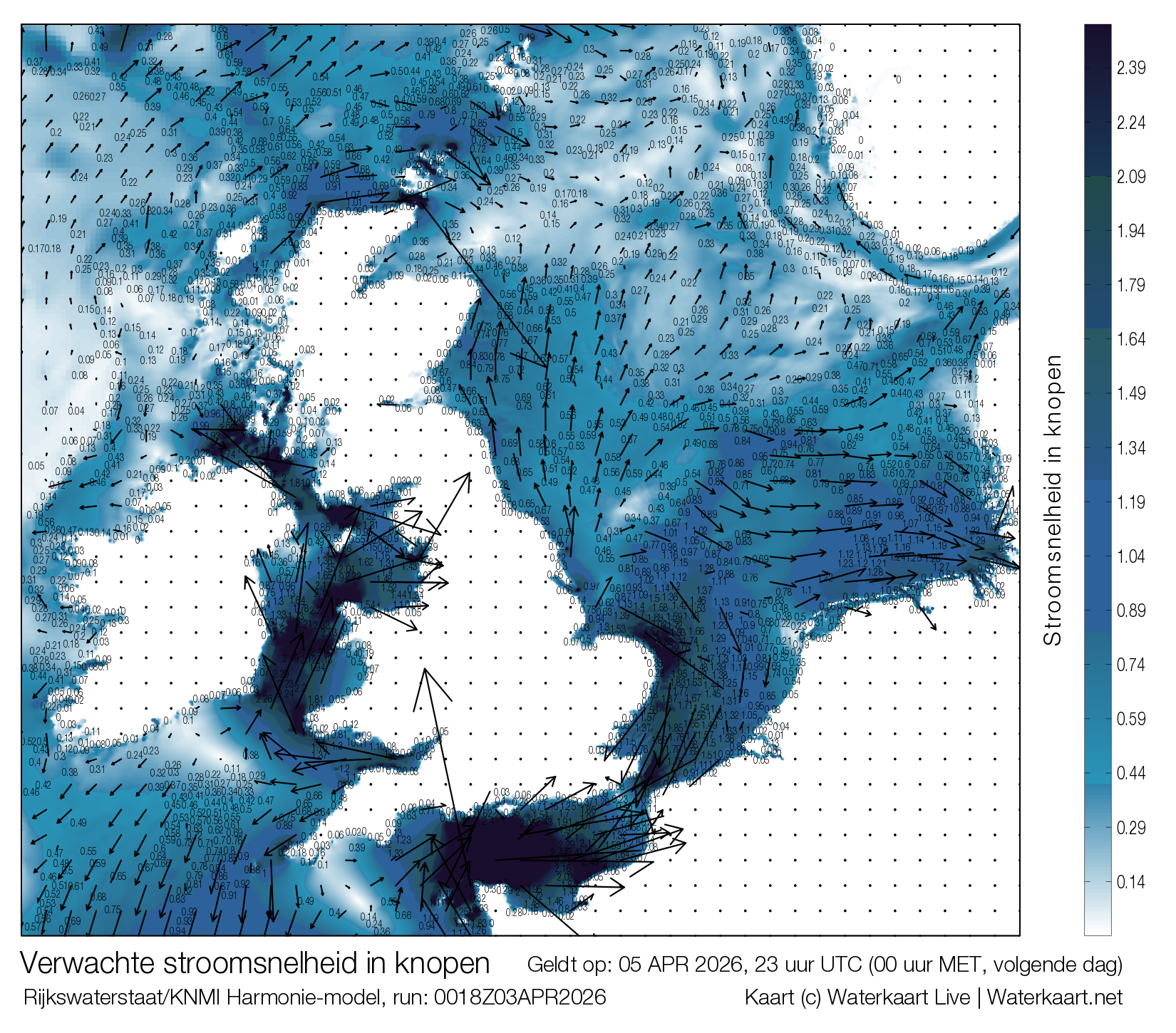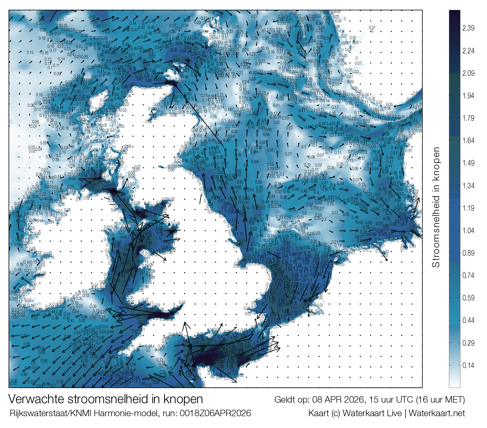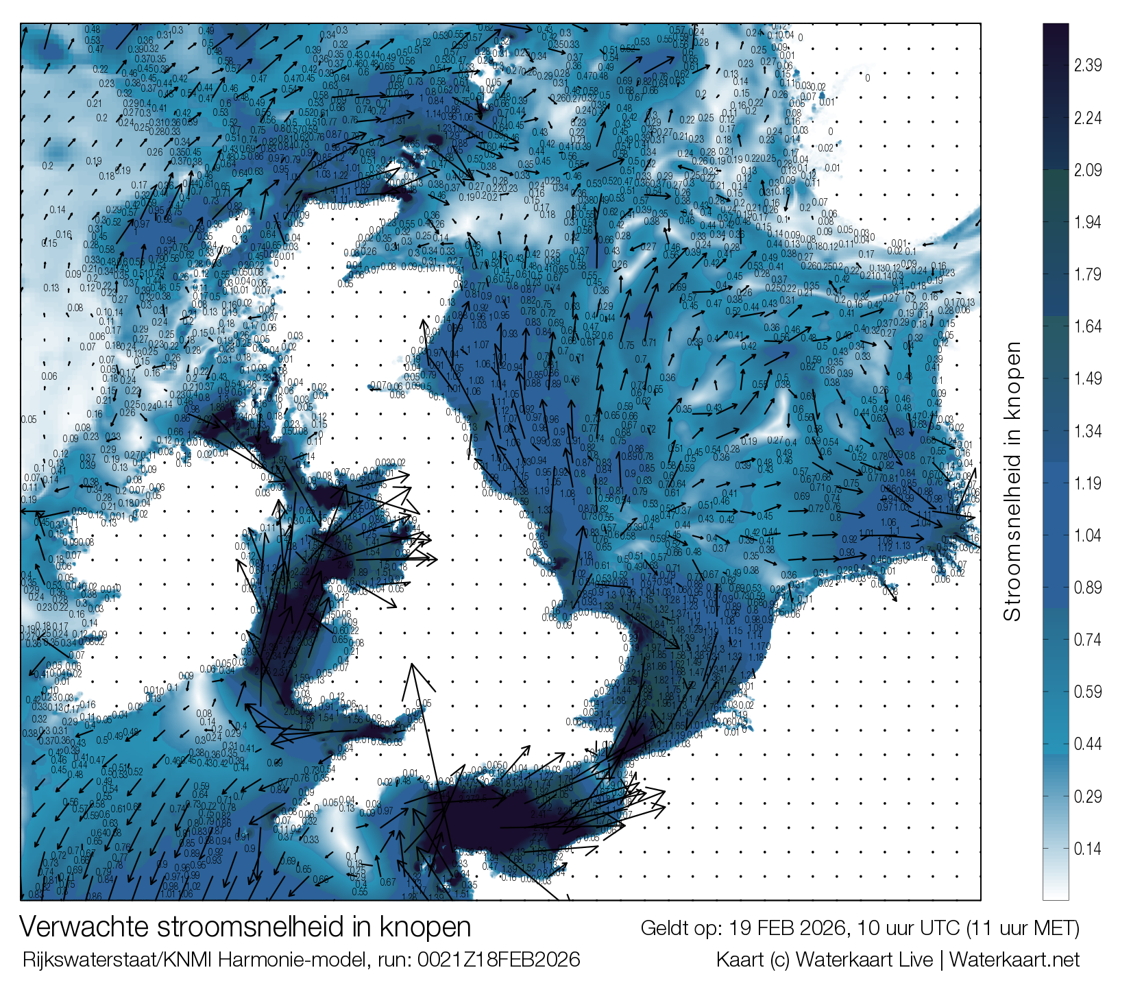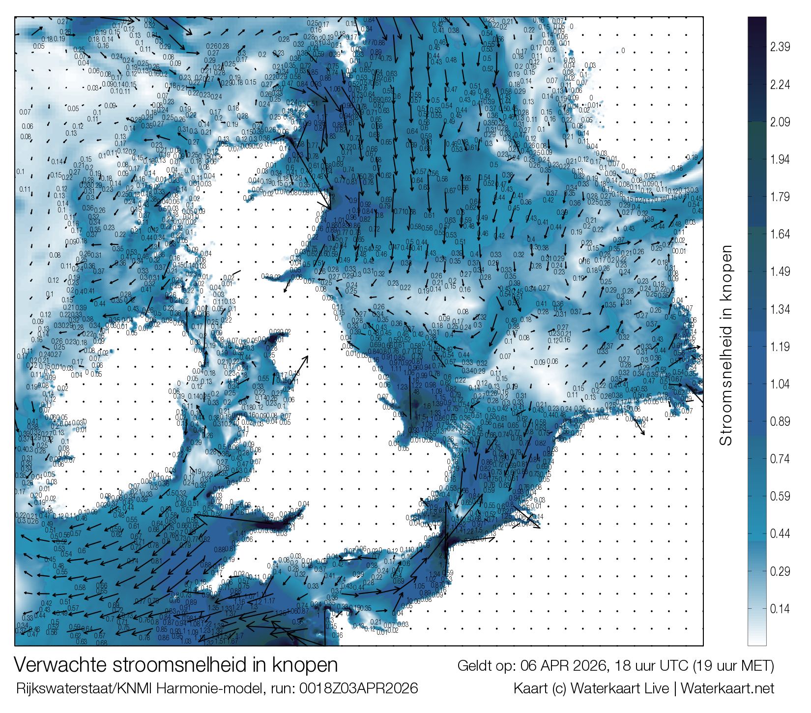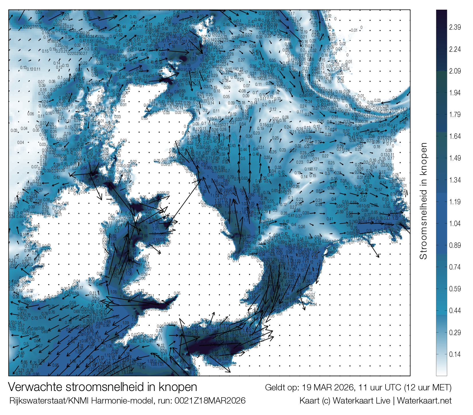 Stroomsnelheden in de Noordzee op basis van de Stroomatlas, verrekend met weersinvloeden. Deze worden iedere dag ververst met data uit het zeestromingen model van Rijkswaterstaat op basis van Harmonie weerdata, voor ieder uur een kaart, tot 48 uur in de toekomst. Lees hieronder meer over dit model