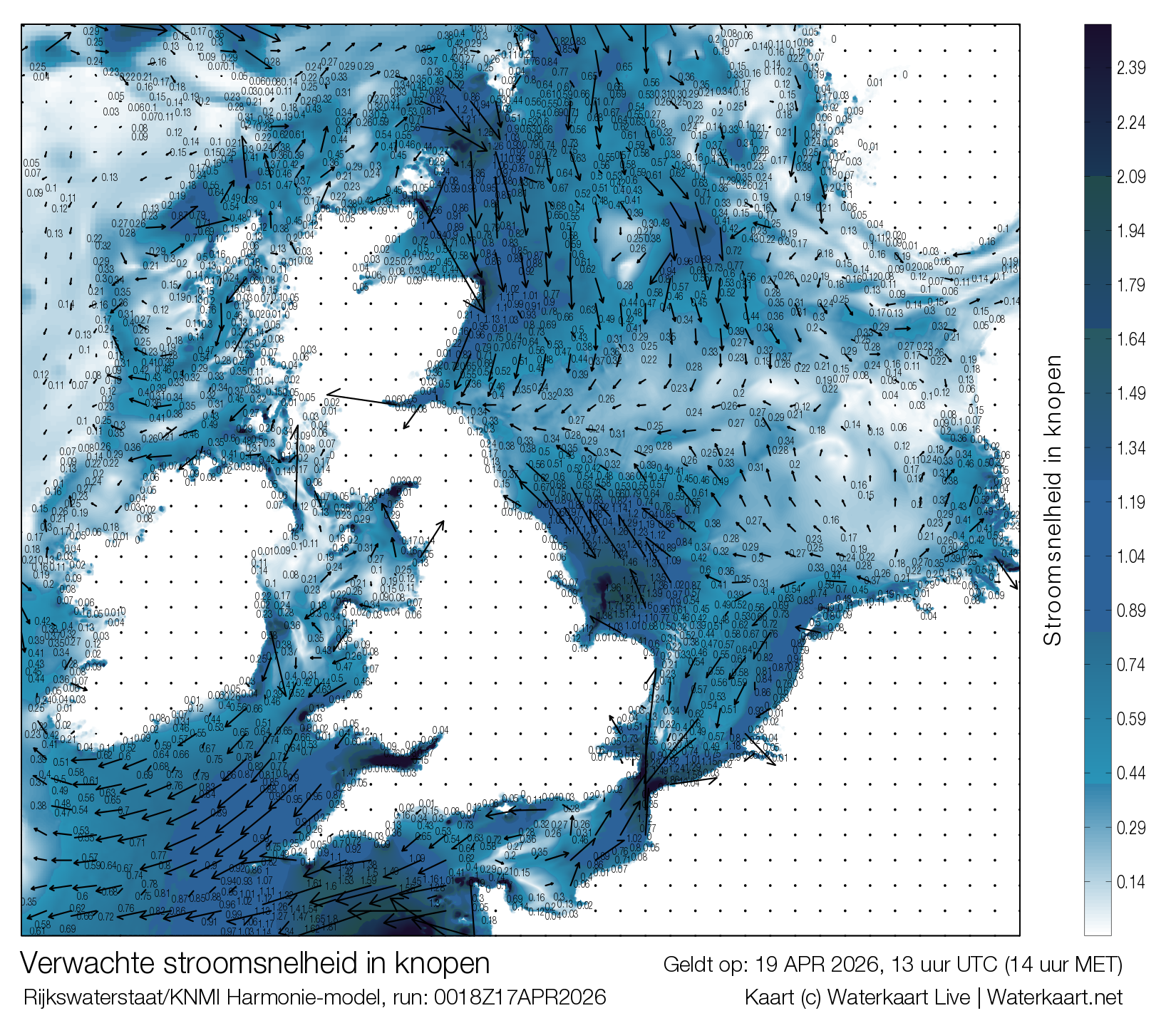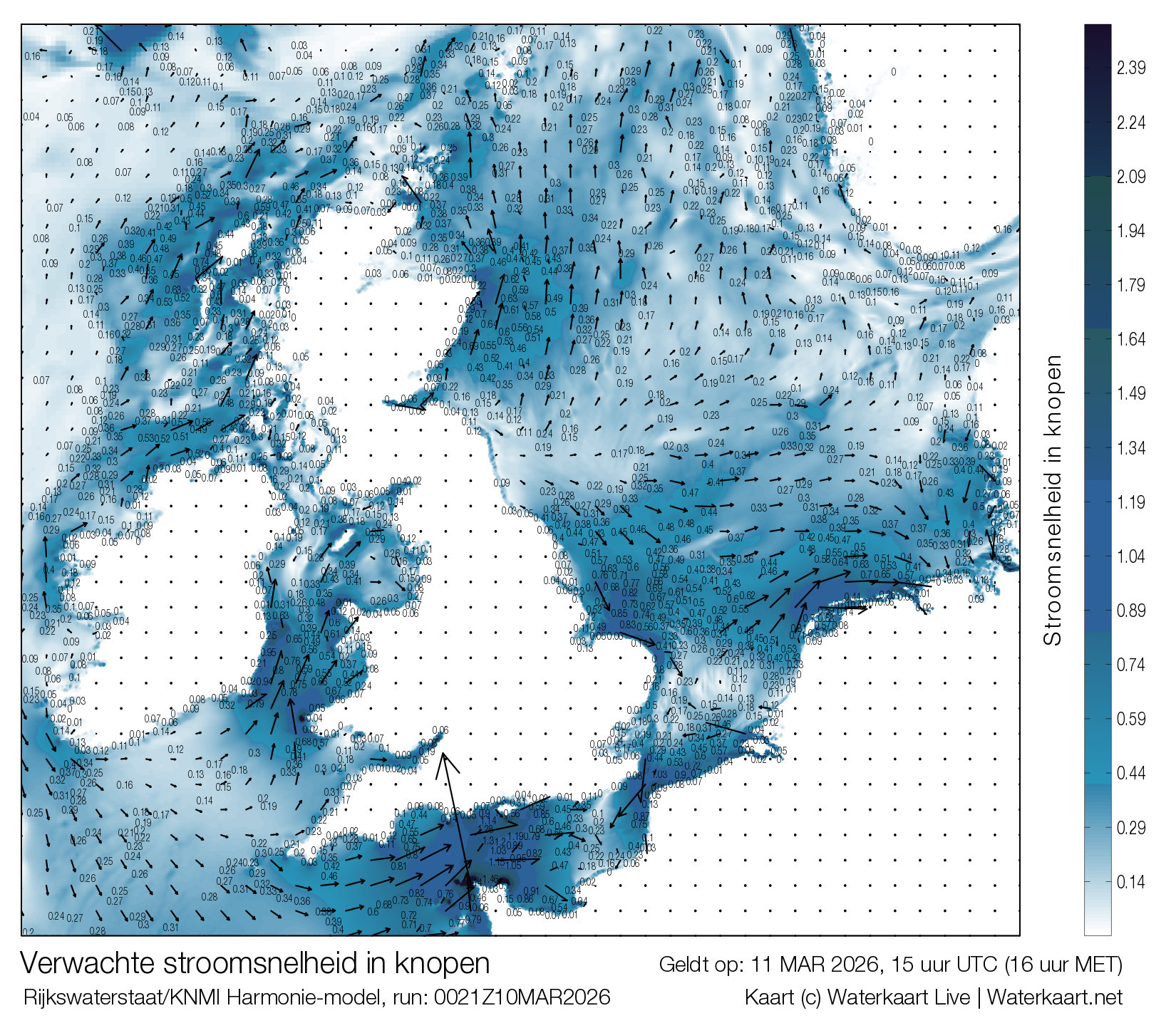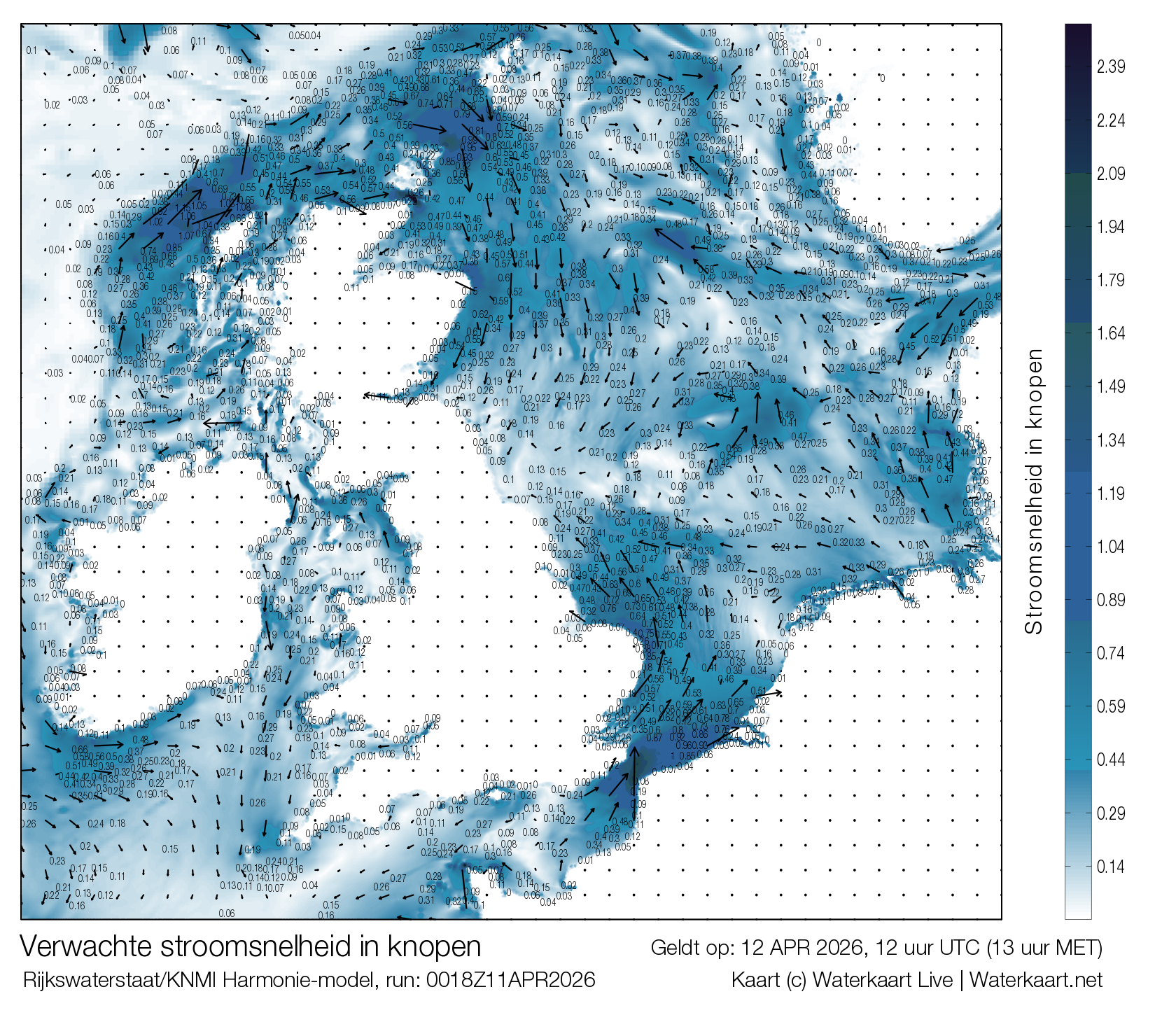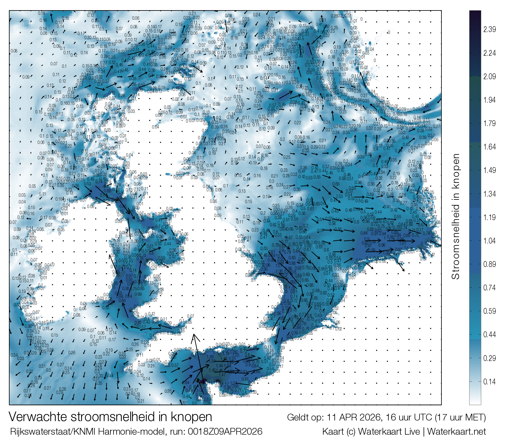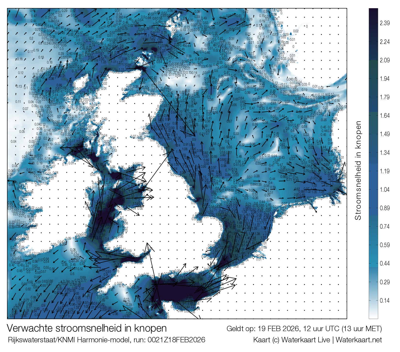 Stroomsnelheden in de Noordzee op basis van de Stroomatlas, verrekend met weersinvloeden. Deze worden iedere dag ververst met data uit het zeestromingen model van Rijkswaterstaat op basis van Harmonie weerdata, voor ieder uur een kaart, tot 48 uur in de toekomst. Lees hieronder meer over dit model