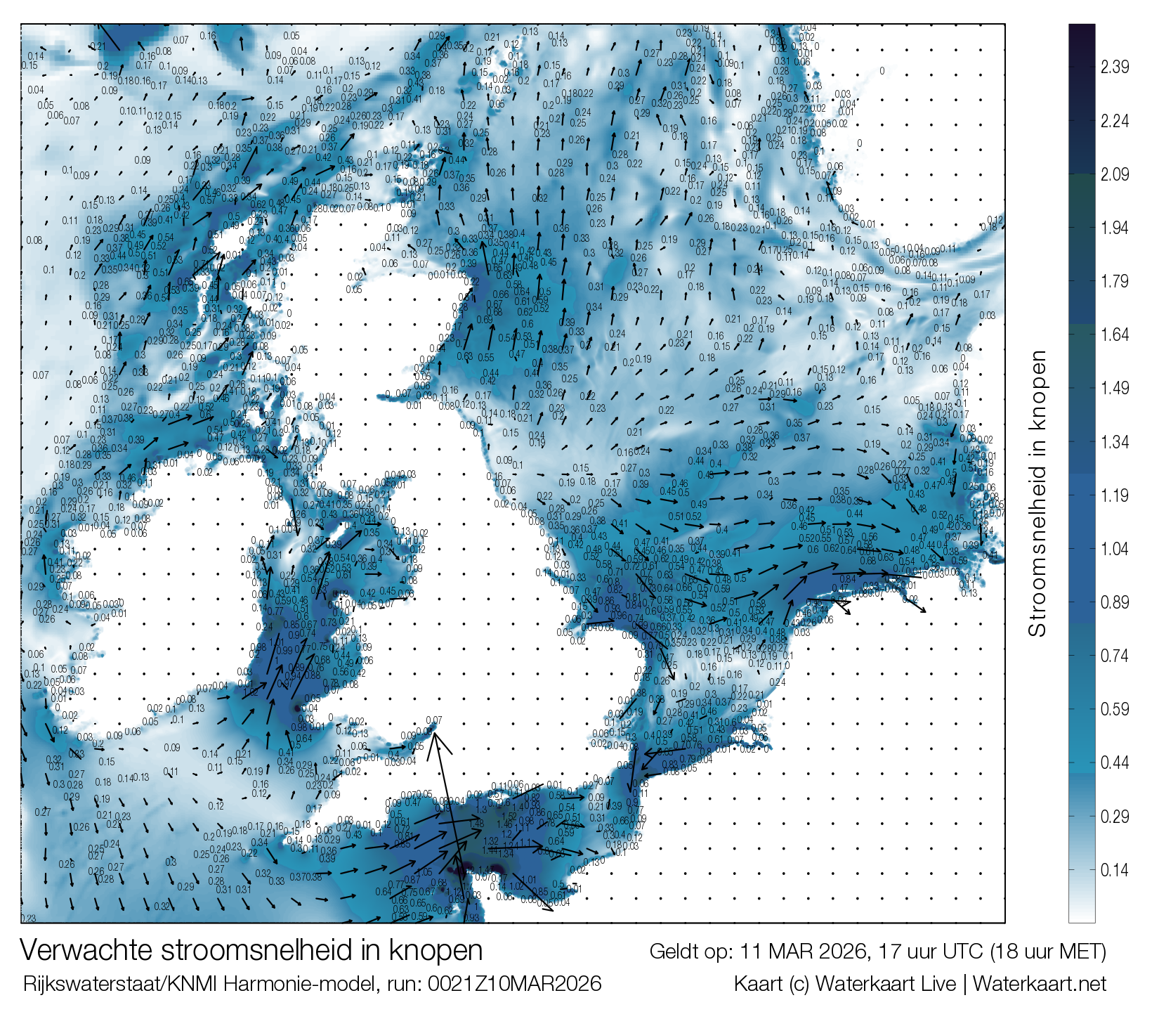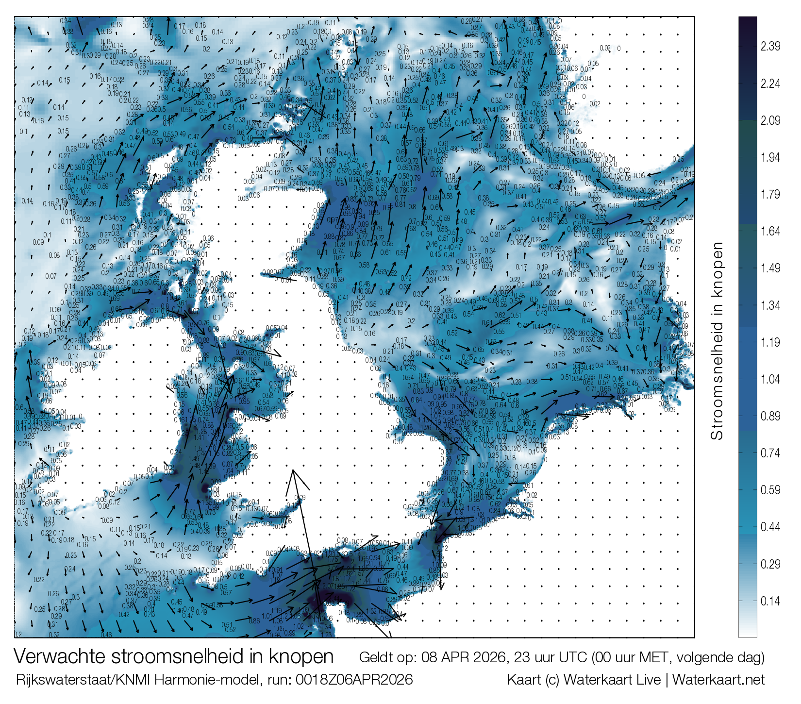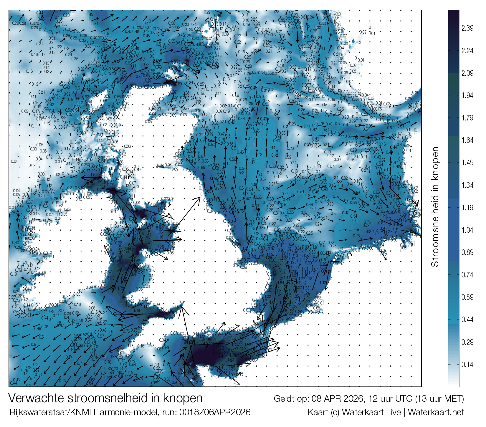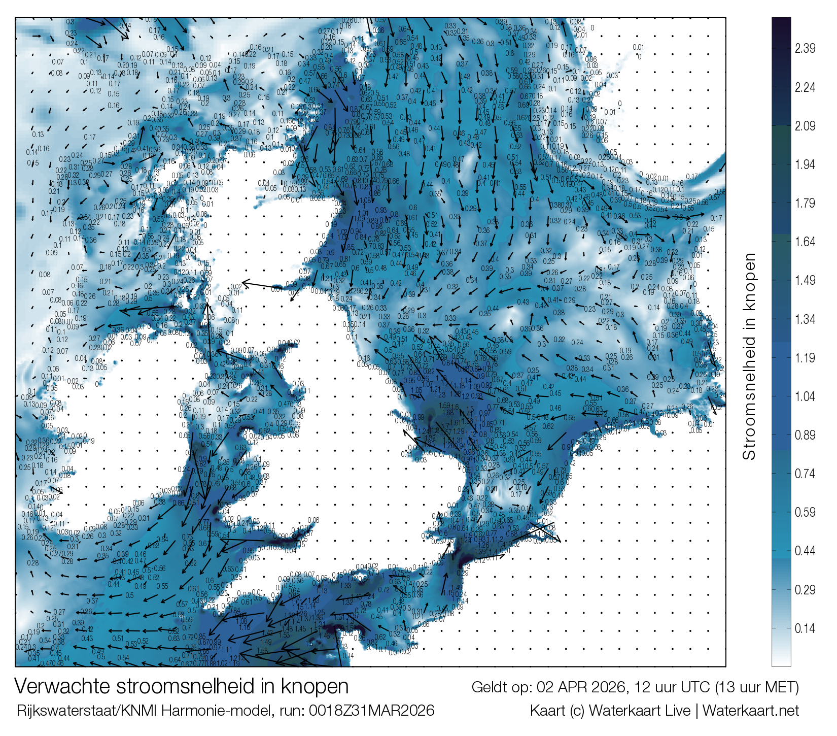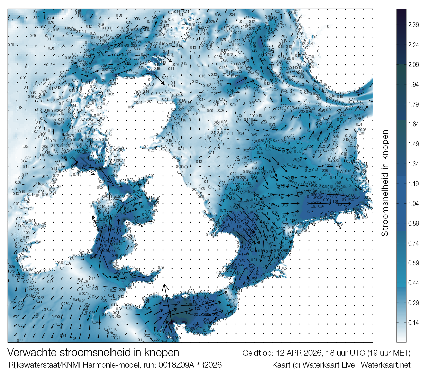 Stroomsnelheden in de Noordzee op basis van de Stroomatlas, verrekend met weersinvloeden. Deze worden iedere dag ververst met data uit het zeestromingen model van Rijkswaterstaat op basis van Harmonie weerdata, voor ieder uur een kaart, tot 48 uur in de toekomst. Lees hieronder meer over dit model