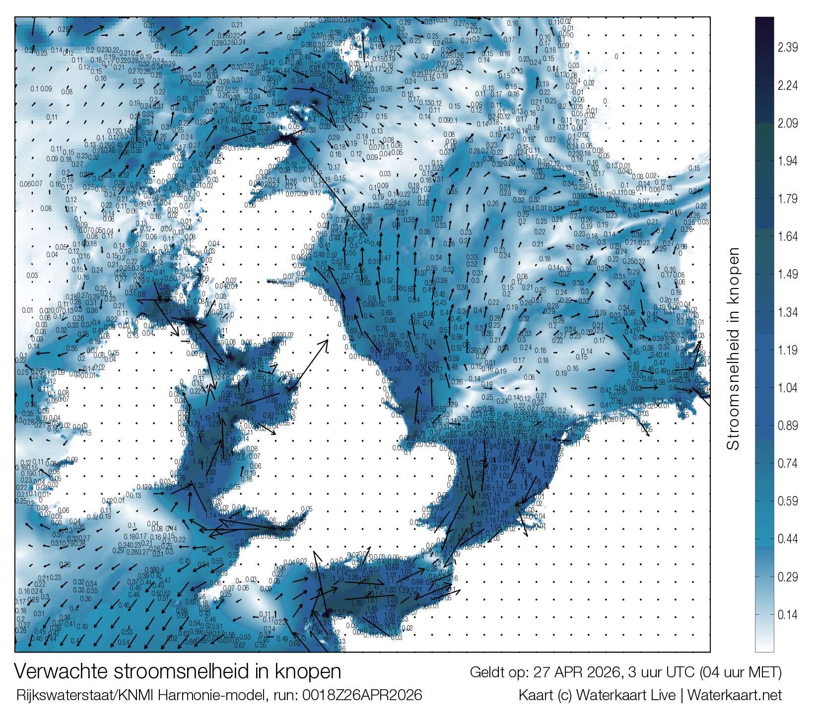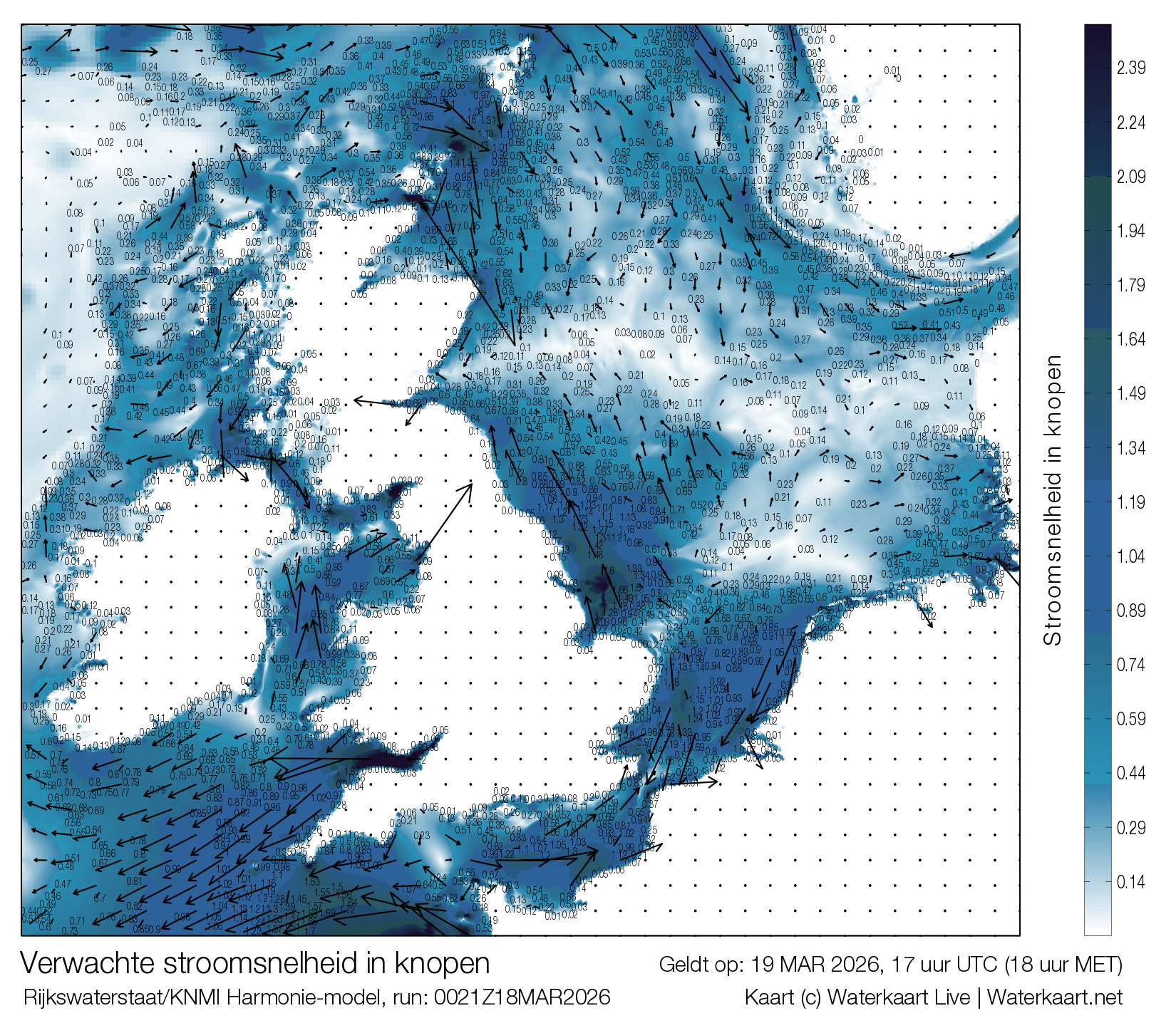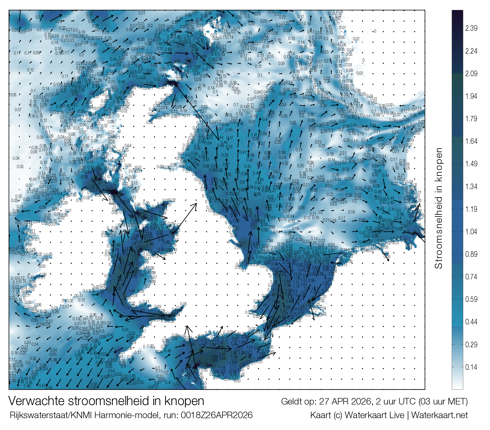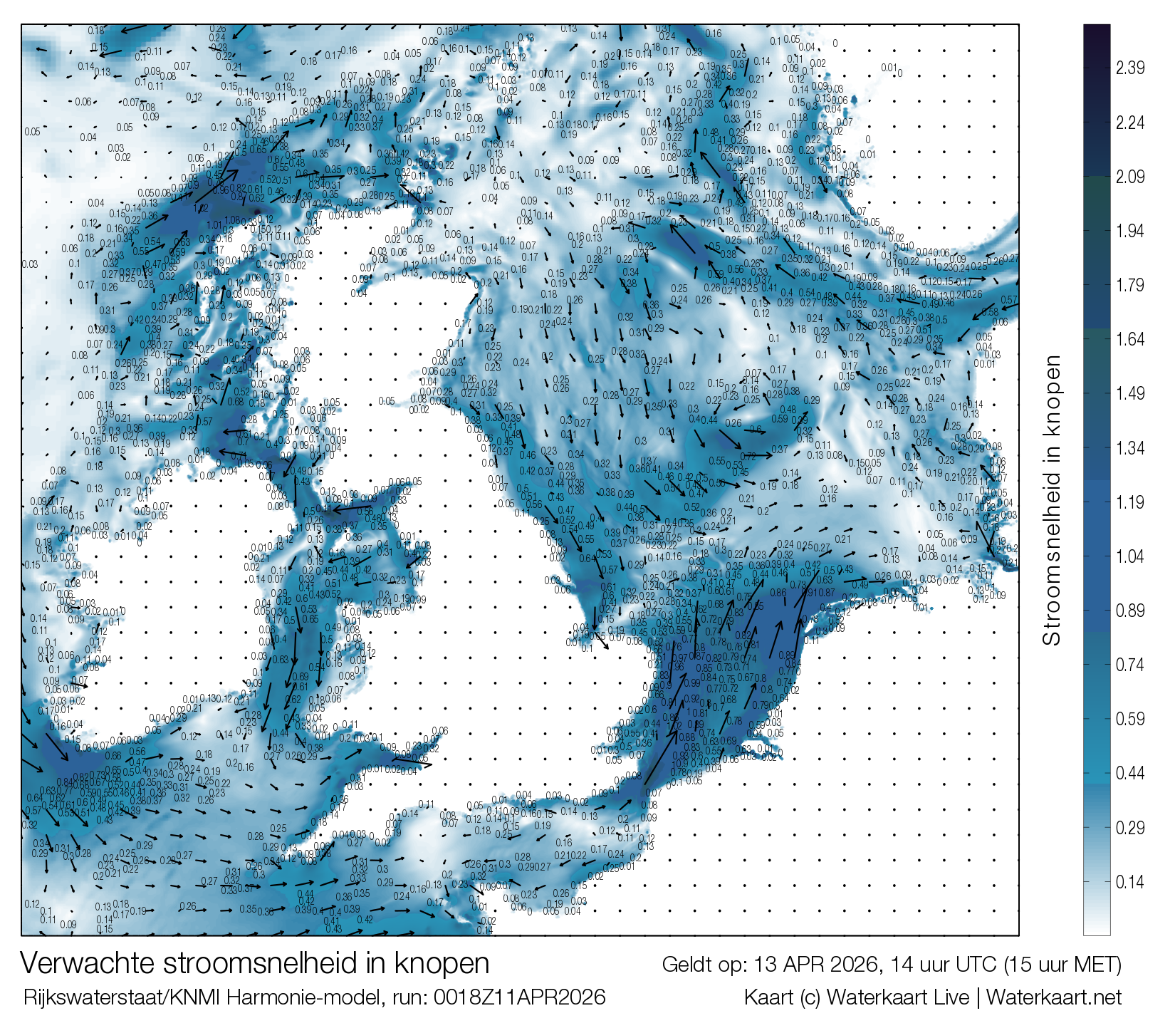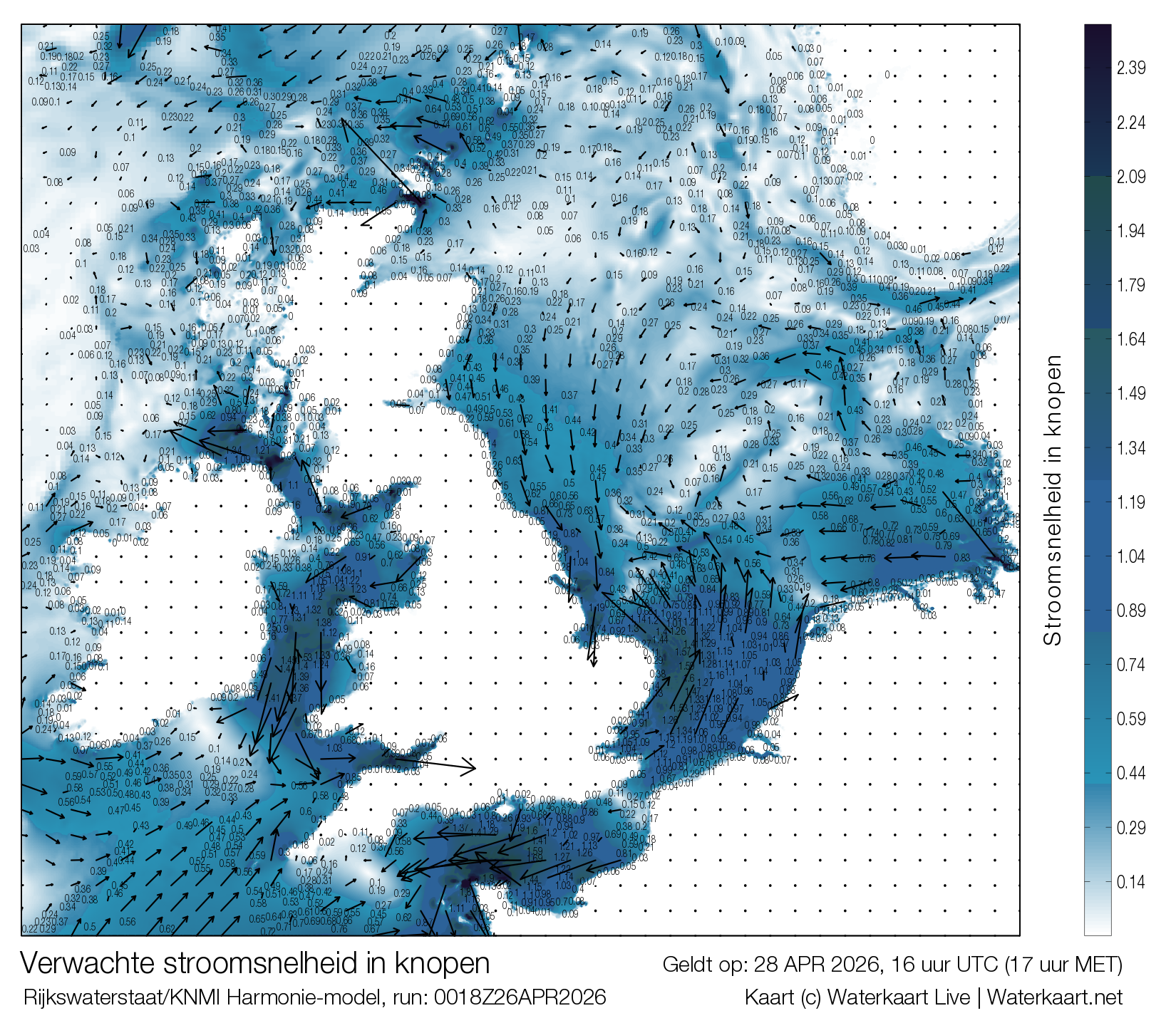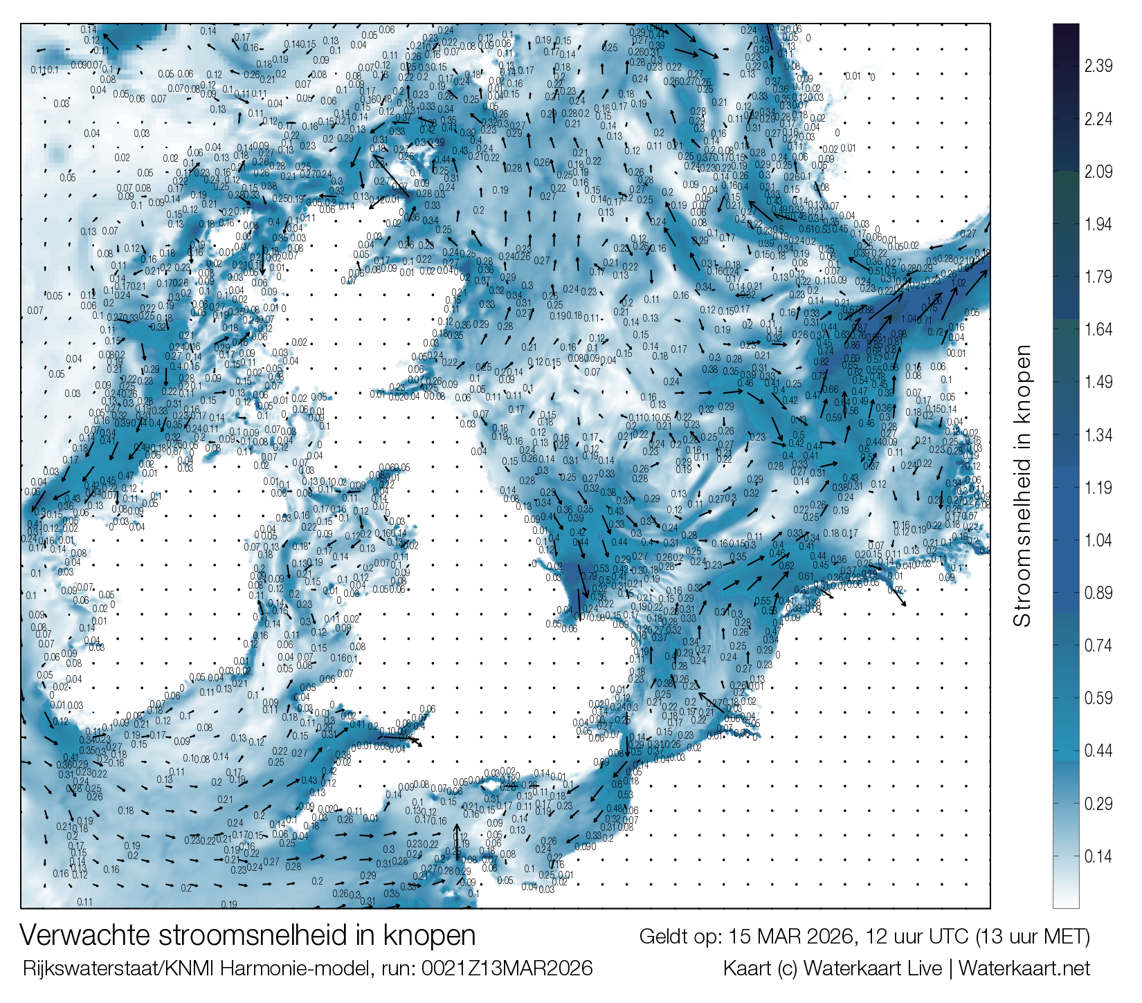 Stroomsnelheden in de Noordzee op basis van de Stroomatlas, verrekend met weersinvloeden. Deze worden iedere dag ververst met data uit het zeestromingen model van Rijkswaterstaat op basis van Harmonie weerdata, voor ieder uur een kaart, tot 48 uur in de toekomst. Lees hieronder meer over dit model