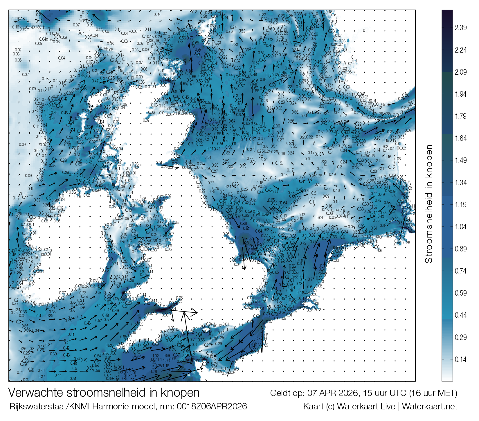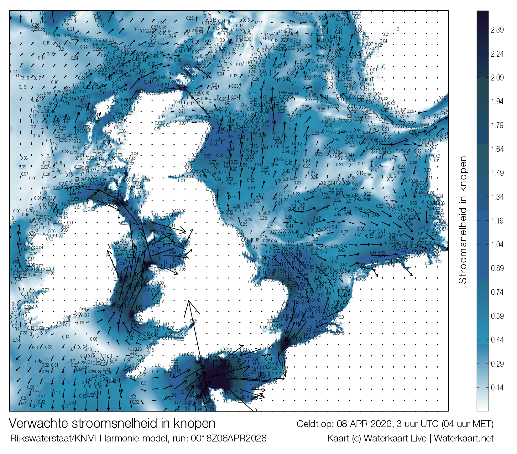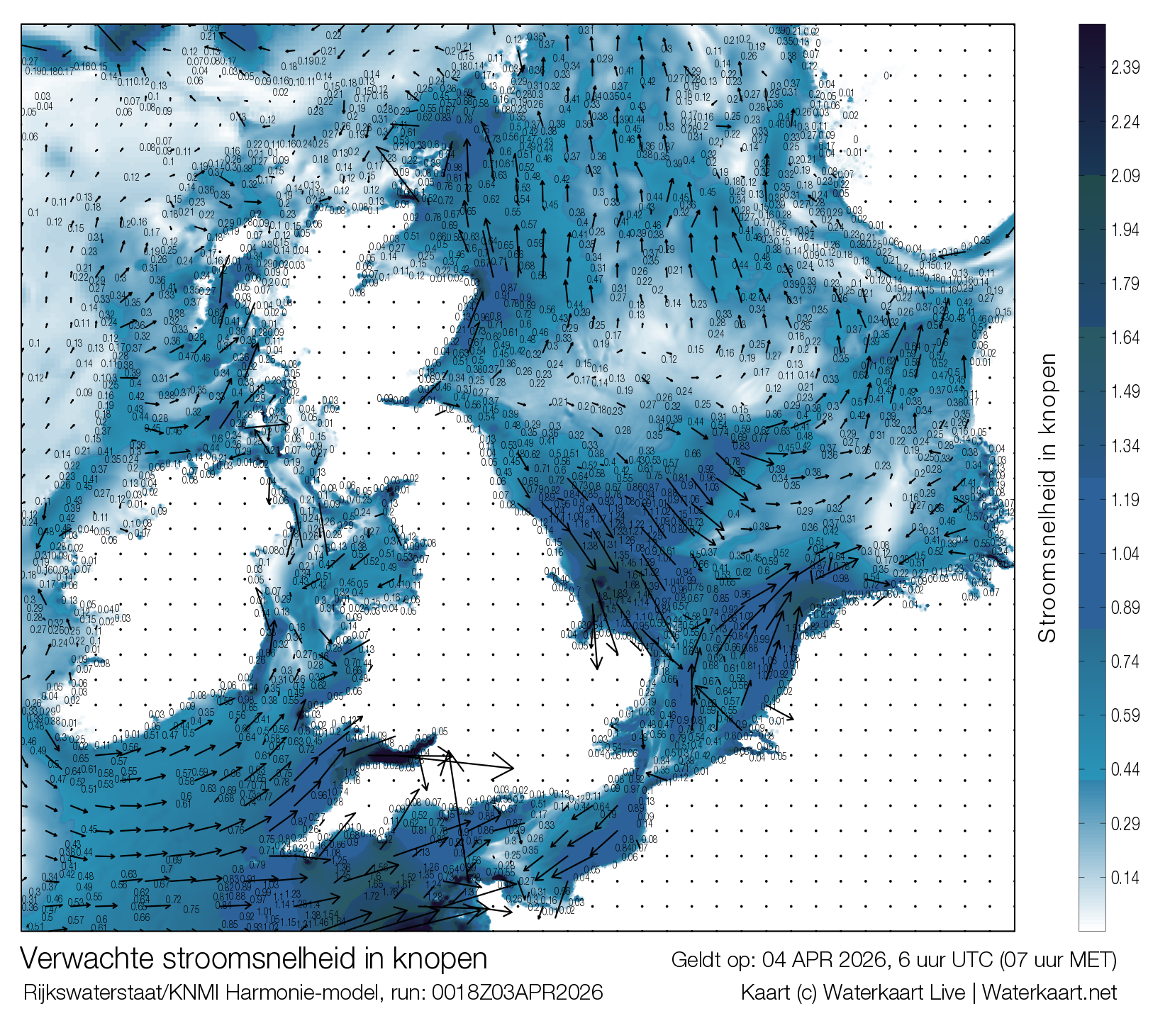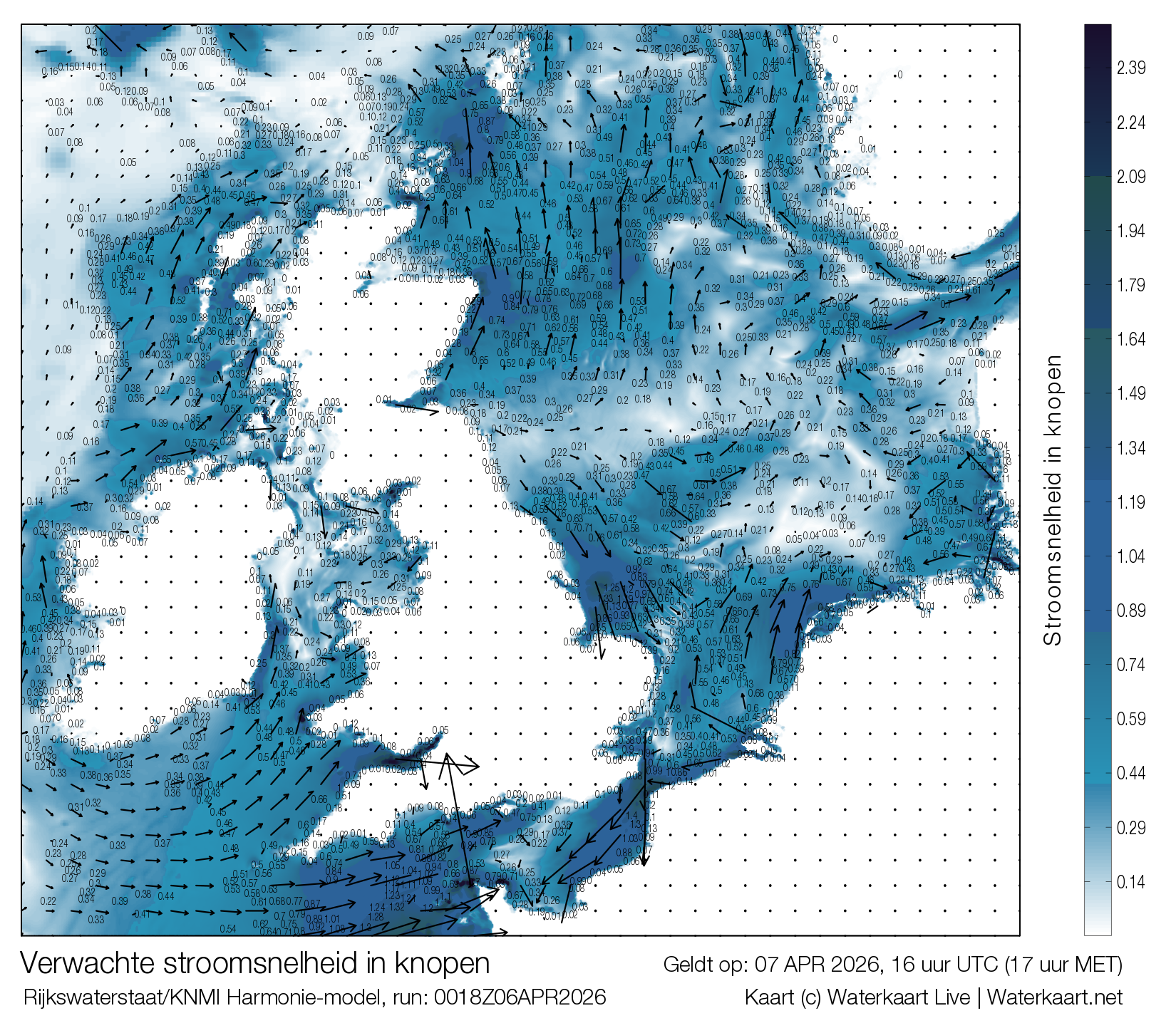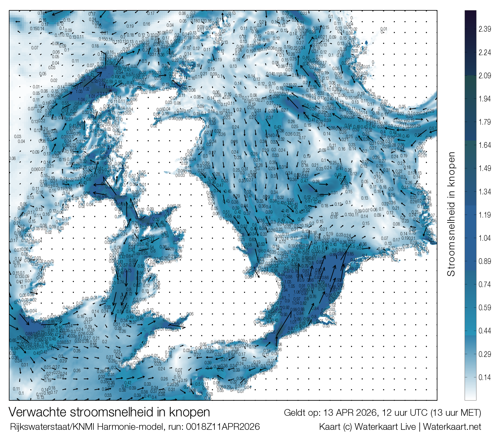 Stroomsnelheden in de Noordzee op basis van de Stroomatlas, verrekend met weersinvloeden. Deze worden iedere dag ververst met data uit het zeestromingen model van Rijkswaterstaat op basis van Harmonie weerdata, voor ieder uur een kaart, tot 48 uur in de toekomst. Lees hieronder meer over dit model