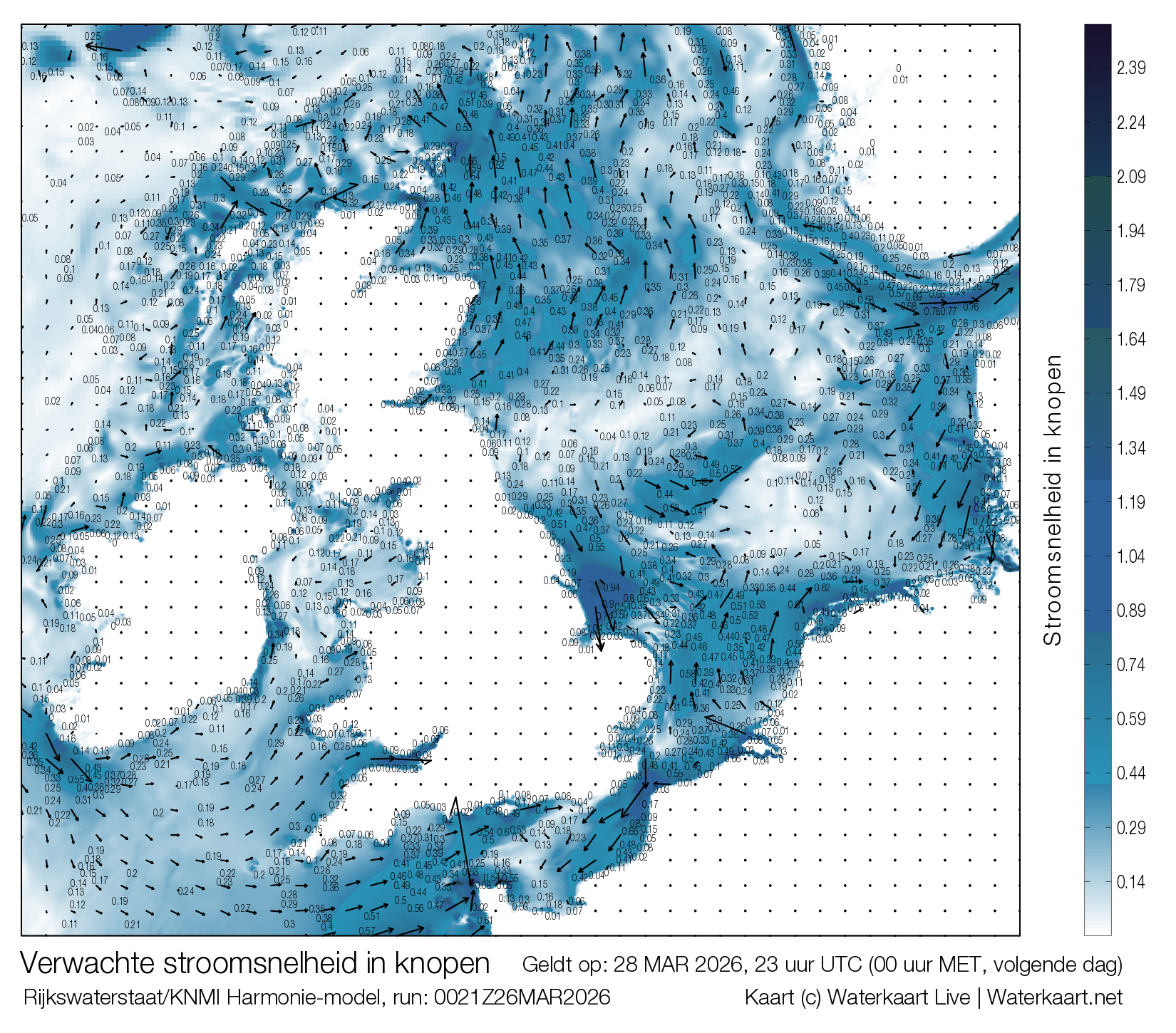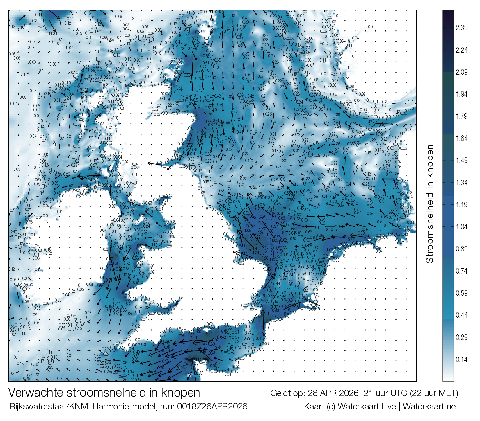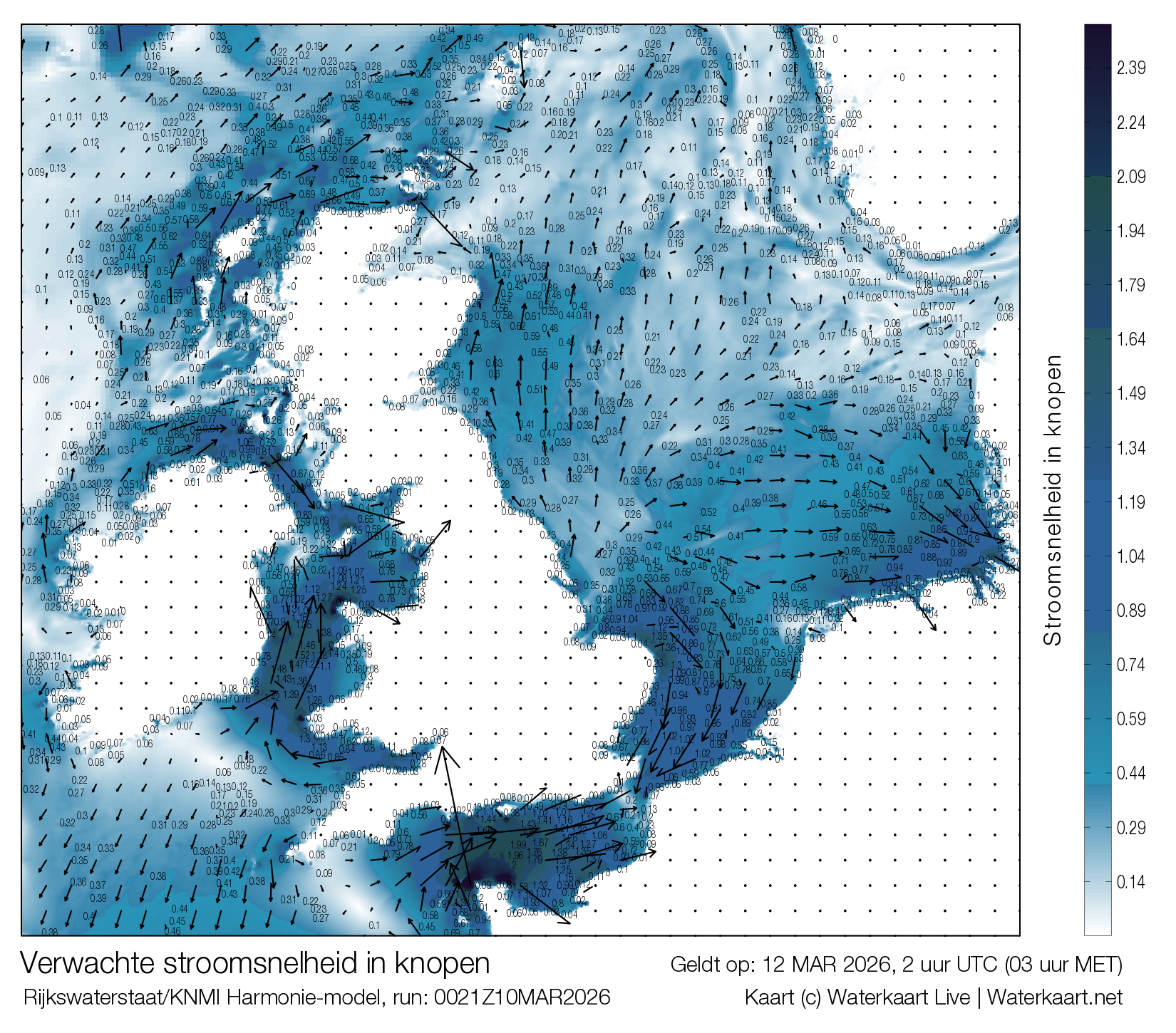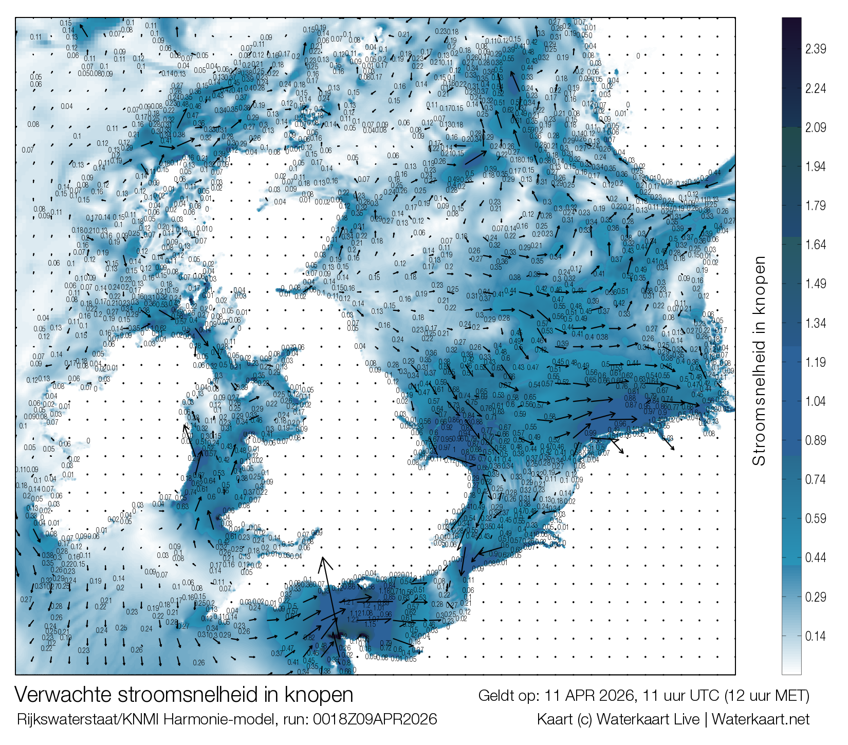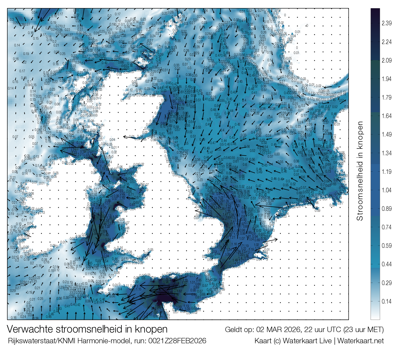 Stroomsnelheden in de Noordzee op basis van de Stroomatlas, verrekend met weersinvloeden. Deze worden iedere dag ververst met data uit het zeestromingen model van Rijkswaterstaat op basis van Harmonie weerdata, voor ieder uur een kaart, tot 48 uur in de toekomst. Lees hieronder meer over dit model