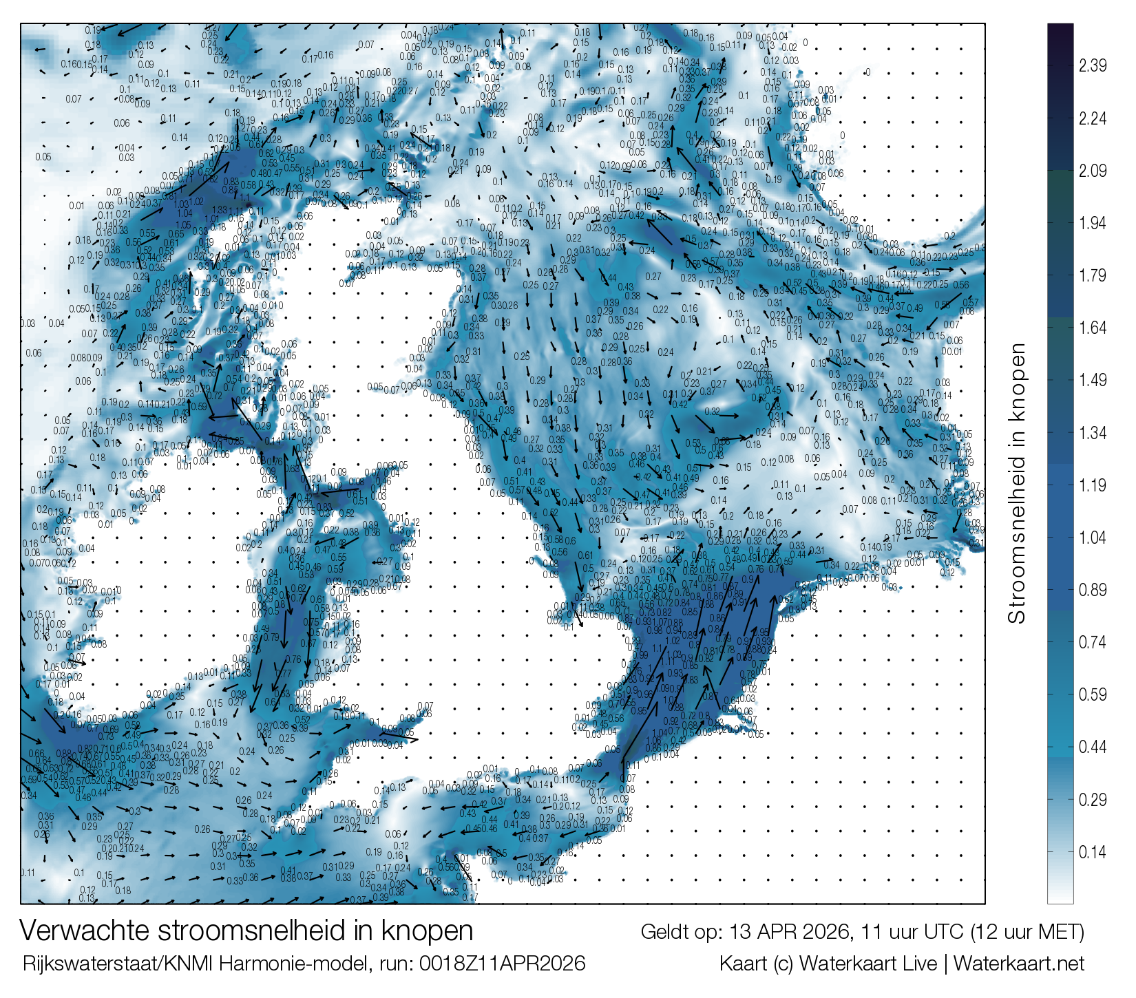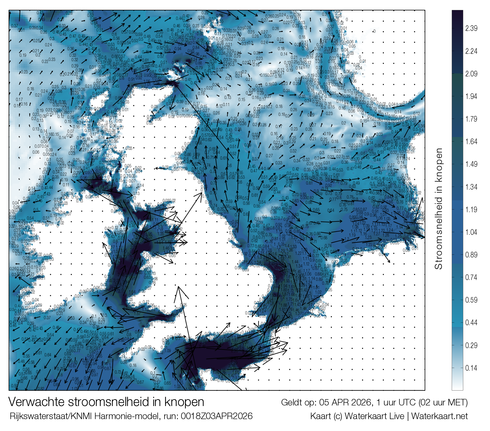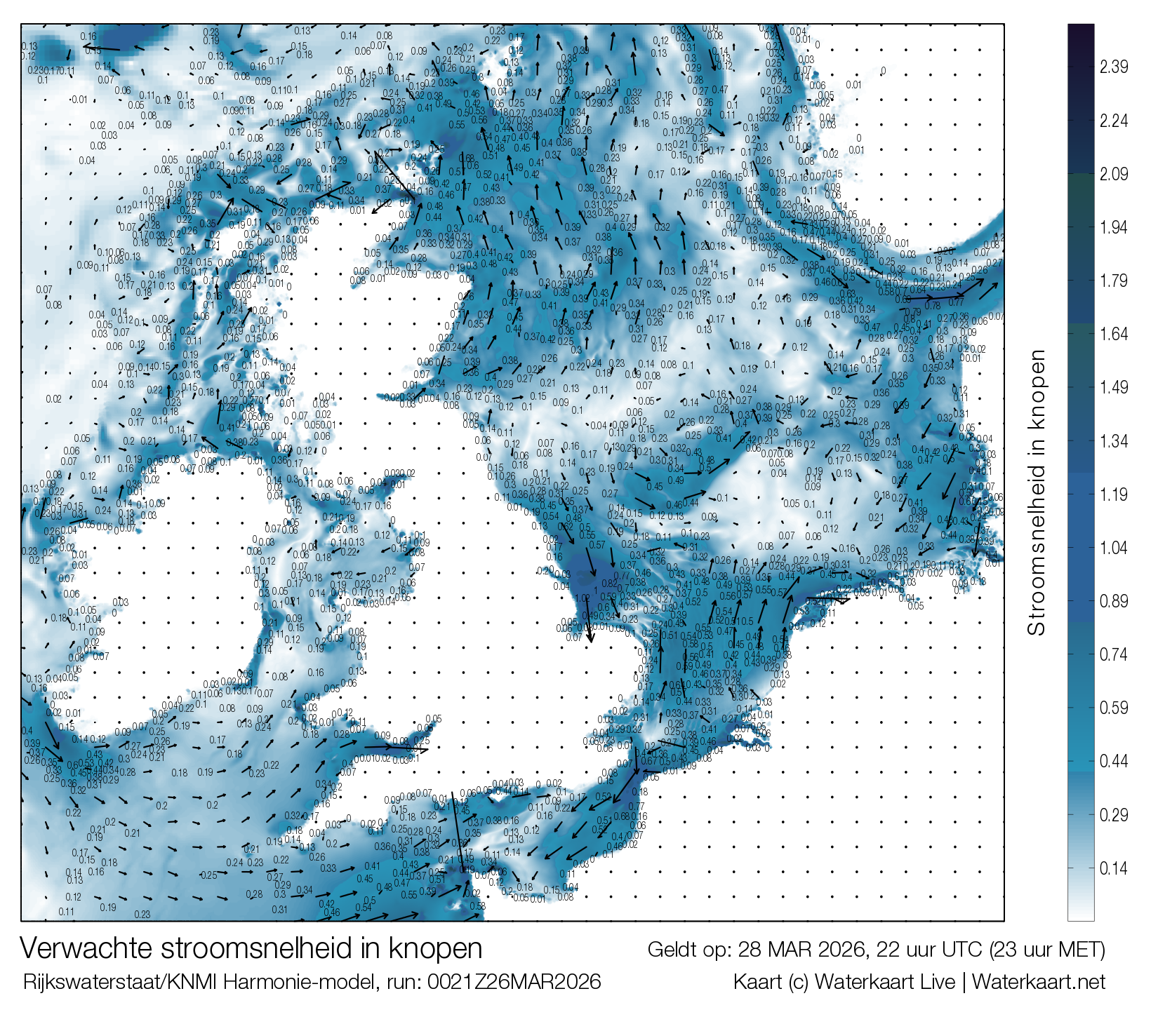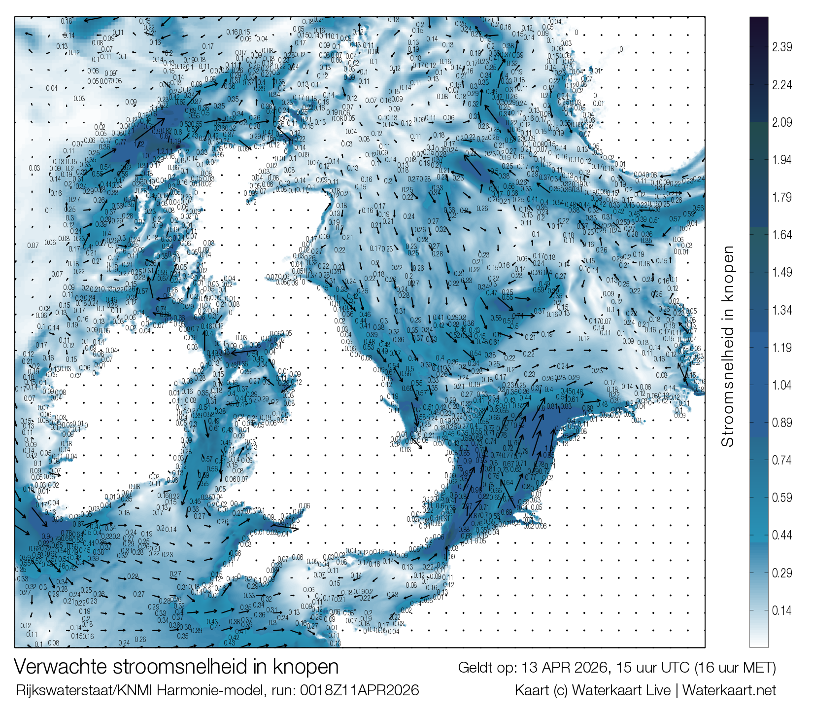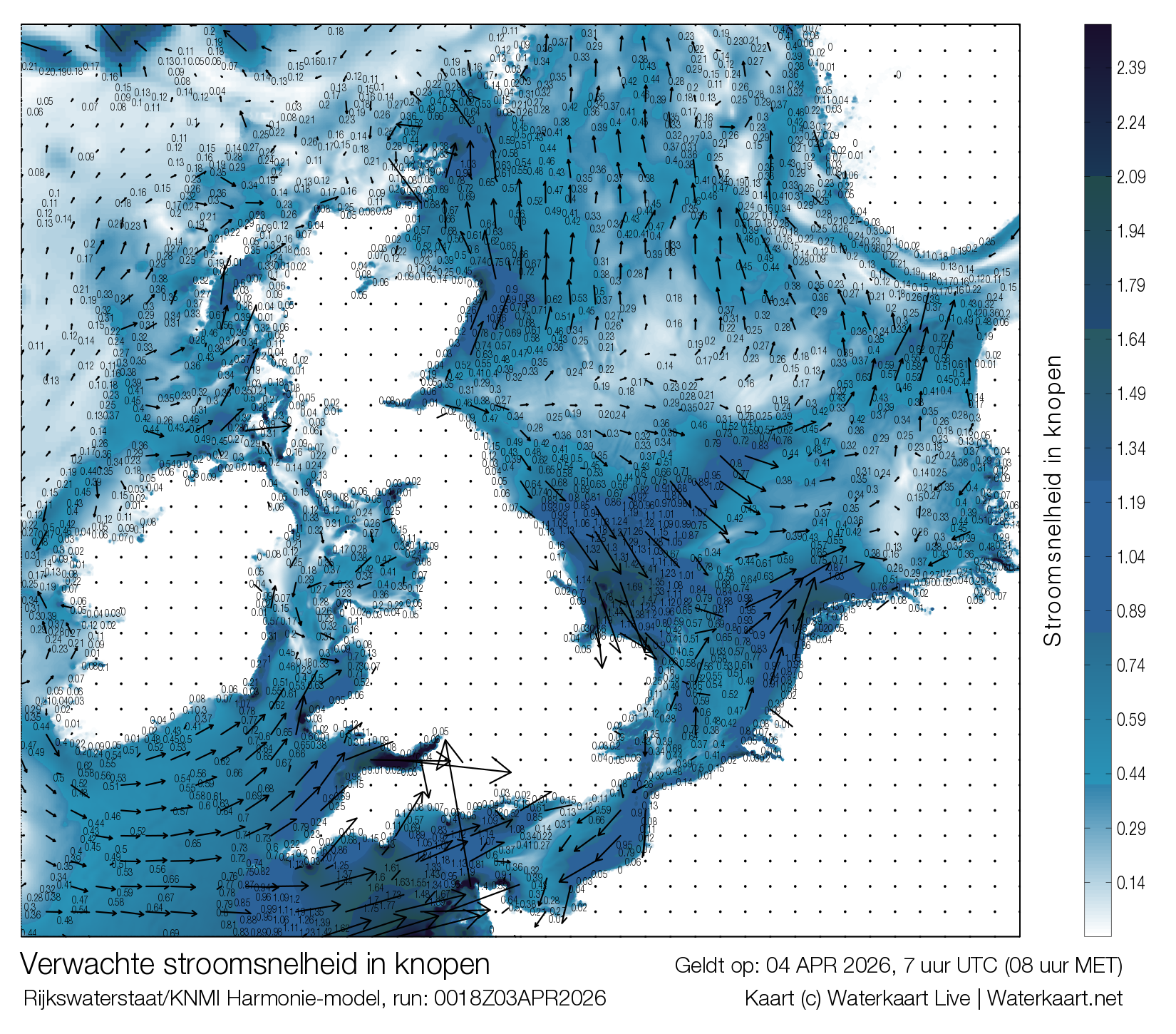 Stroomsnelheden in de Noordzee op basis van de Stroomatlas, verrekend met weersinvloeden. Deze worden iedere dag ververst met data uit het zeestromingen model van Rijkswaterstaat op basis van Harmonie weerdata, voor ieder uur een kaart, tot 48 uur in de toekomst. Lees hieronder meer over dit model