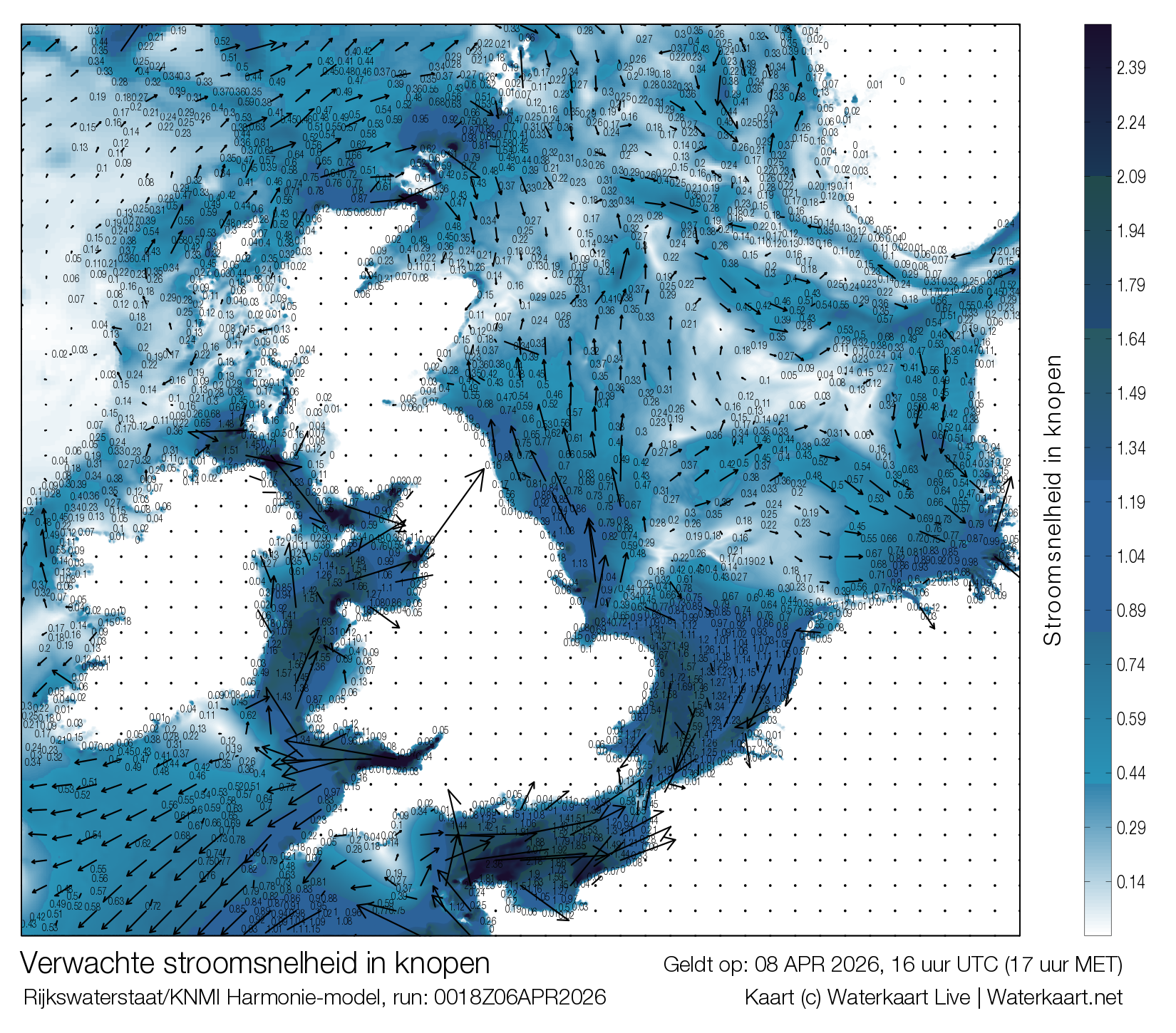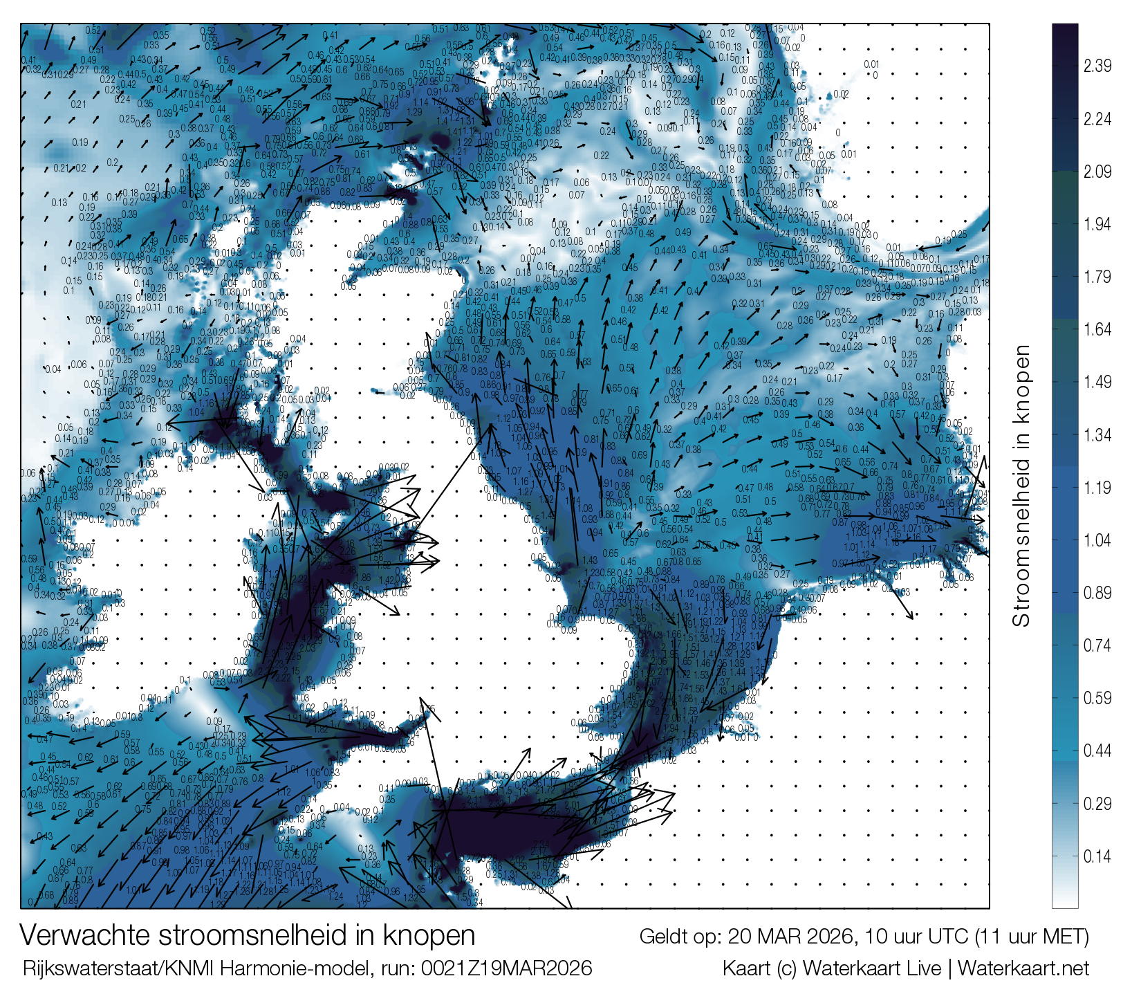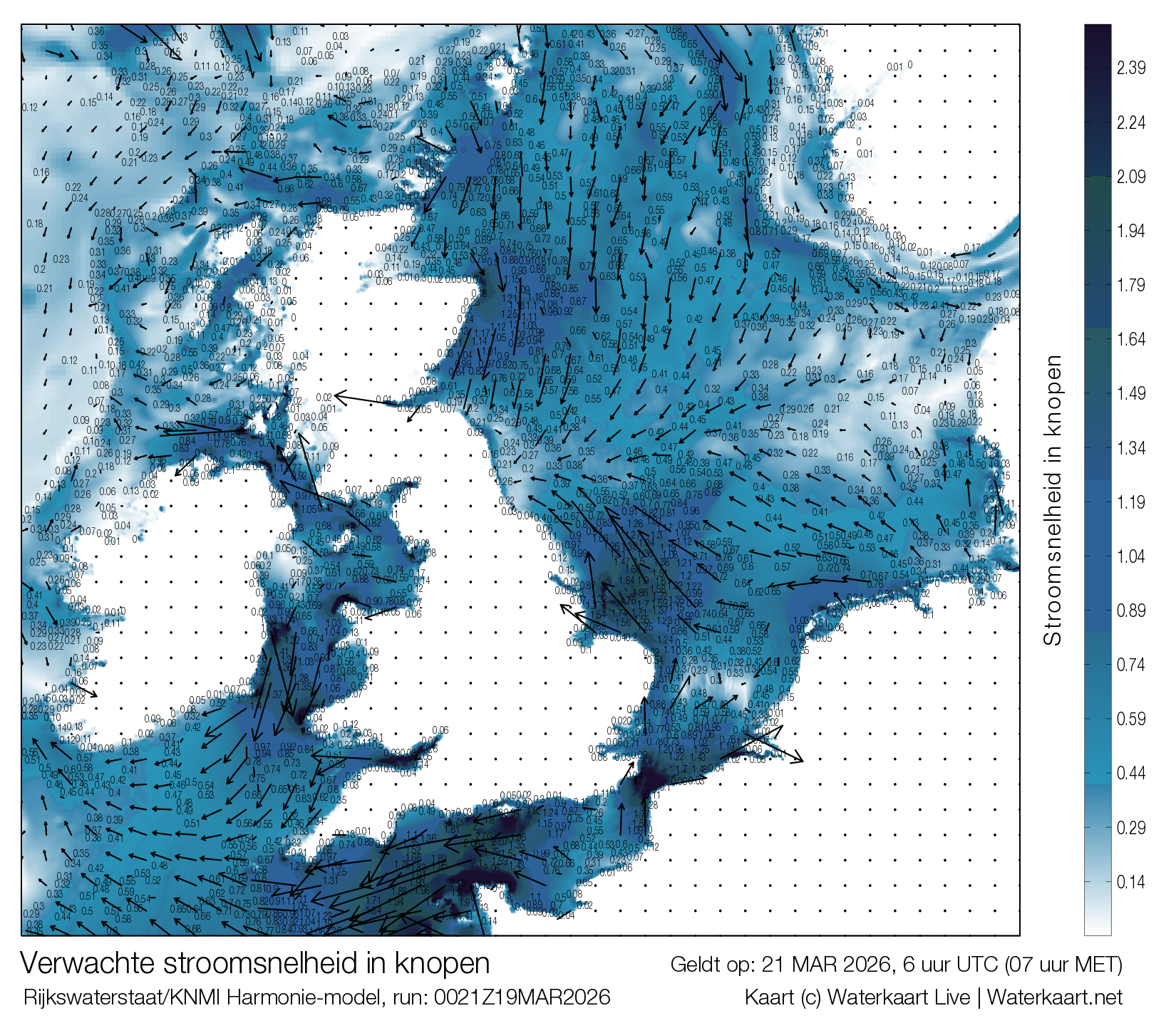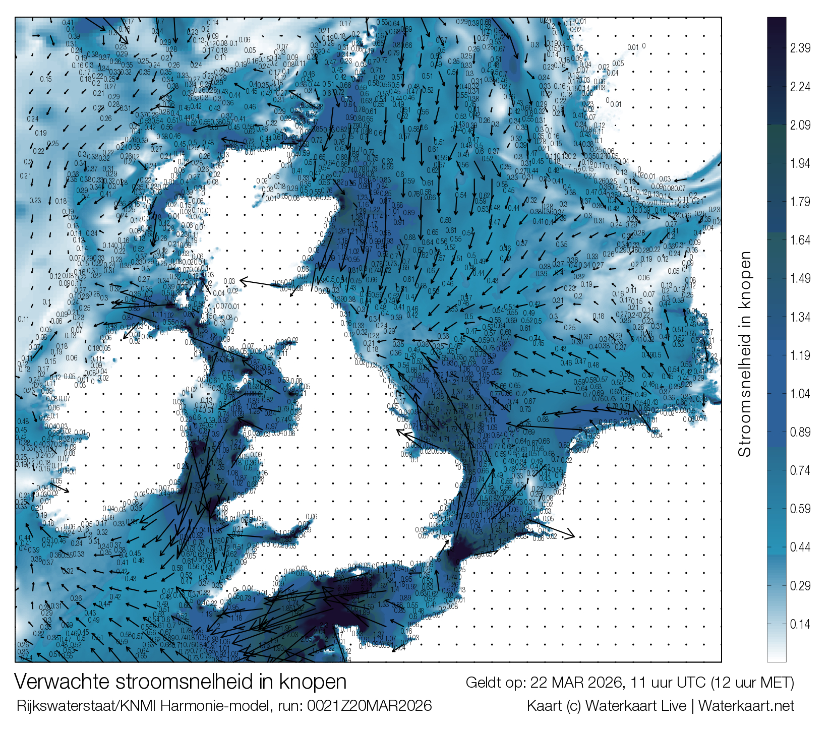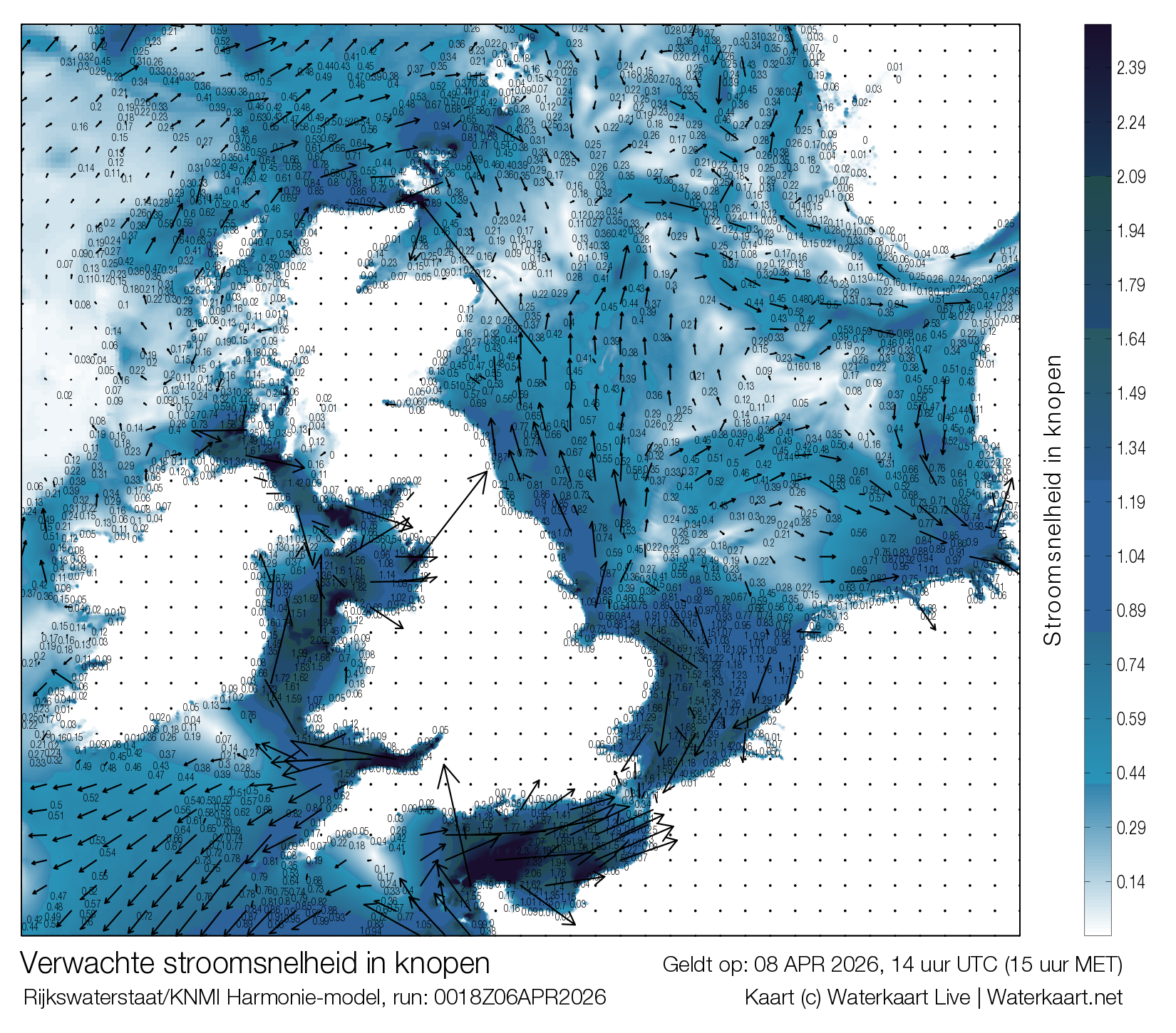 Stroomsnelheden in de Noordzee op basis van de Stroomatlas, verrekend met weersinvloeden. Deze worden iedere dag ververst met data uit het zeestromingen model van Rijkswaterstaat op basis van Harmonie weerdata, voor ieder uur een kaart, tot 48 uur in de toekomst. Lees hieronder meer over dit model