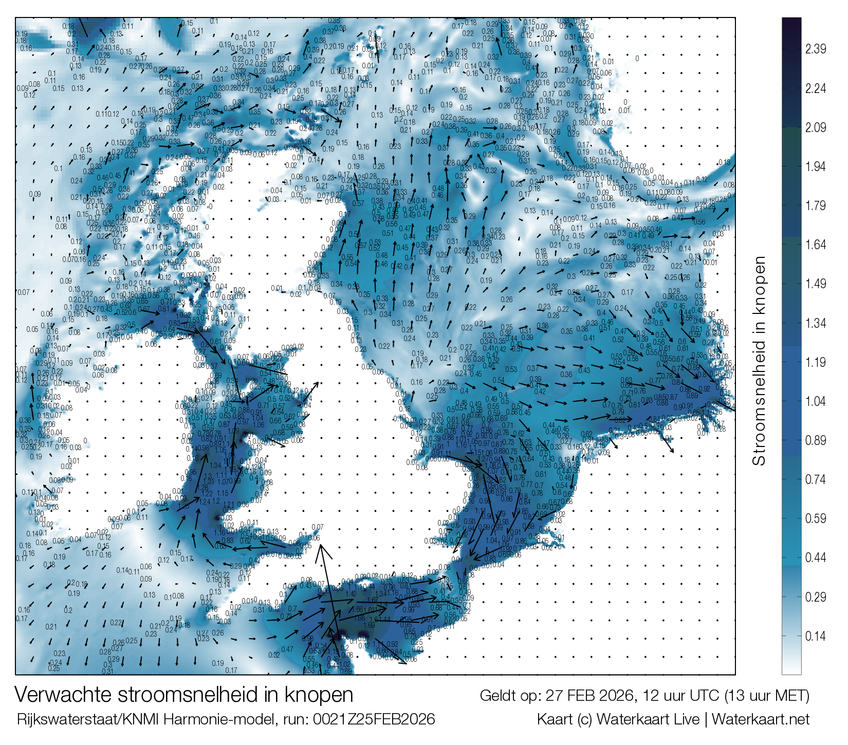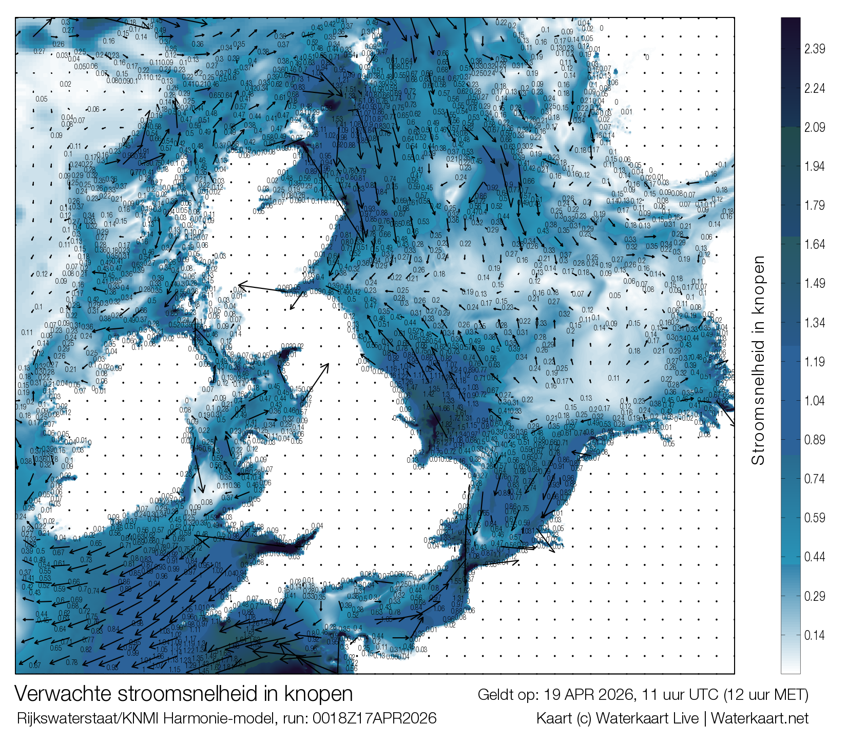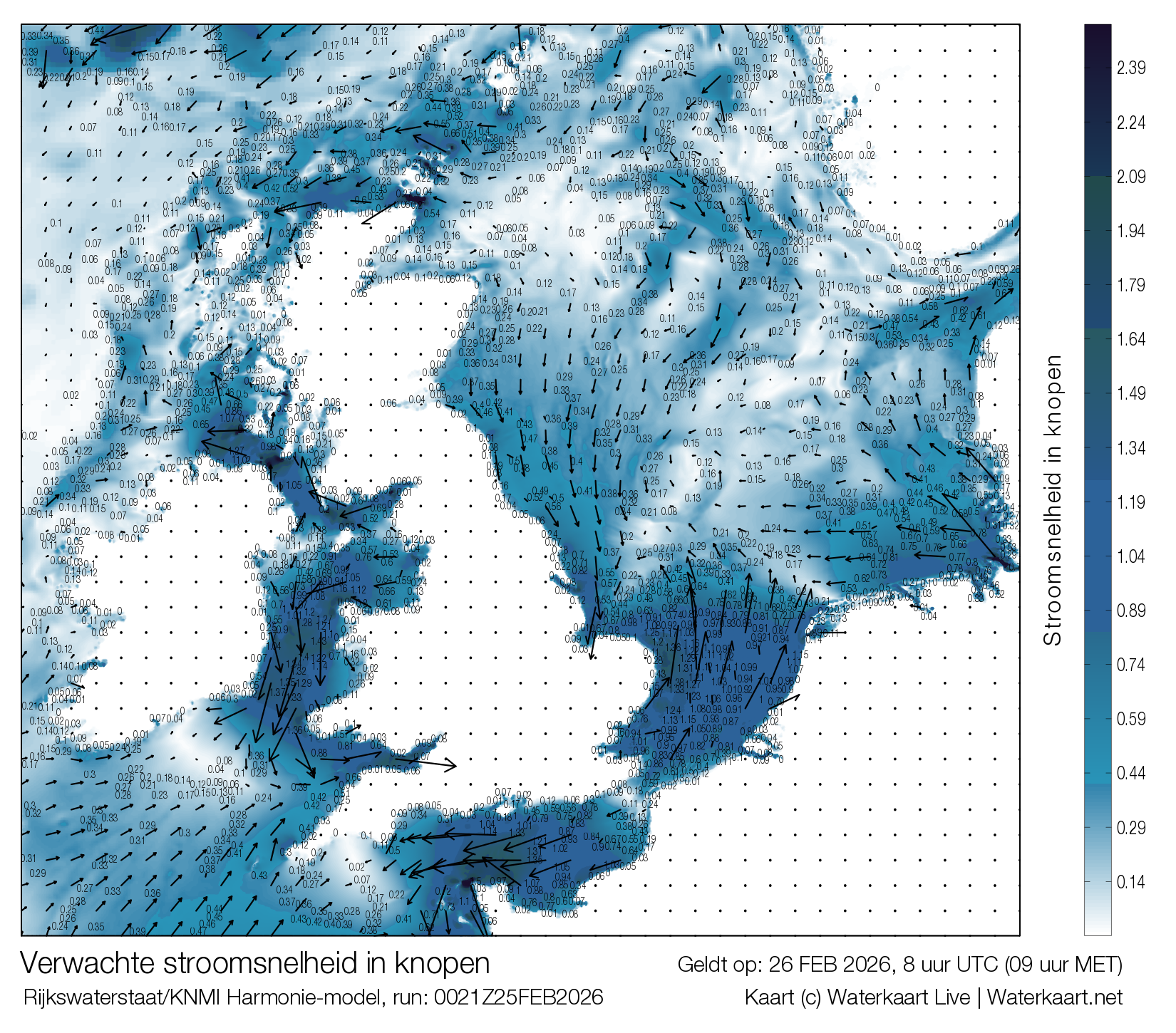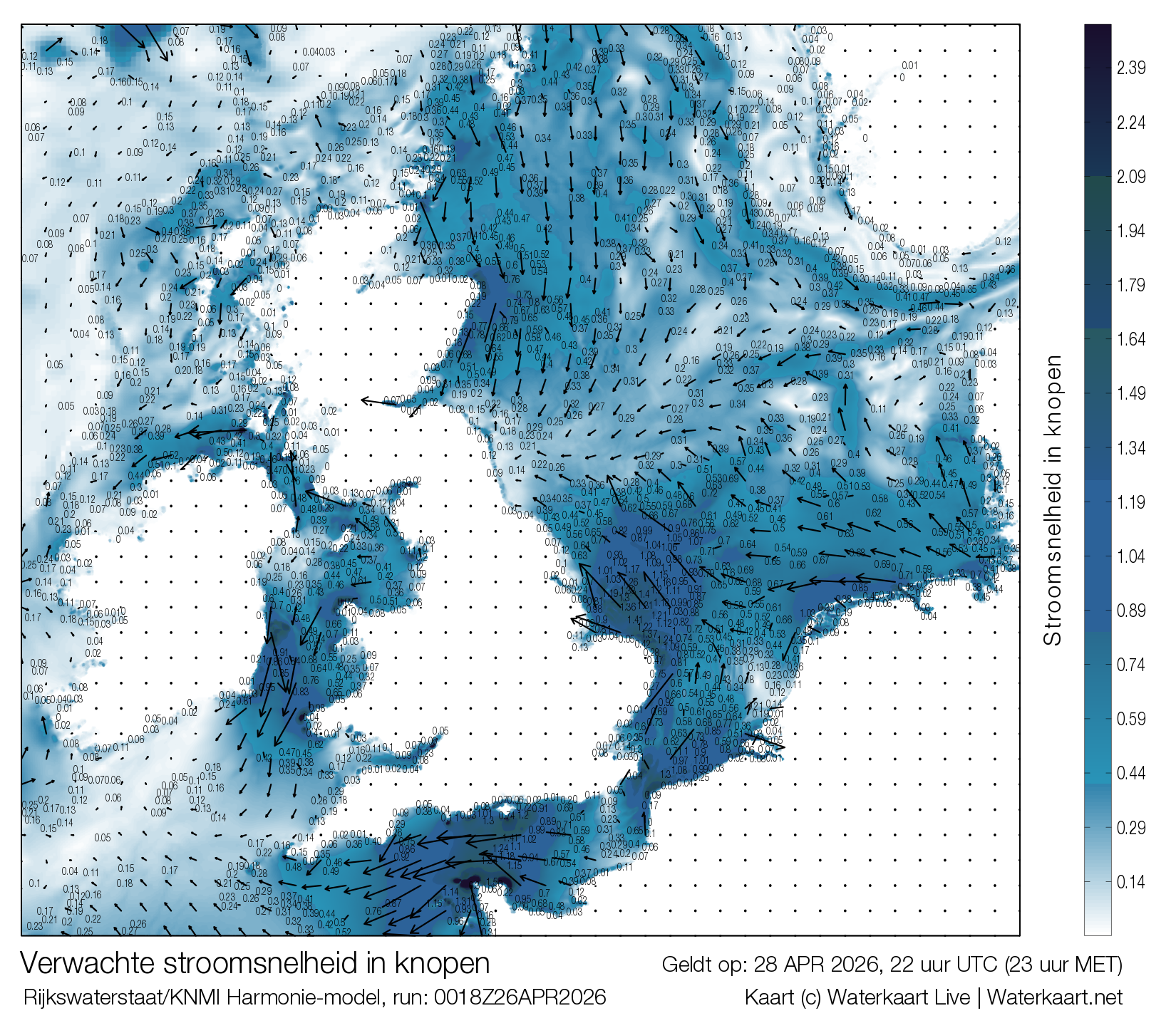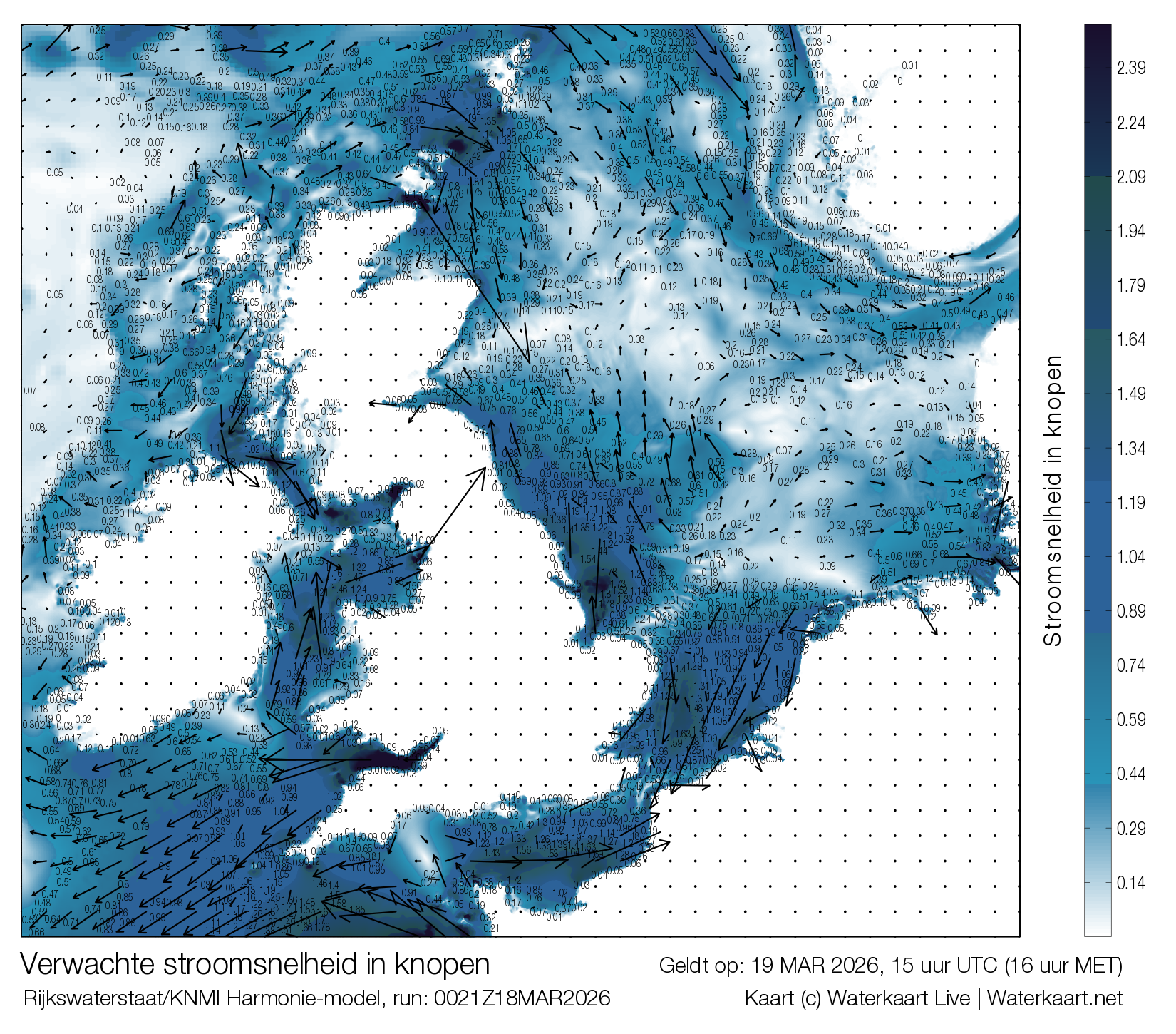 Stroomsnelheden in de Noordzee op basis van de Stroomatlas, verrekend met weersinvloeden. Deze worden iedere dag ververst met data uit het zeestromingen model van Rijkswaterstaat op basis van Harmonie weerdata, voor ieder uur een kaart, tot 48 uur in de toekomst. Lees hieronder meer over dit model