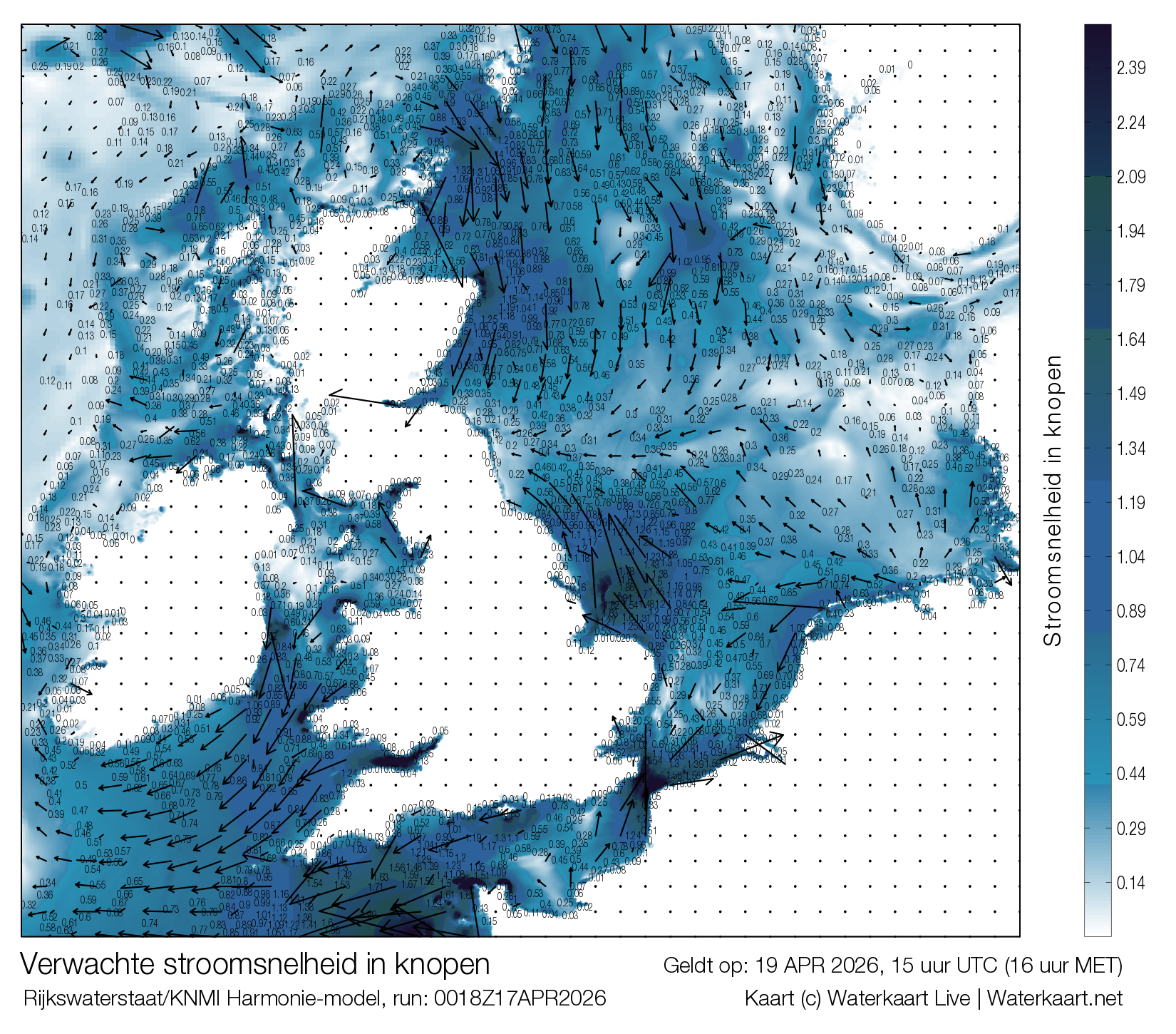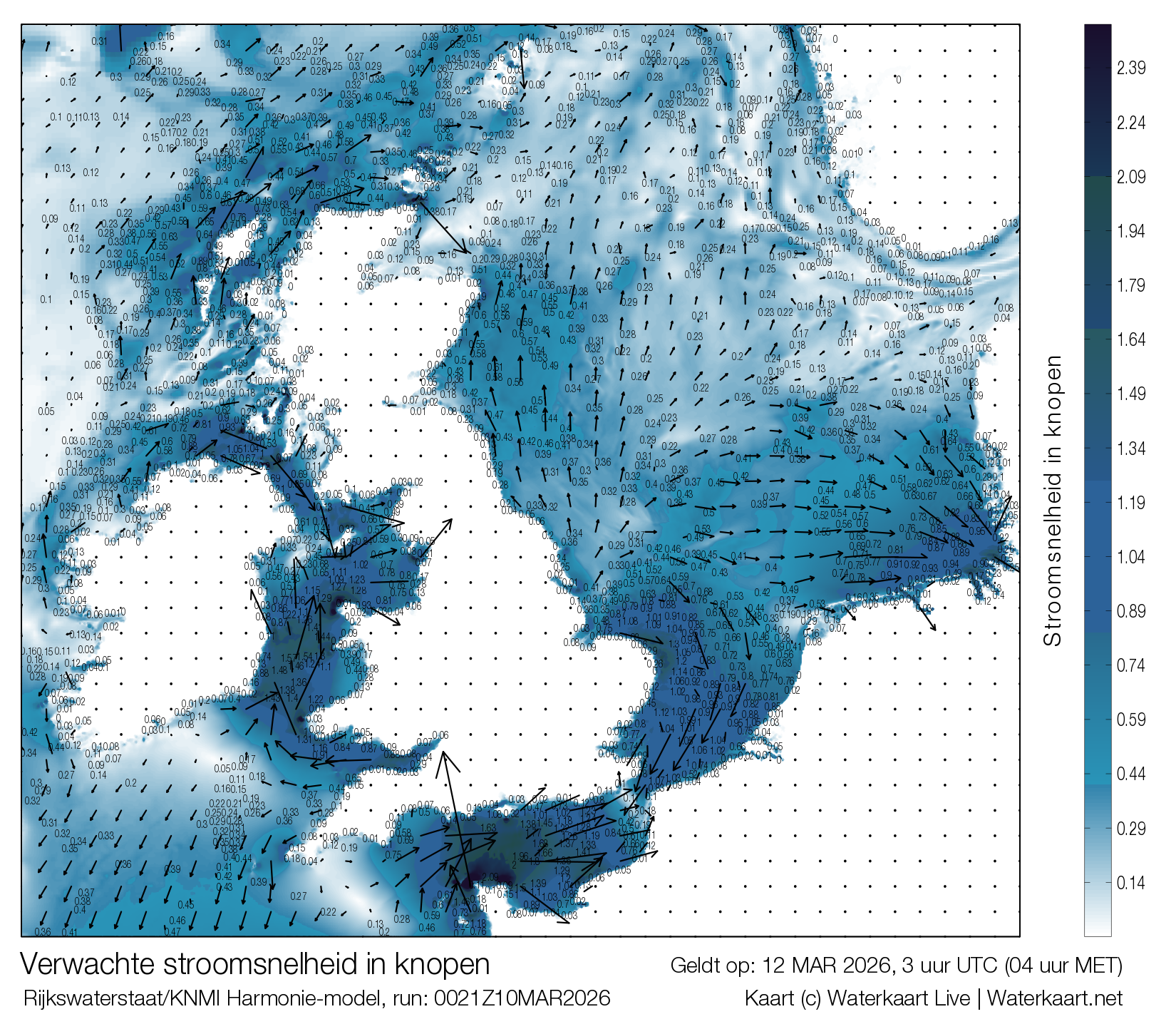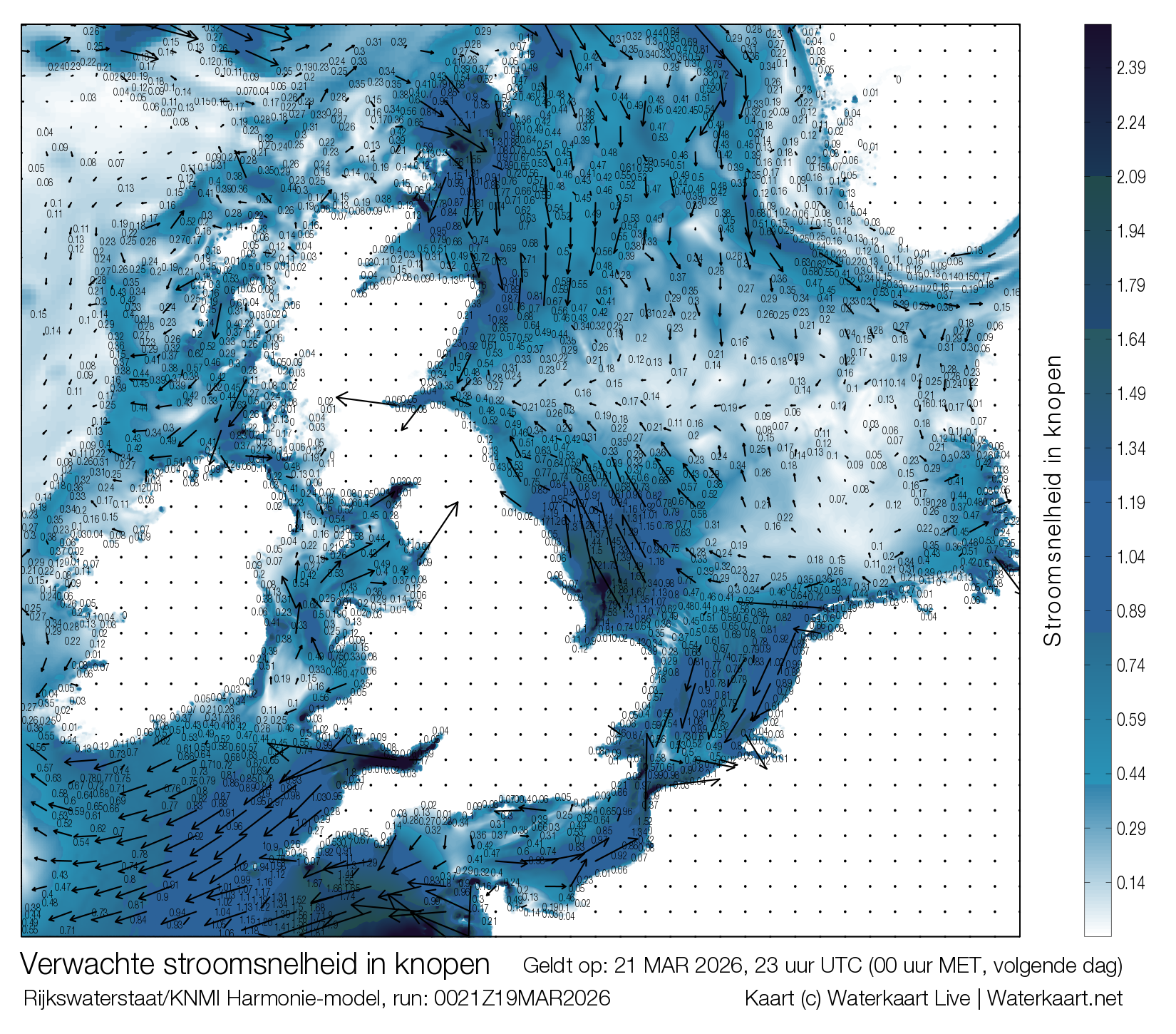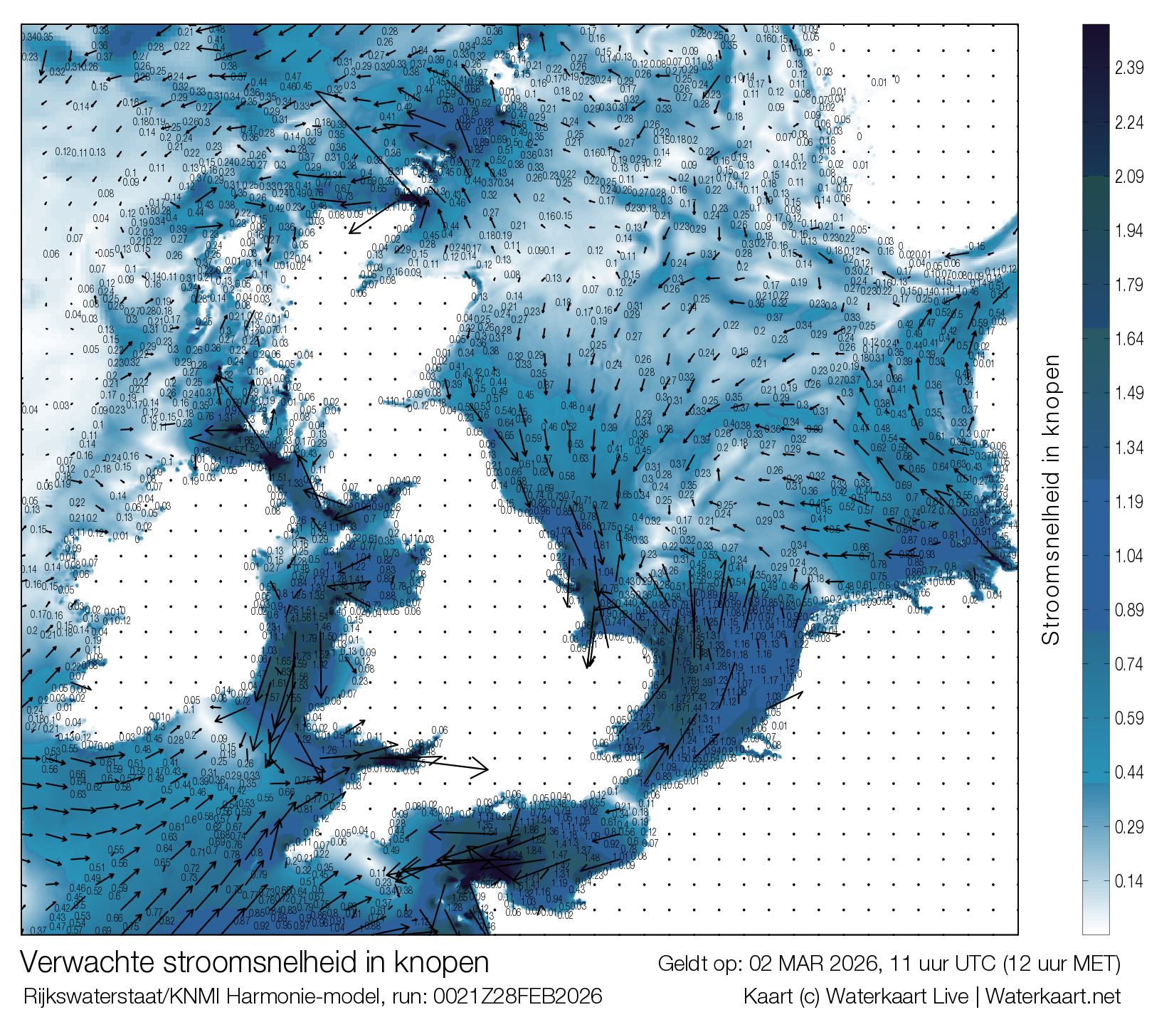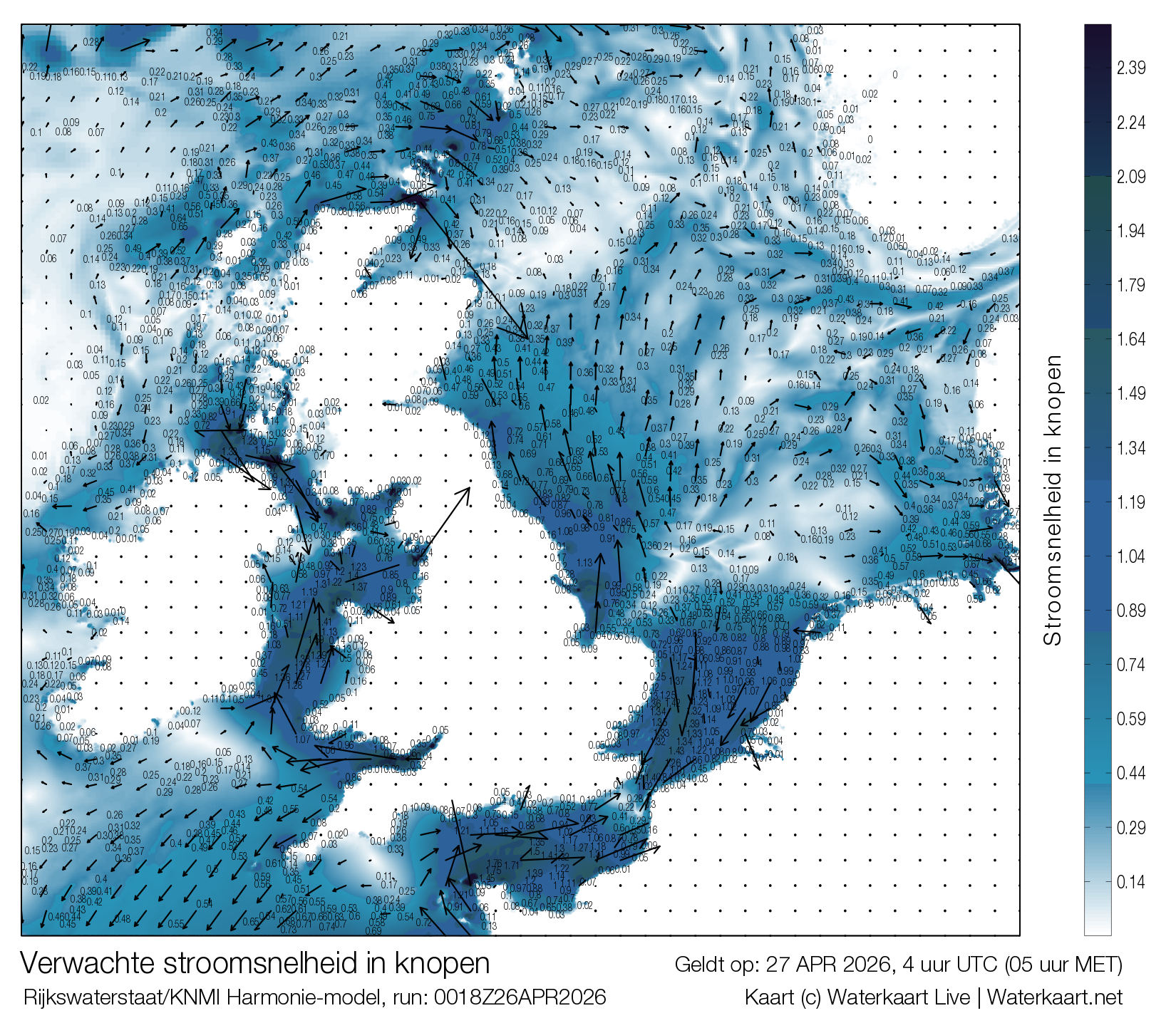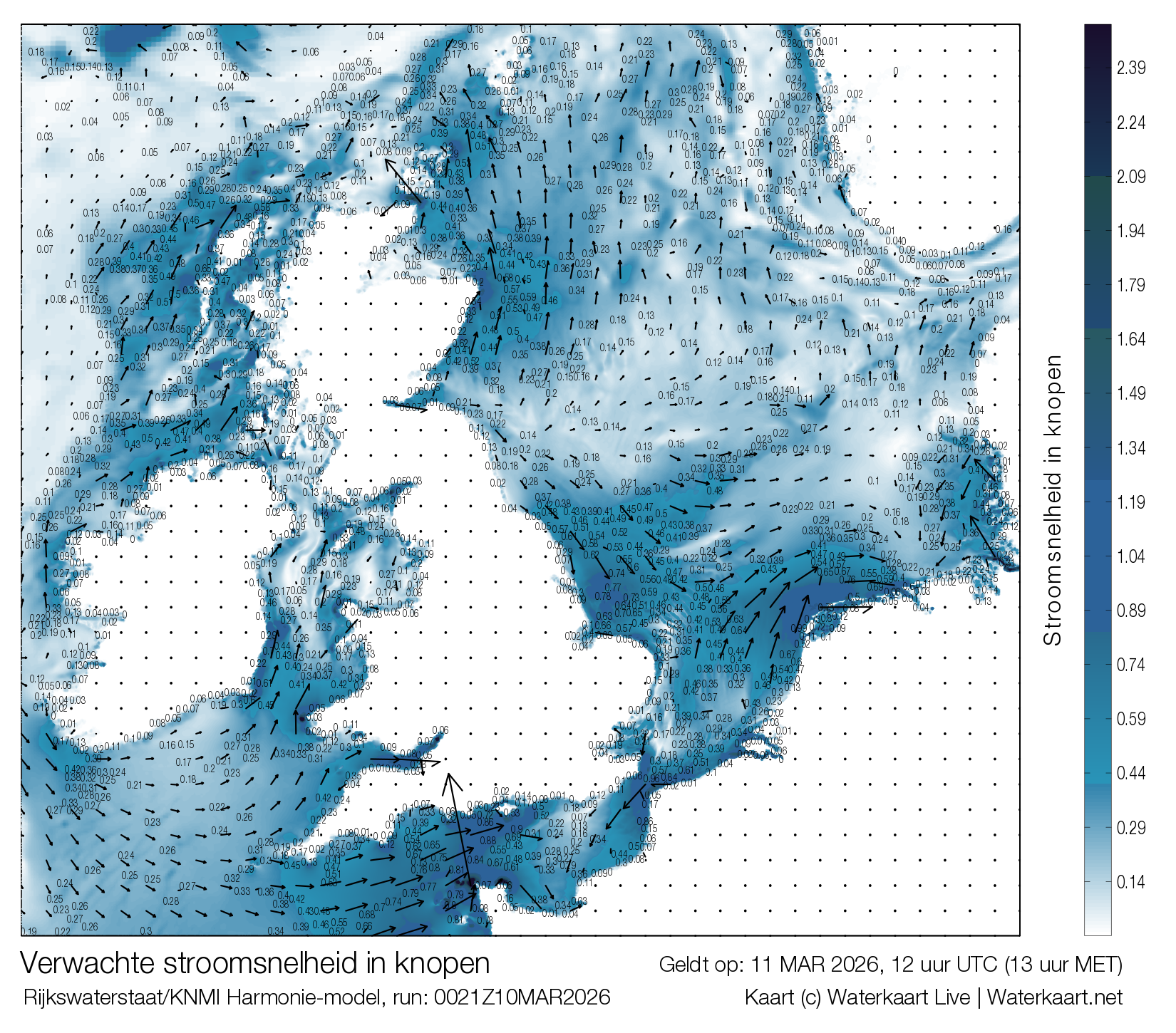 Stroomsnelheden in de Noordzee op basis van de Stroomatlas, verrekend met weersinvloeden. Deze worden iedere dag ververst met data uit het zeestromingen model van Rijkswaterstaat op basis van Harmonie weerdata, voor ieder uur een kaart, tot 48 uur in de toekomst. Lees hieronder meer over dit model