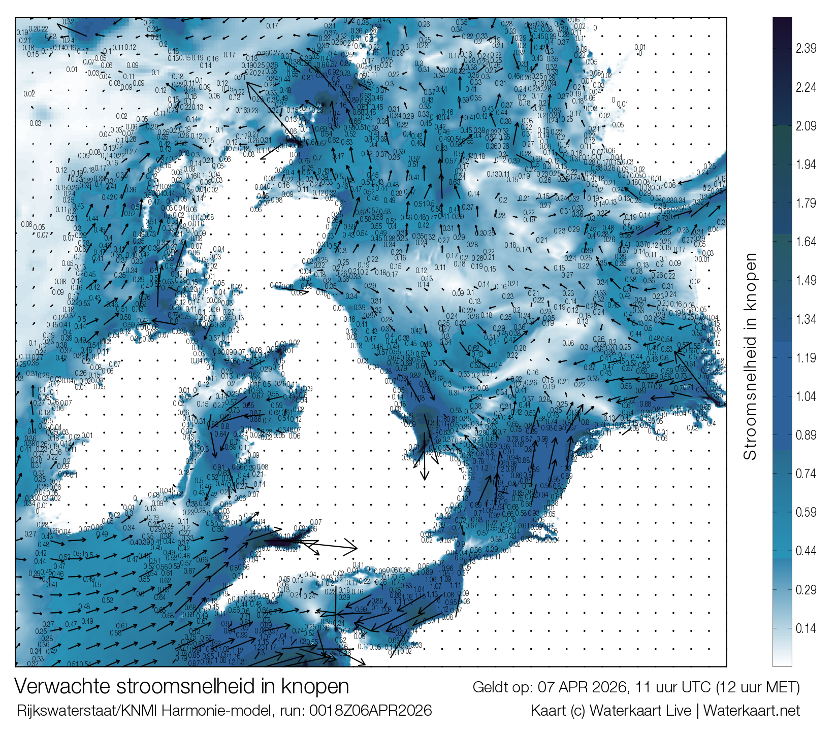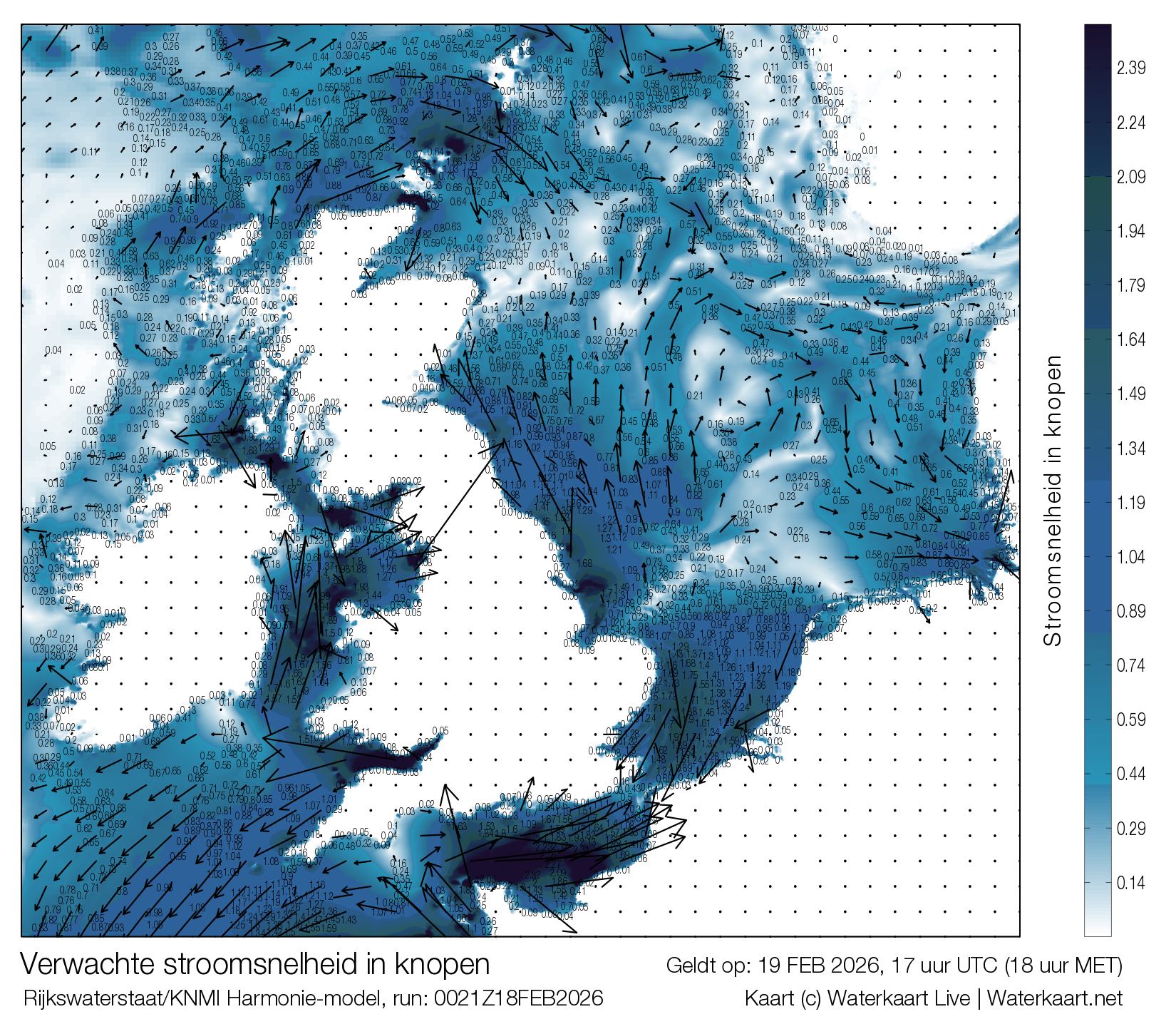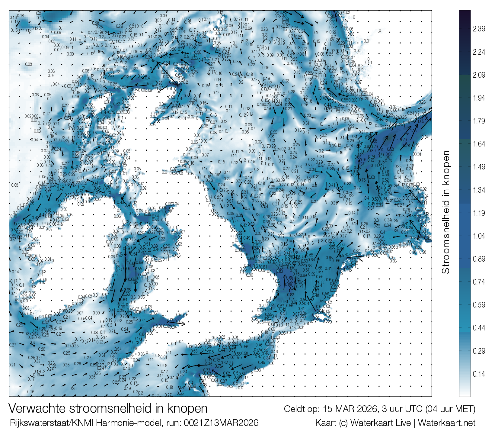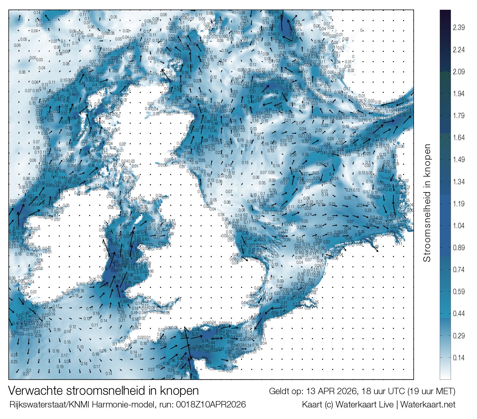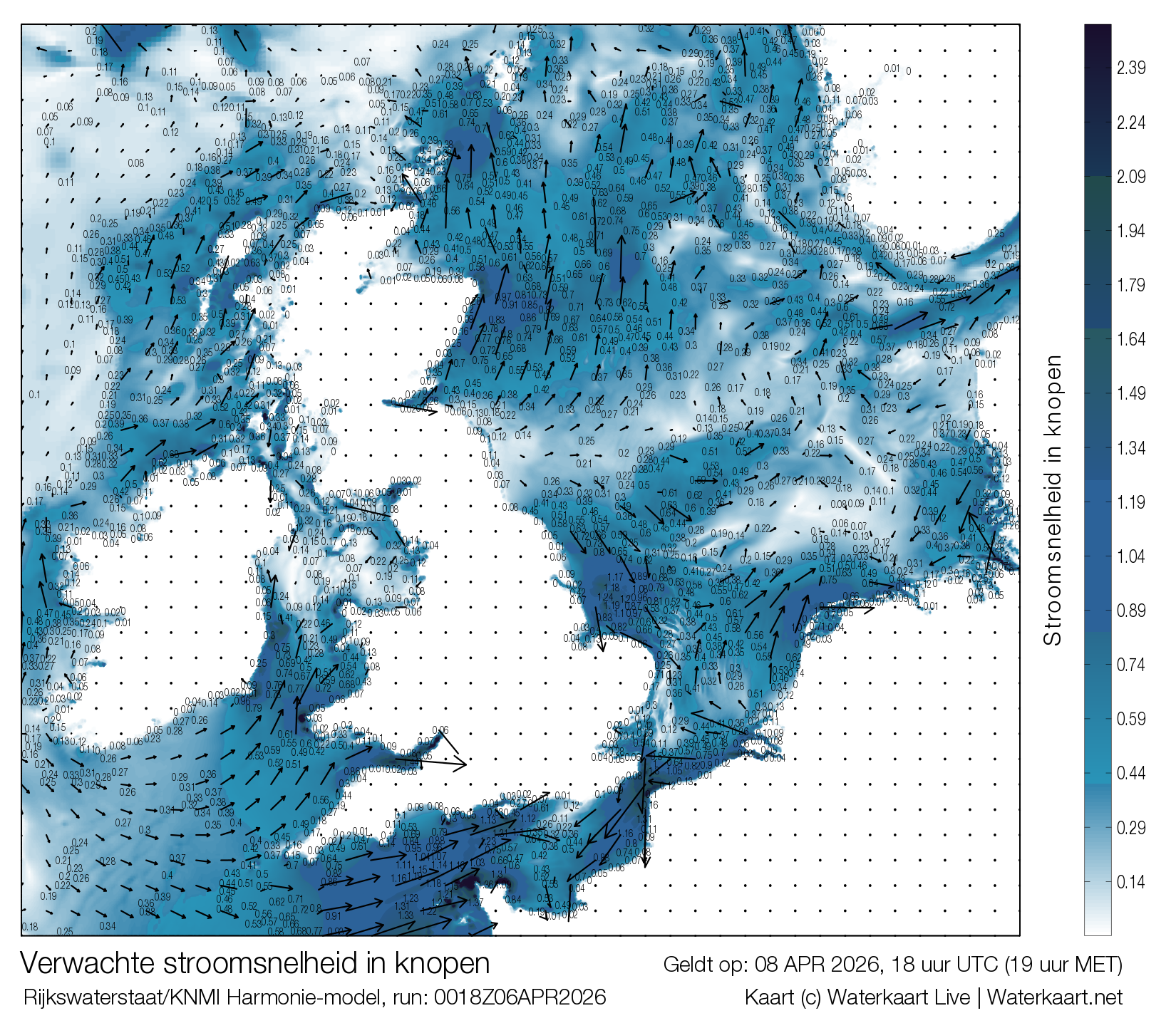 Stroomsnelheden in de Noordzee op basis van de Stroomatlas, verrekend met weersinvloeden. Deze worden iedere dag ververst met data uit het zeestromingen model van Rijkswaterstaat op basis van Harmonie weerdata, voor ieder uur een kaart, tot 48 uur in de toekomst. Lees hieronder meer over dit model