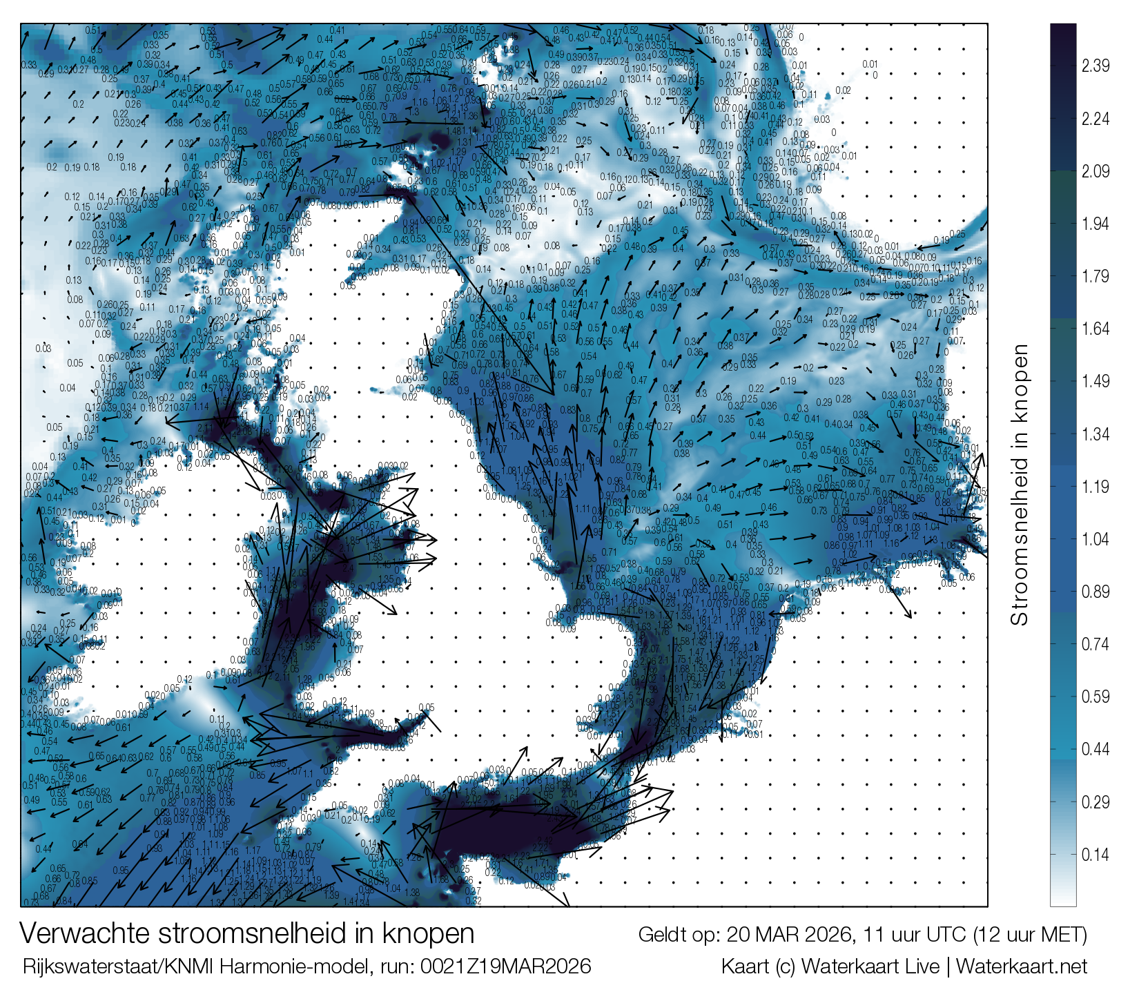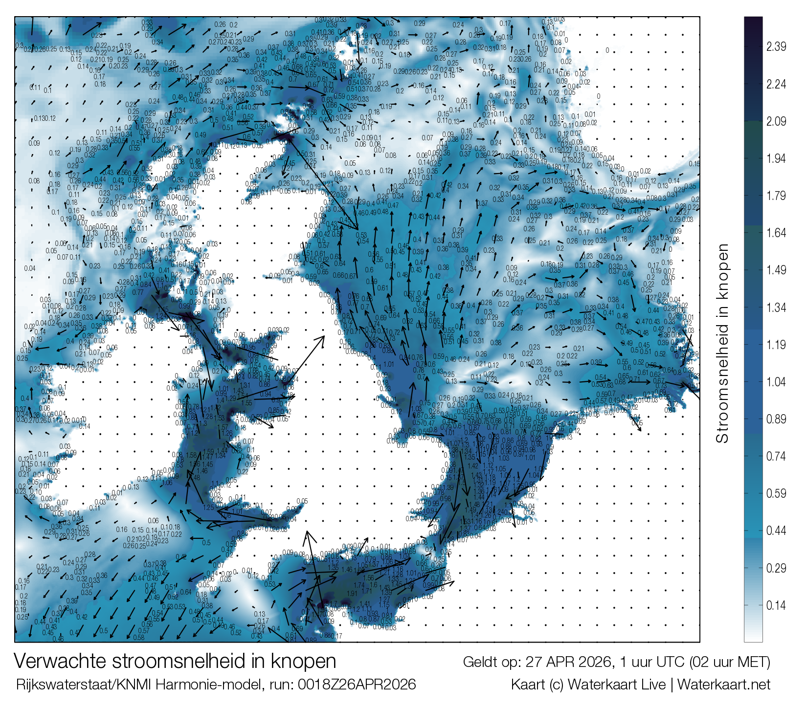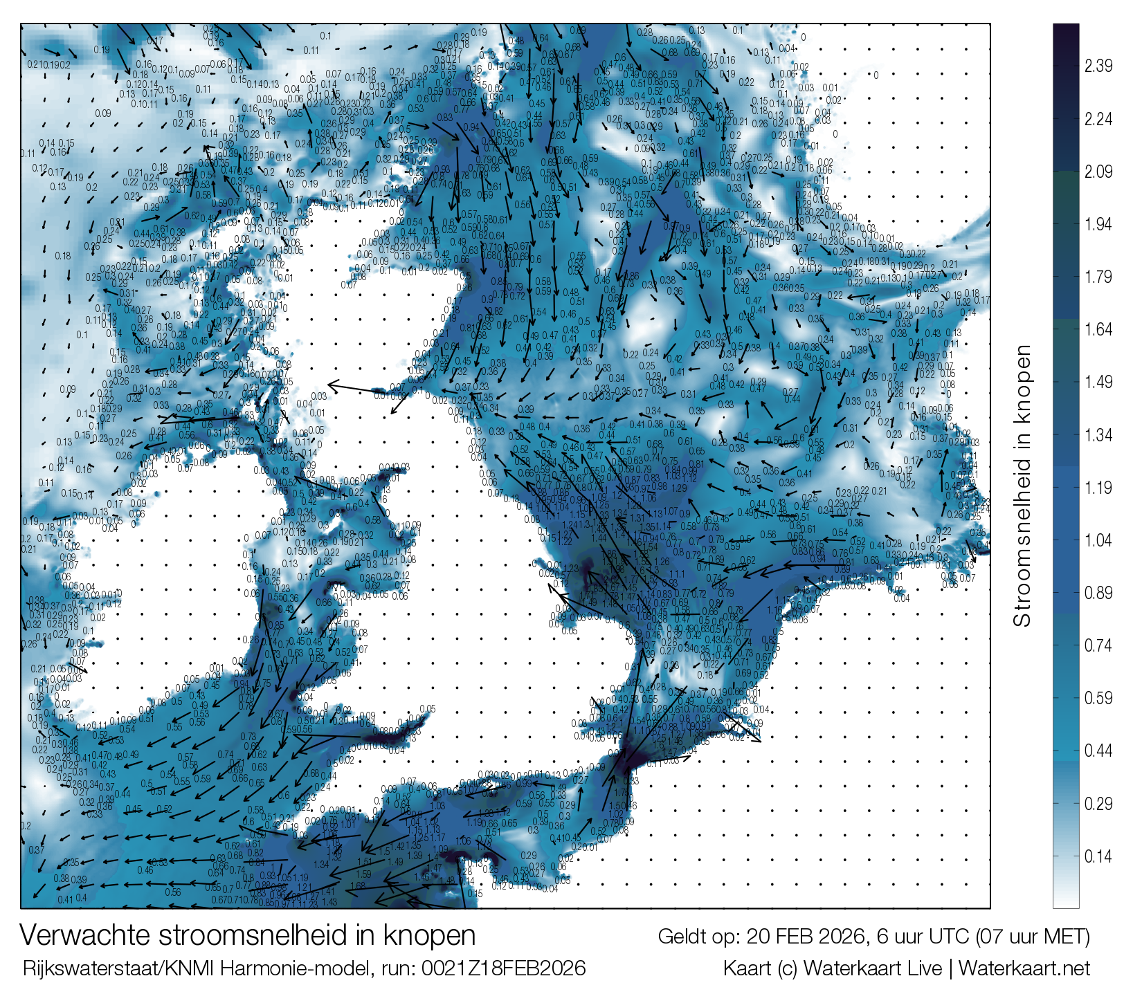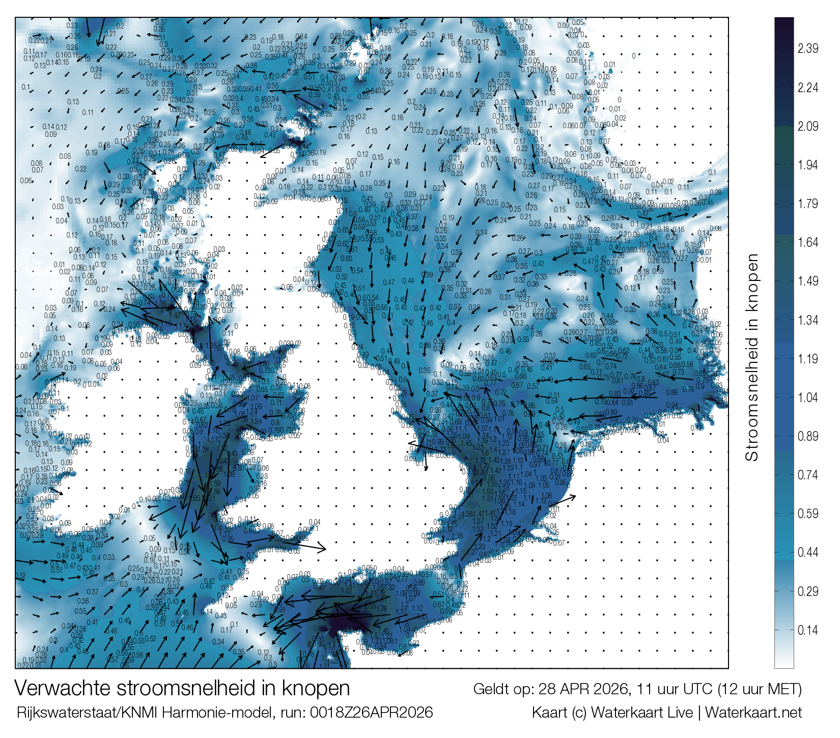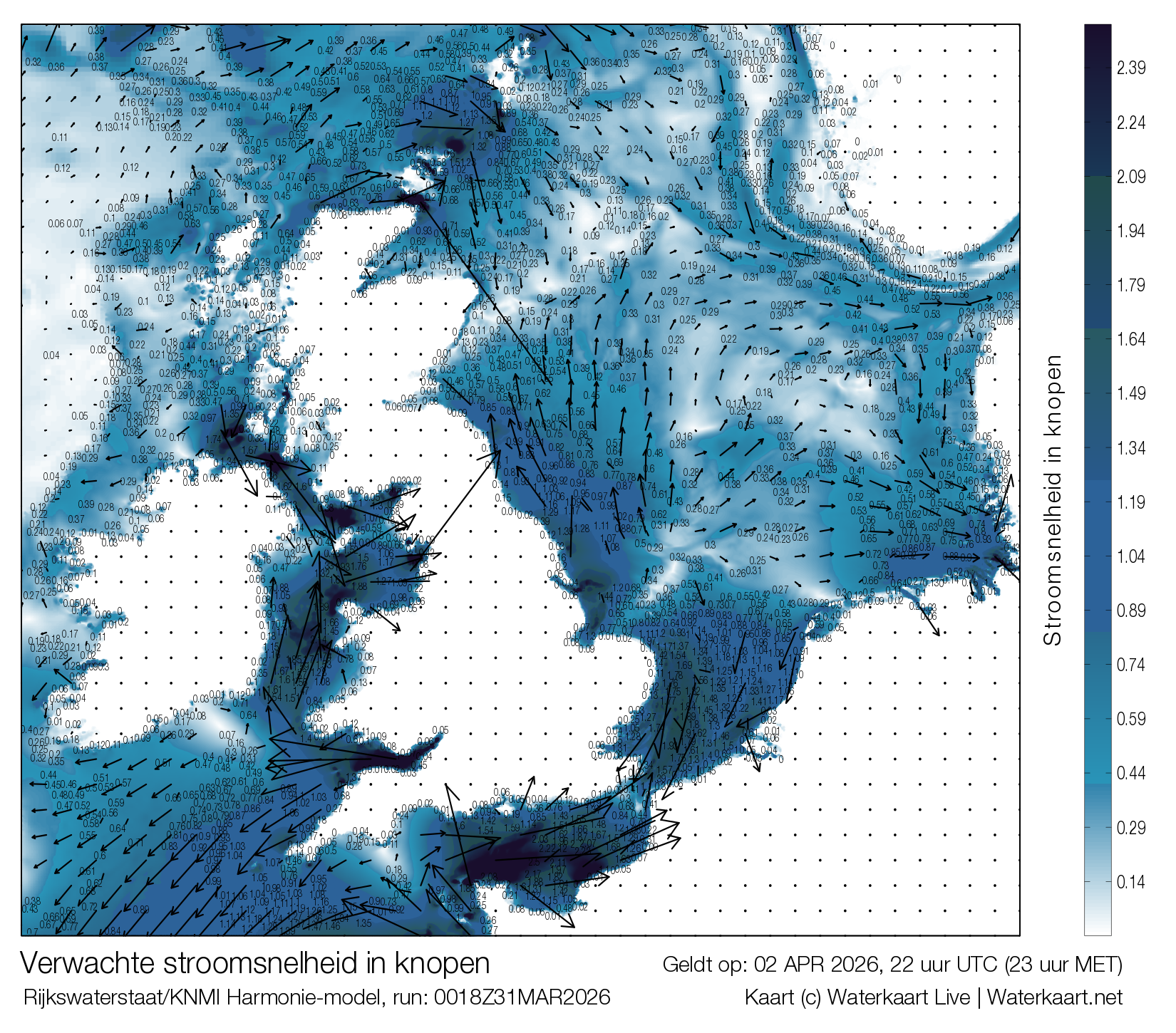 Stroomsnelheden in de Noordzee op basis van de Stroomatlas, verrekend met weersinvloeden. Deze worden iedere dag ververst met data uit het zeestromingen model van Rijkswaterstaat op basis van Harmonie weerdata, voor ieder uur een kaart, tot 48 uur in de toekomst. Lees hieronder meer over dit model
