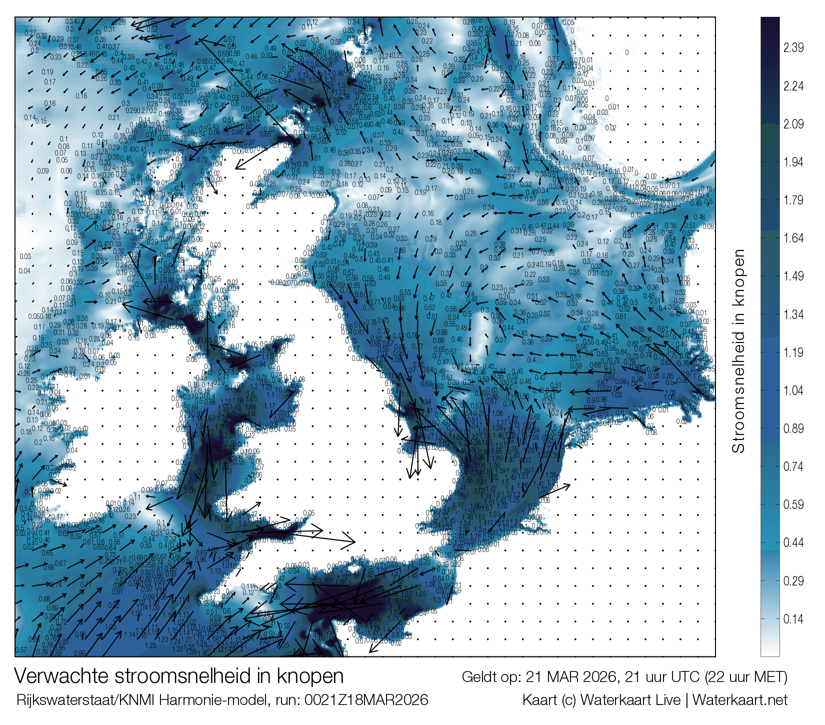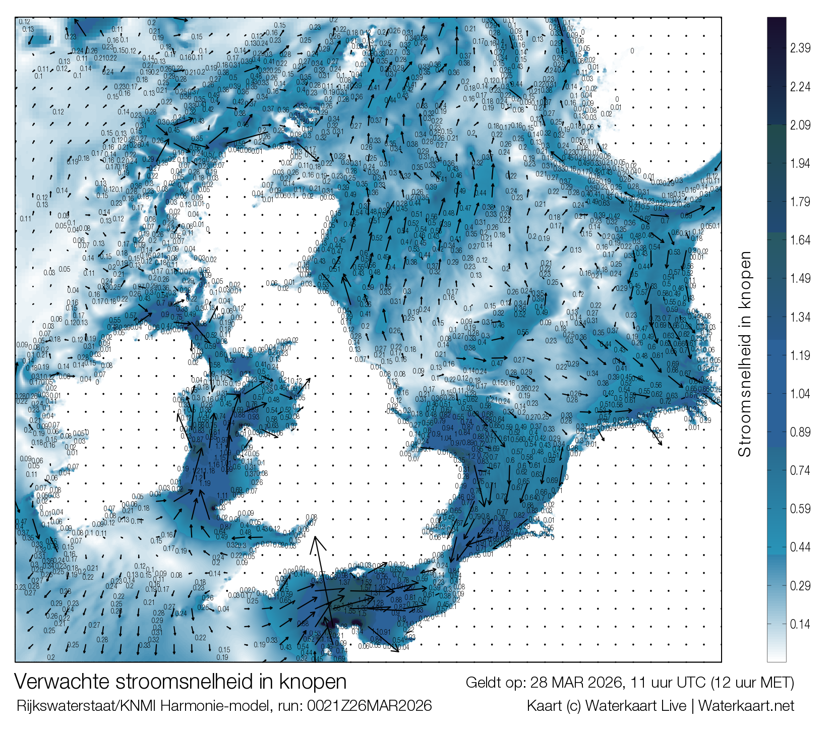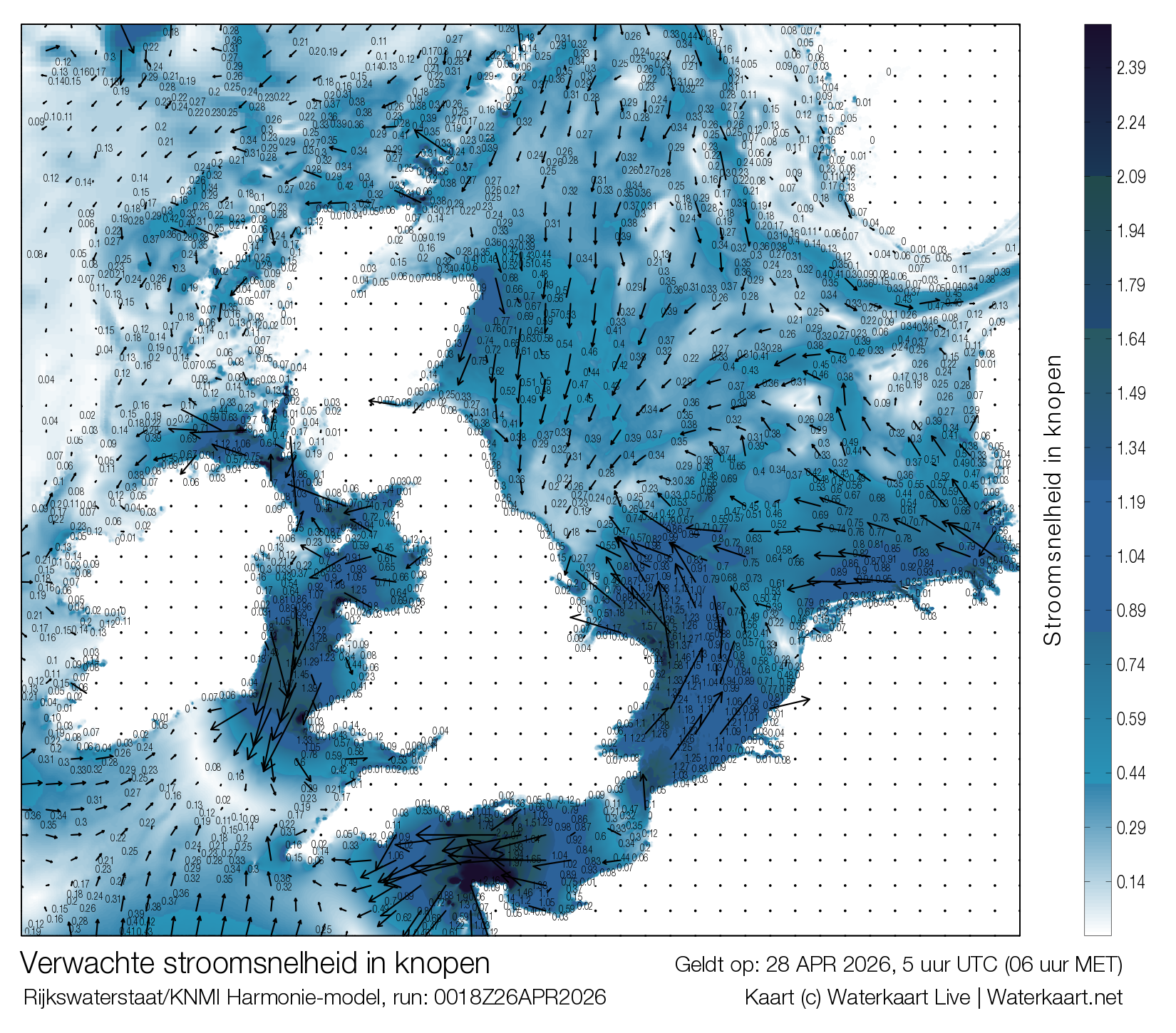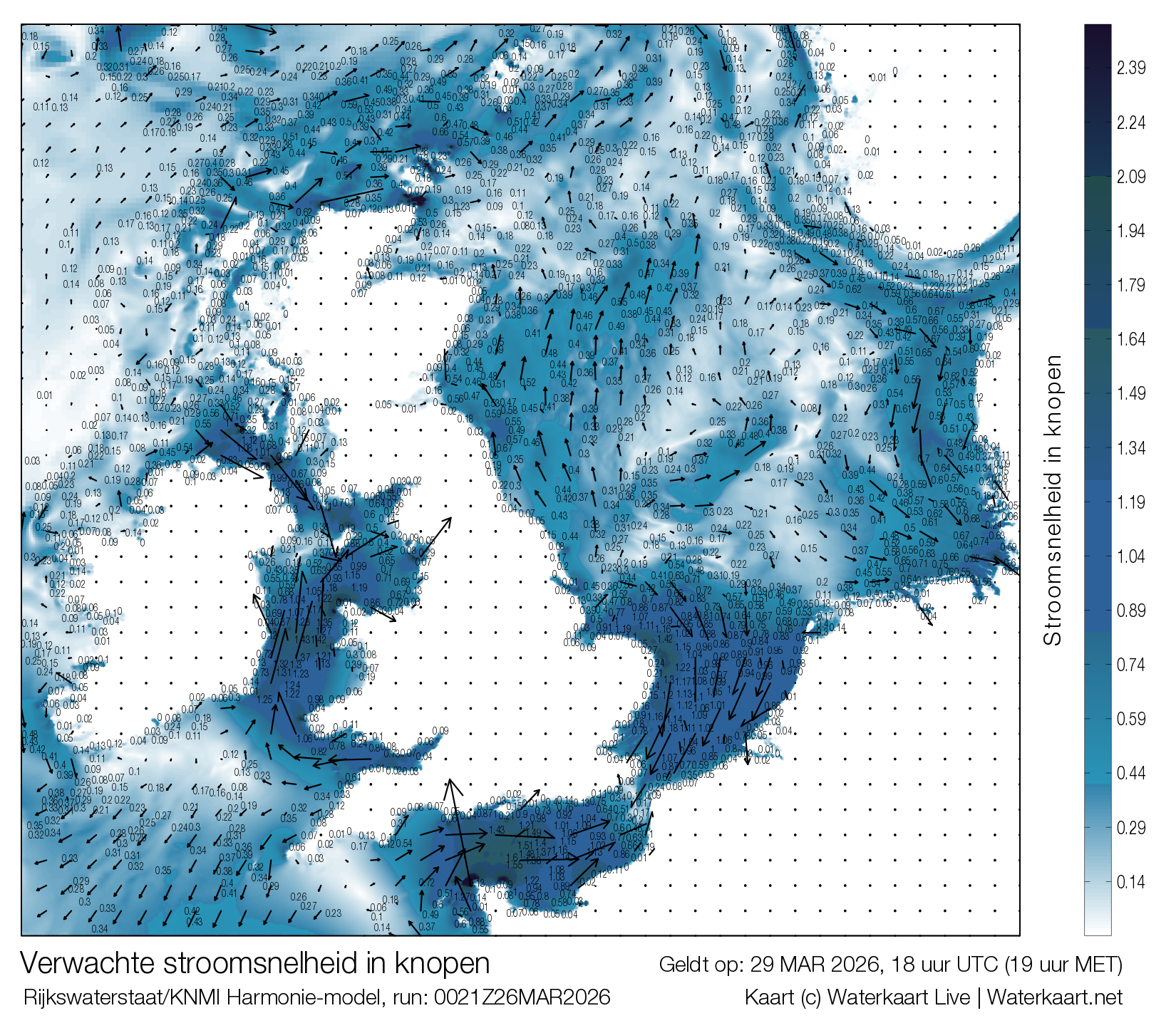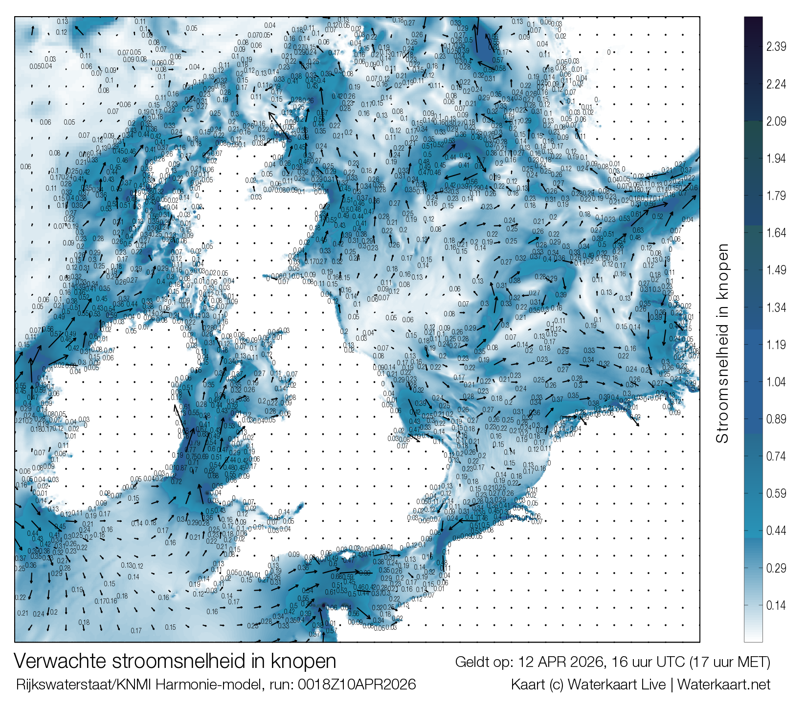 Stroomsnelheden in de Noordzee op basis van de Stroomatlas, verrekend met weersinvloeden. Deze worden iedere dag ververst met data uit het zeestromingen model van Rijkswaterstaat op basis van Harmonie weerdata, voor ieder uur een kaart, tot 48 uur in de toekomst. Lees hieronder meer over dit model