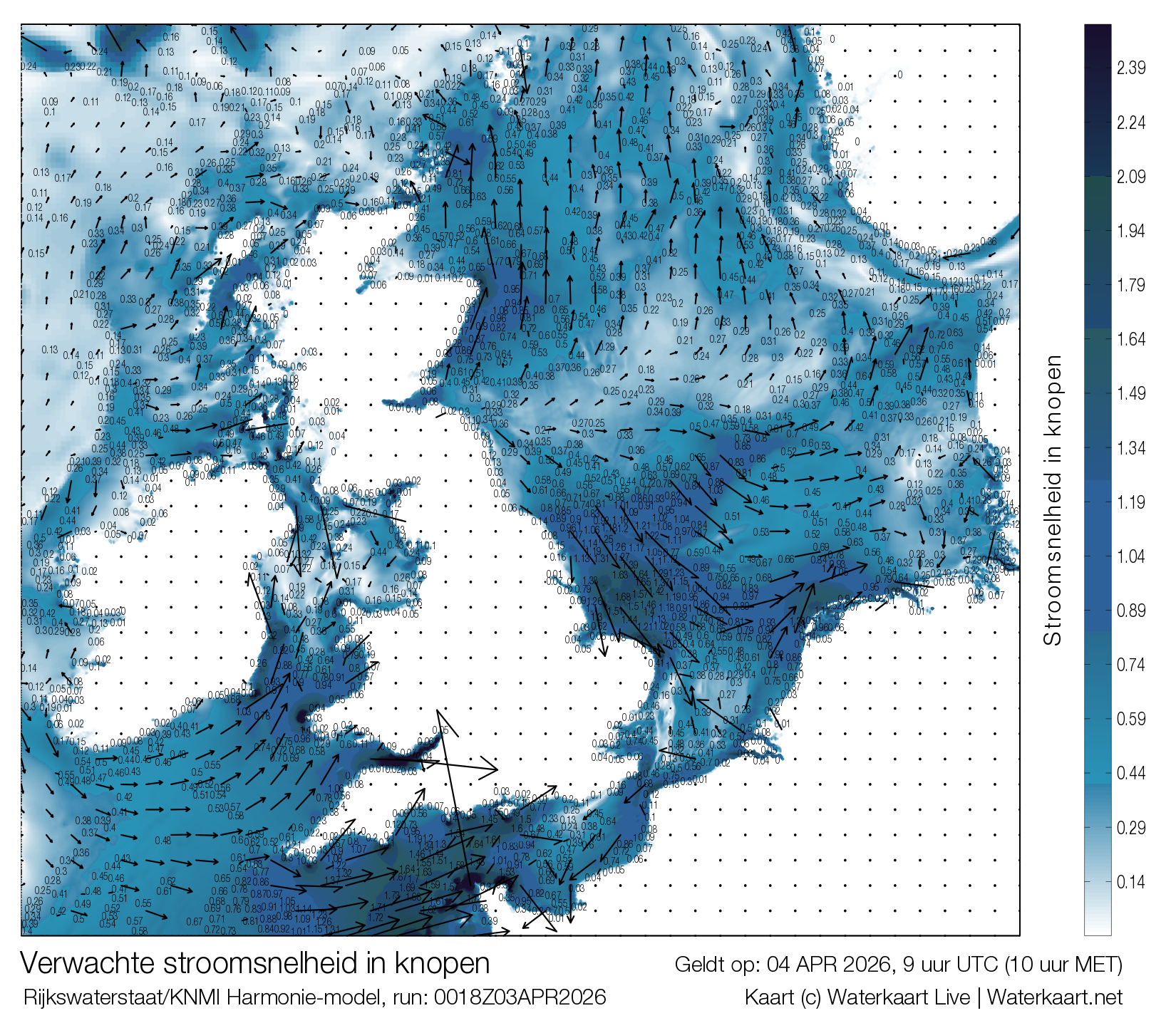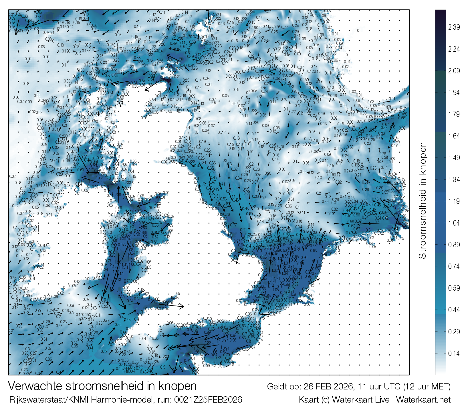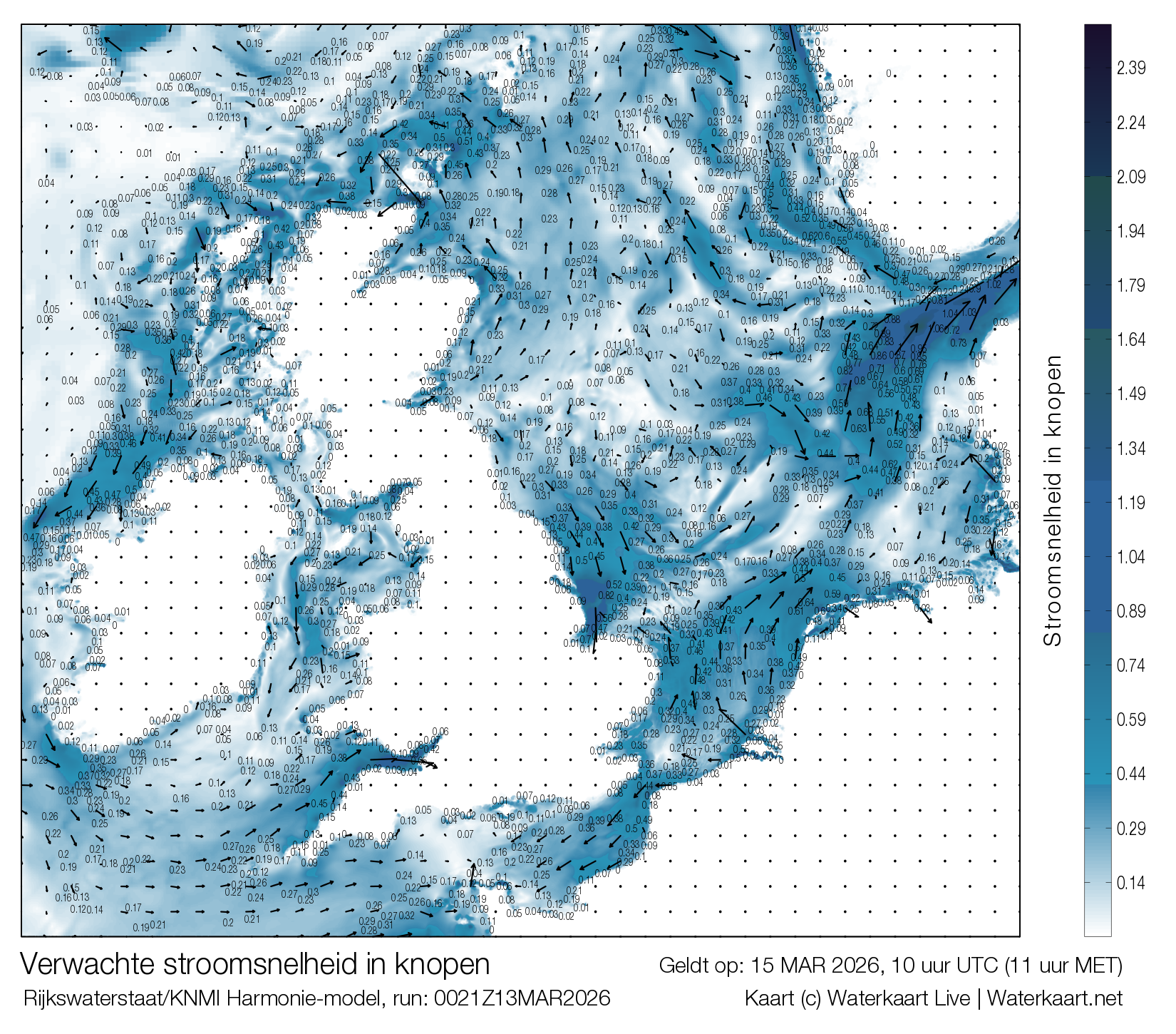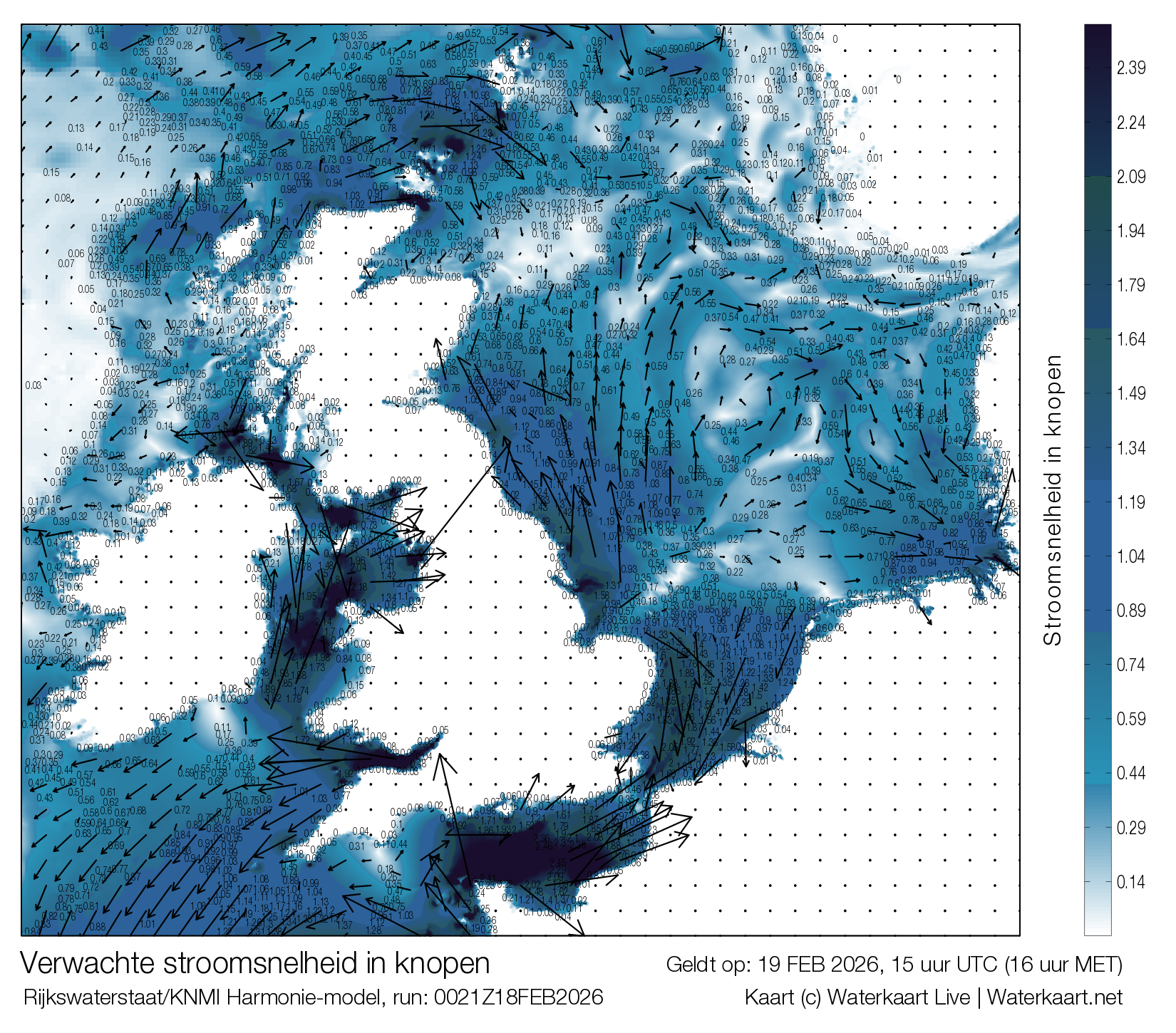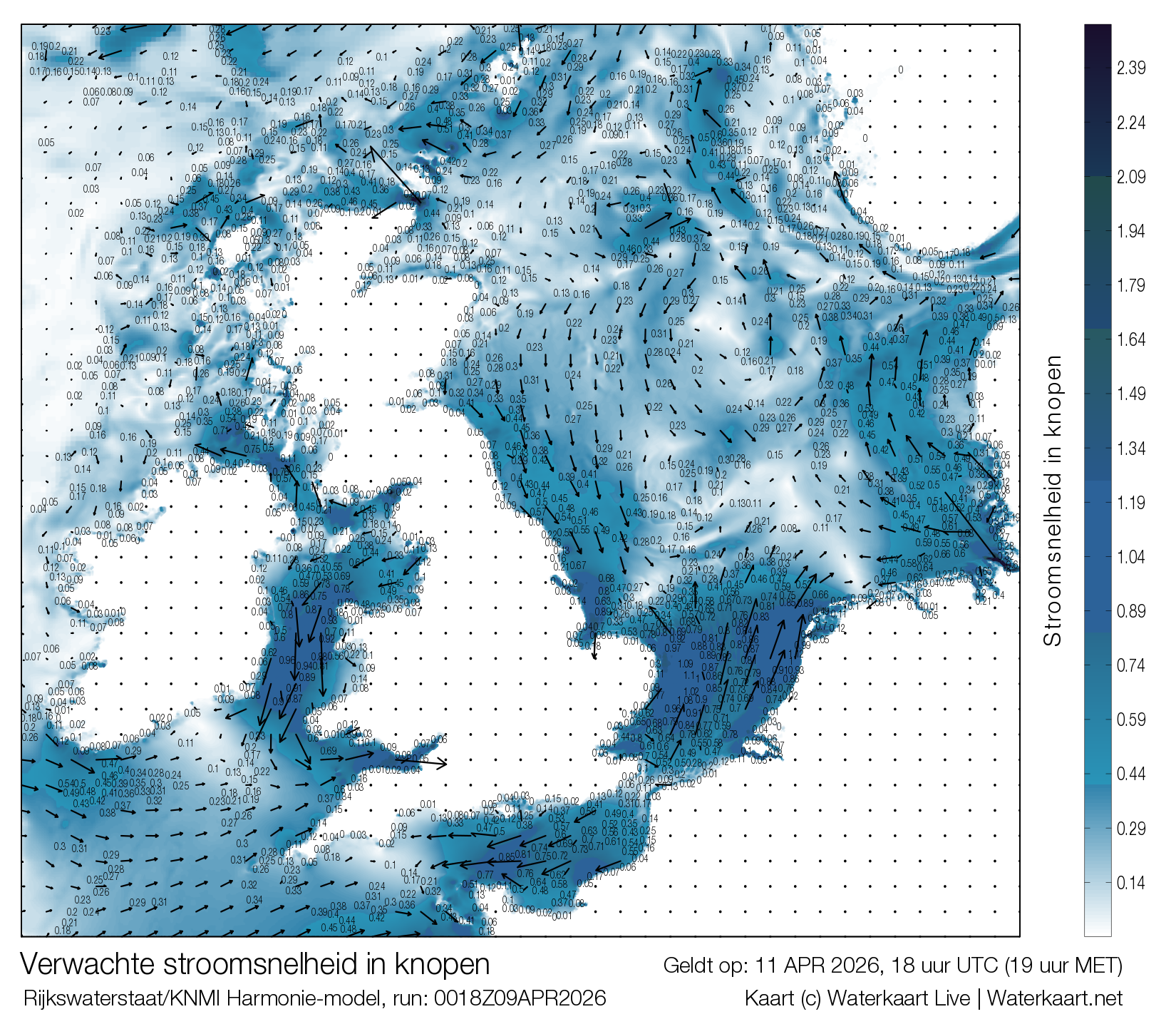 Stroomsnelheden in de Noordzee op basis van de Stroomatlas, verrekend met weersinvloeden. Deze worden iedere dag ververst met data uit het zeestromingen model van Rijkswaterstaat op basis van Harmonie weerdata, voor ieder uur een kaart, tot 48 uur in de toekomst. Lees hieronder meer over dit model