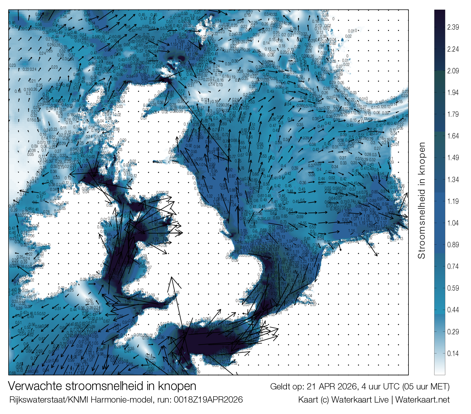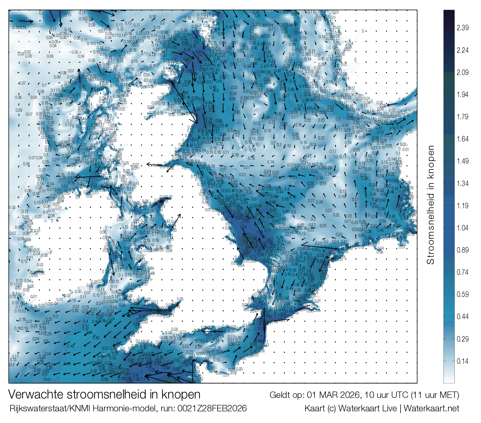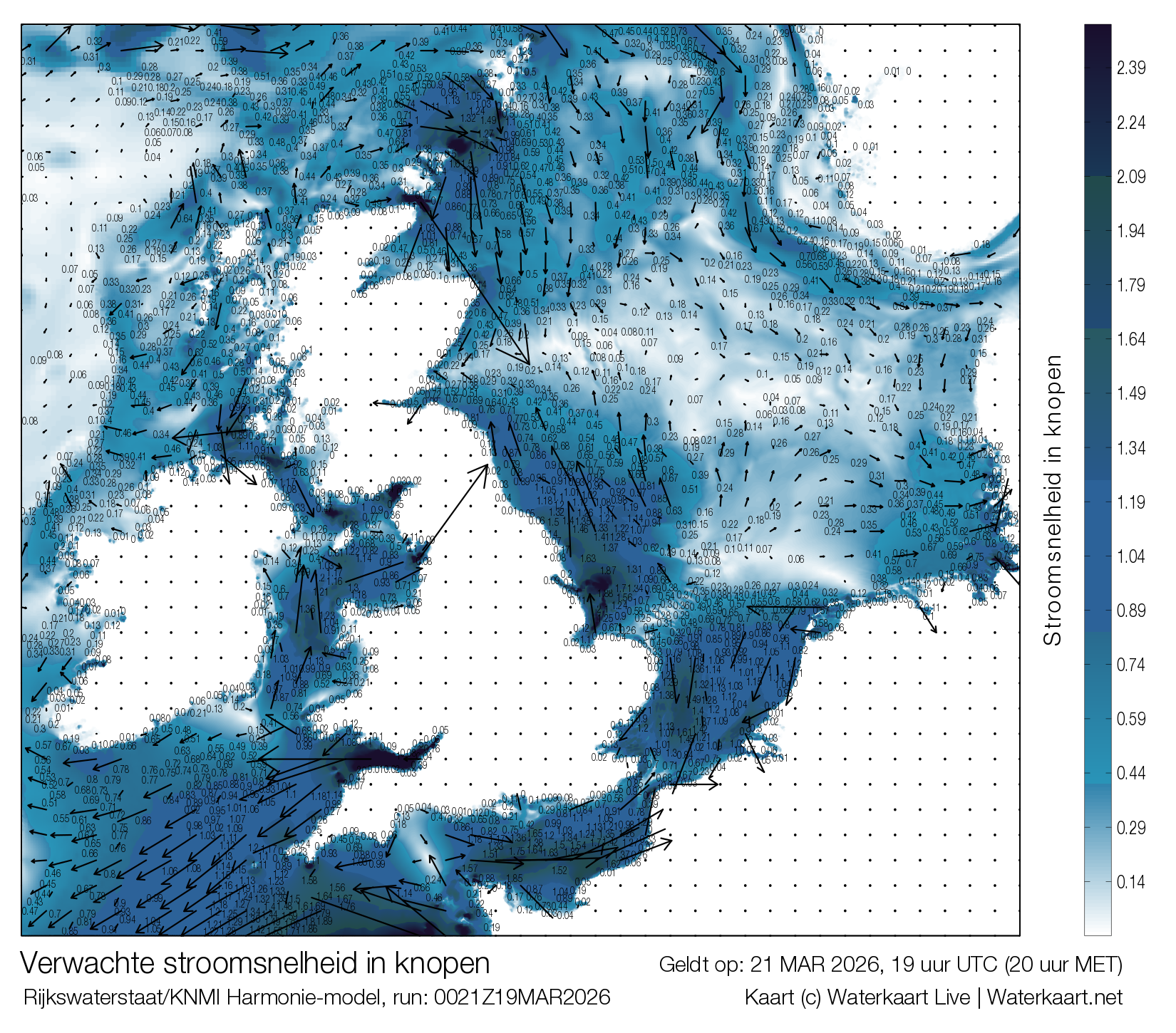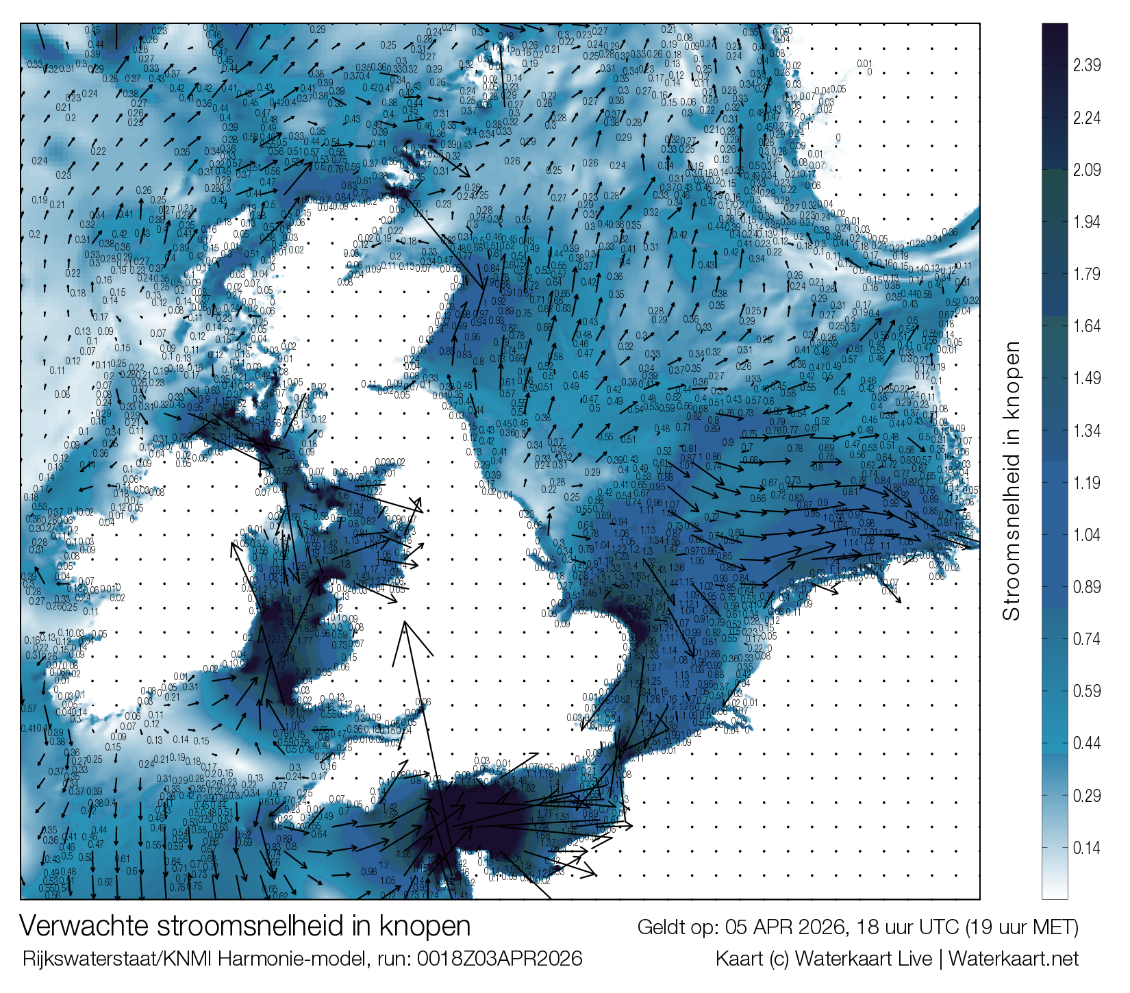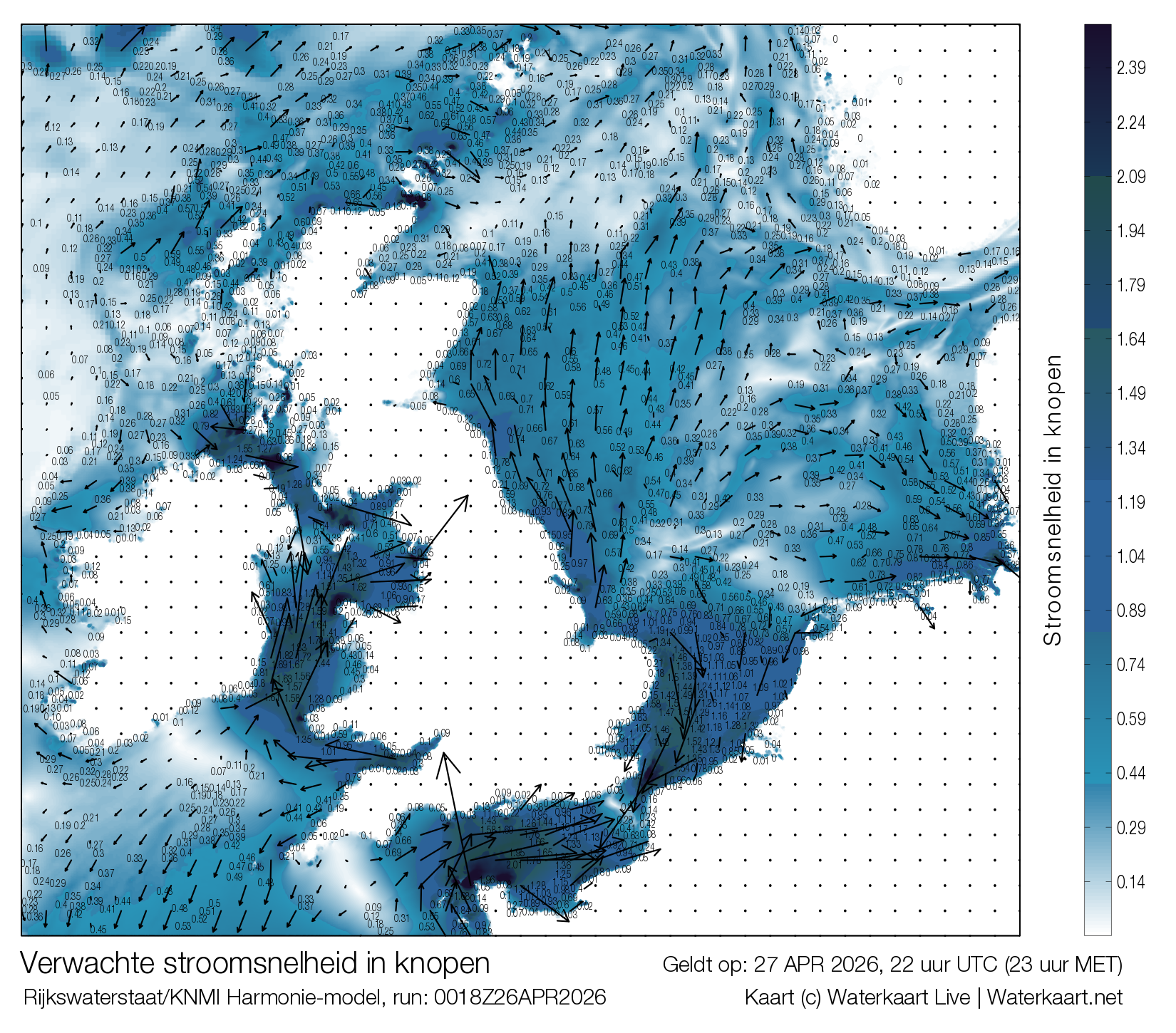 Stroomsnelheden in de Noordzee op basis van de Stroomatlas, verrekend met weersinvloeden. Deze worden iedere dag ververst met data uit het zeestromingen model van Rijkswaterstaat op basis van Harmonie weerdata, voor ieder uur een kaart, tot 48 uur in de toekomst. Lees hieronder meer over dit model