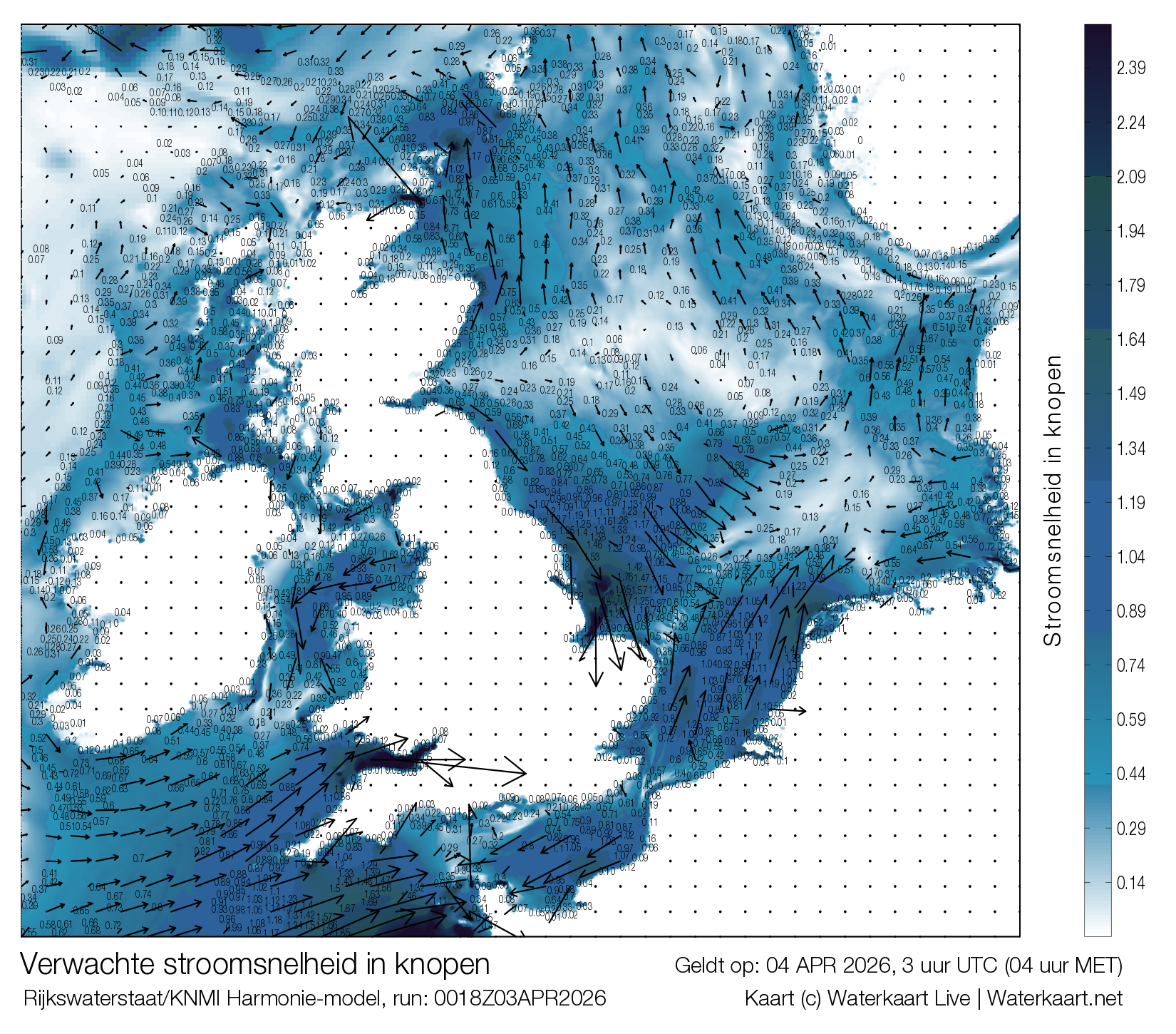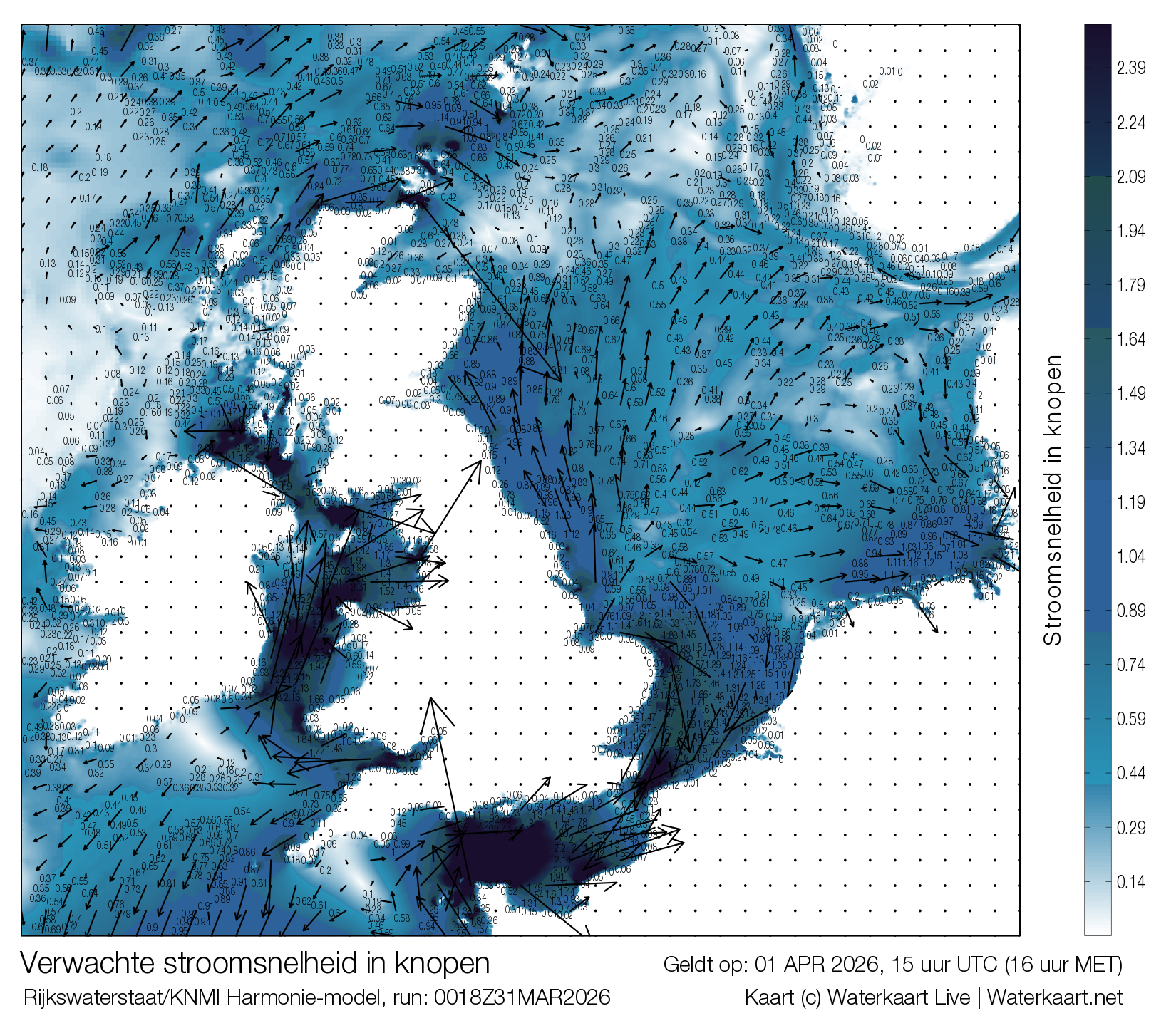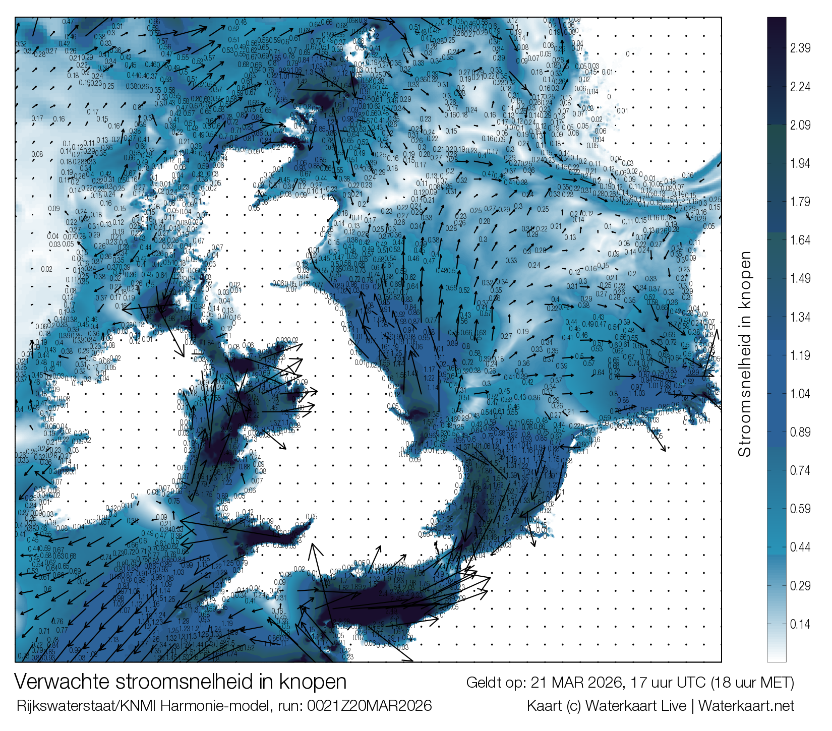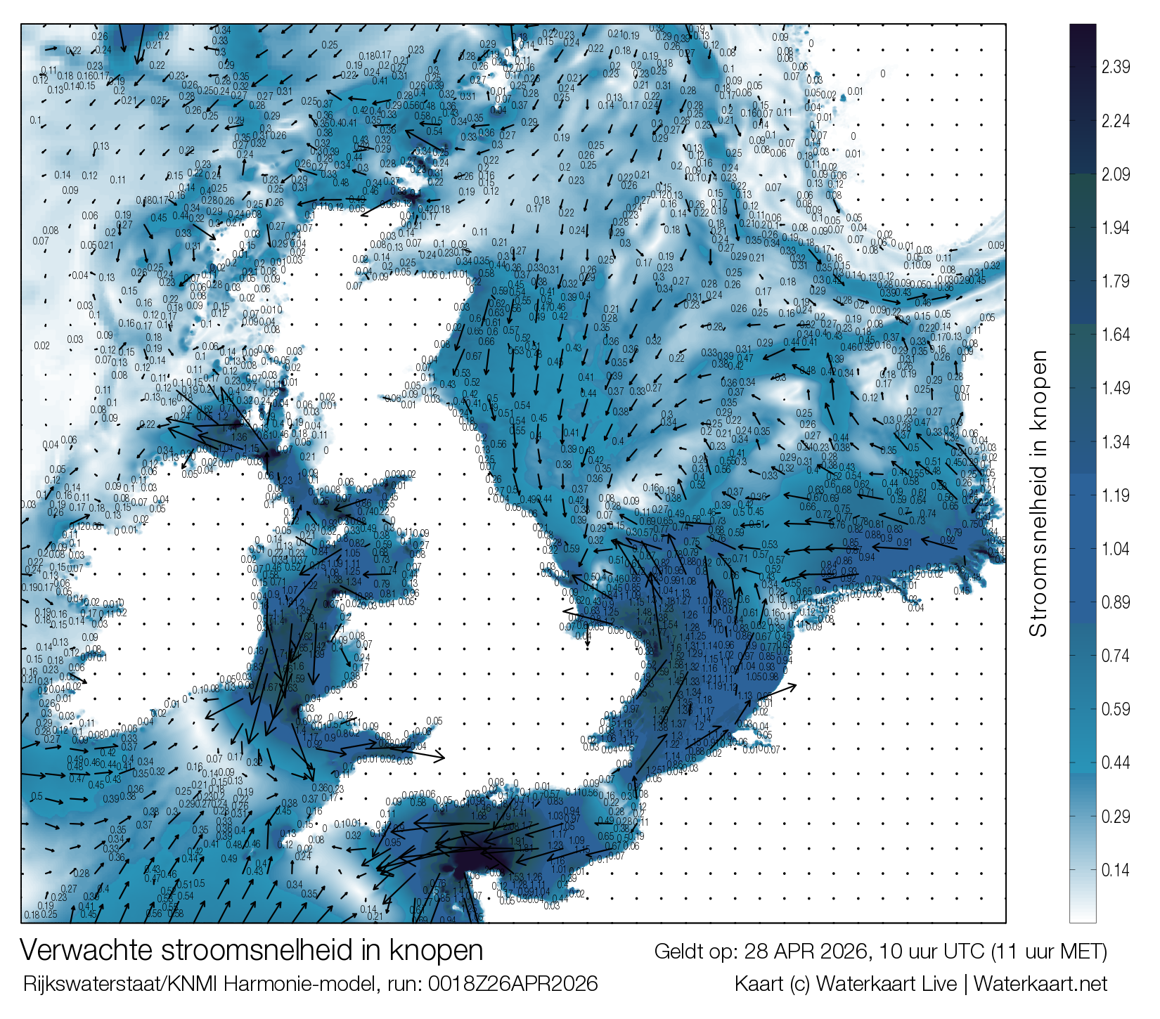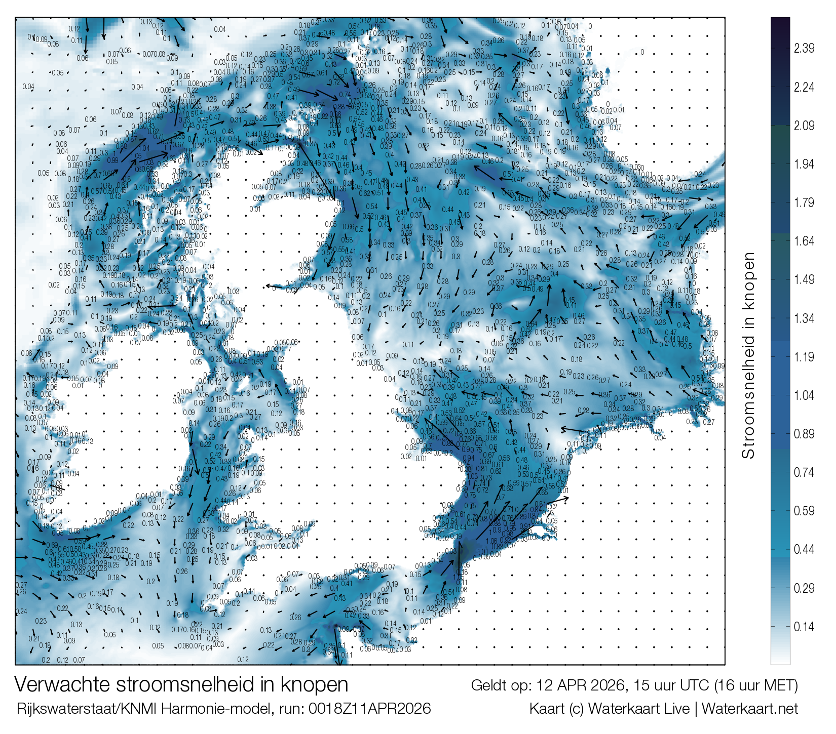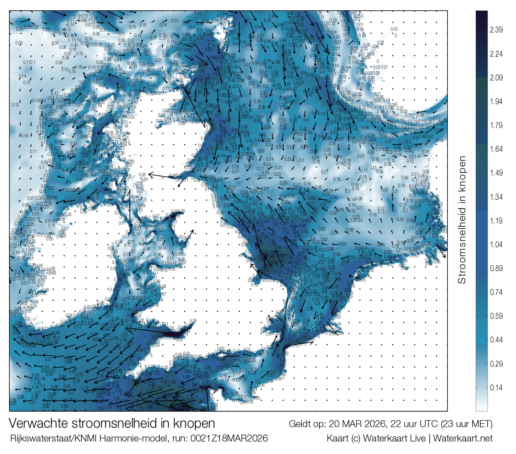 Stroomsnelheden in de Noordzee op basis van de Stroomatlas, verrekend met weersinvloeden. Deze worden iedere dag ververst met data uit het zeestromingen model van Rijkswaterstaat op basis van Harmonie weerdata, voor ieder uur een kaart, tot 48 uur in de toekomst. Lees hieronder meer over dit model