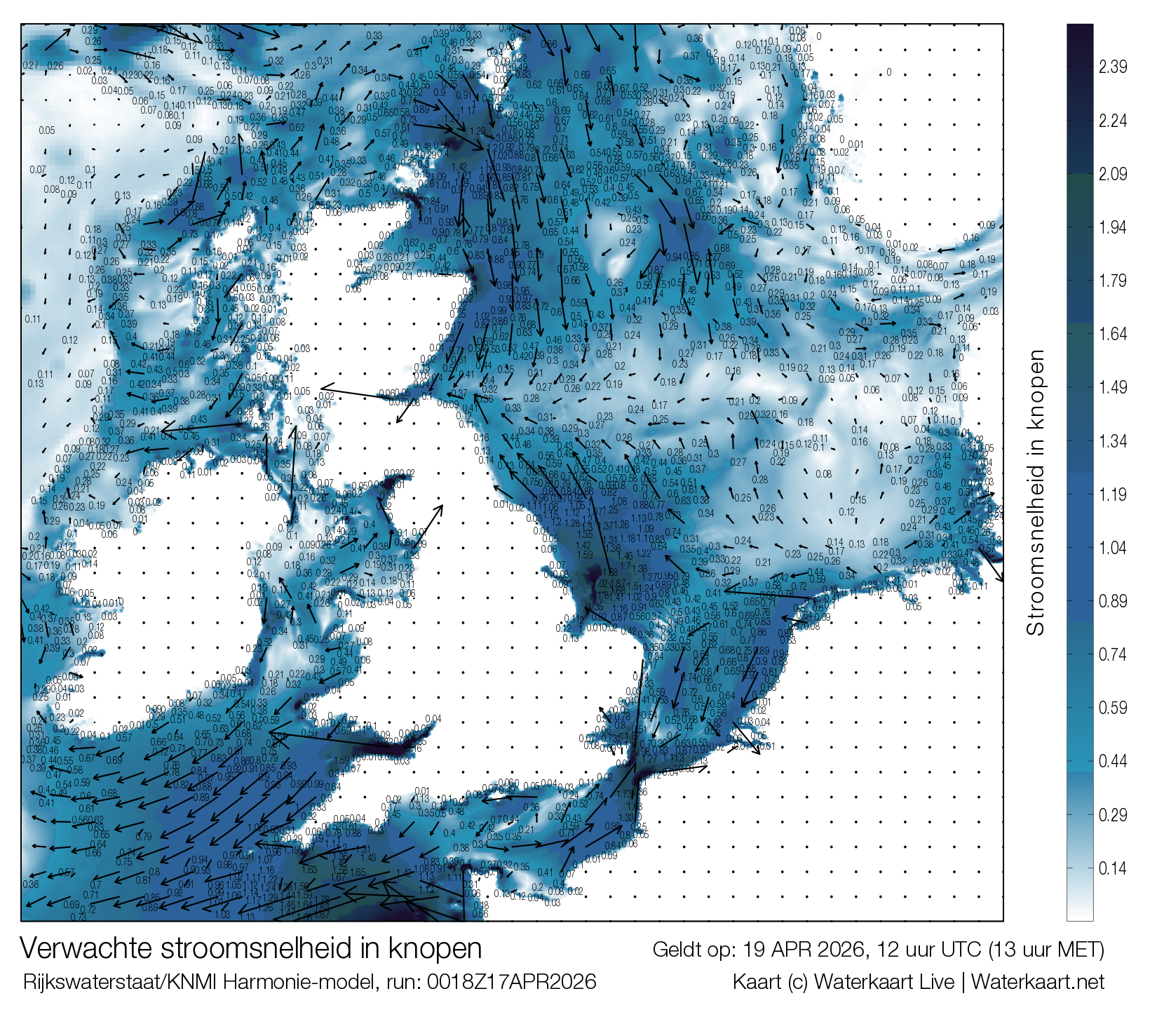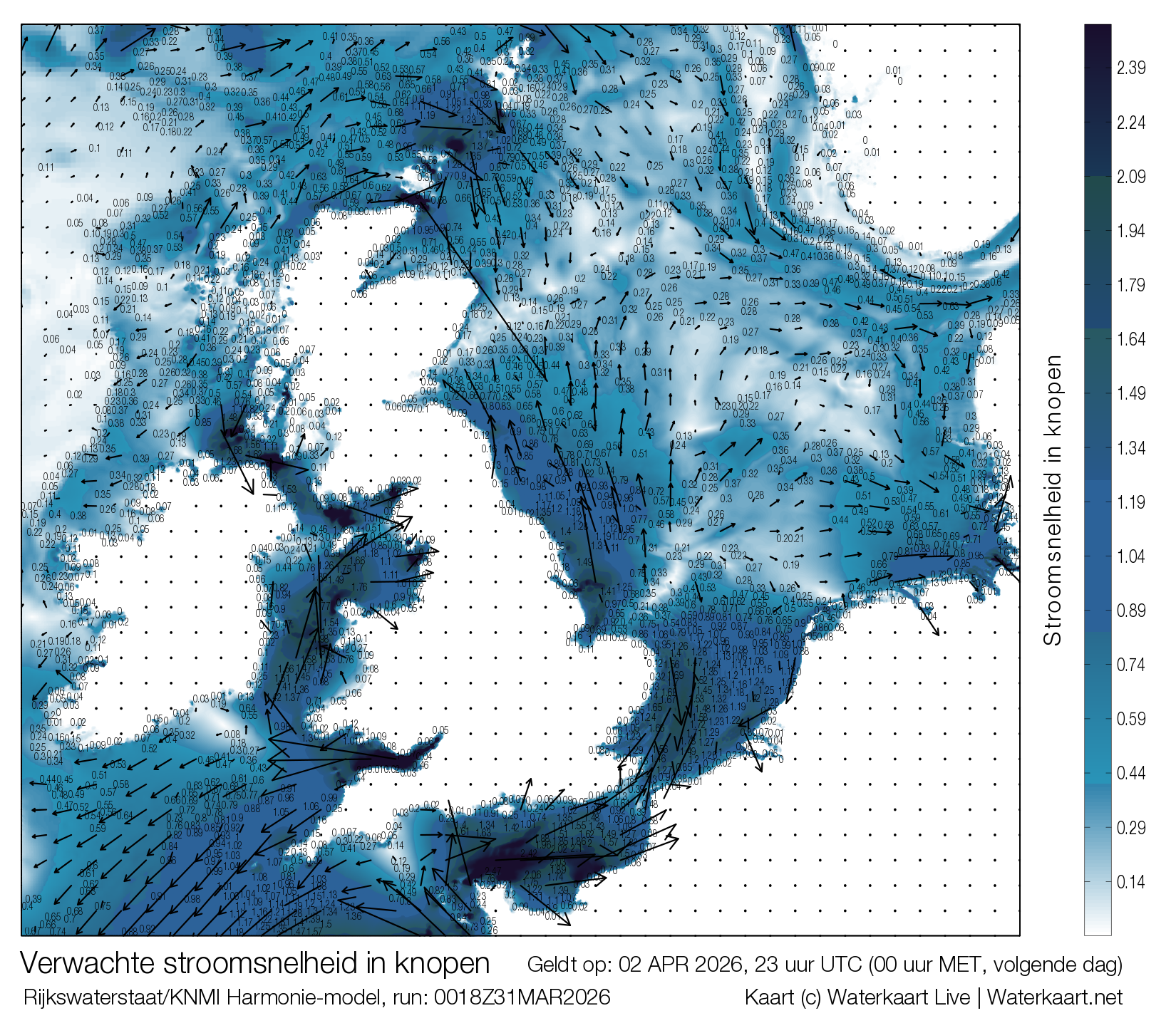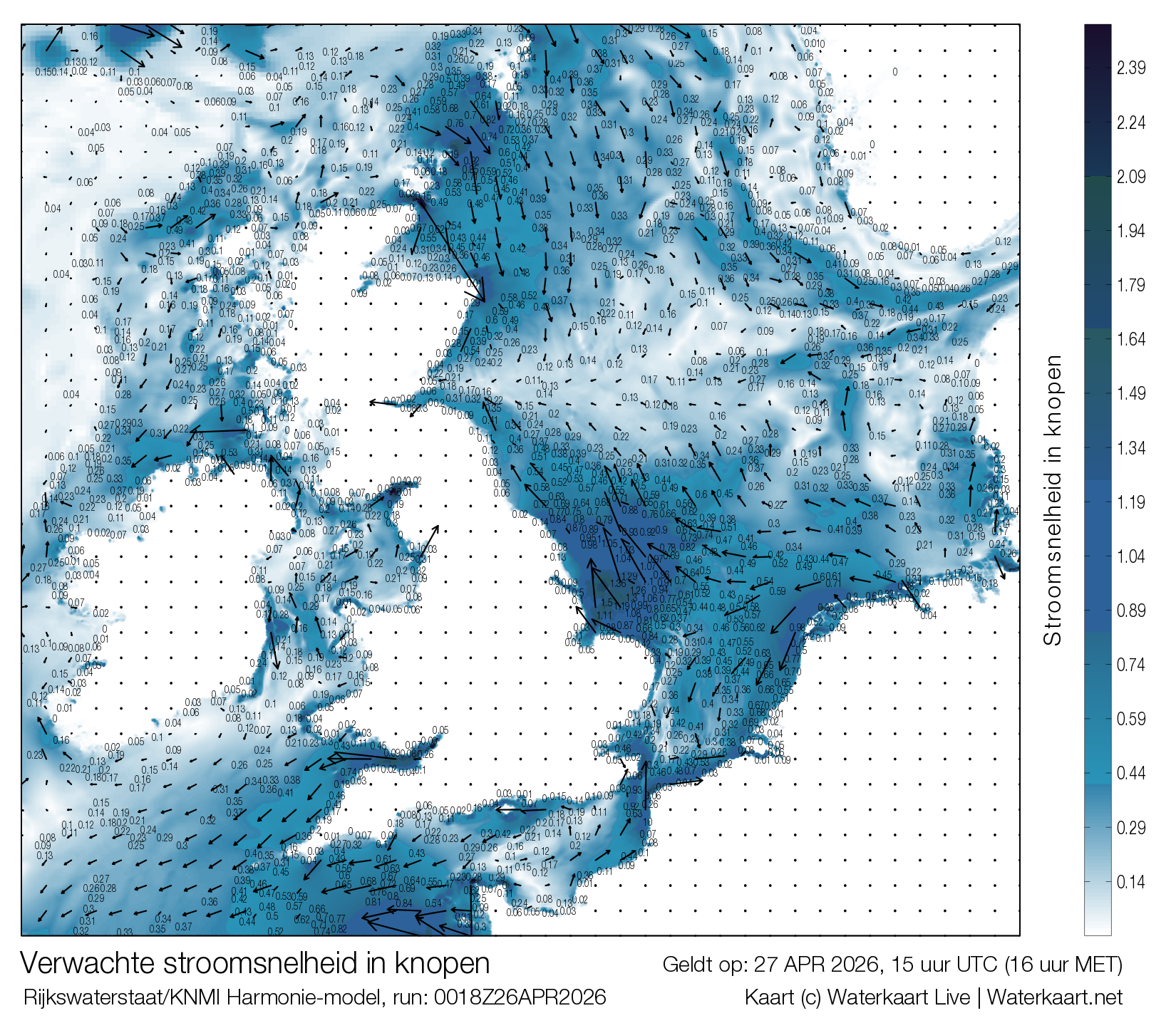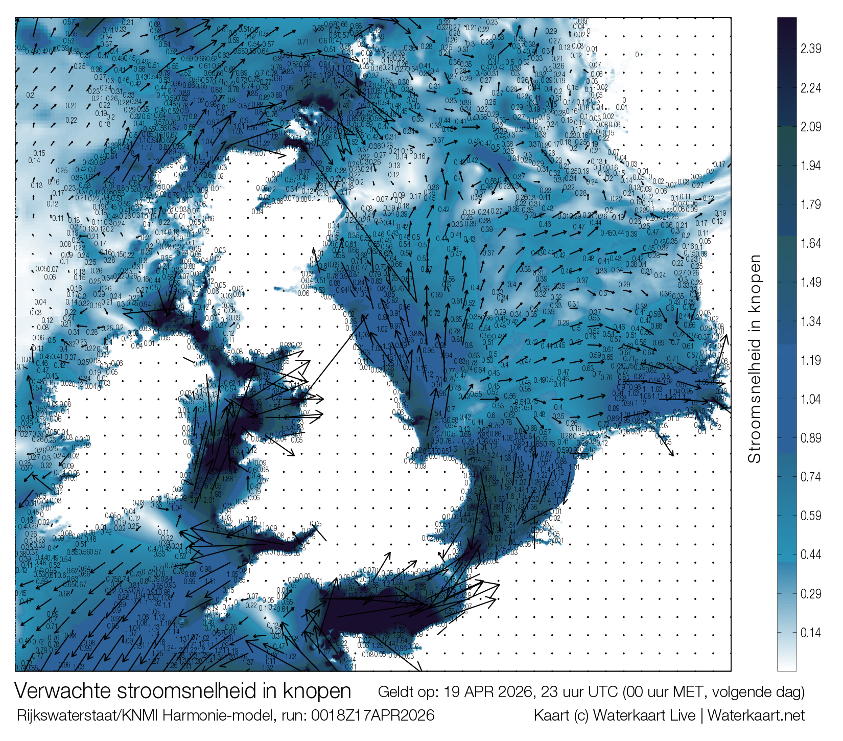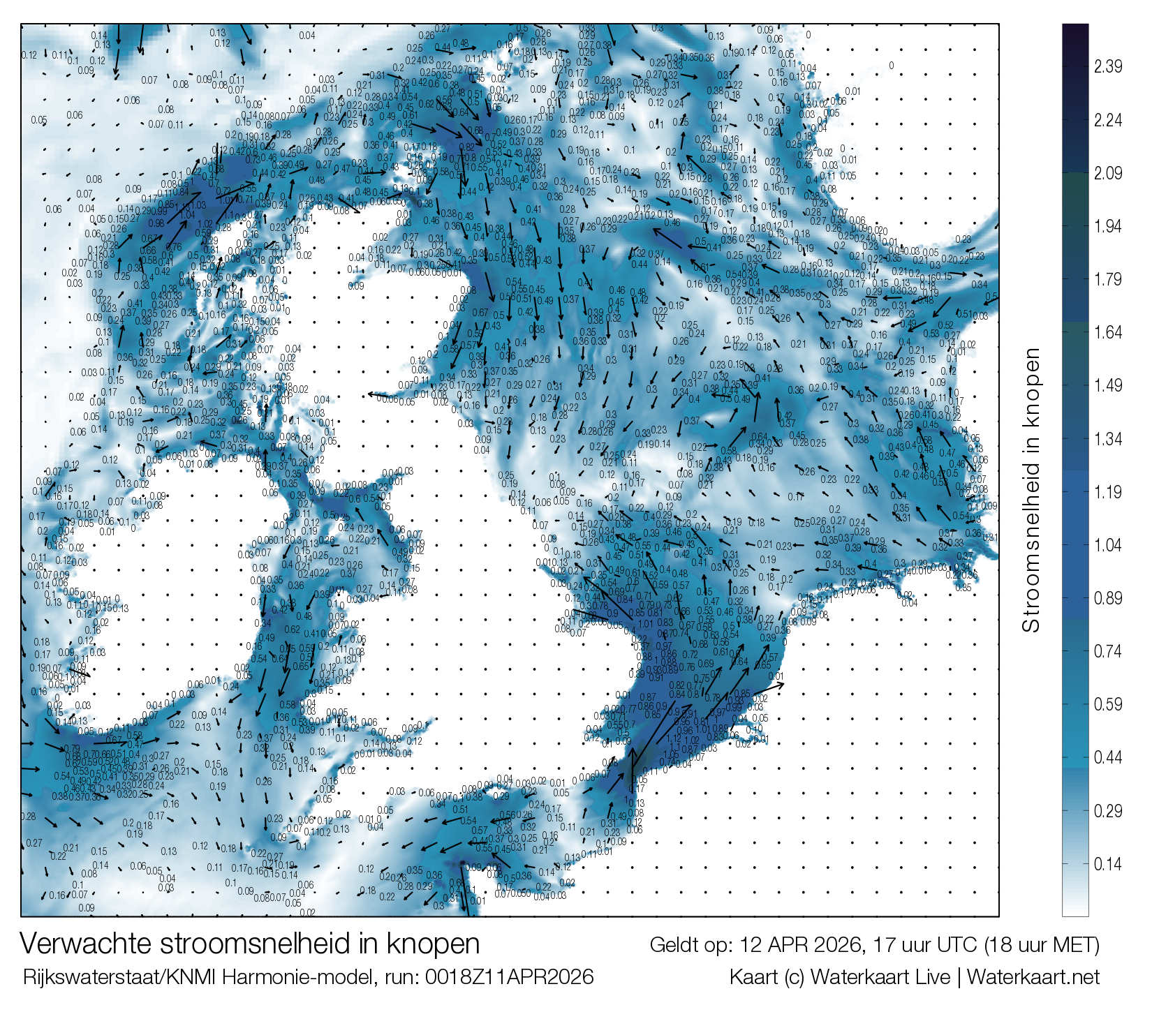 Stroomsnelheden in de Noordzee op basis van de Stroomatlas, verrekend met weersinvloeden. Deze worden iedere dag ververst met data uit het zeestromingen model van Rijkswaterstaat op basis van Harmonie weerdata, voor ieder uur een kaart, tot 48 uur in de toekomst. Lees hieronder meer over dit model