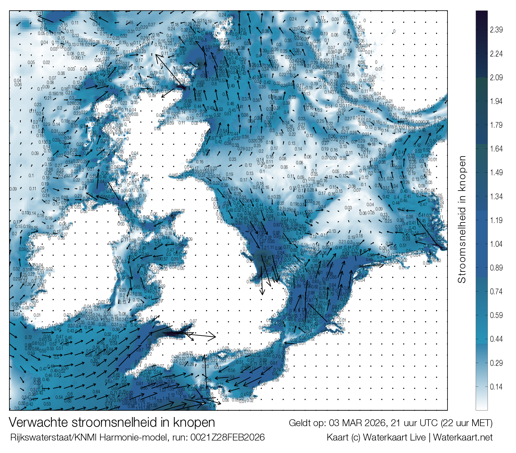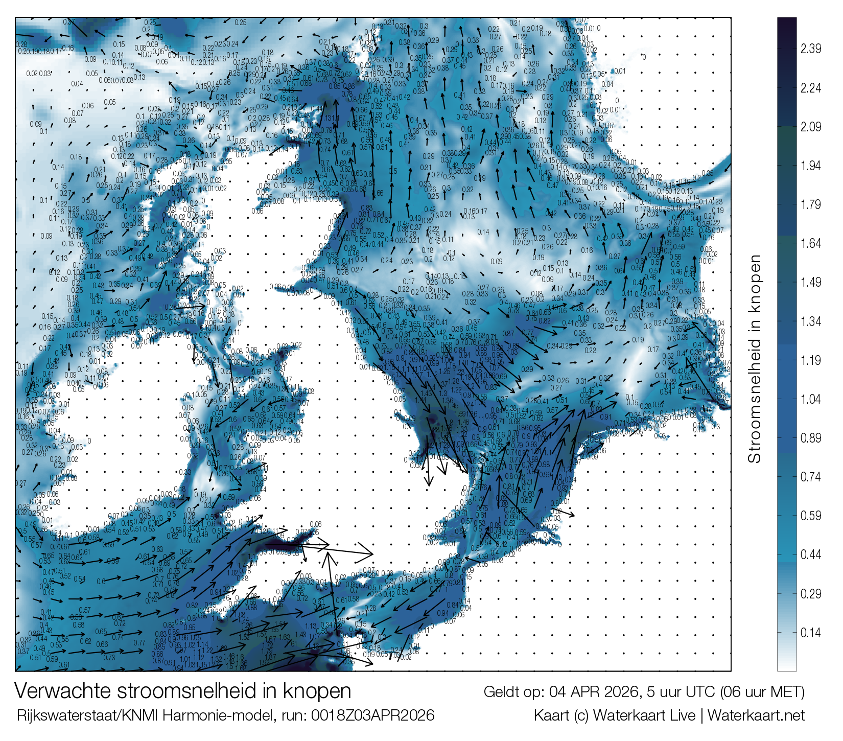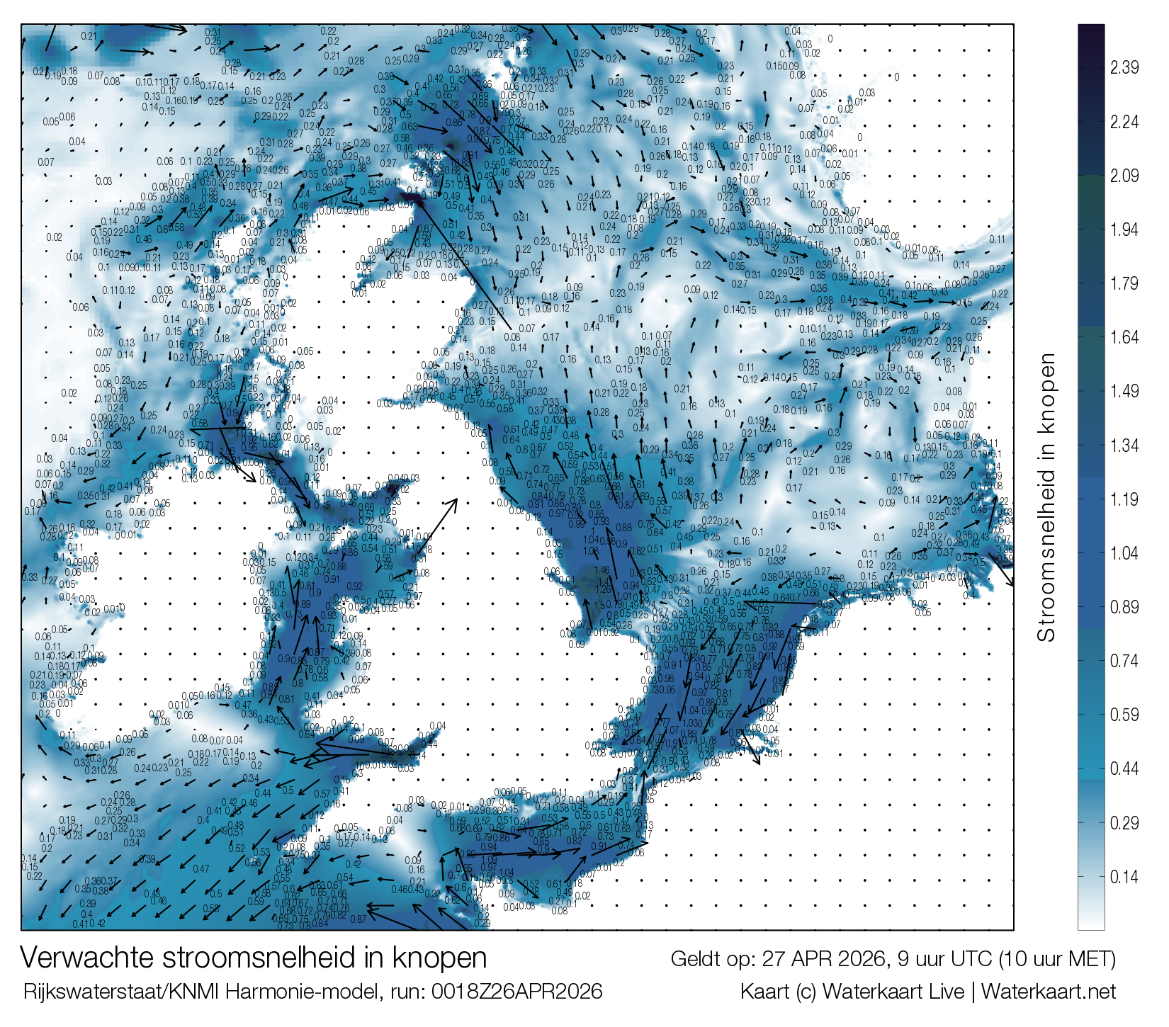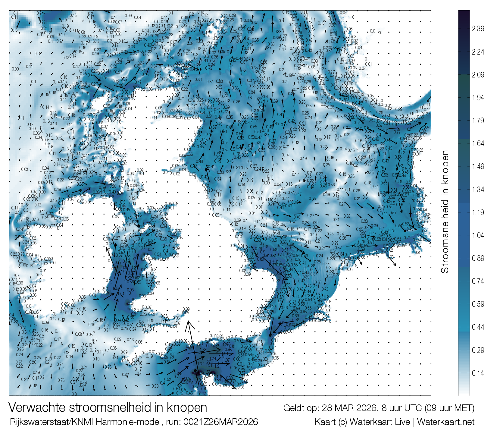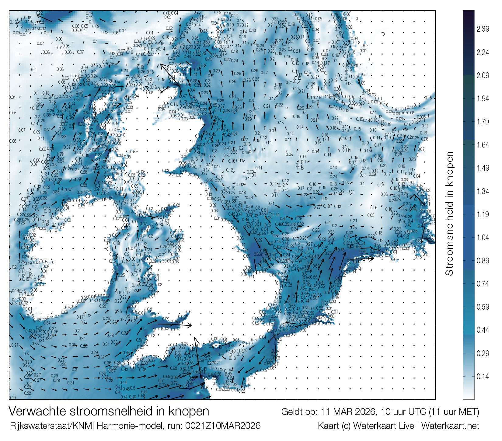 Stroomsnelheden in de Noordzee op basis van de Stroomatlas, verrekend met weersinvloeden. Deze worden iedere dag ververst met data uit het zeestromingen model van Rijkswaterstaat op basis van Harmonie weerdata, voor ieder uur een kaart, tot 48 uur in de toekomst. Lees hieronder meer over dit model