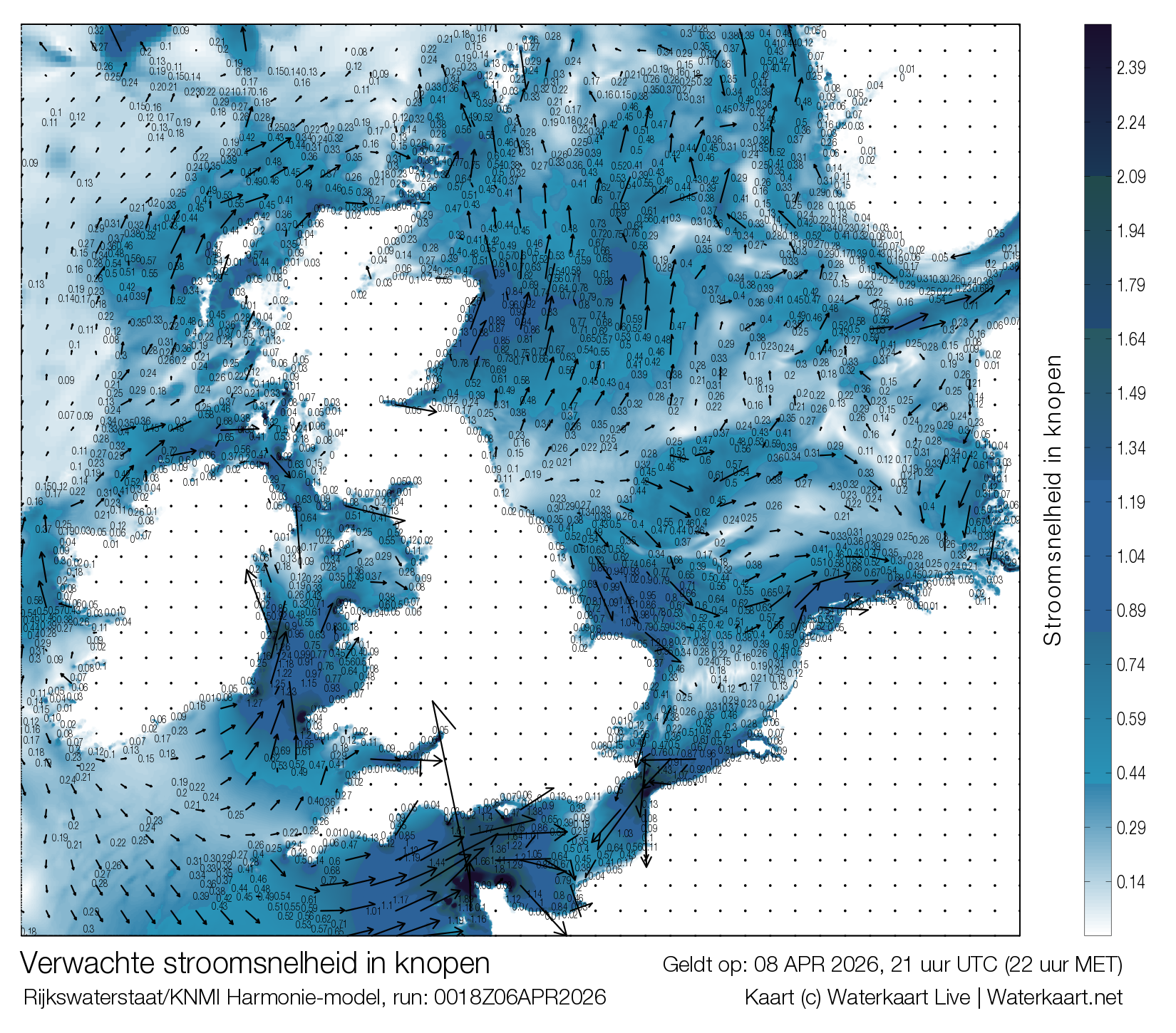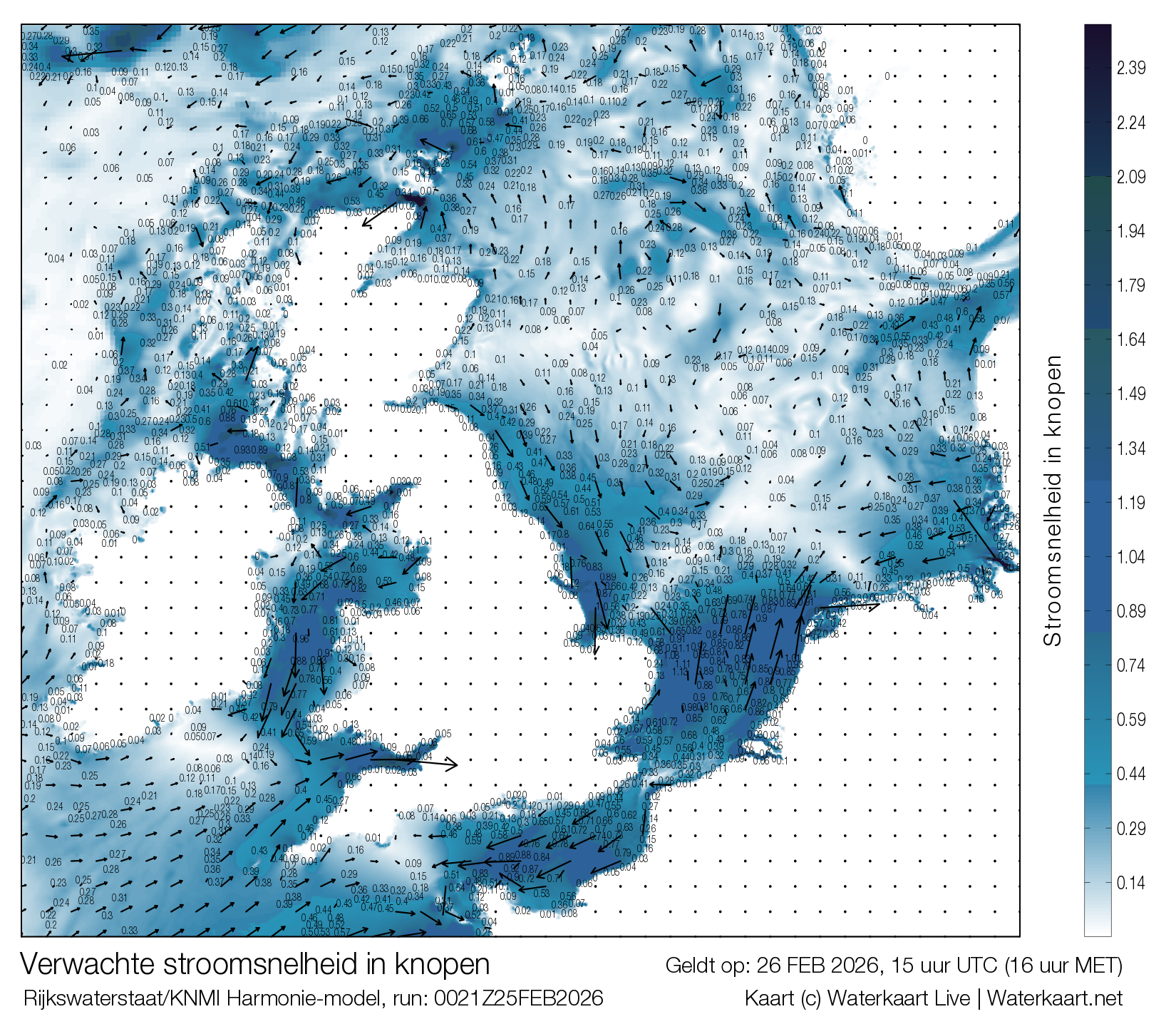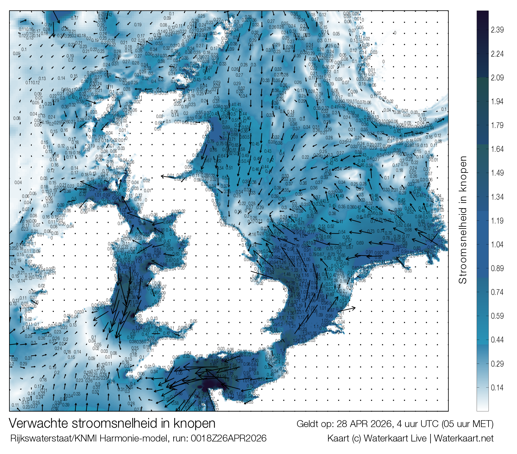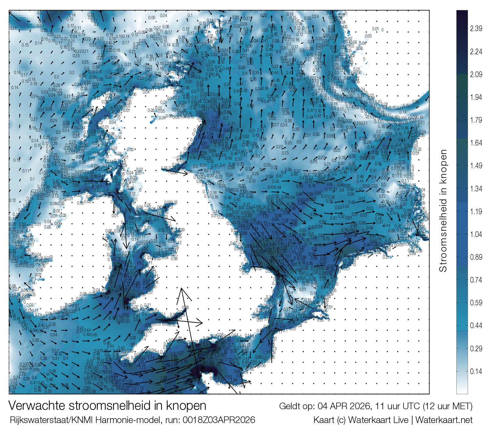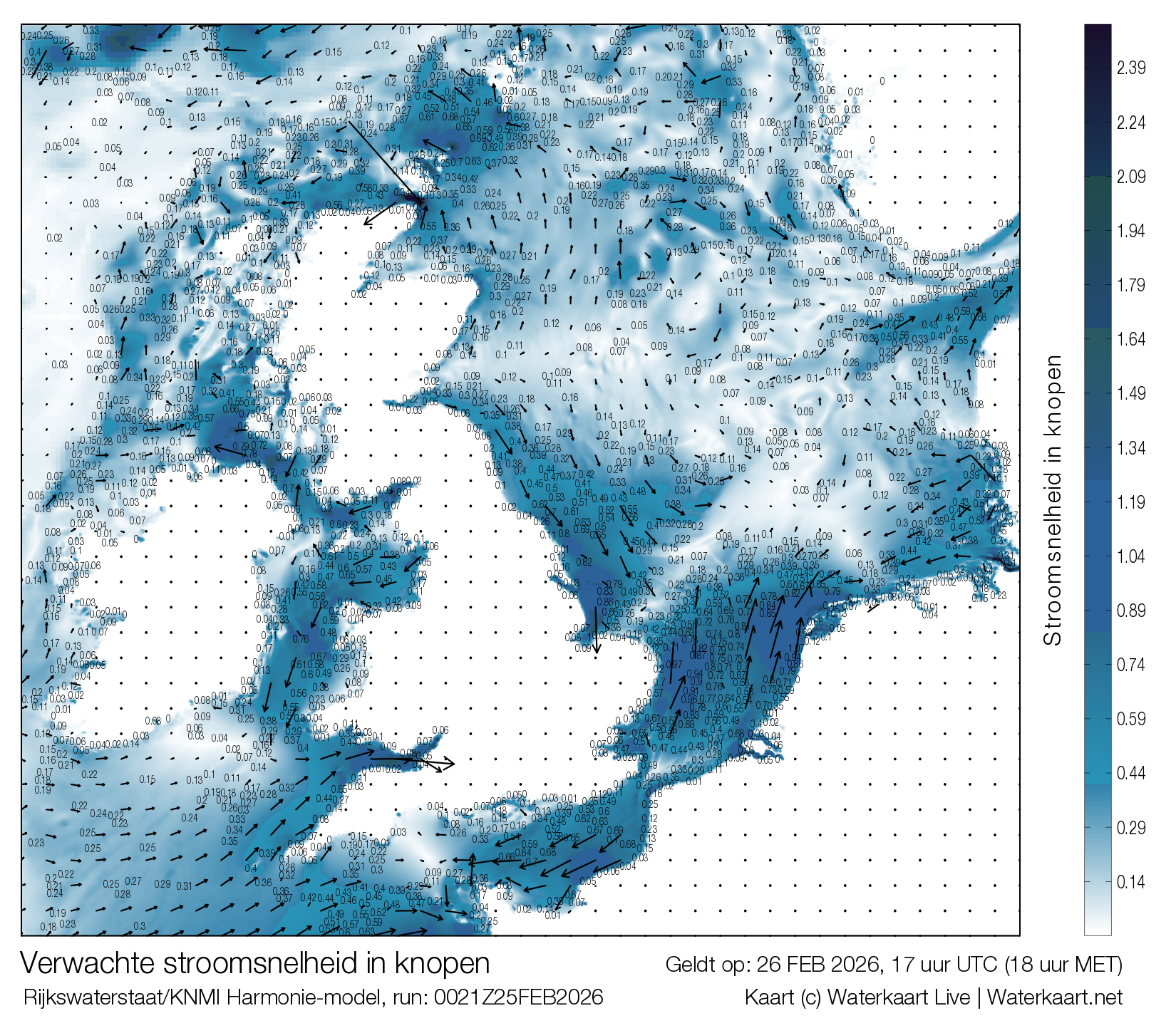 Stroomsnelheden in de Noordzee op basis van de Stroomatlas, verrekend met weersinvloeden. Deze worden iedere dag ververst met data uit het zeestromingen model van Rijkswaterstaat op basis van Harmonie weerdata, voor ieder uur een kaart, tot 48 uur in de toekomst. Lees hieronder meer over dit model