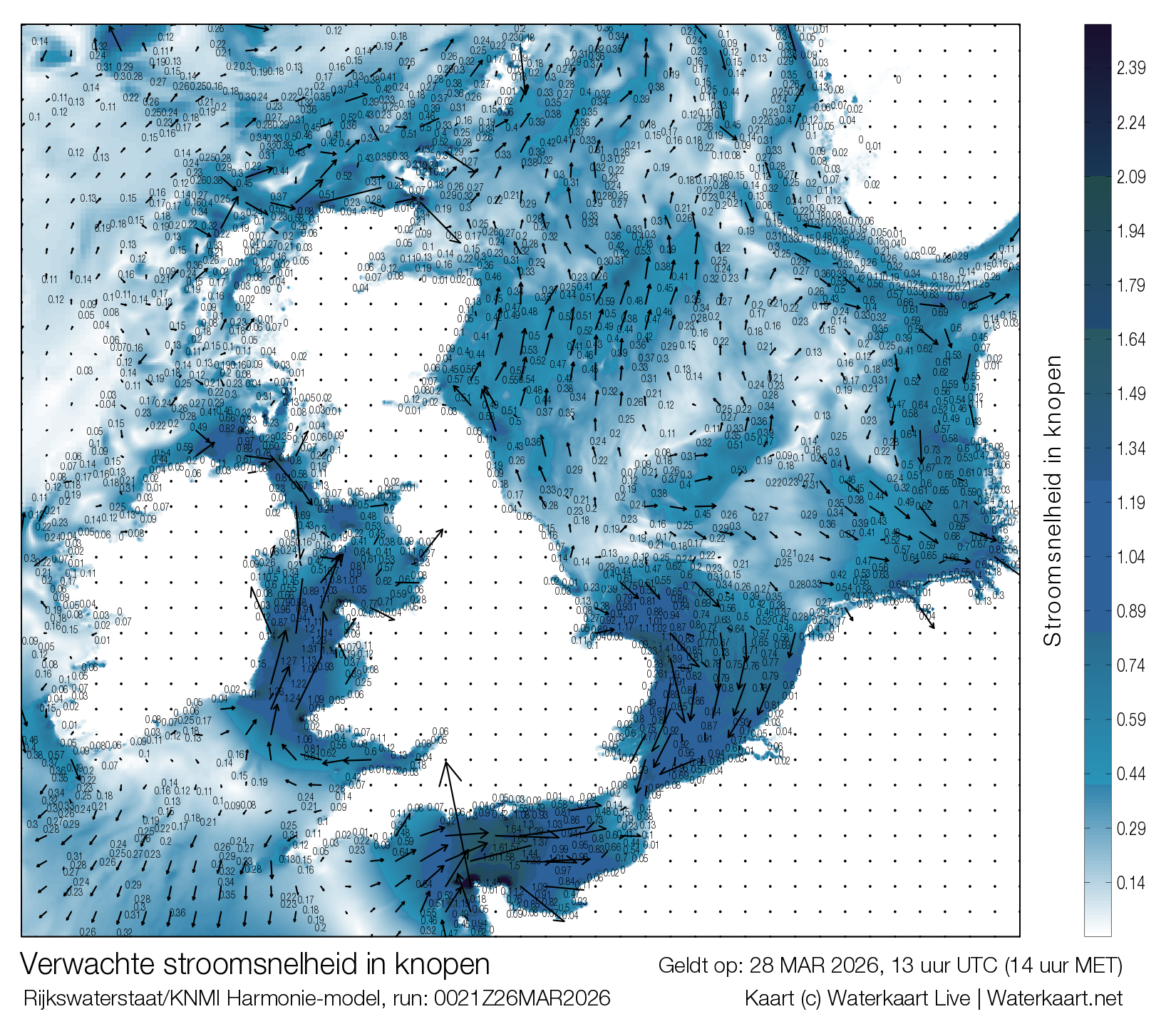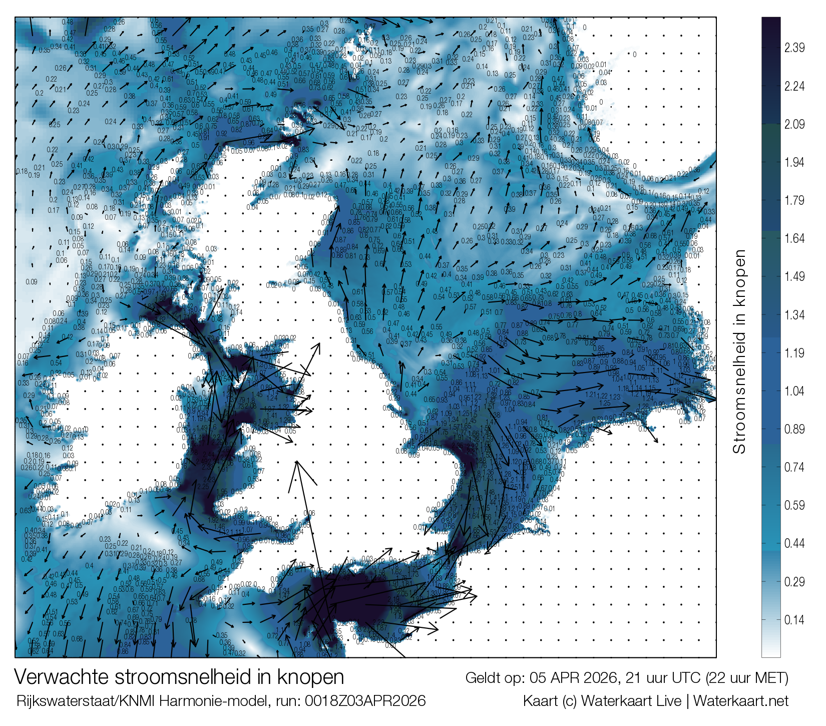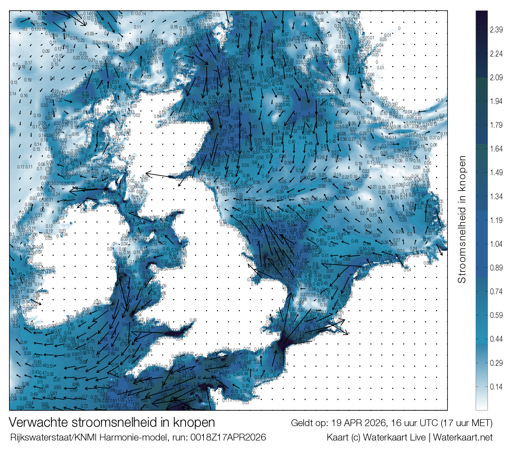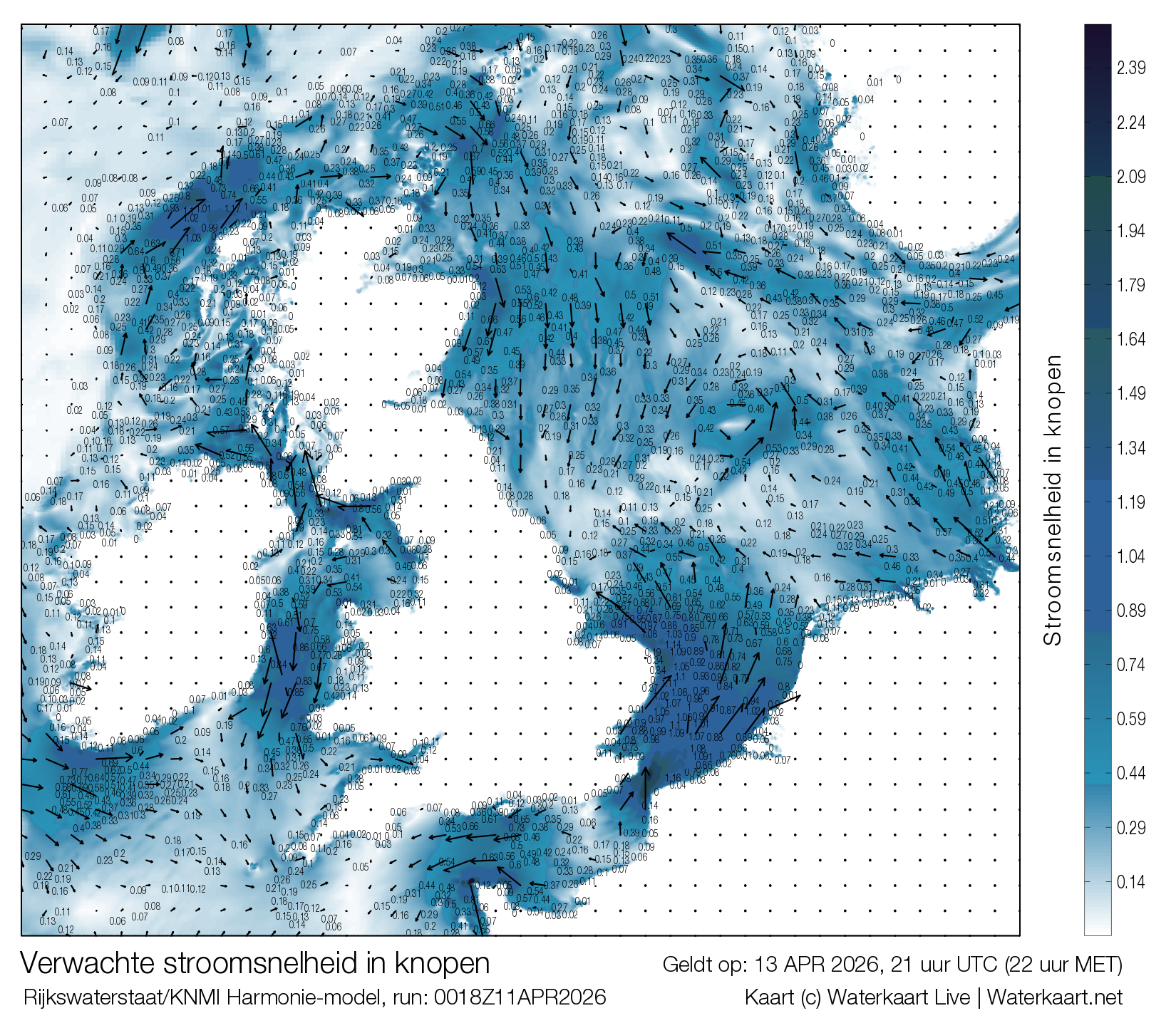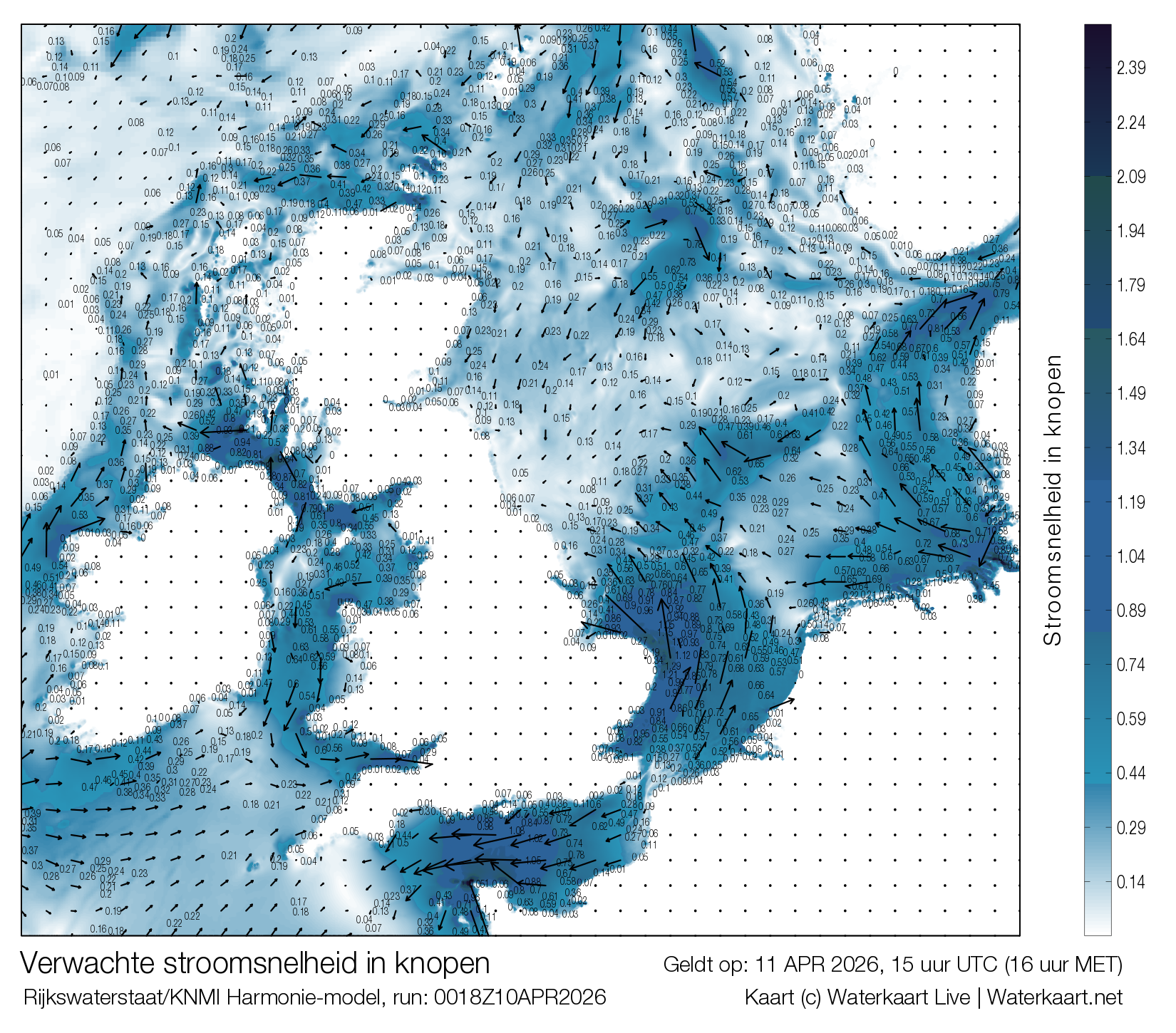Stroomsnelheden in de Noordzee op basis van de Stroomatlas, verrekend met weersinvloeden. Deze worden iedere dag ververst met data uit het zeestromingen model van Rijkswaterstaat op basis van Harmonie weerdata, voor ieder uur een kaart, tot 48 uur in de toekomst. Lees hieronder meer over dit model