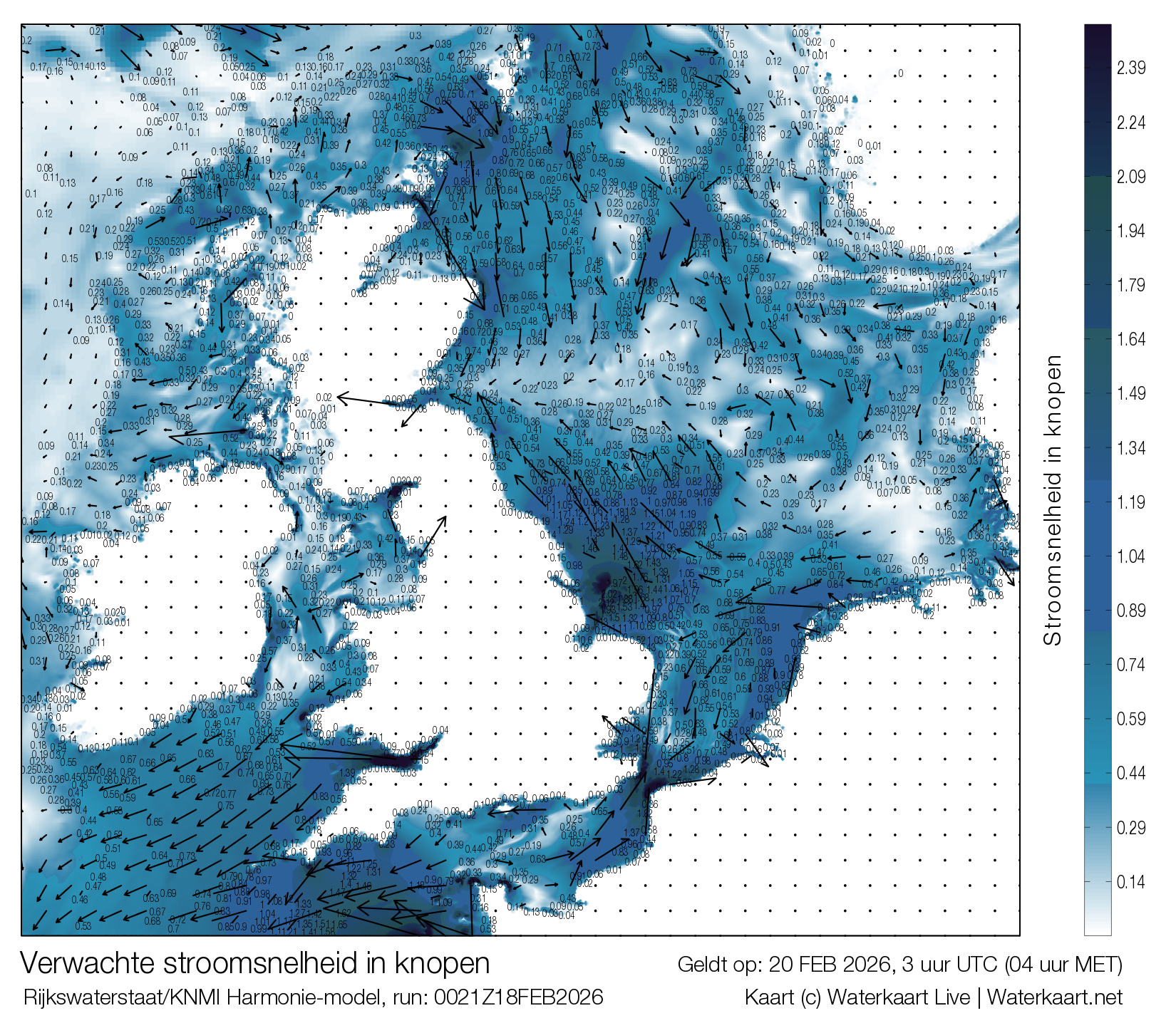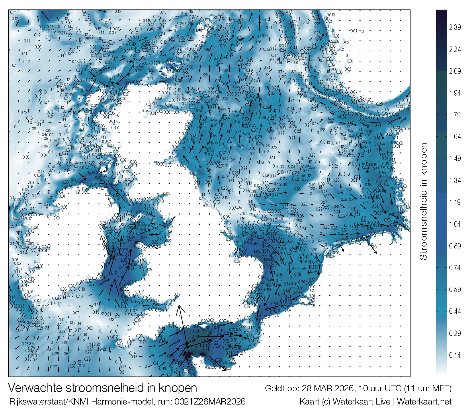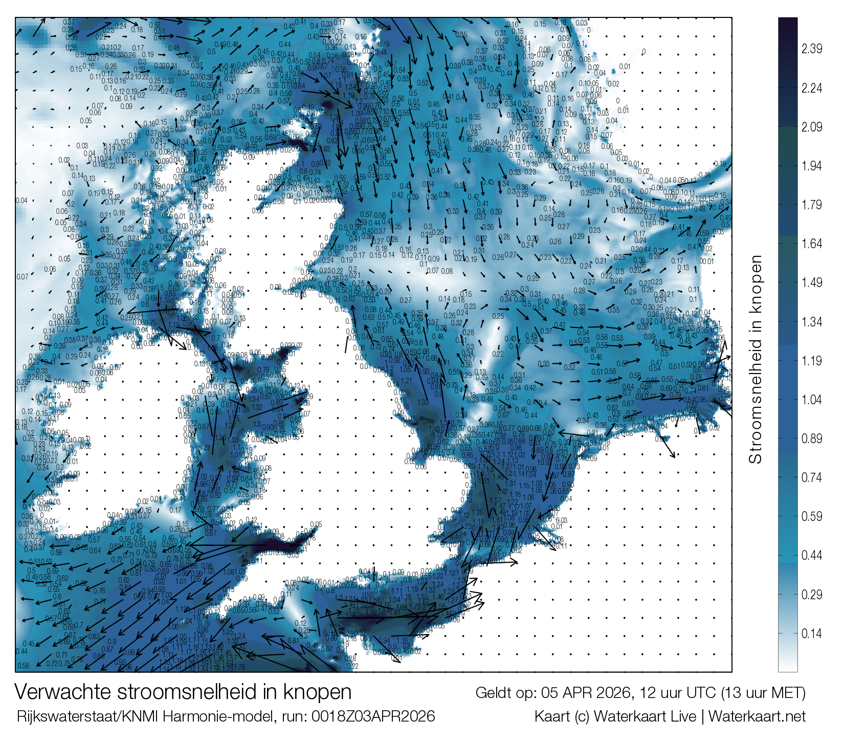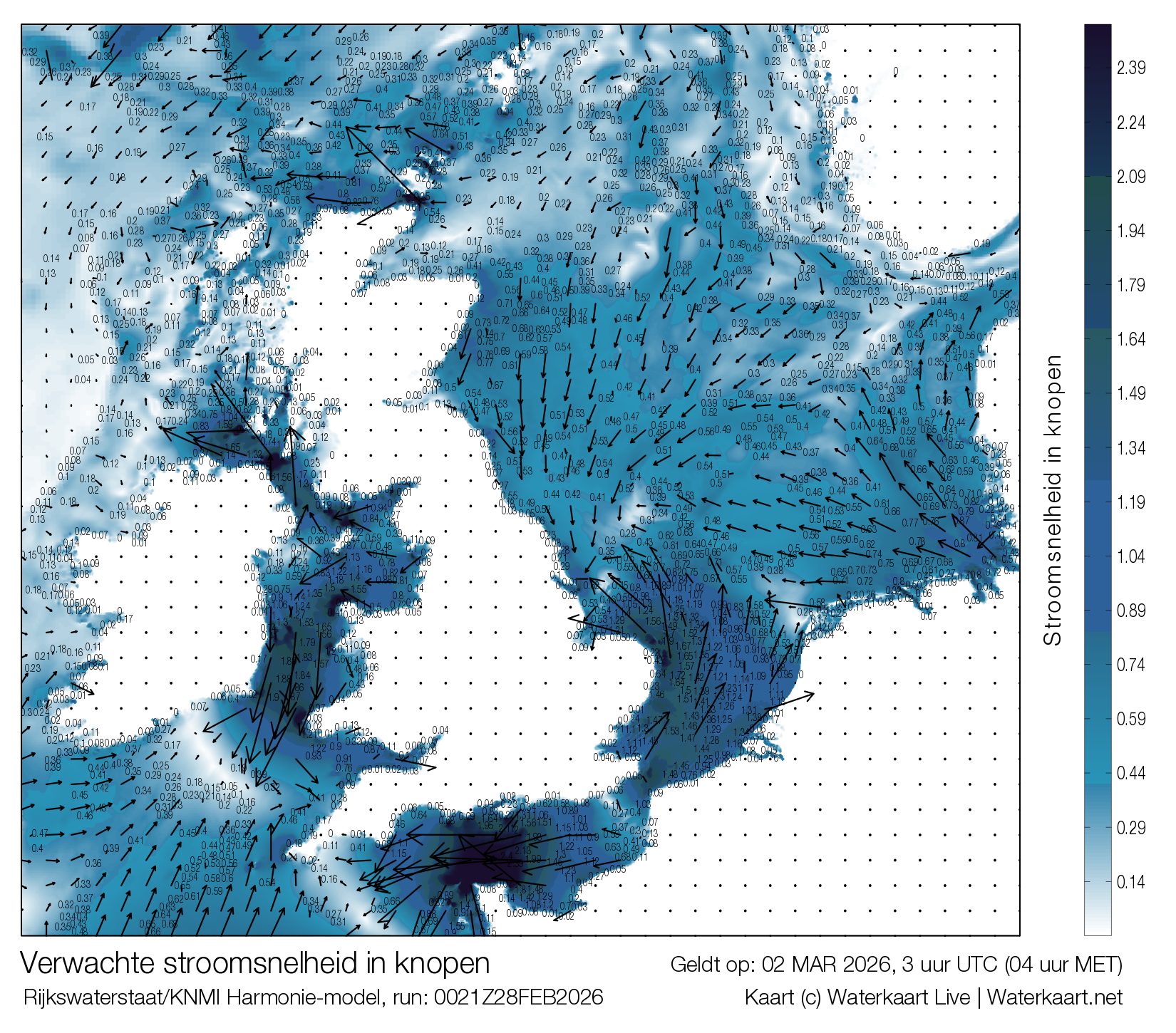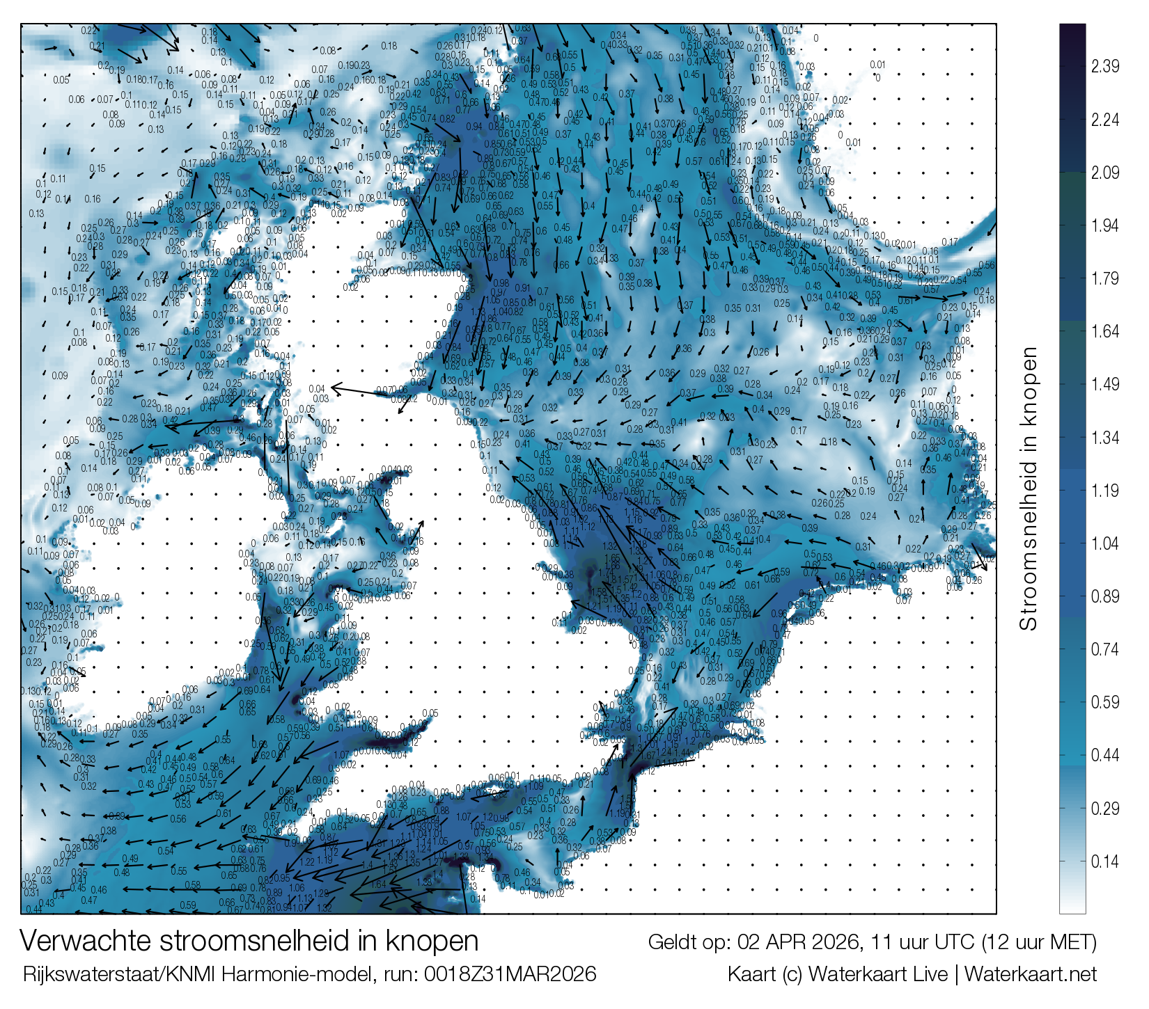Stroomsnelheden in de Noordzee op basis van de Stroomatlas, verrekend met weersinvloeden. Deze worden iedere dag ververst met data uit het zeestromingen model van Rijkswaterstaat op basis van Harmonie weerdata, voor ieder uur een kaart, tot 48 uur in de toekomst. Lees hieronder meer over dit model
