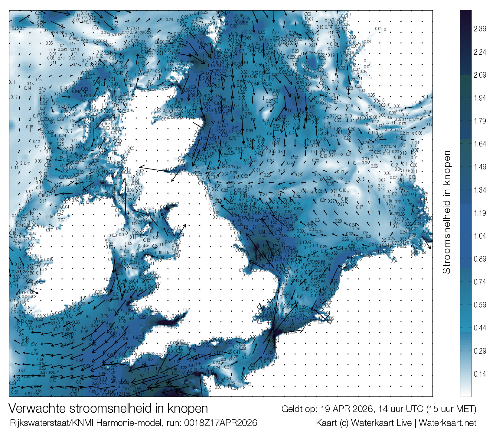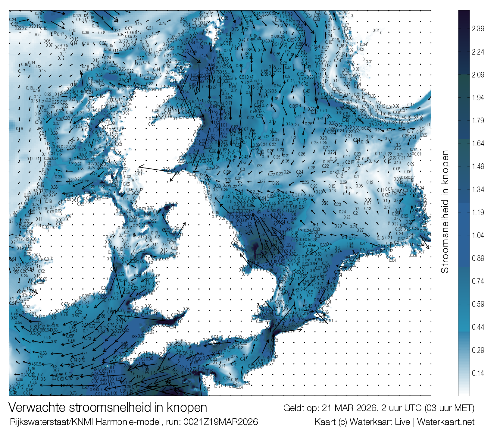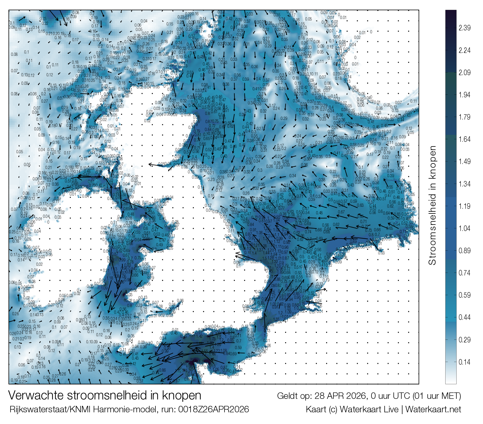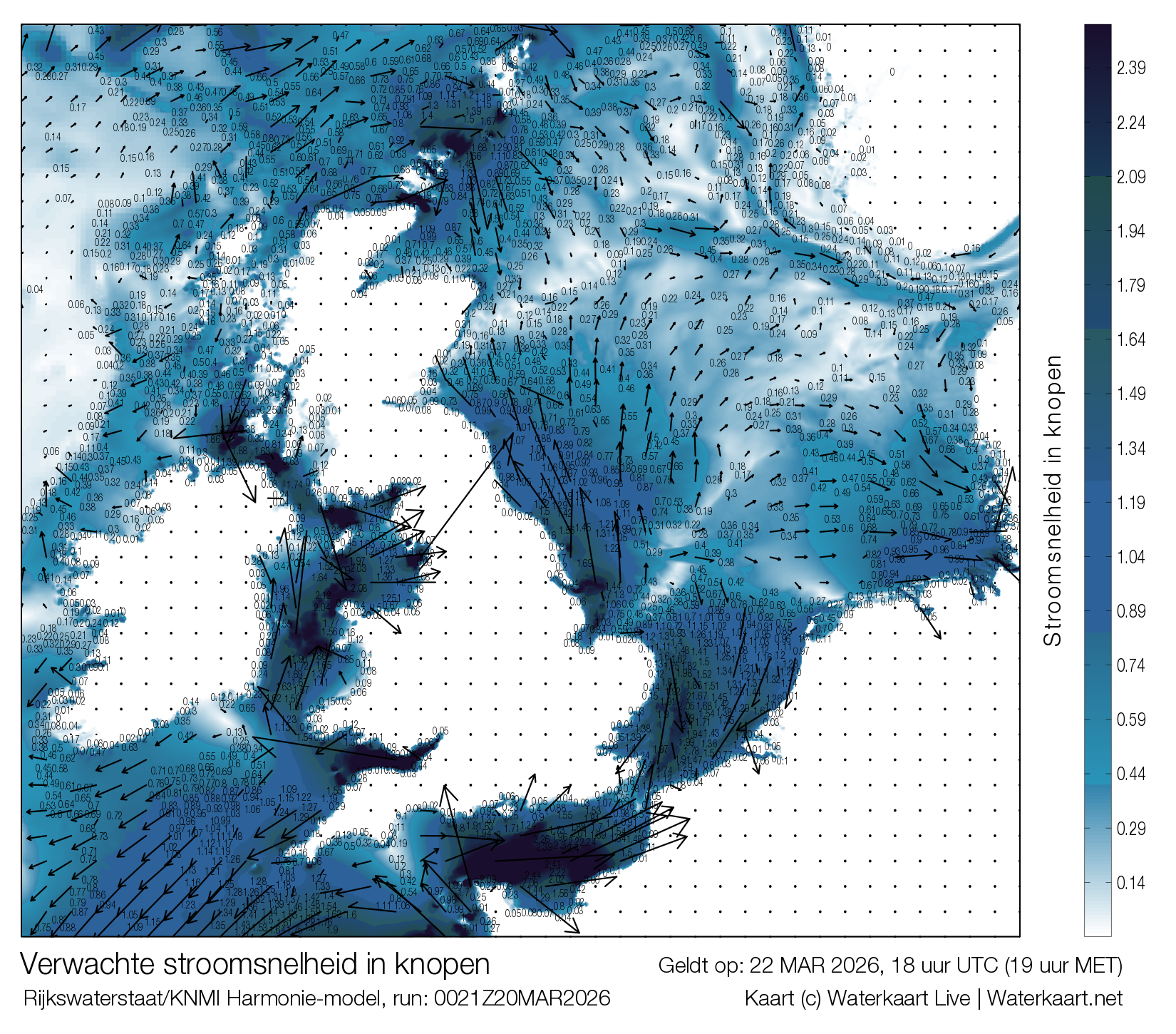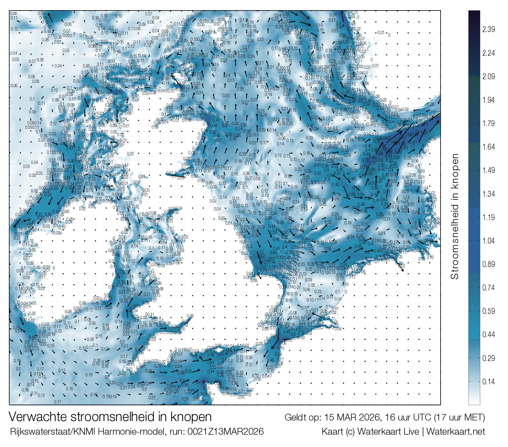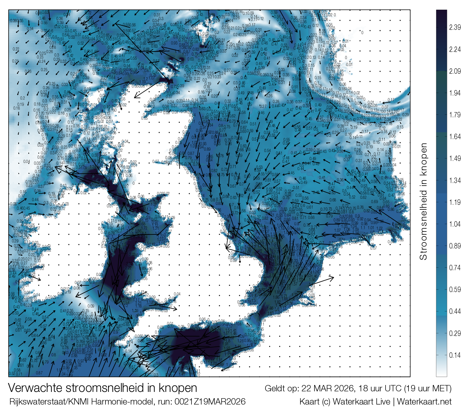 Stroomsnelheden in de Noordzee op basis van de Stroomatlas, verrekend met weersinvloeden. Deze worden iedere dag ververst met data uit het zeestromingen model van Rijkswaterstaat op basis van Harmonie weerdata, voor ieder uur een kaart, tot 48 uur in de toekomst. Lees hieronder meer over dit model