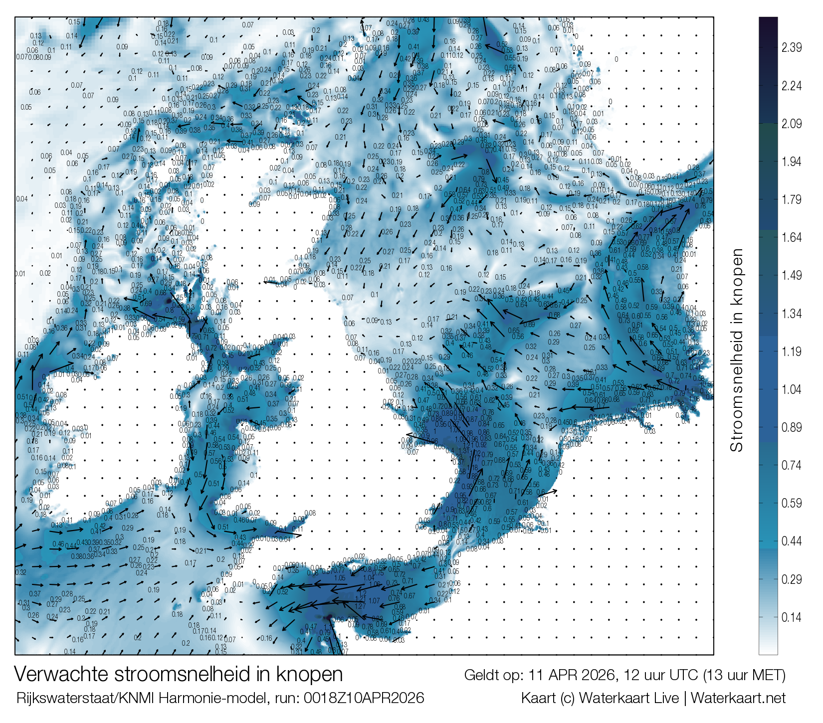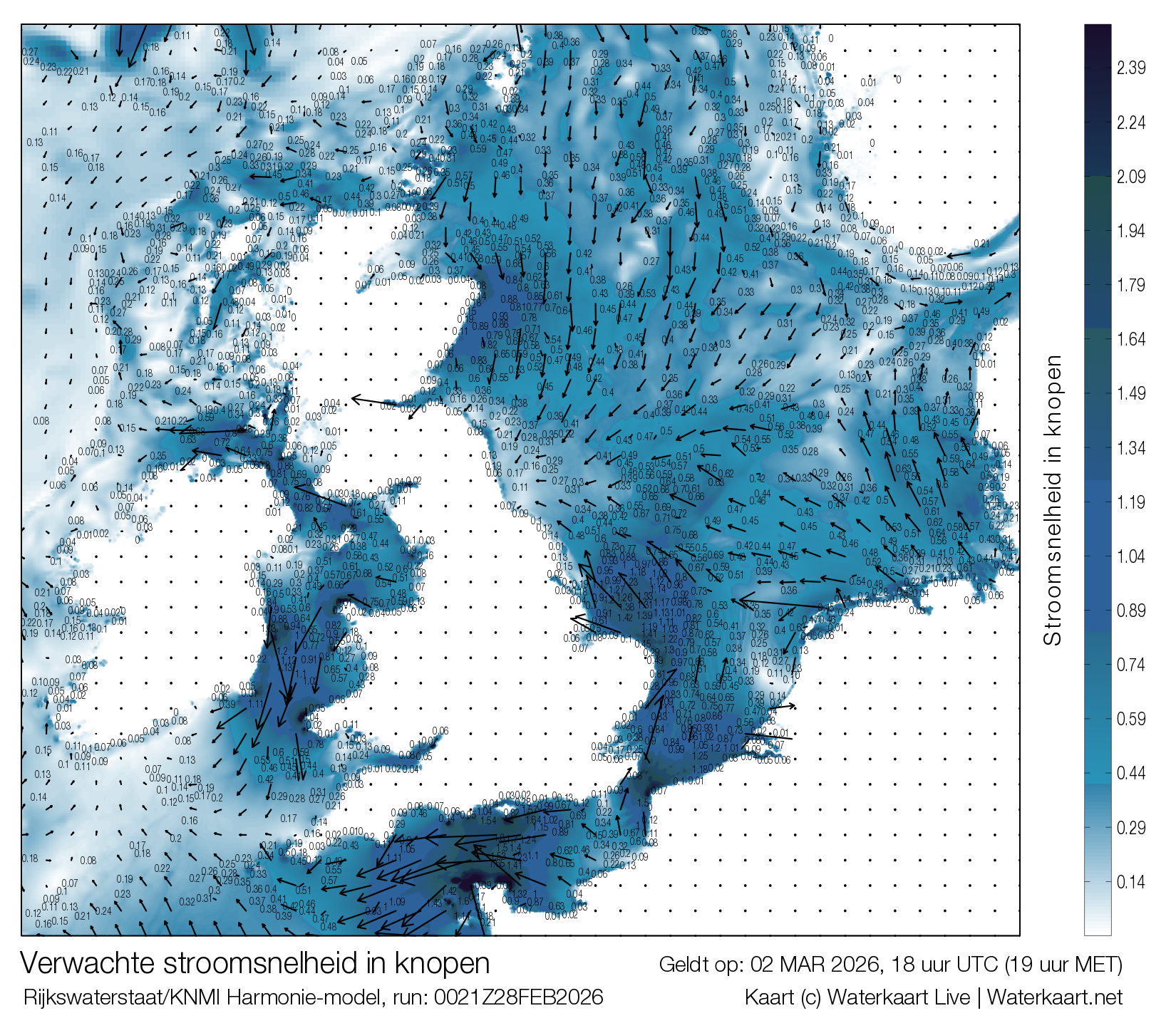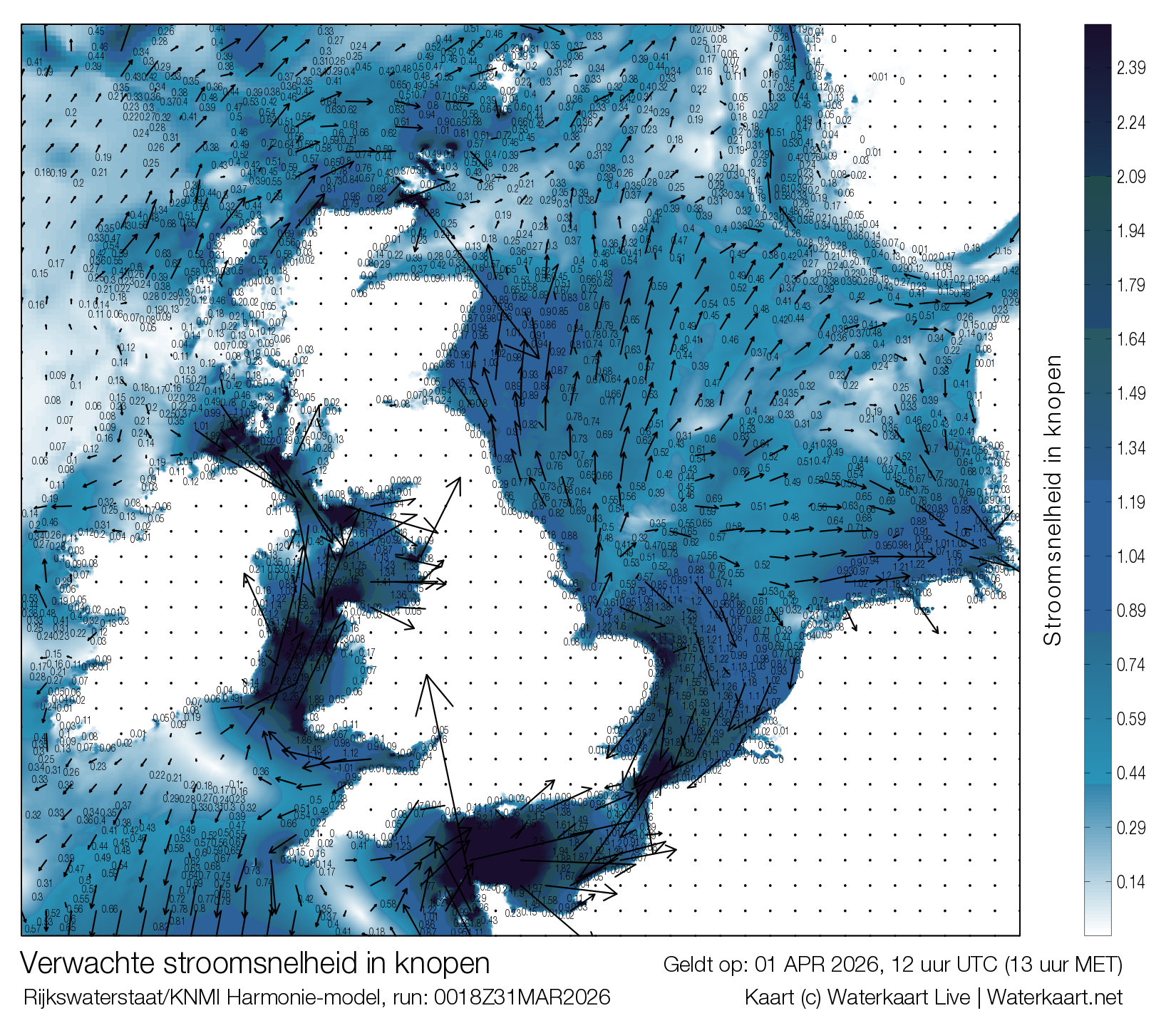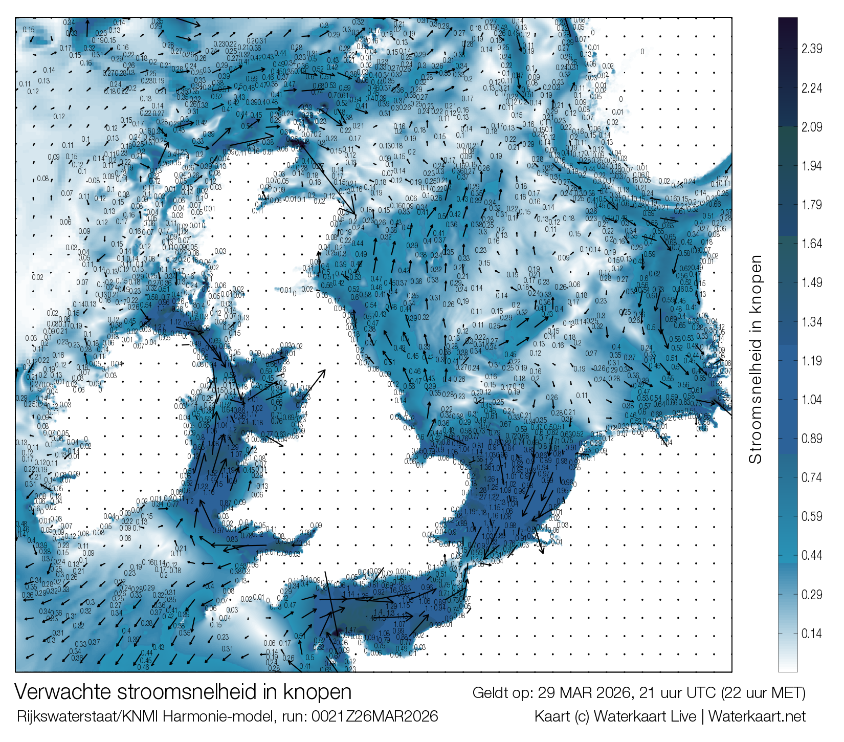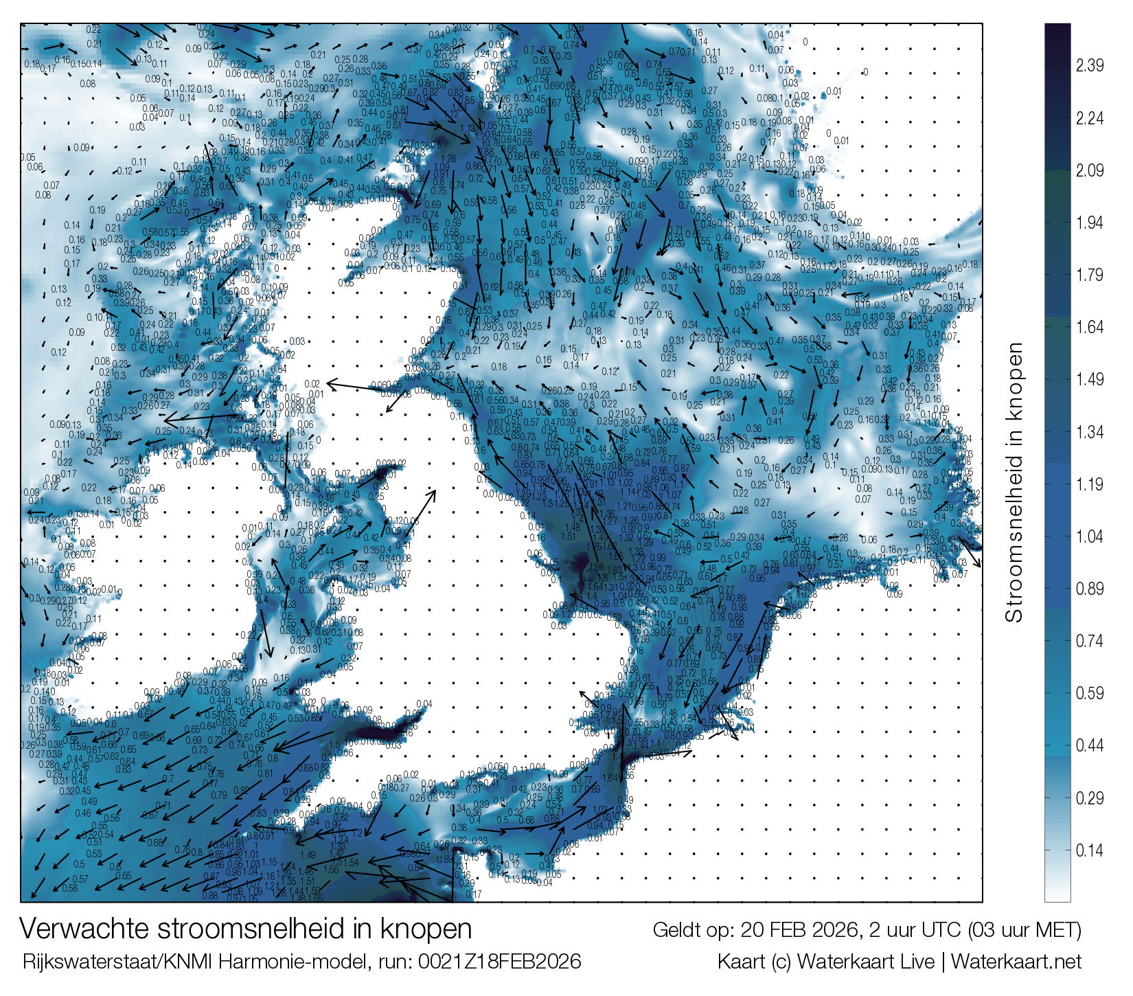 Stroomsnelheden in de Noordzee op basis van de Stroomatlas, verrekend met weersinvloeden. Deze worden iedere dag ververst met data uit het zeestromingen model van Rijkswaterstaat op basis van Harmonie weerdata, voor ieder uur een kaart, tot 48 uur in de toekomst. Lees hieronder meer over dit model