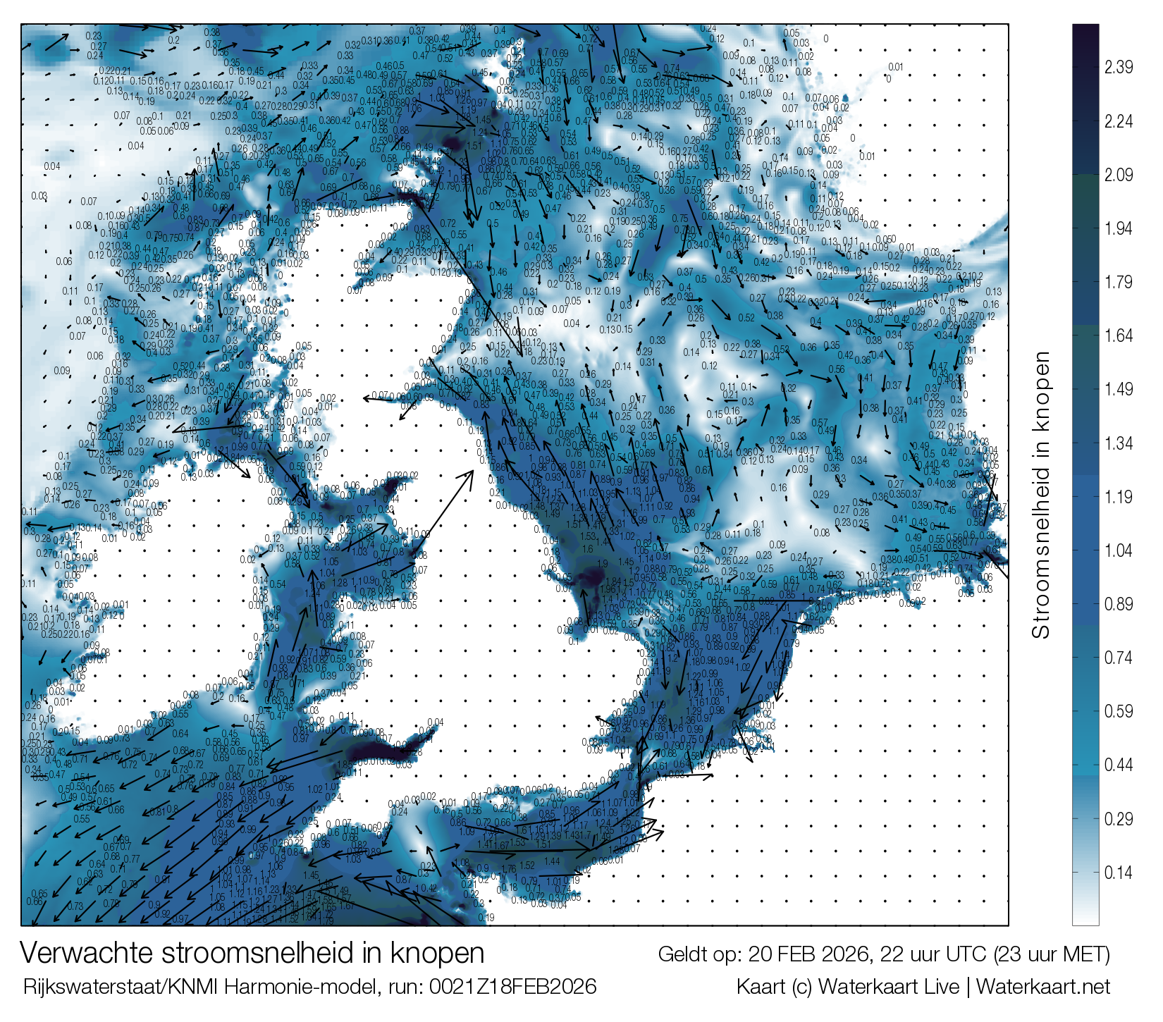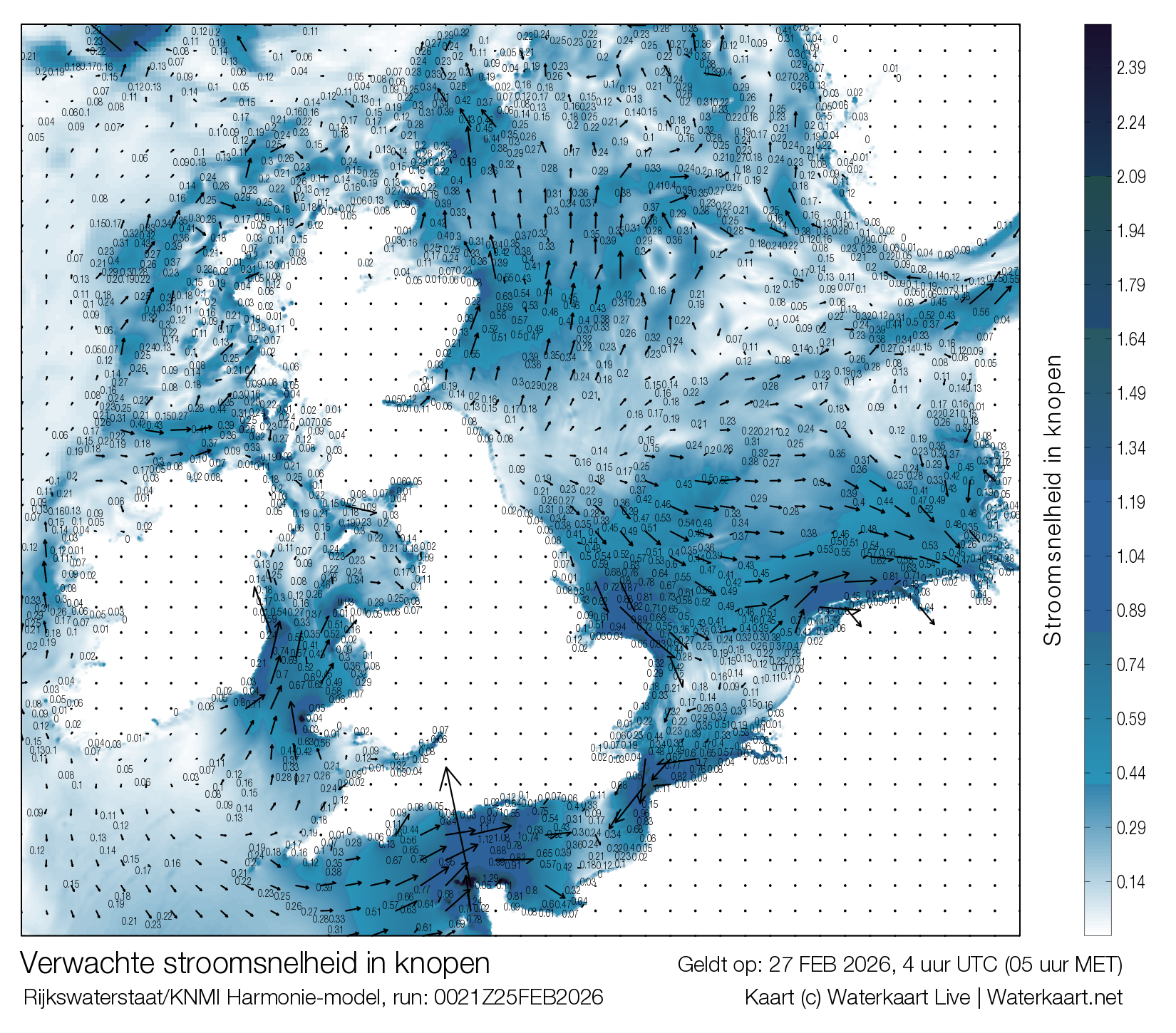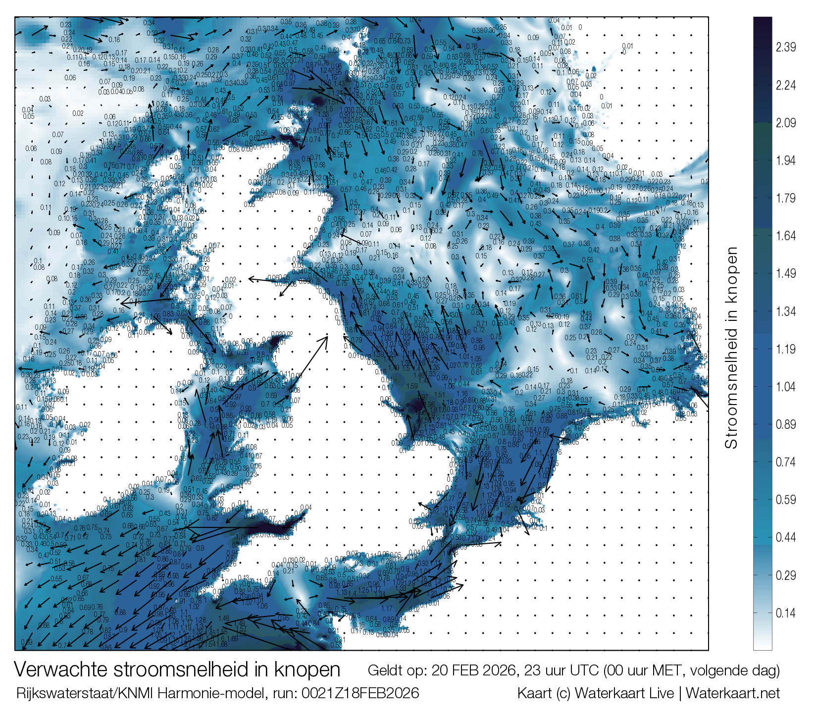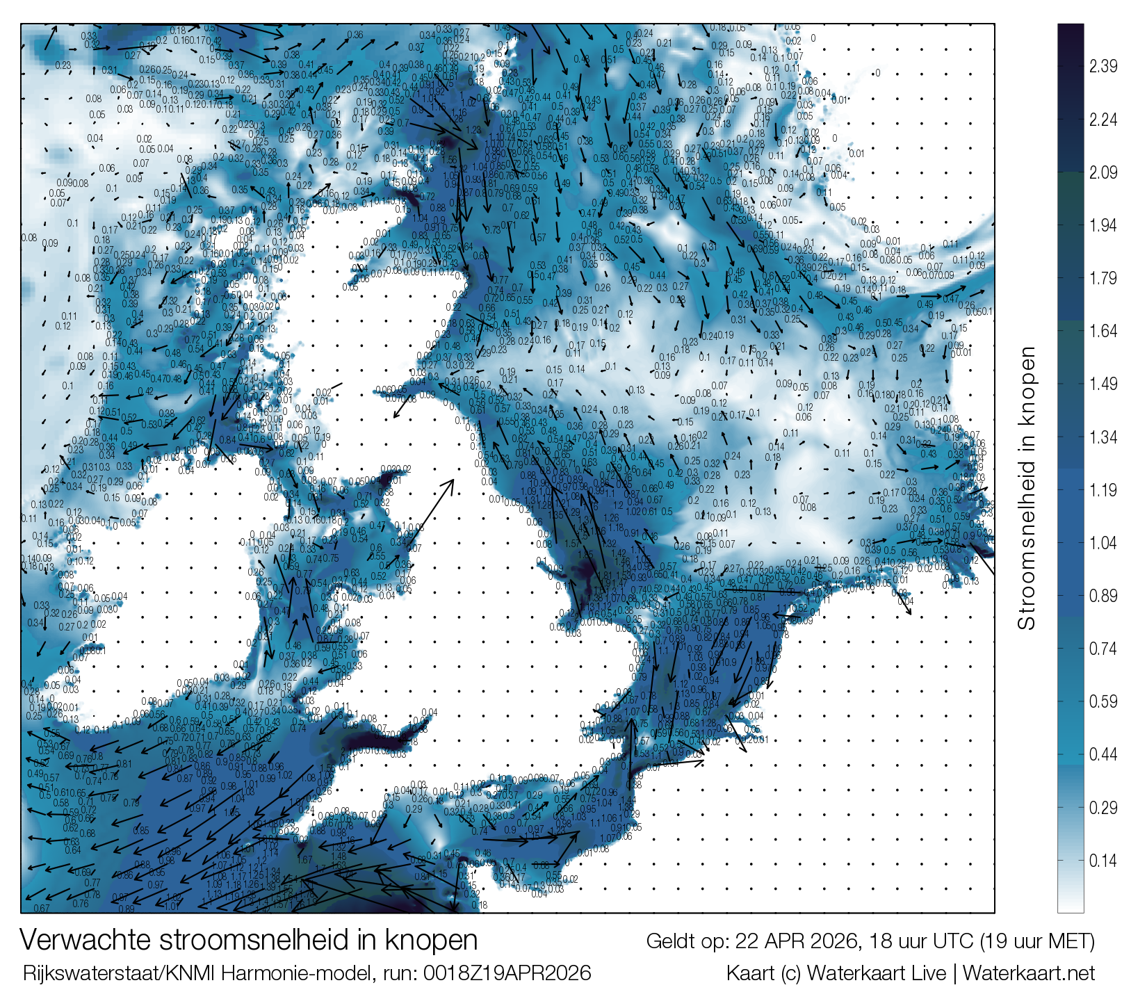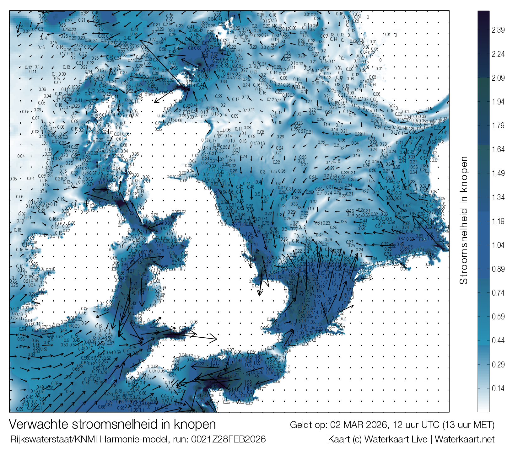 Stroomsnelheden in de Noordzee op basis van de Stroomatlas, verrekend met weersinvloeden. Deze worden iedere dag ververst met data uit het zeestromingen model van Rijkswaterstaat op basis van Harmonie weerdata, voor ieder uur een kaart, tot 48 uur in de toekomst. Lees hieronder meer over dit model