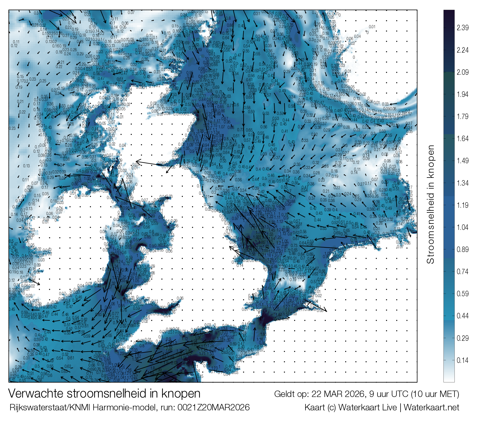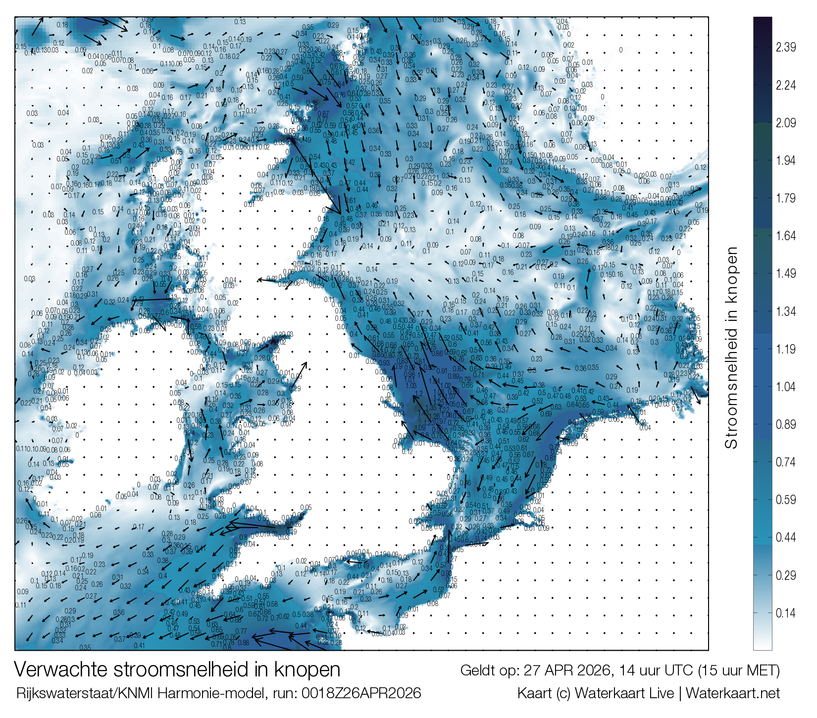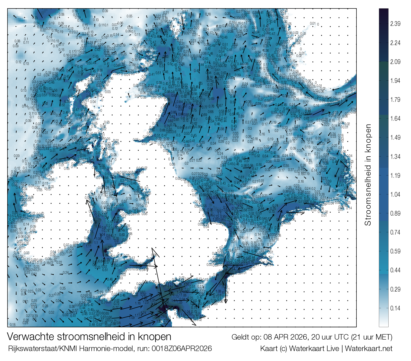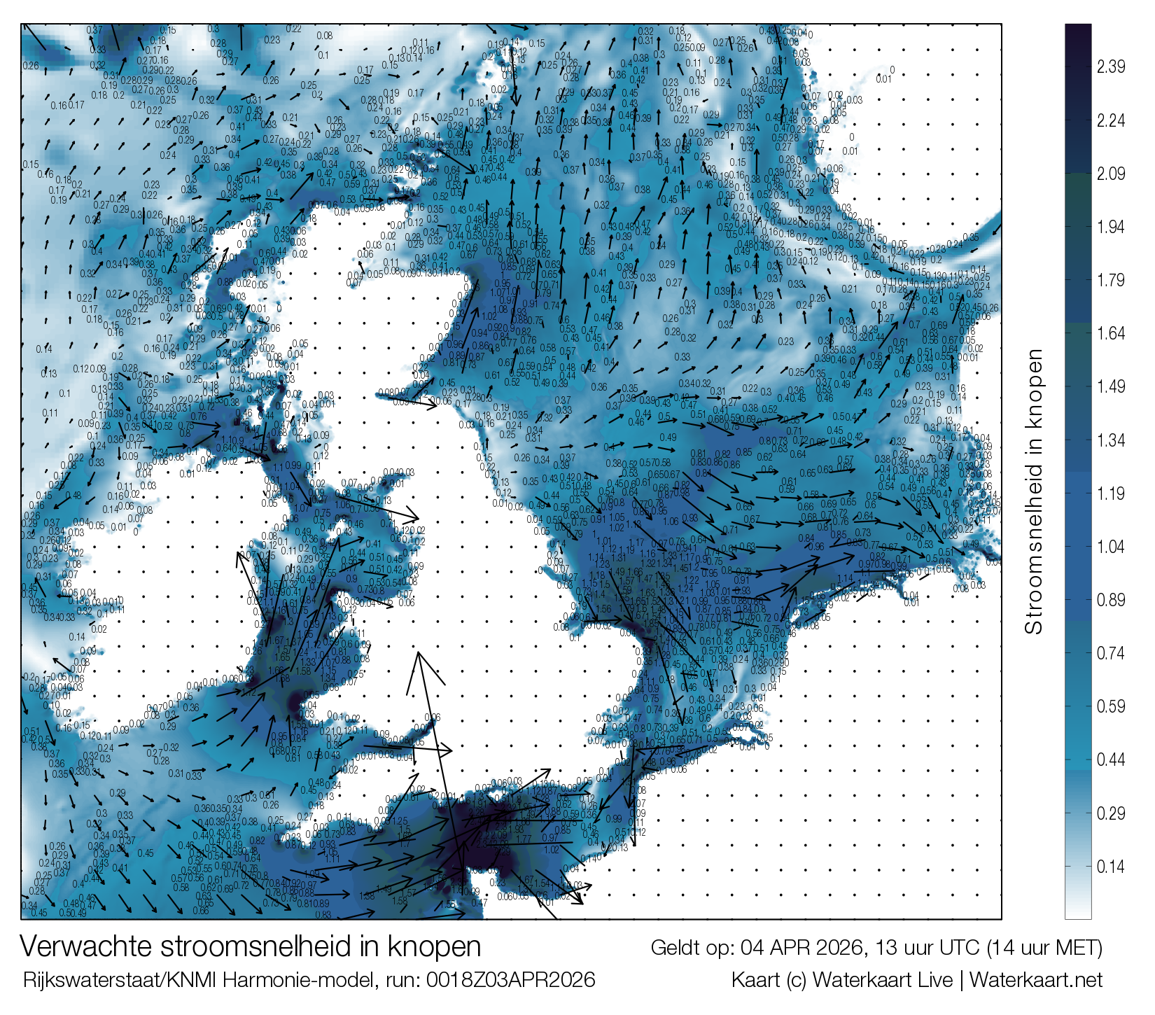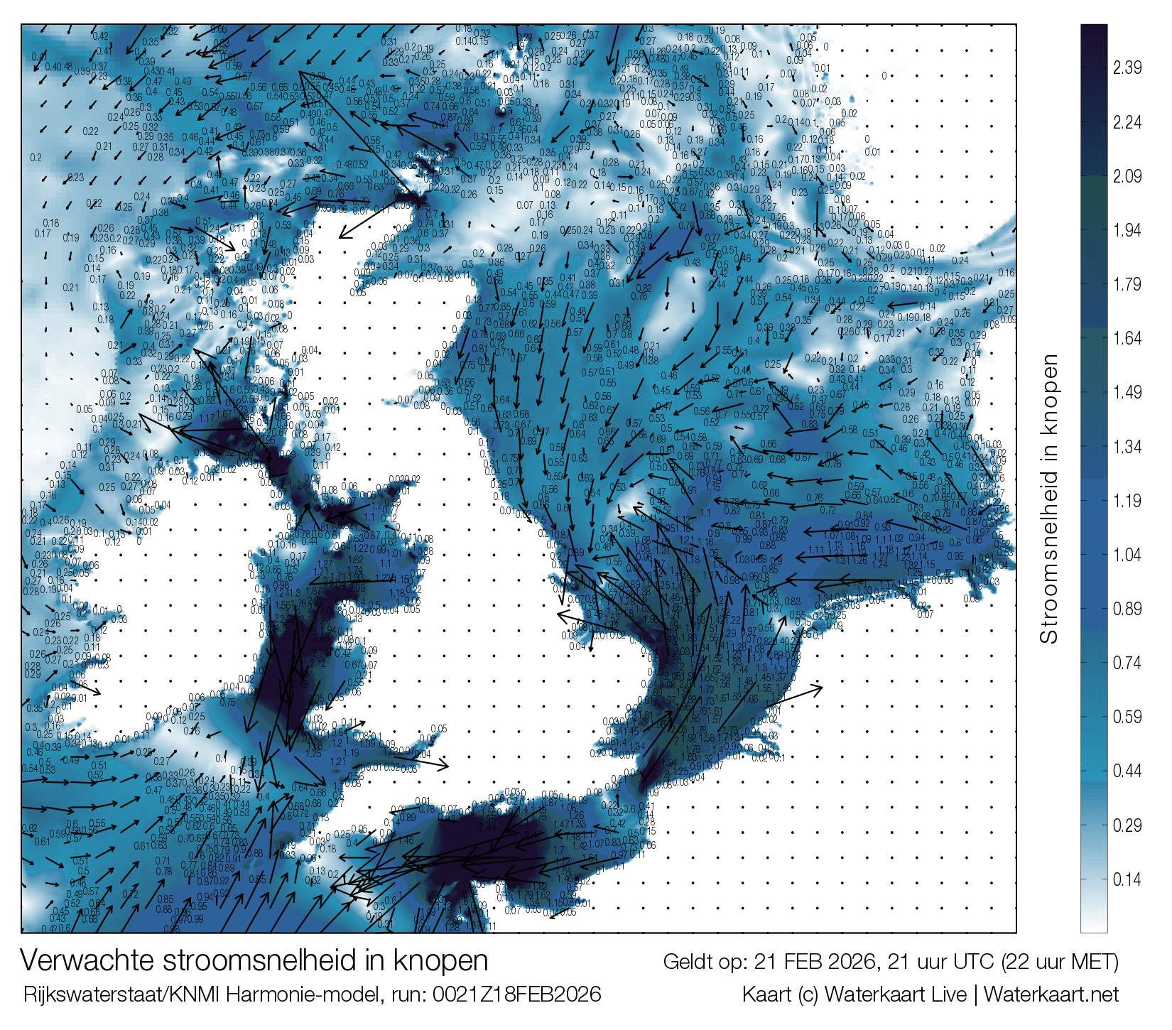 Stroomsnelheden in de Noordzee op basis van de Stroomatlas, verrekend met weersinvloeden. Deze worden iedere dag ververst met data uit het zeestromingen model van Rijkswaterstaat op basis van Harmonie weerdata, voor ieder uur een kaart, tot 48 uur in de toekomst. Lees hieronder meer over dit model