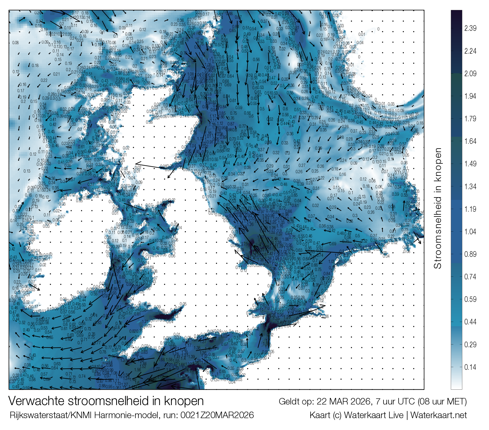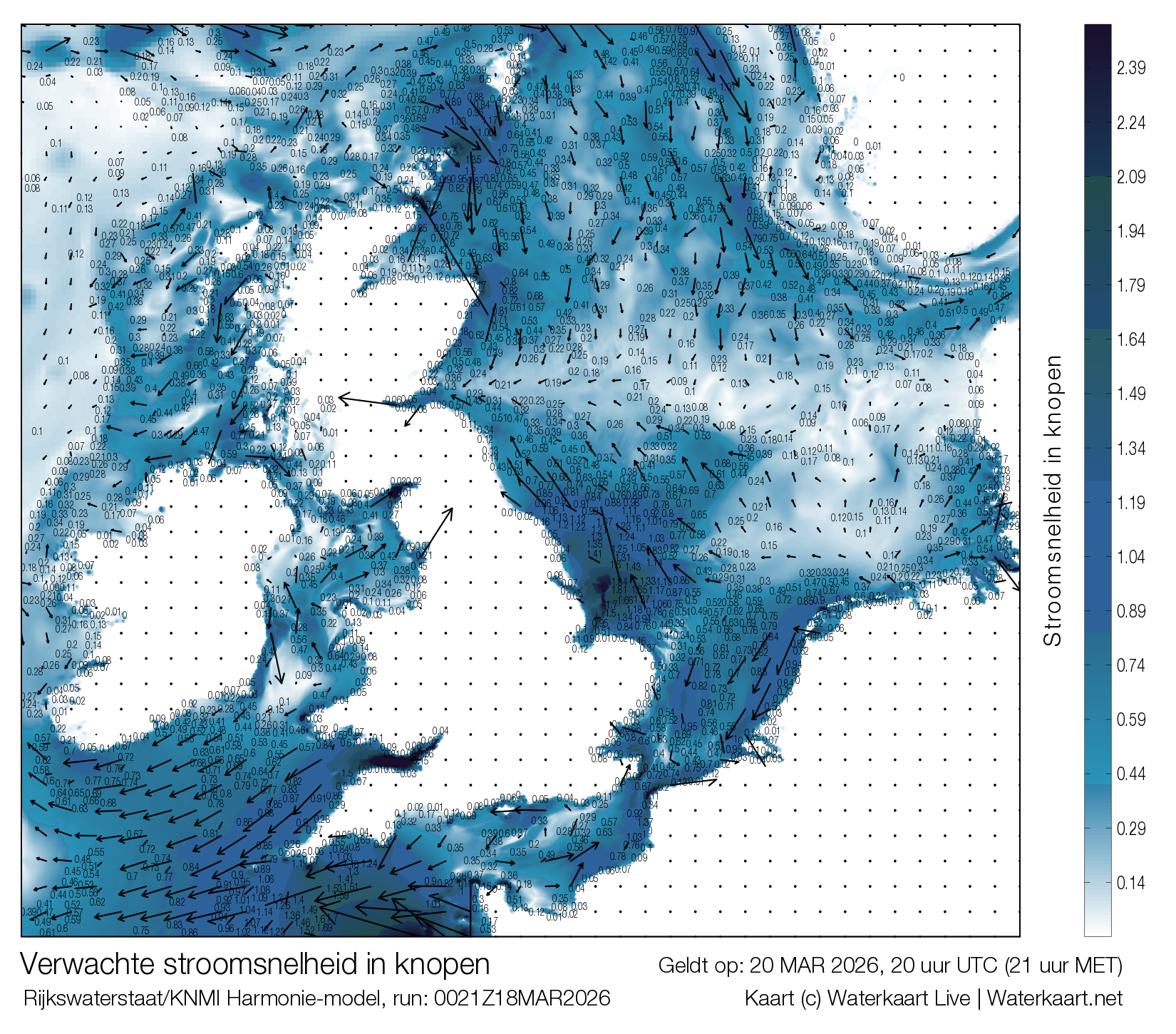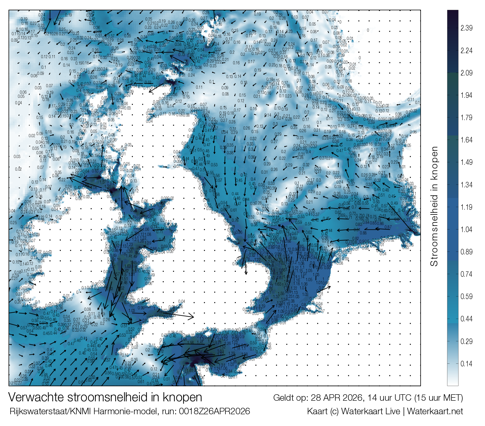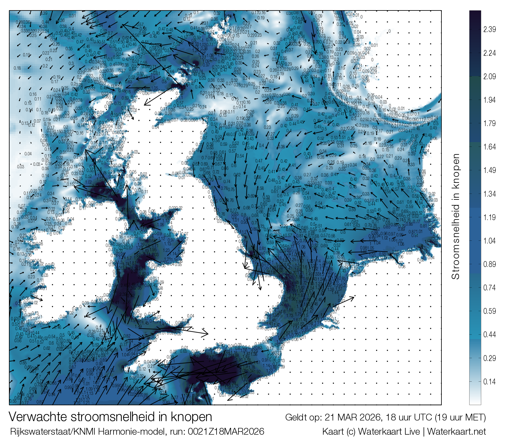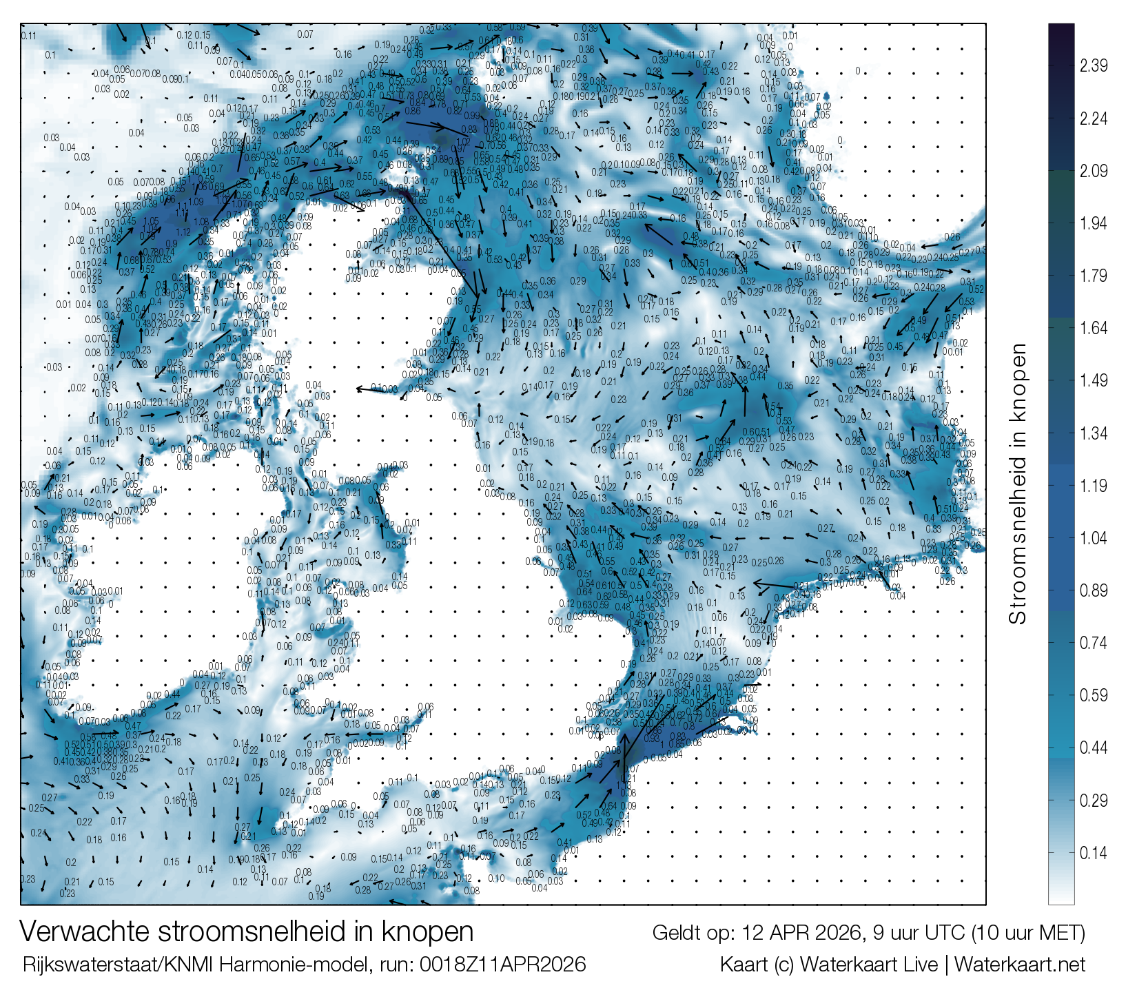 Stroomsnelheden in de Noordzee op basis van de Stroomatlas, verrekend met weersinvloeden. Deze worden iedere dag ververst met data uit het zeestromingen model van Rijkswaterstaat op basis van Harmonie weerdata, voor ieder uur een kaart, tot 48 uur in de toekomst. Lees hieronder meer over dit model