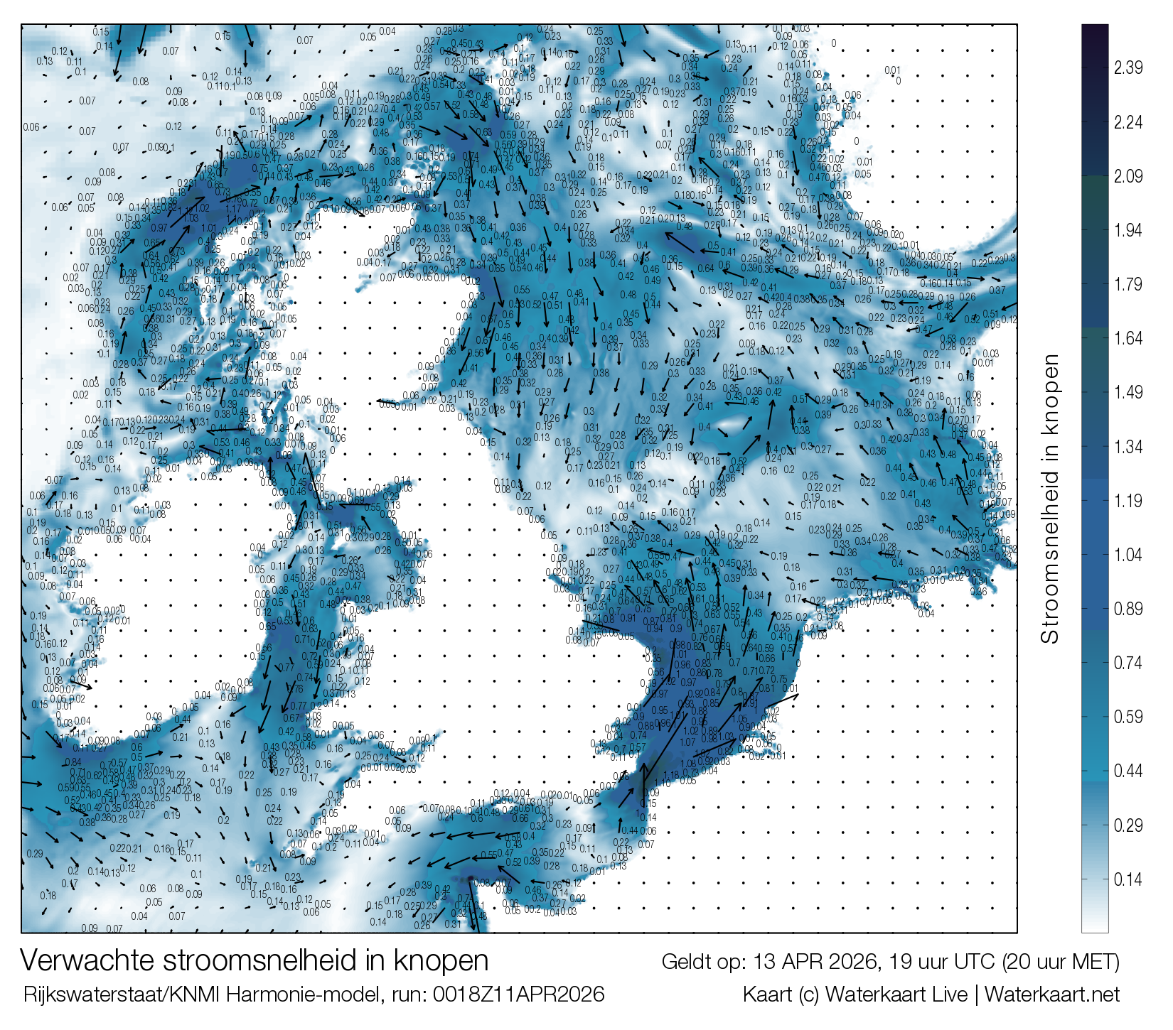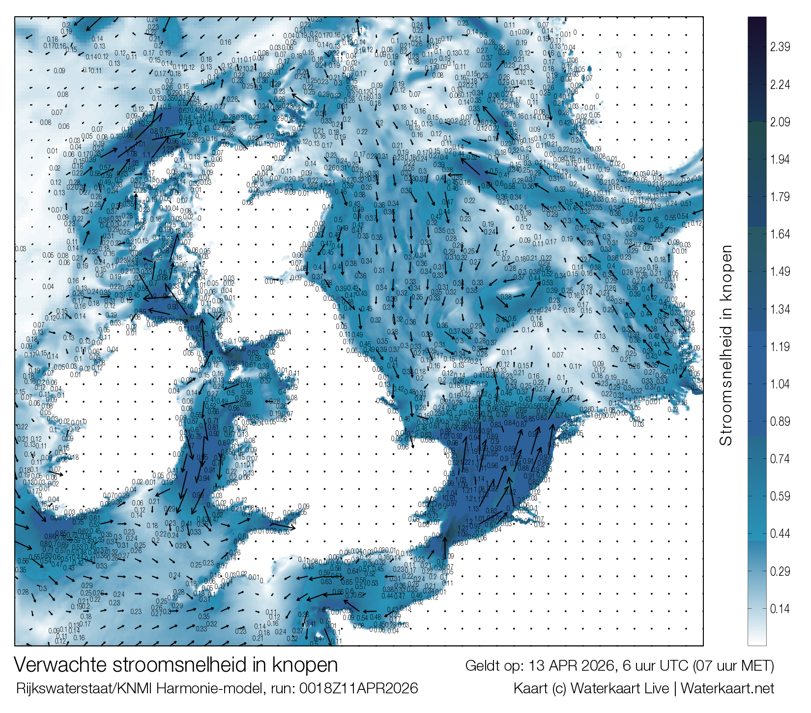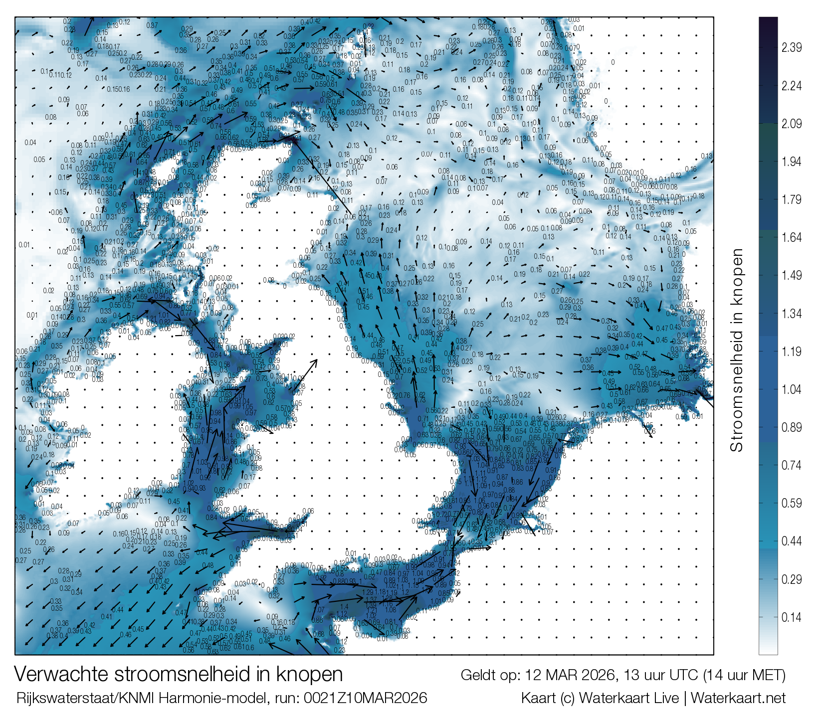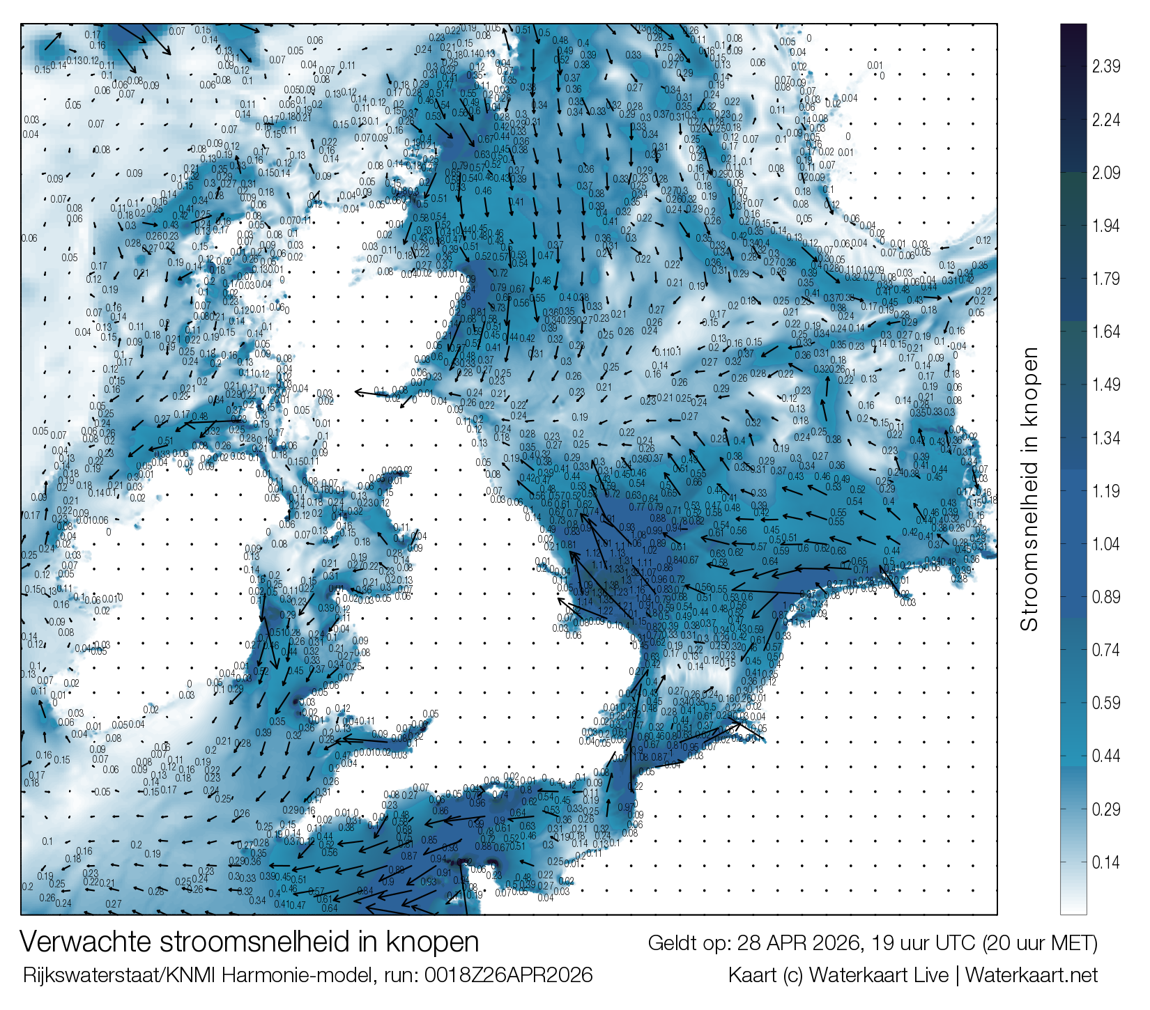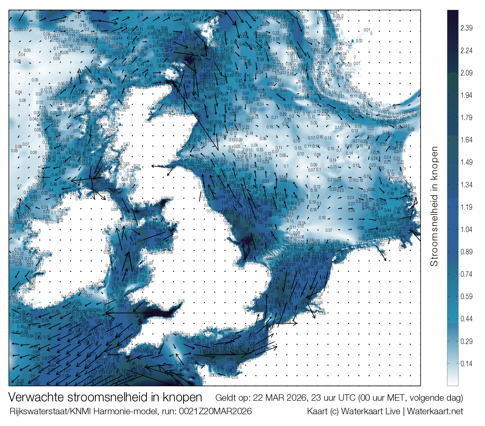 Stroomsnelheden in de Noordzee op basis van de Stroomatlas, verrekend met weersinvloeden. Deze worden iedere dag ververst met data uit het zeestromingen model van Rijkswaterstaat op basis van Harmonie weerdata, voor ieder uur een kaart, tot 48 uur in de toekomst. Lees hieronder meer over dit model