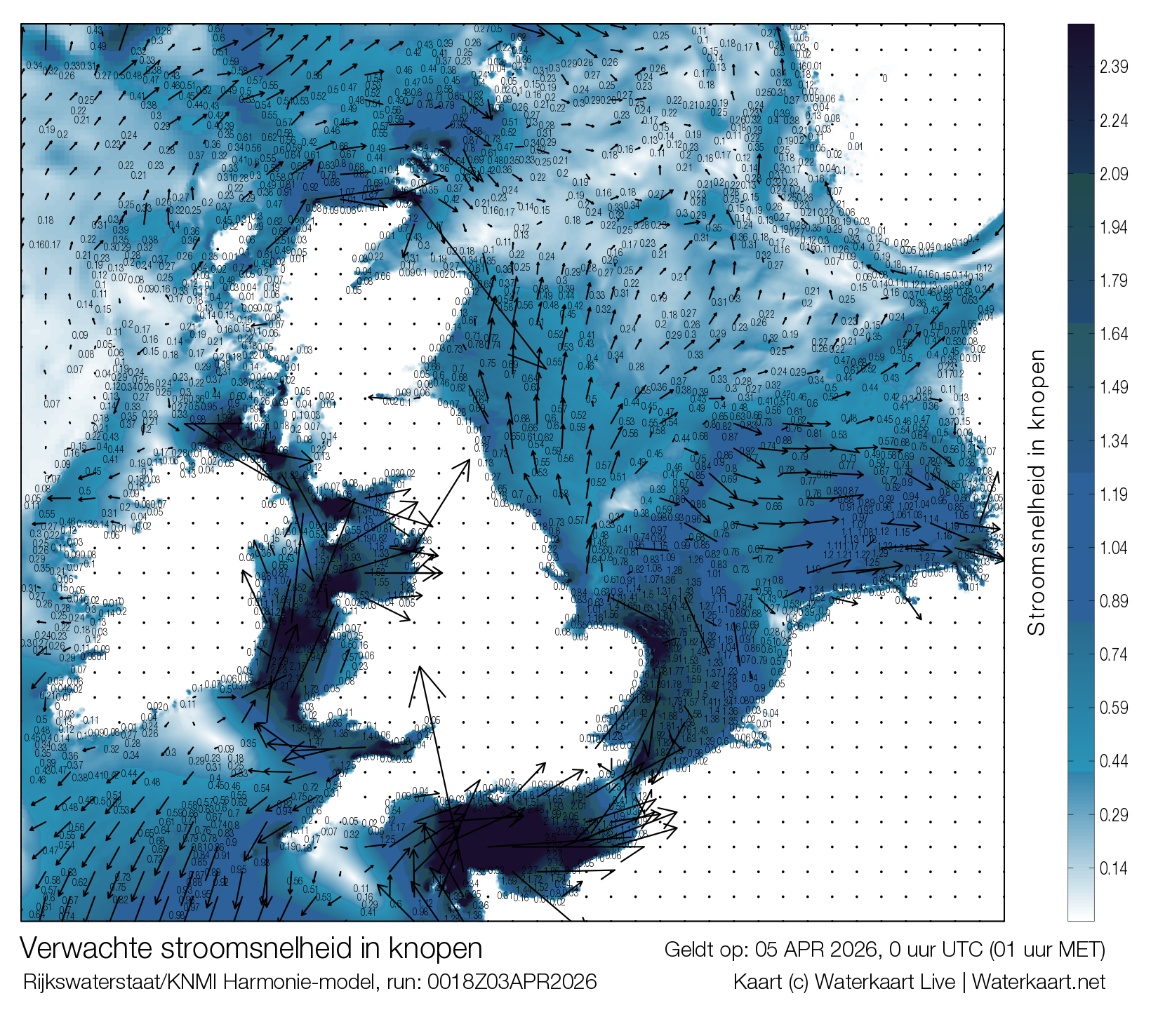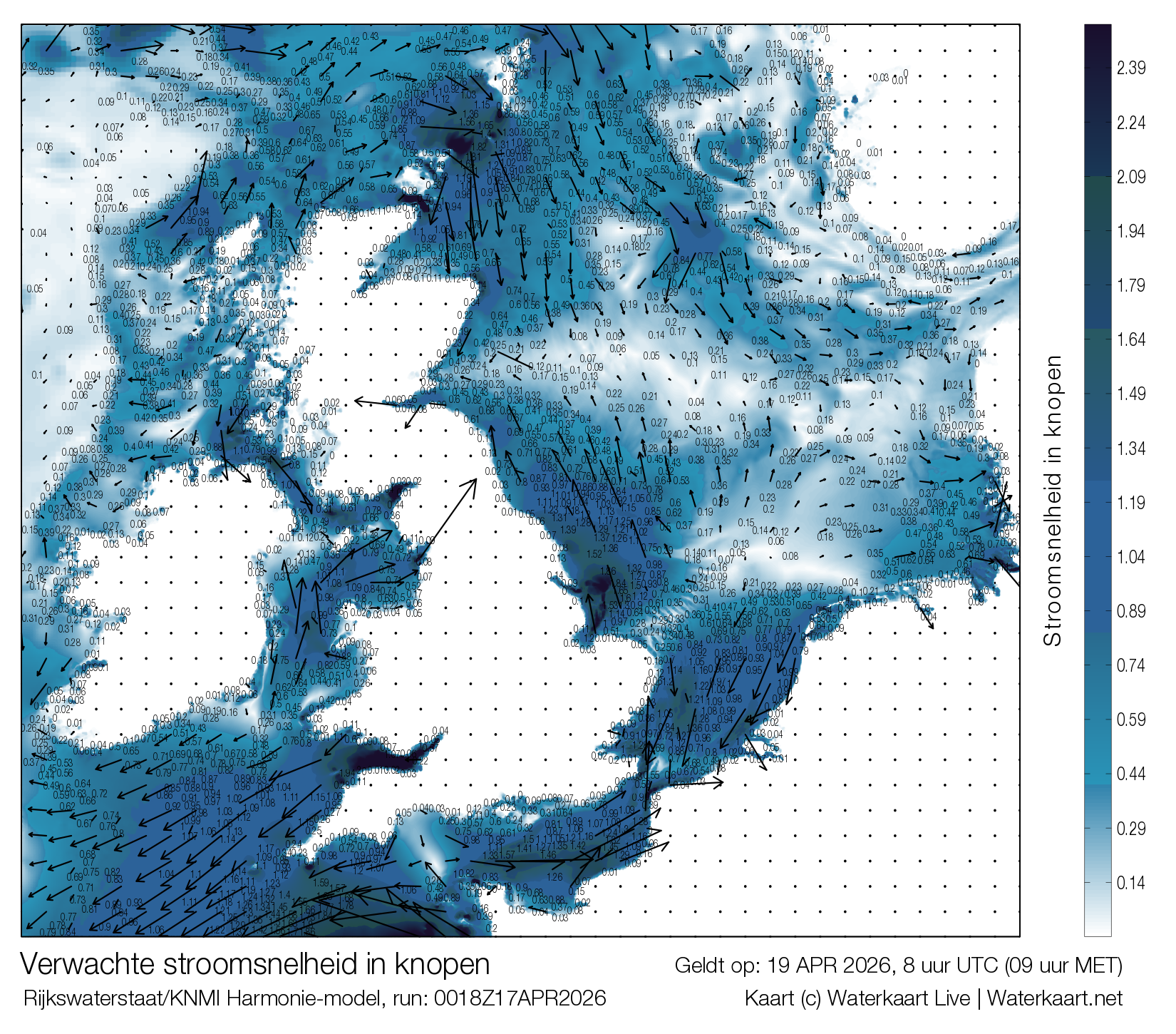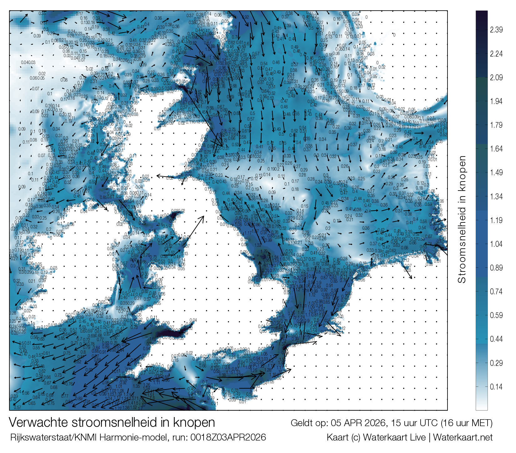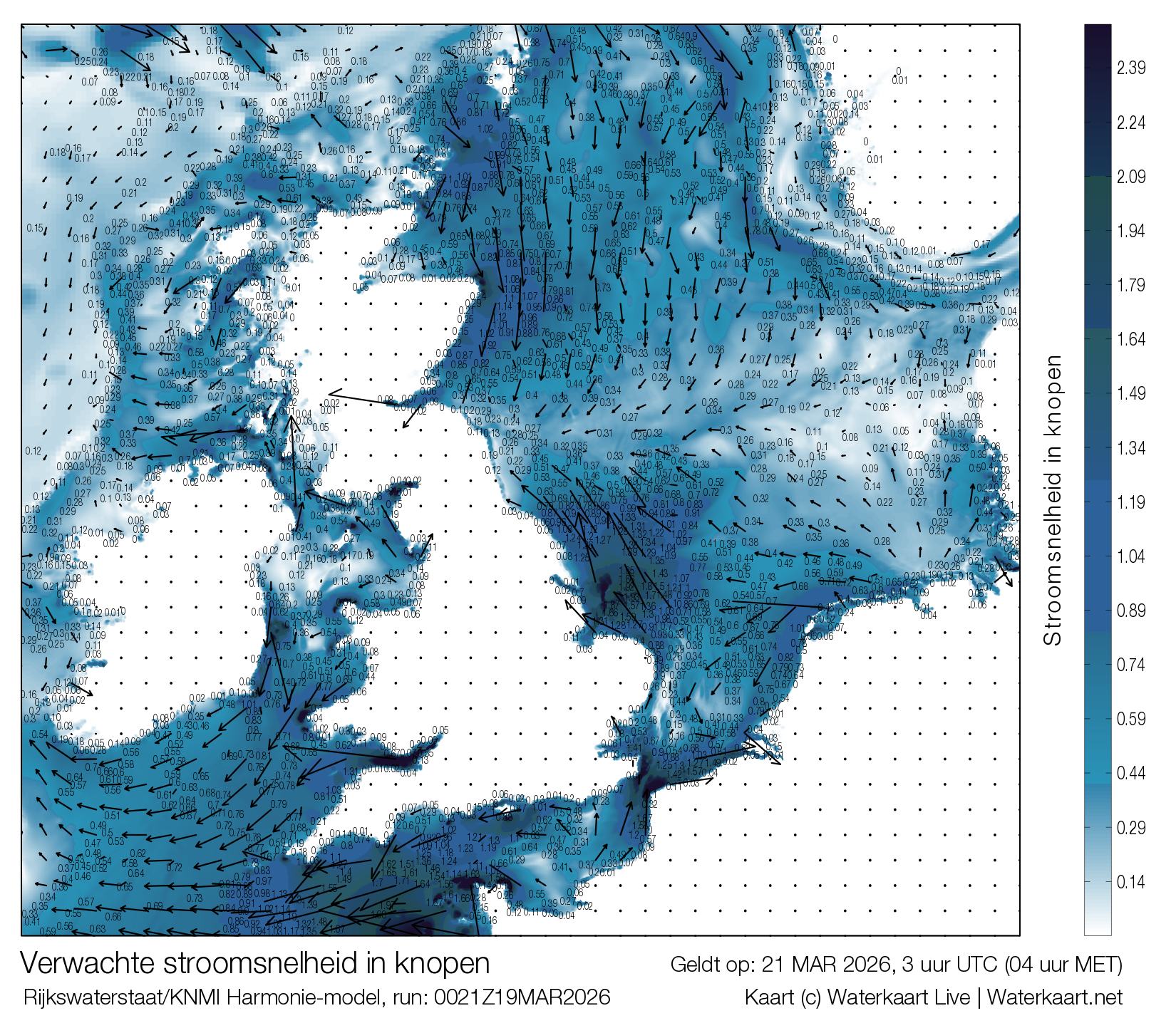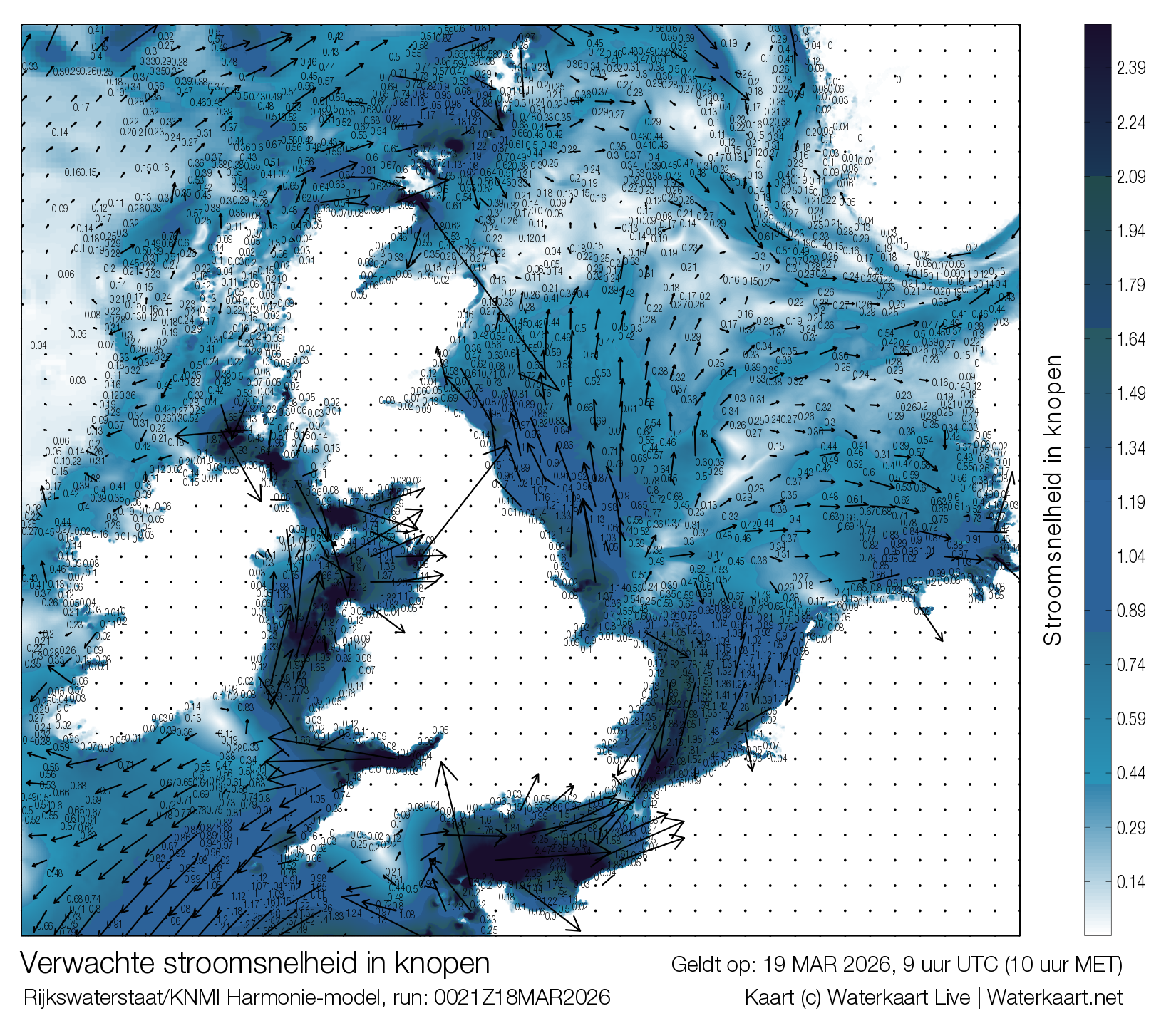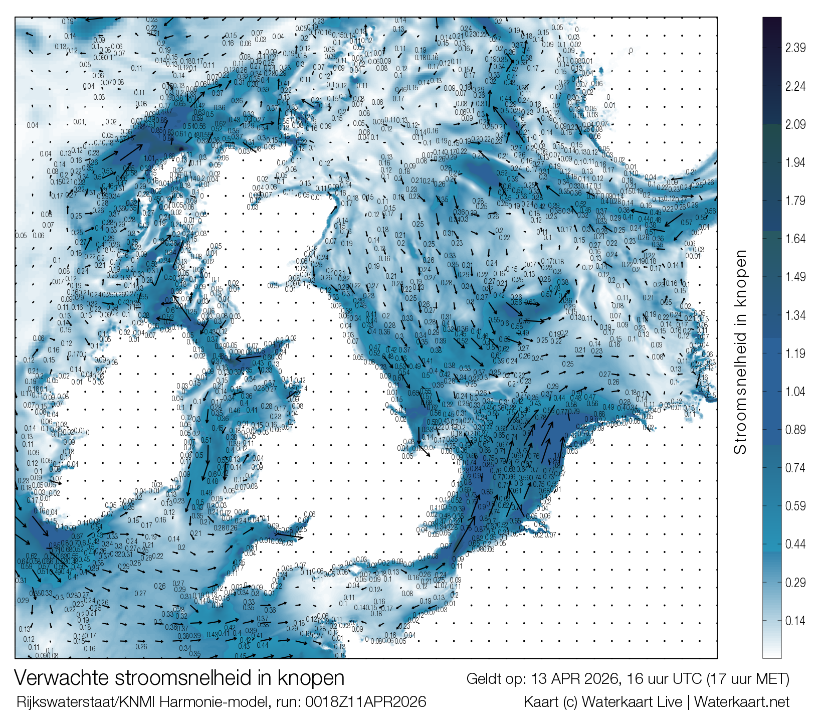 Stroomsnelheden in de Noordzee op basis van de Stroomatlas, verrekend met weersinvloeden. Deze worden iedere dag ververst met data uit het zeestromingen model van Rijkswaterstaat op basis van Harmonie weerdata, voor ieder uur een kaart, tot 48 uur in de toekomst. Lees hieronder meer over dit model
