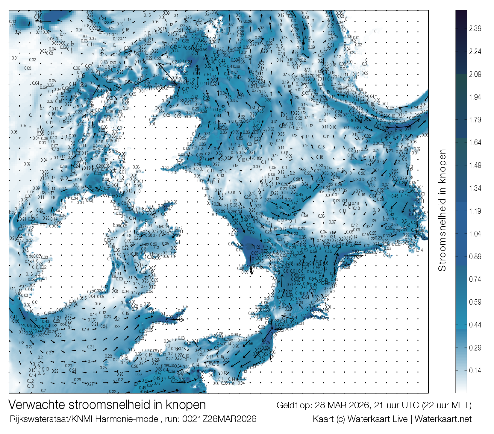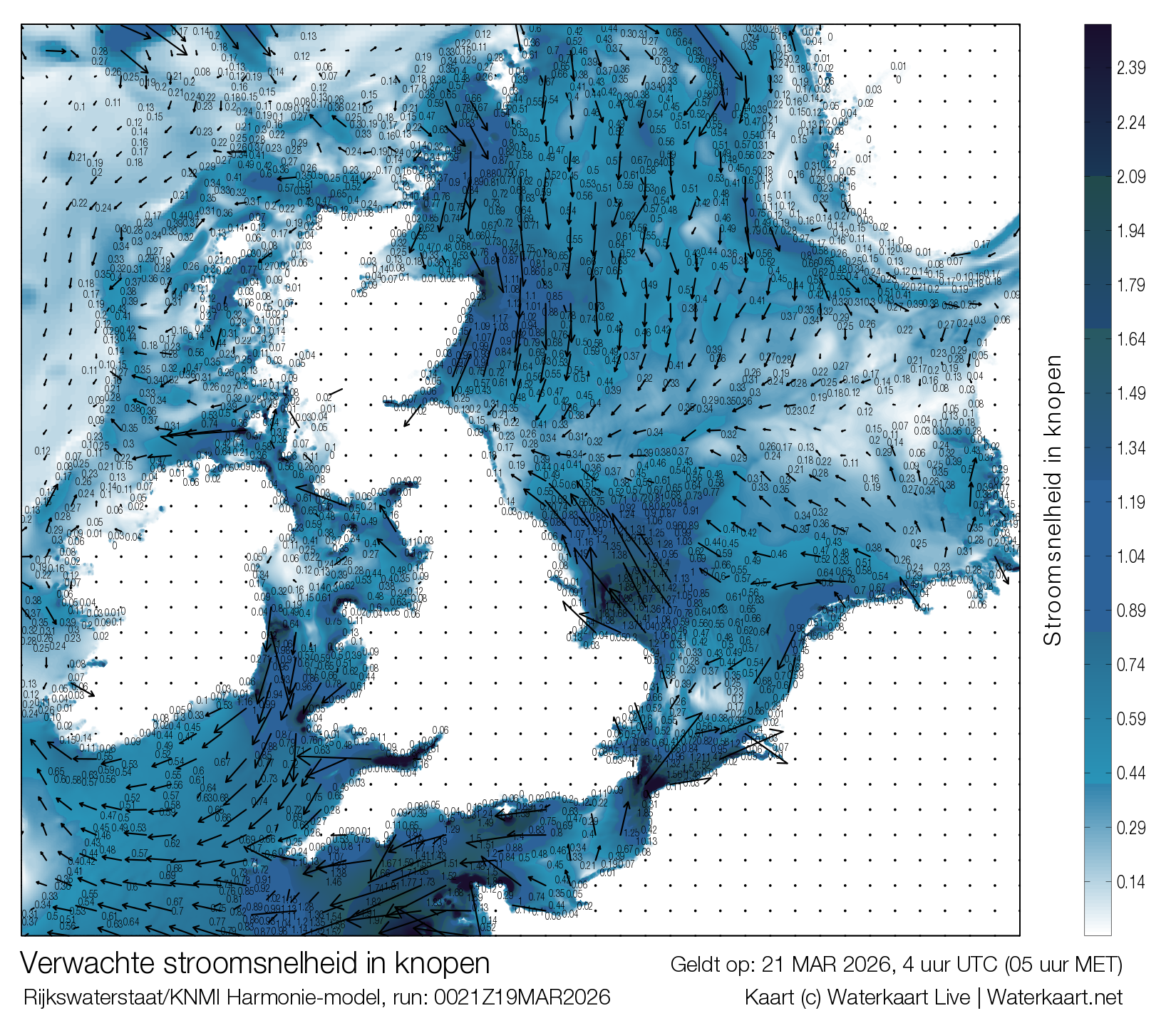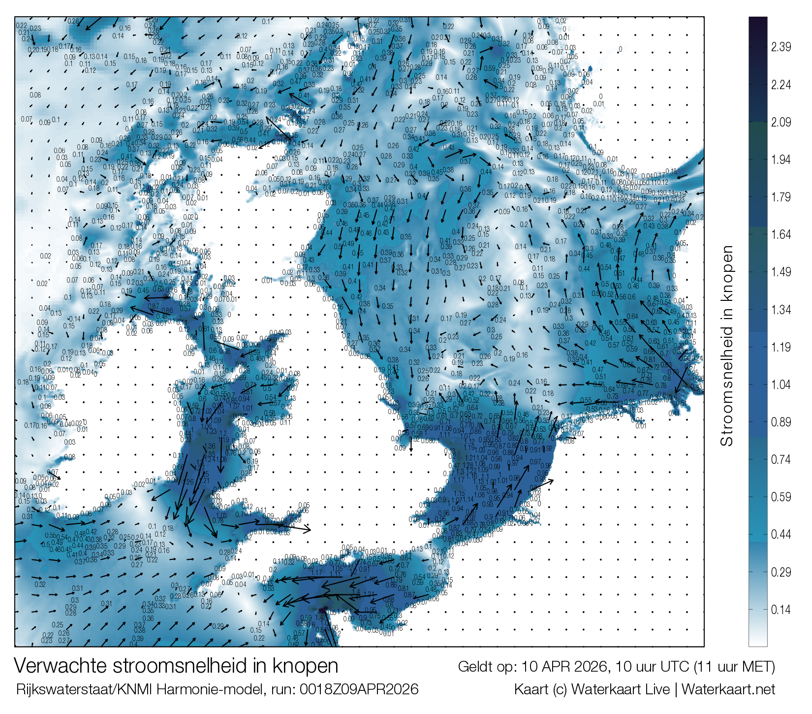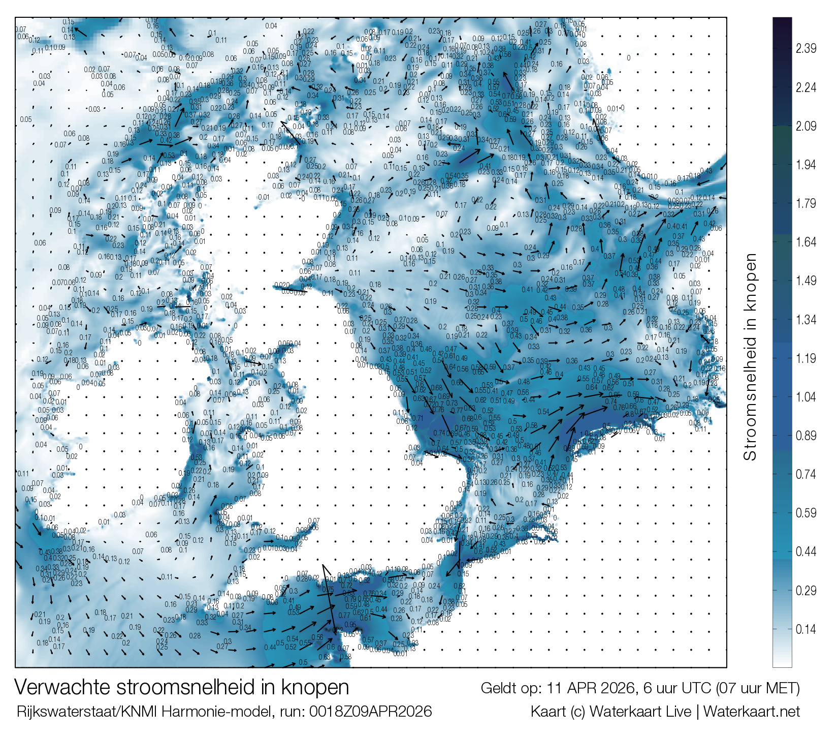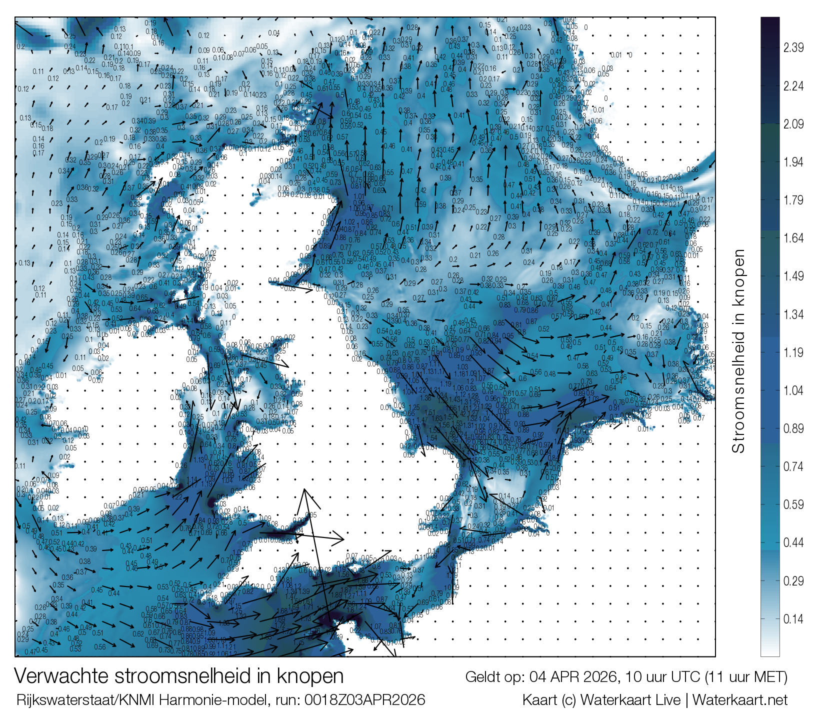 Stroomsnelheden in de Noordzee op basis van de Stroomatlas, verrekend met weersinvloeden. Deze worden iedere dag ververst met data uit het zeestromingen model van Rijkswaterstaat op basis van Harmonie weerdata, voor ieder uur een kaart, tot 48 uur in de toekomst. Lees hieronder meer over dit model