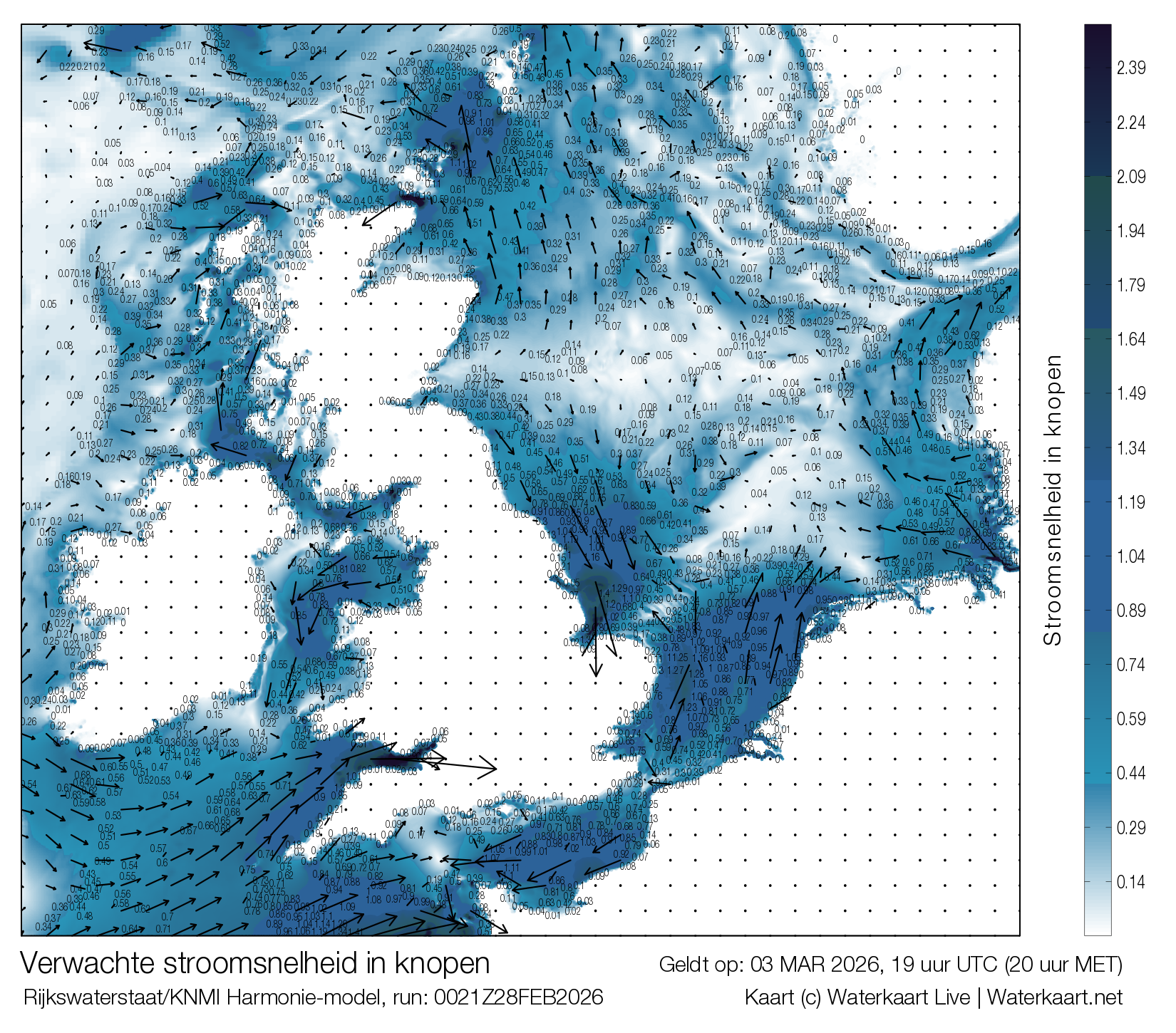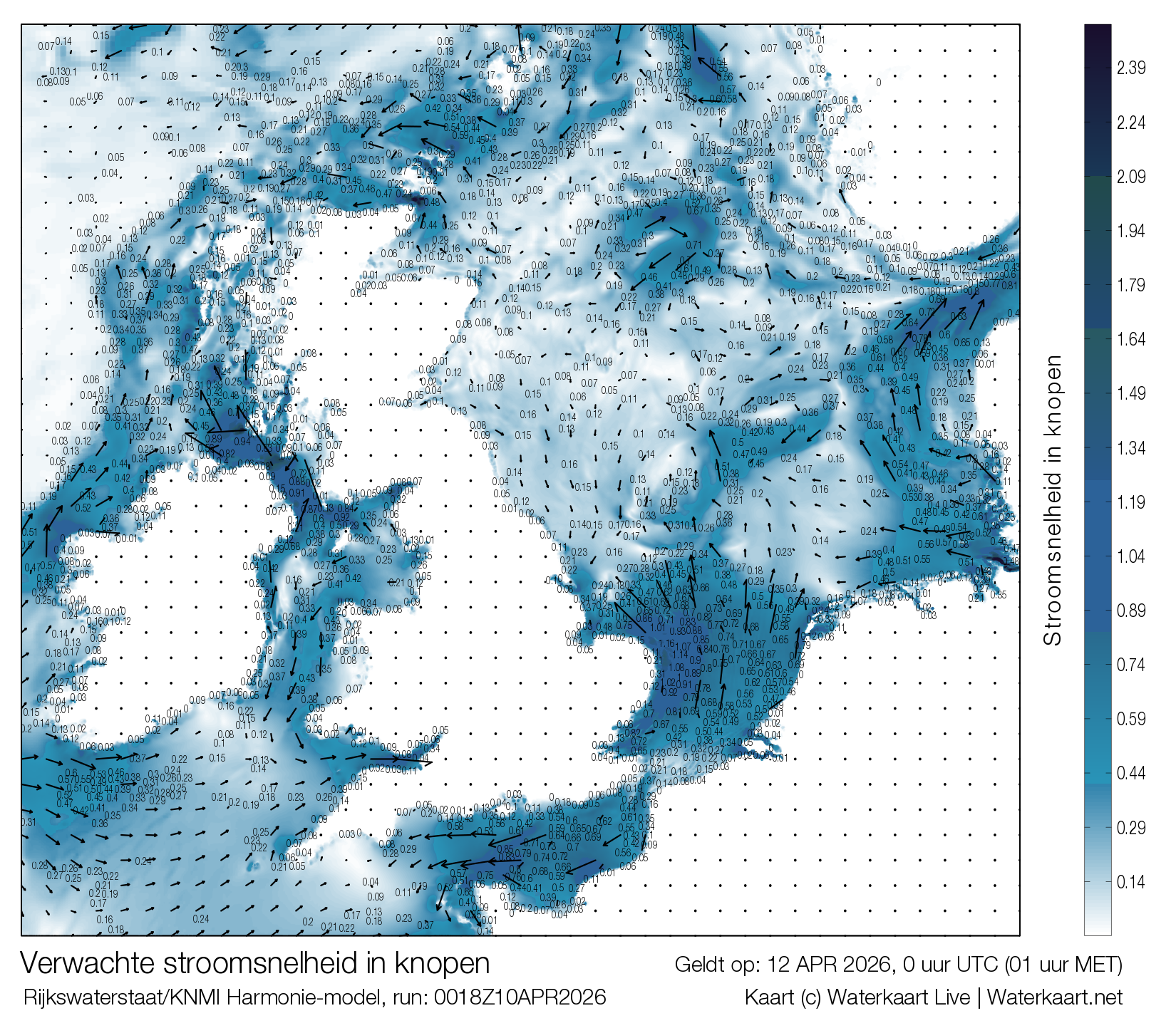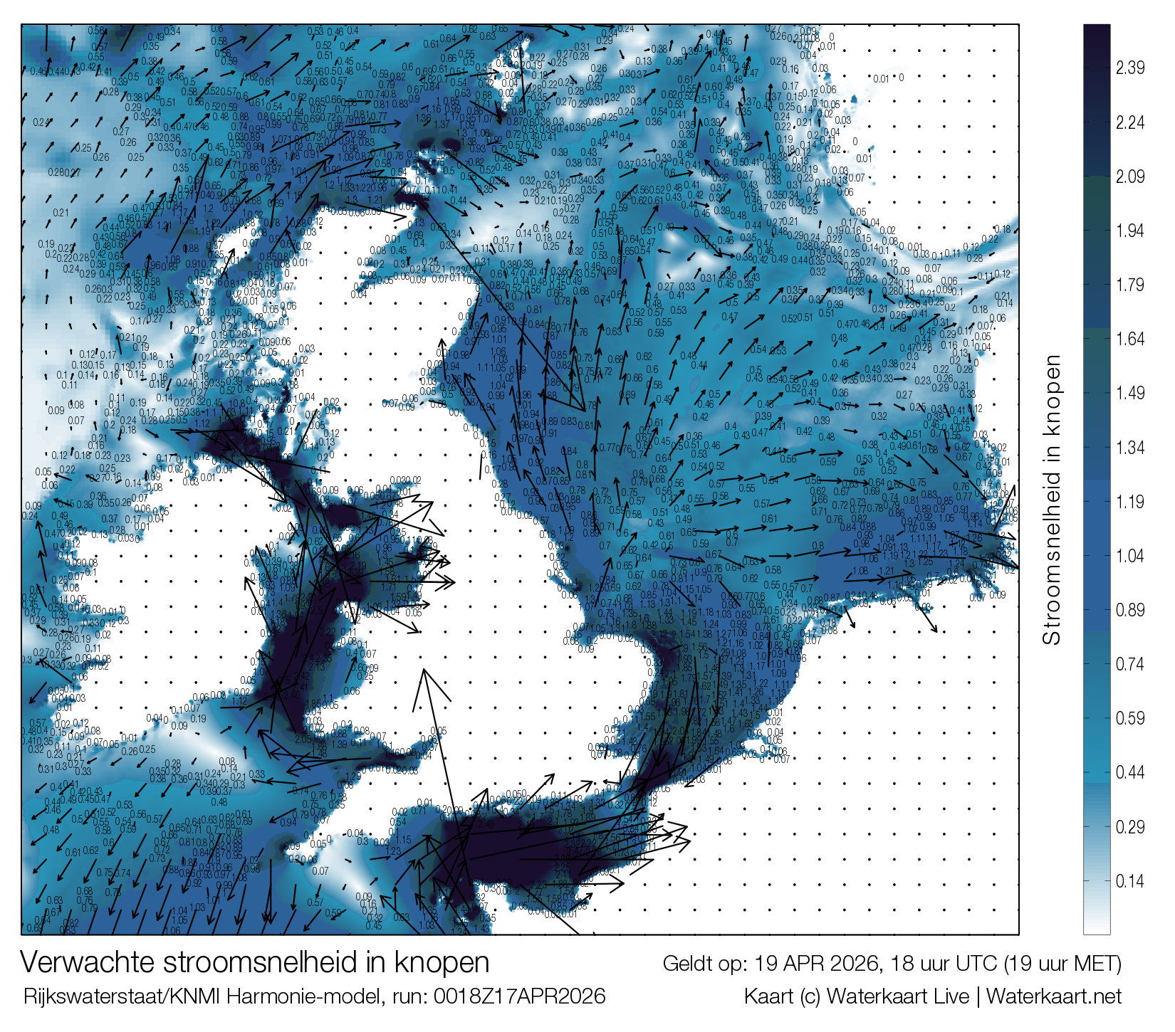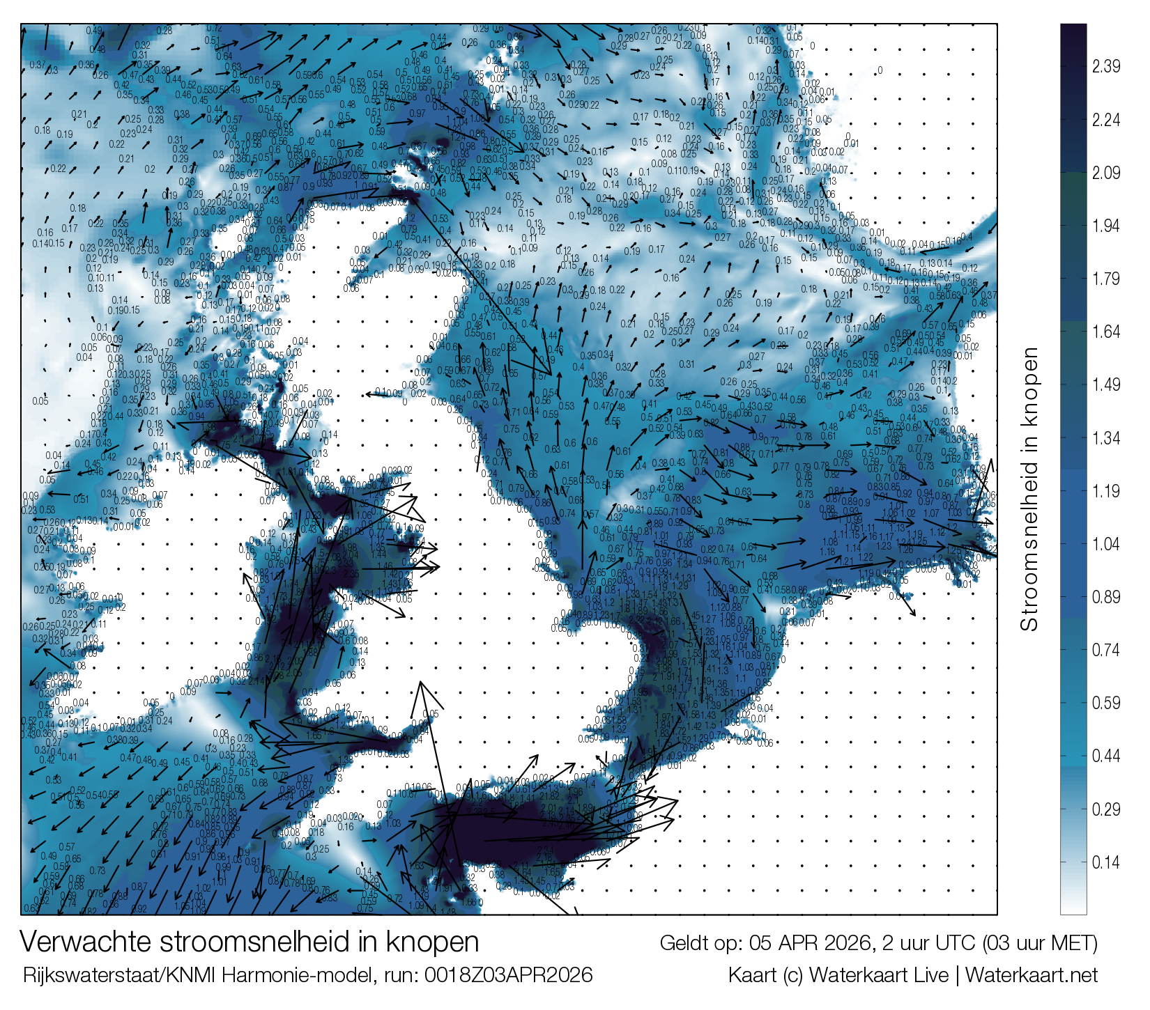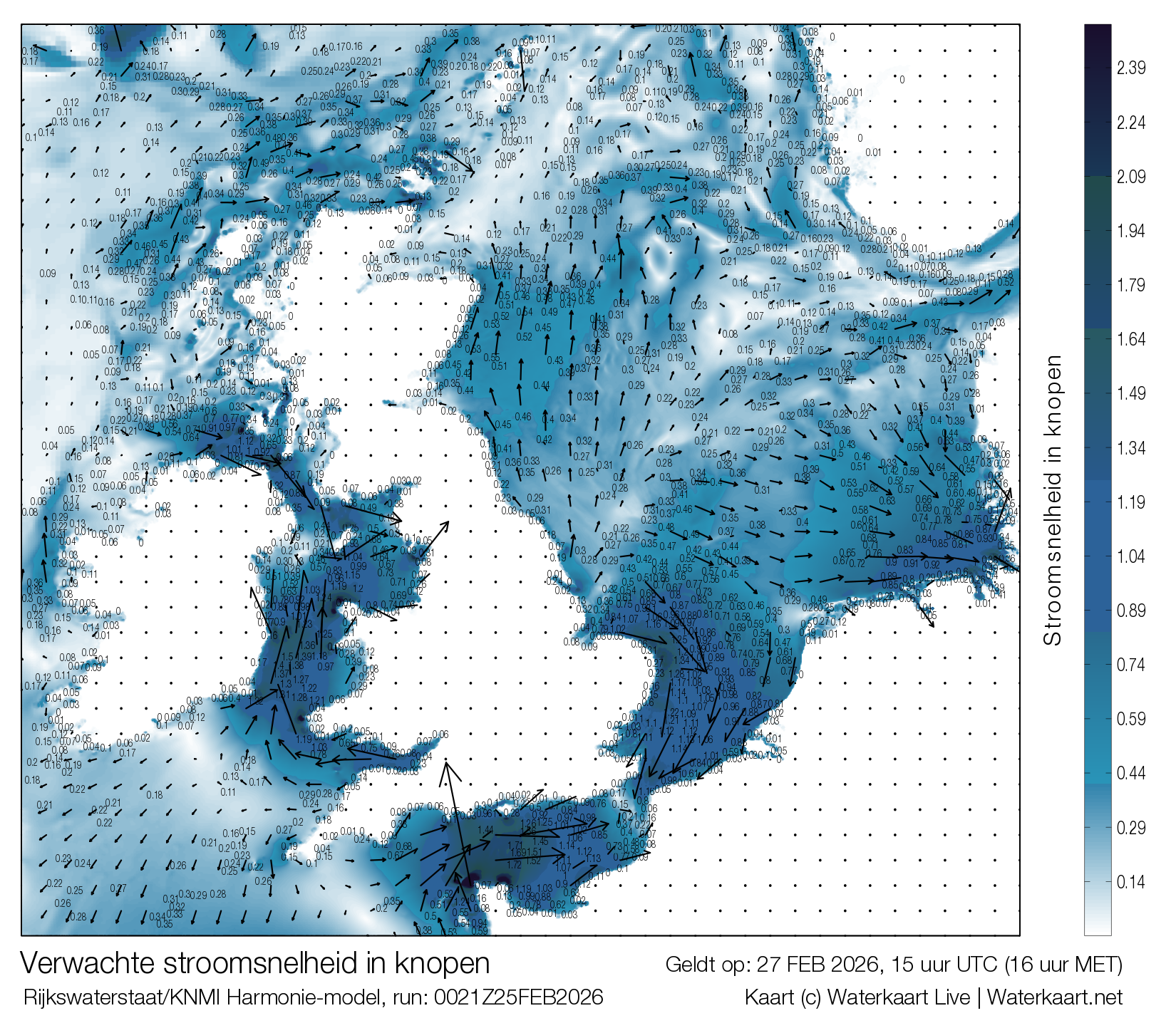 Stroomsnelheden in de Noordzee op basis van de Stroomatlas, verrekend met weersinvloeden. Deze worden iedere dag ververst met data uit het zeestromingen model van Rijkswaterstaat op basis van Harmonie weerdata, voor ieder uur een kaart, tot 48 uur in de toekomst. Lees hieronder meer over dit model