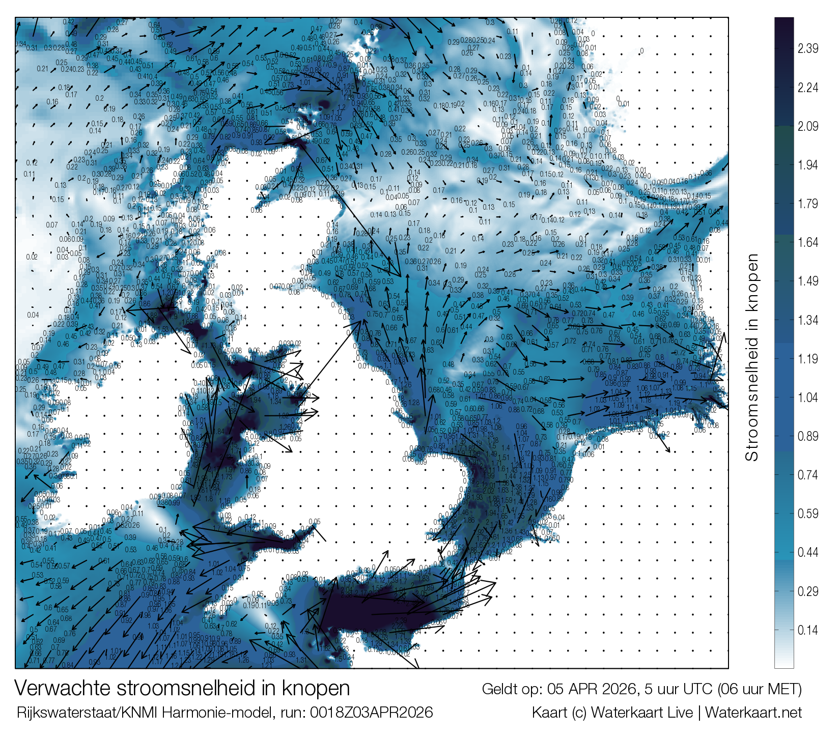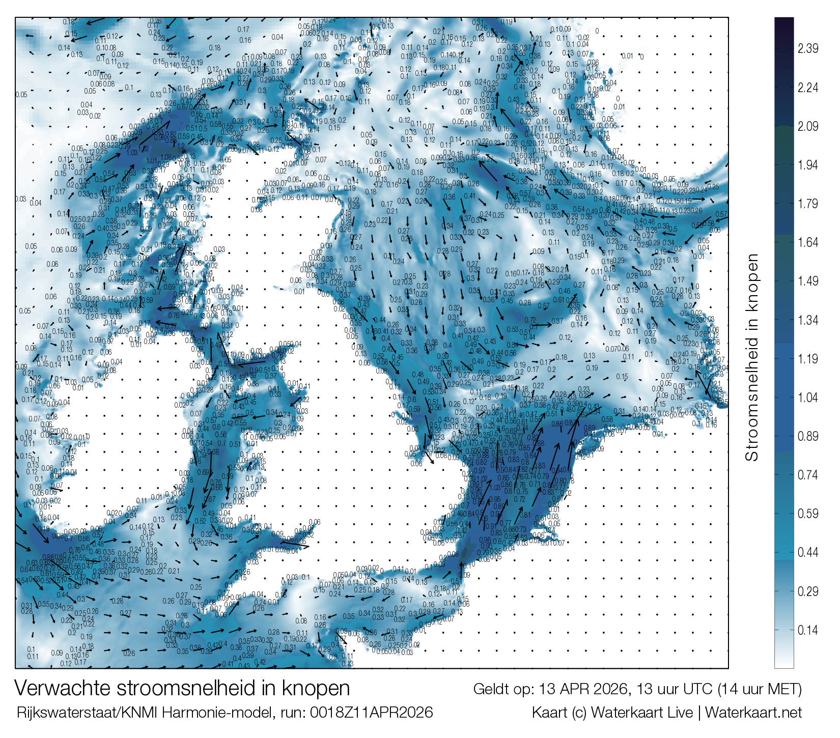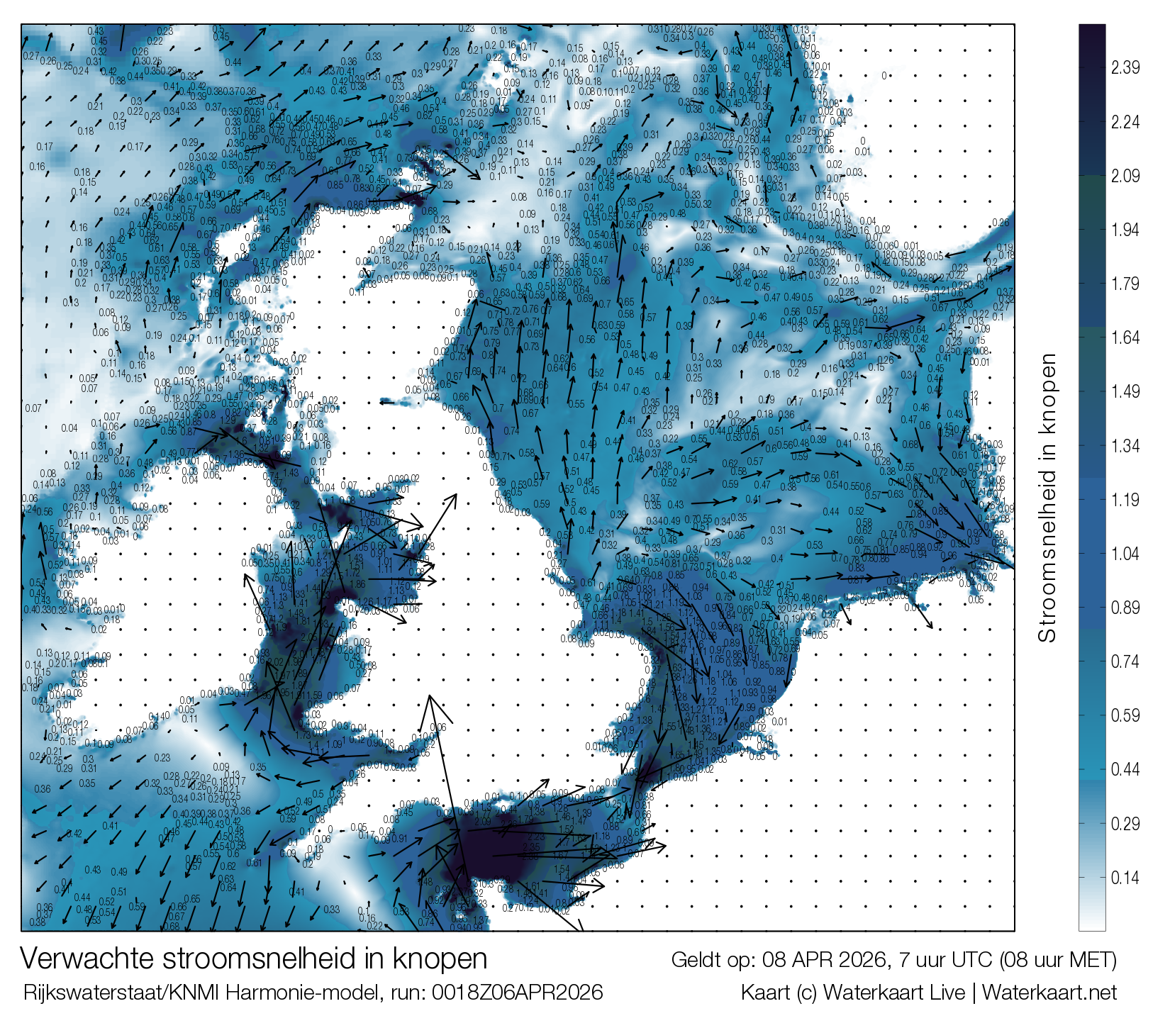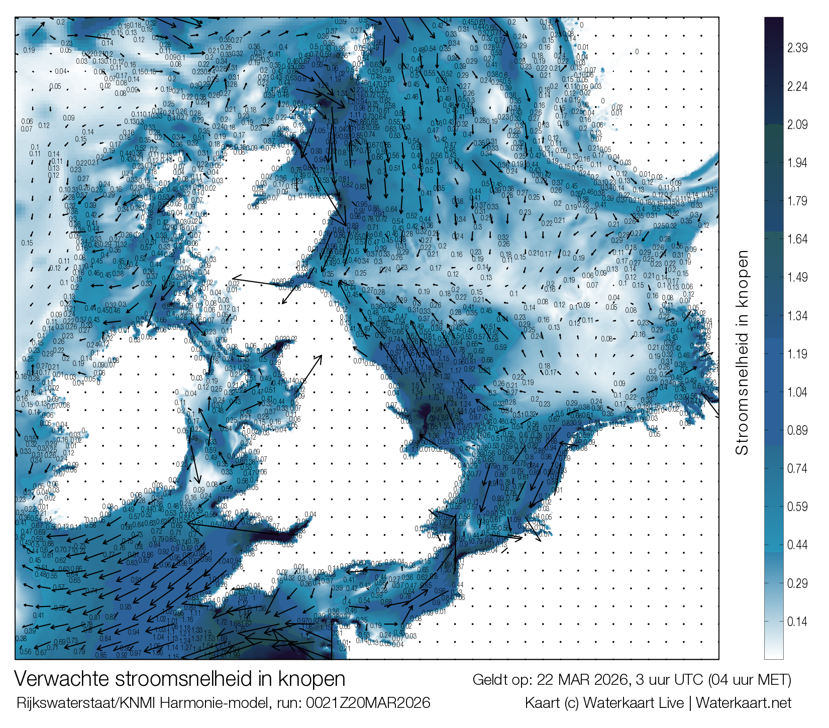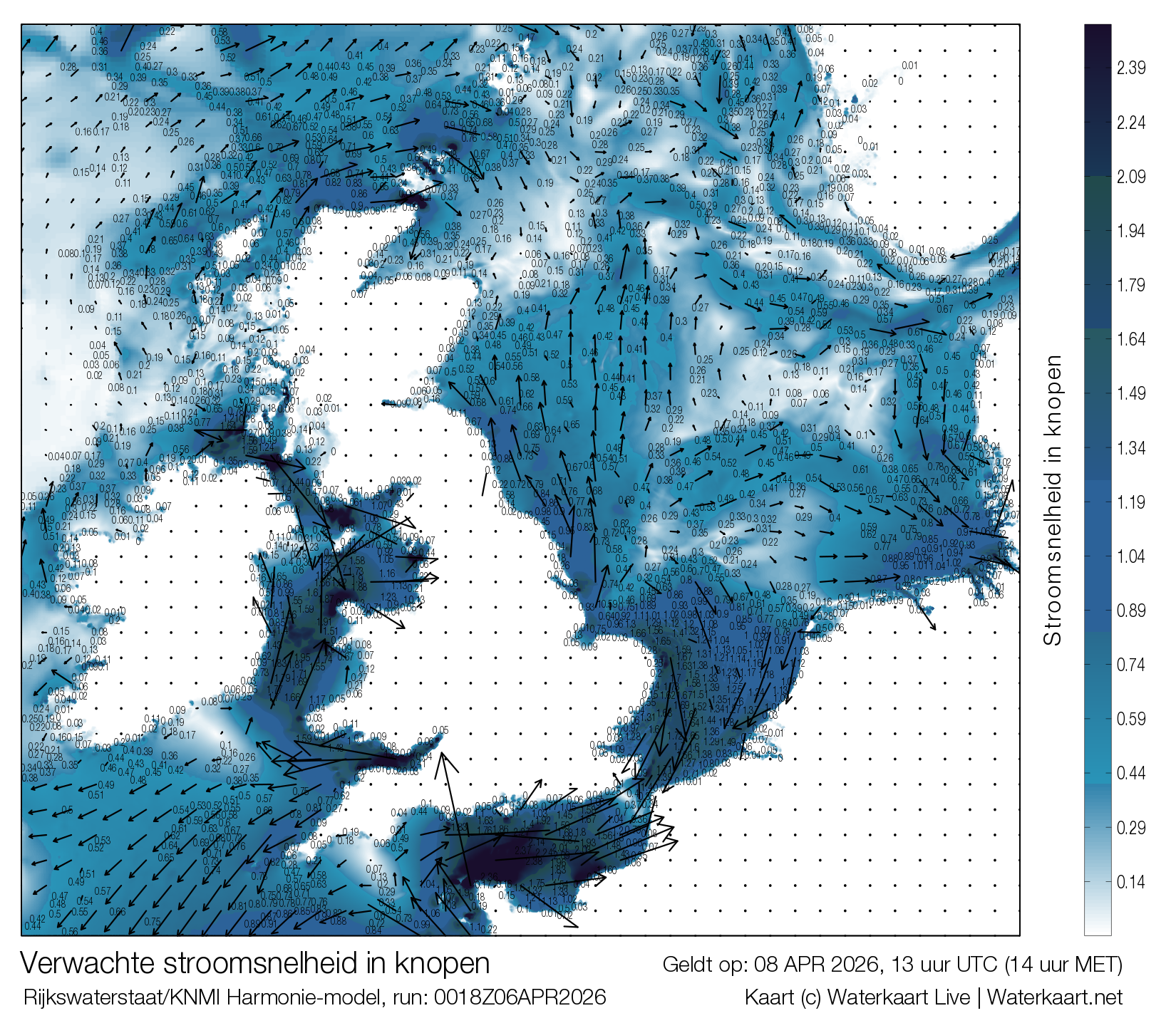 Stroomsnelheden in de Noordzee op basis van de Stroomatlas, verrekend met weersinvloeden. Deze worden iedere dag ververst met data uit het zeestromingen model van Rijkswaterstaat op basis van Harmonie weerdata, voor ieder uur een kaart, tot 48 uur in de toekomst. Lees hieronder meer over dit model