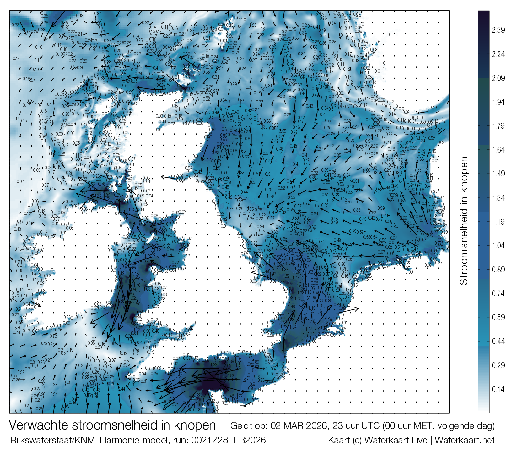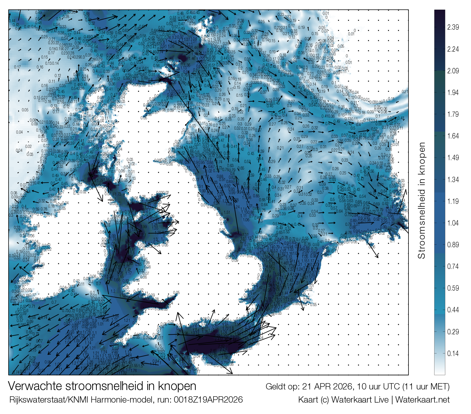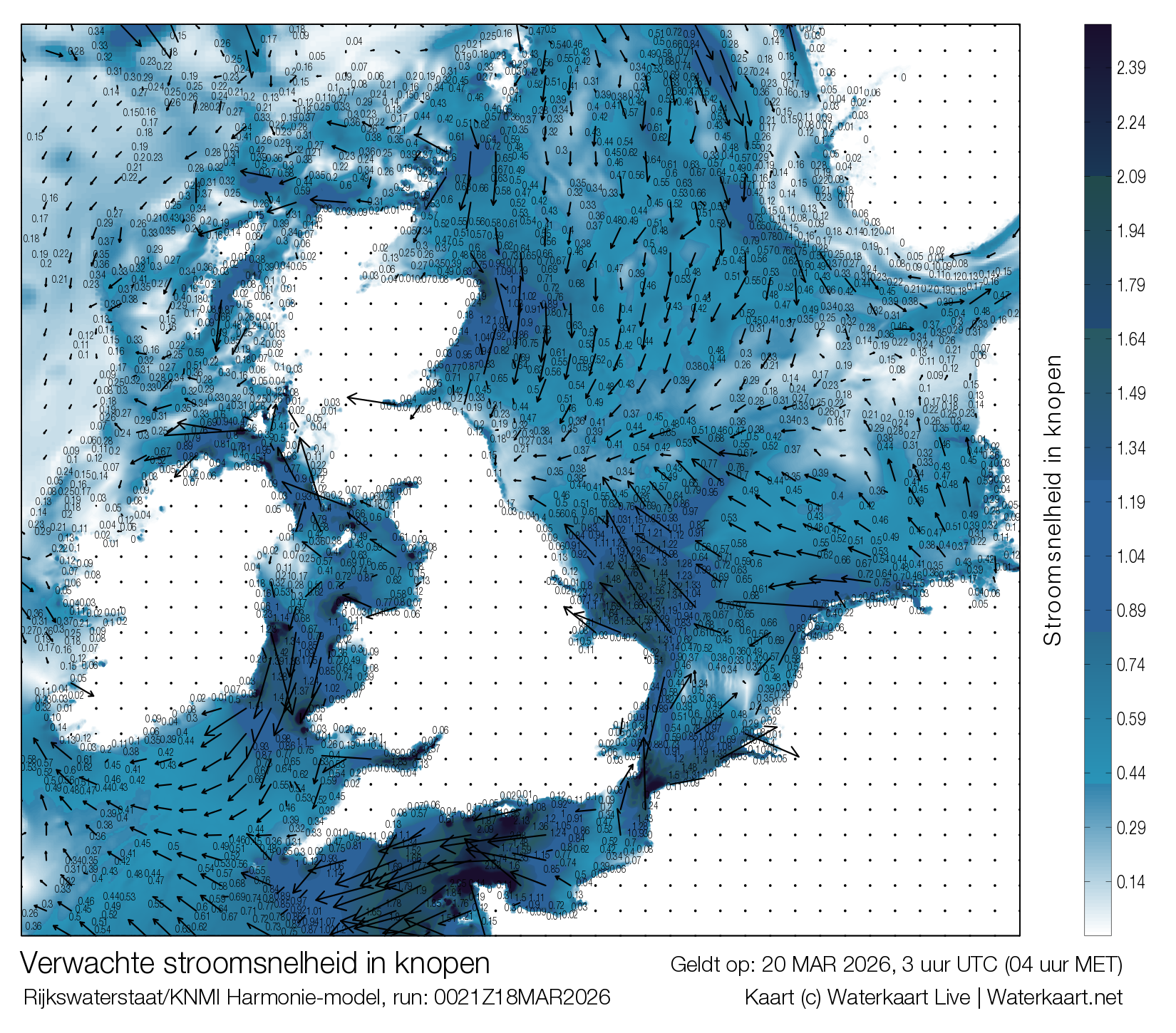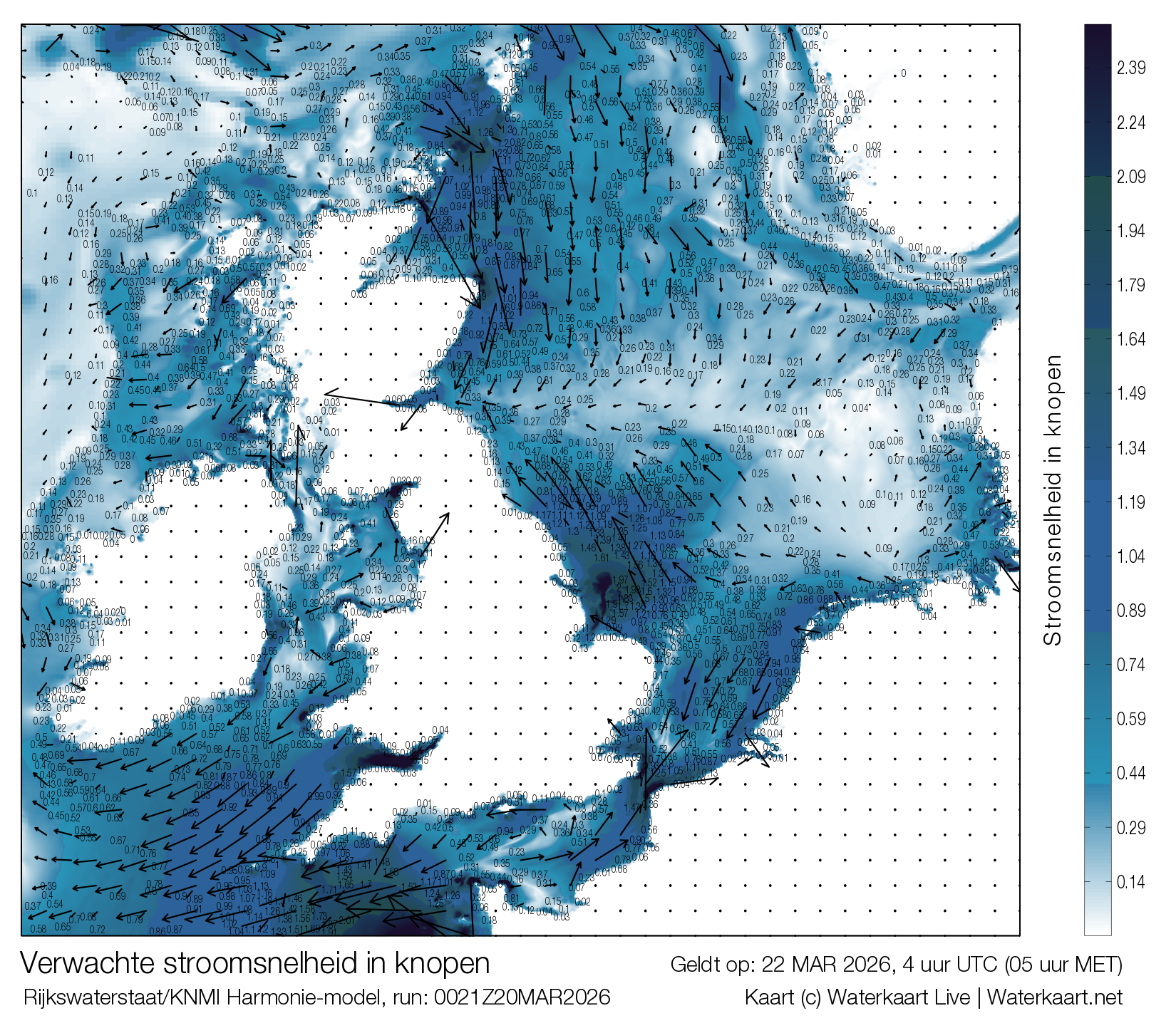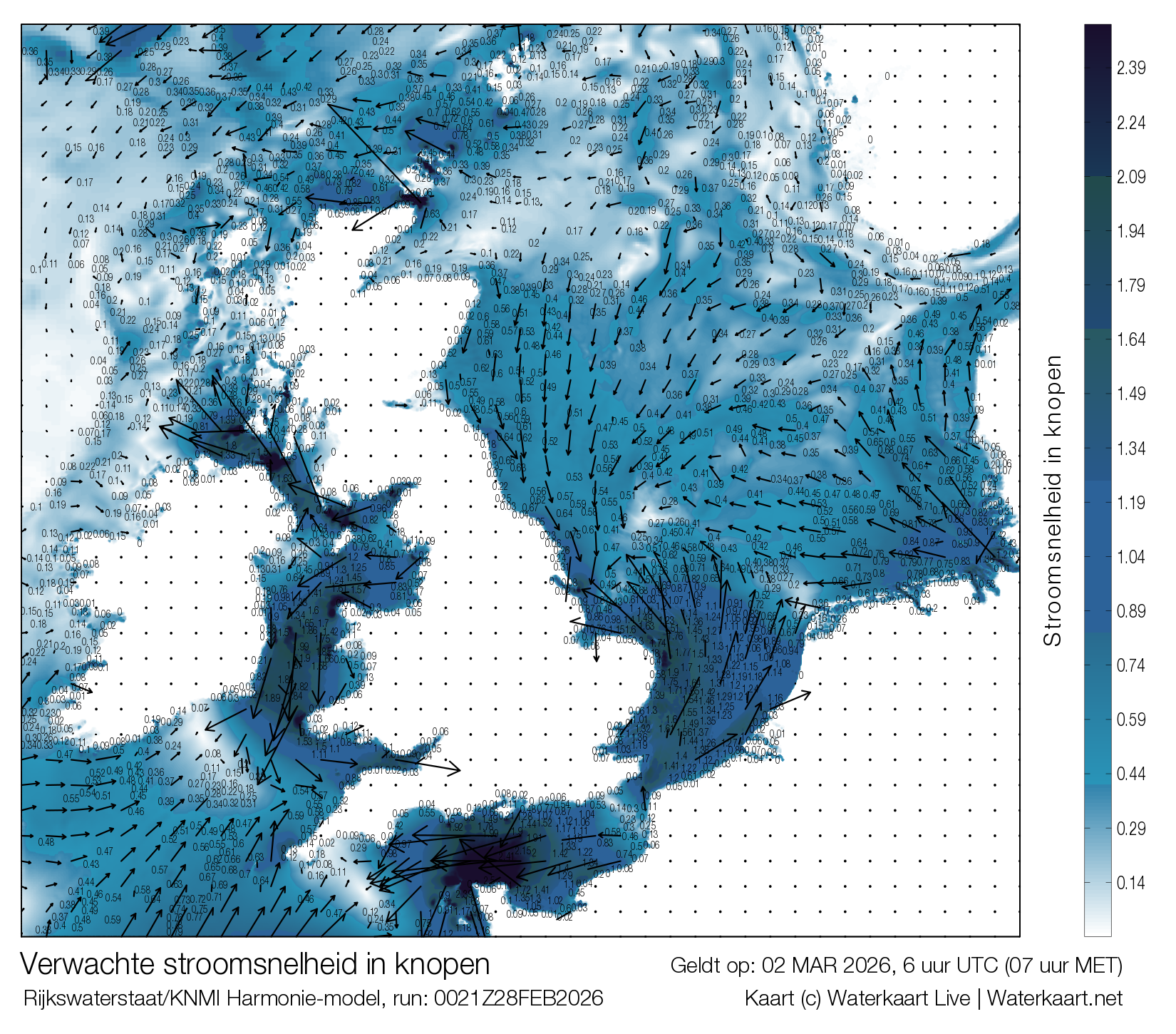 Stroomsnelheden in de Noordzee op basis van de Stroomatlas, verrekend met weersinvloeden. Deze worden iedere dag ververst met data uit het zeestromingen model van Rijkswaterstaat op basis van Harmonie weerdata, voor ieder uur een kaart, tot 48 uur in de toekomst. Lees hieronder meer over dit model