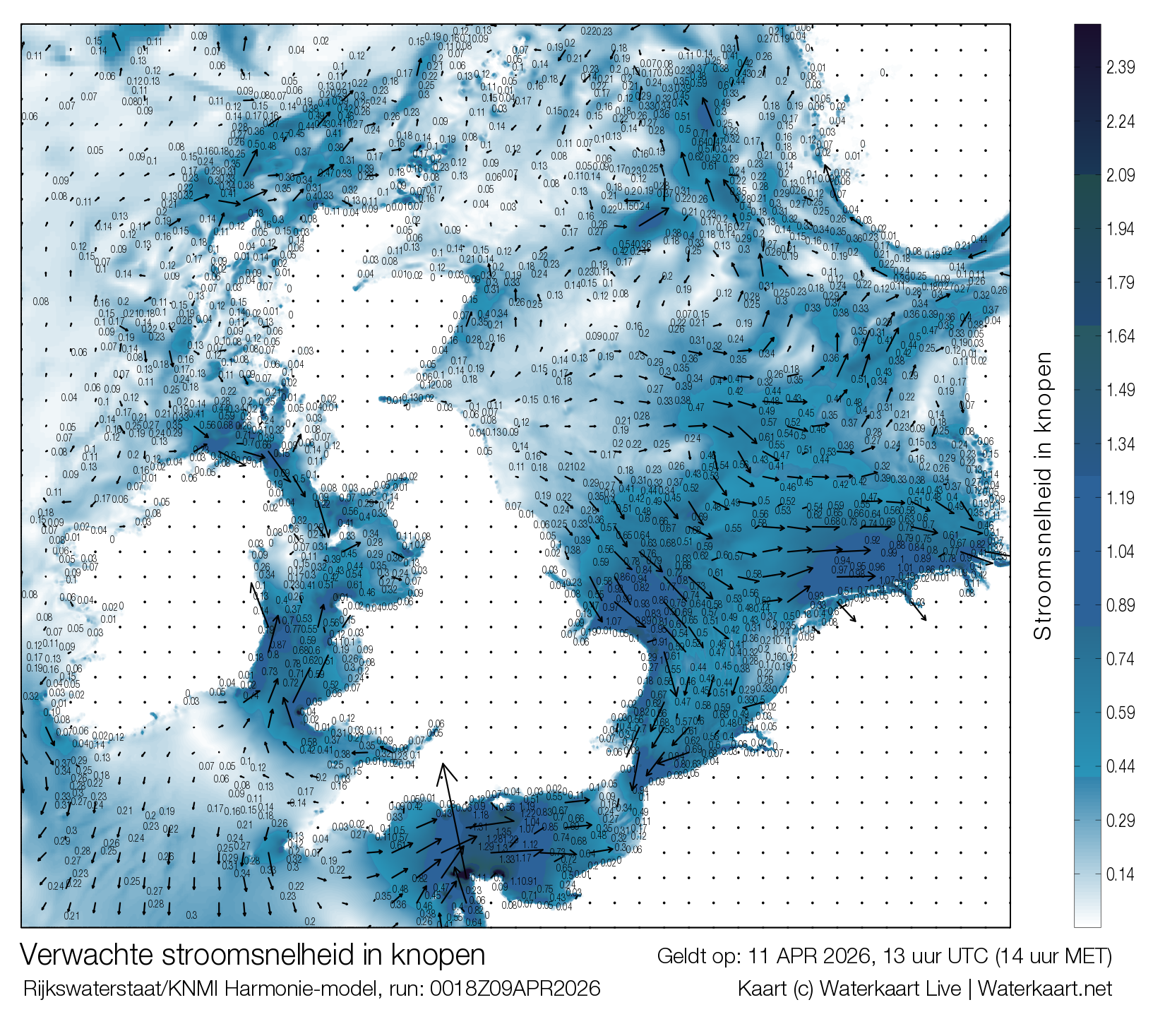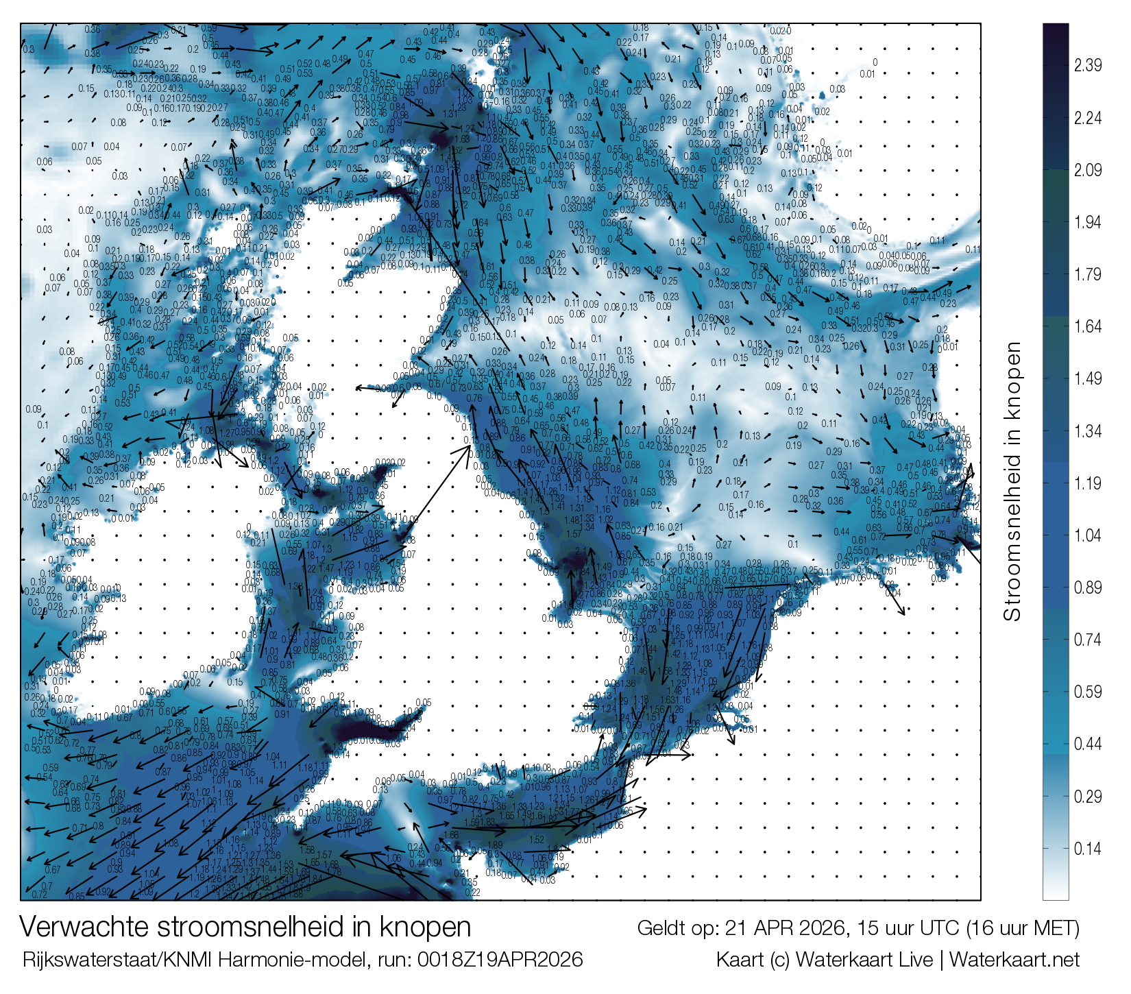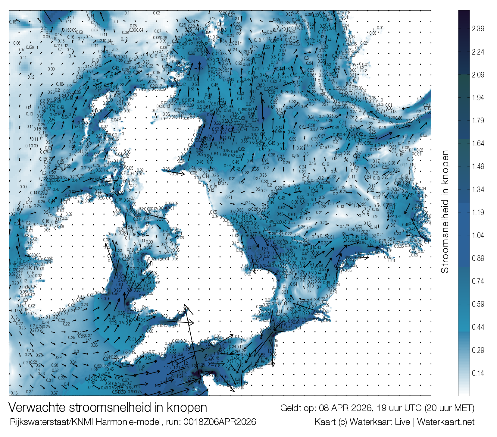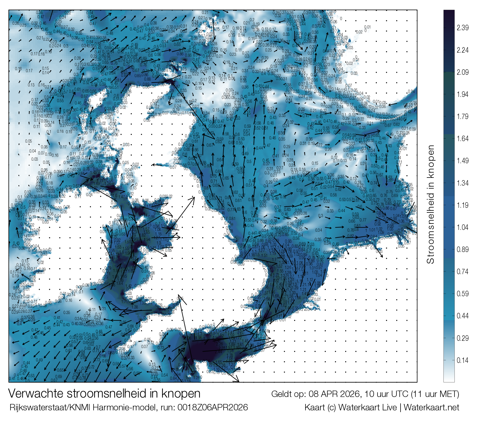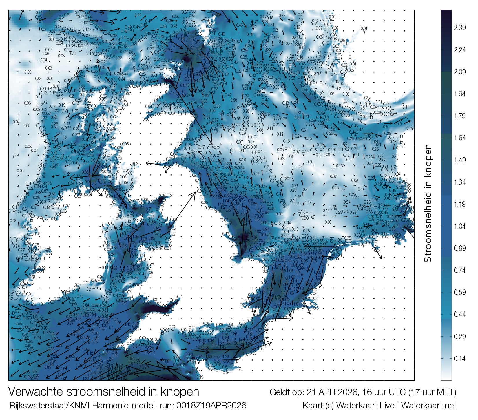 Stroomsnelheden in de Noordzee op basis van de Stroomatlas, verrekend met weersinvloeden. Deze worden iedere dag ververst met data uit het zeestromingen model van Rijkswaterstaat op basis van Harmonie weerdata, voor ieder uur een kaart, tot 48 uur in de toekomst. Lees hieronder meer over dit model
