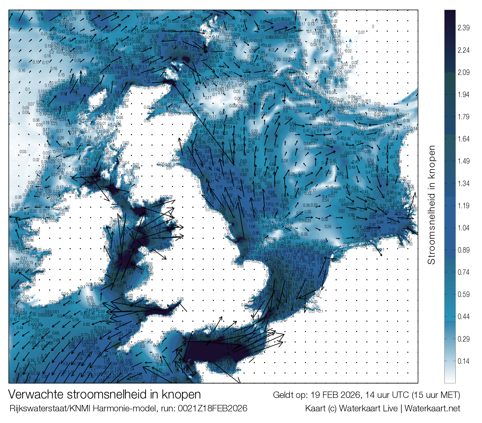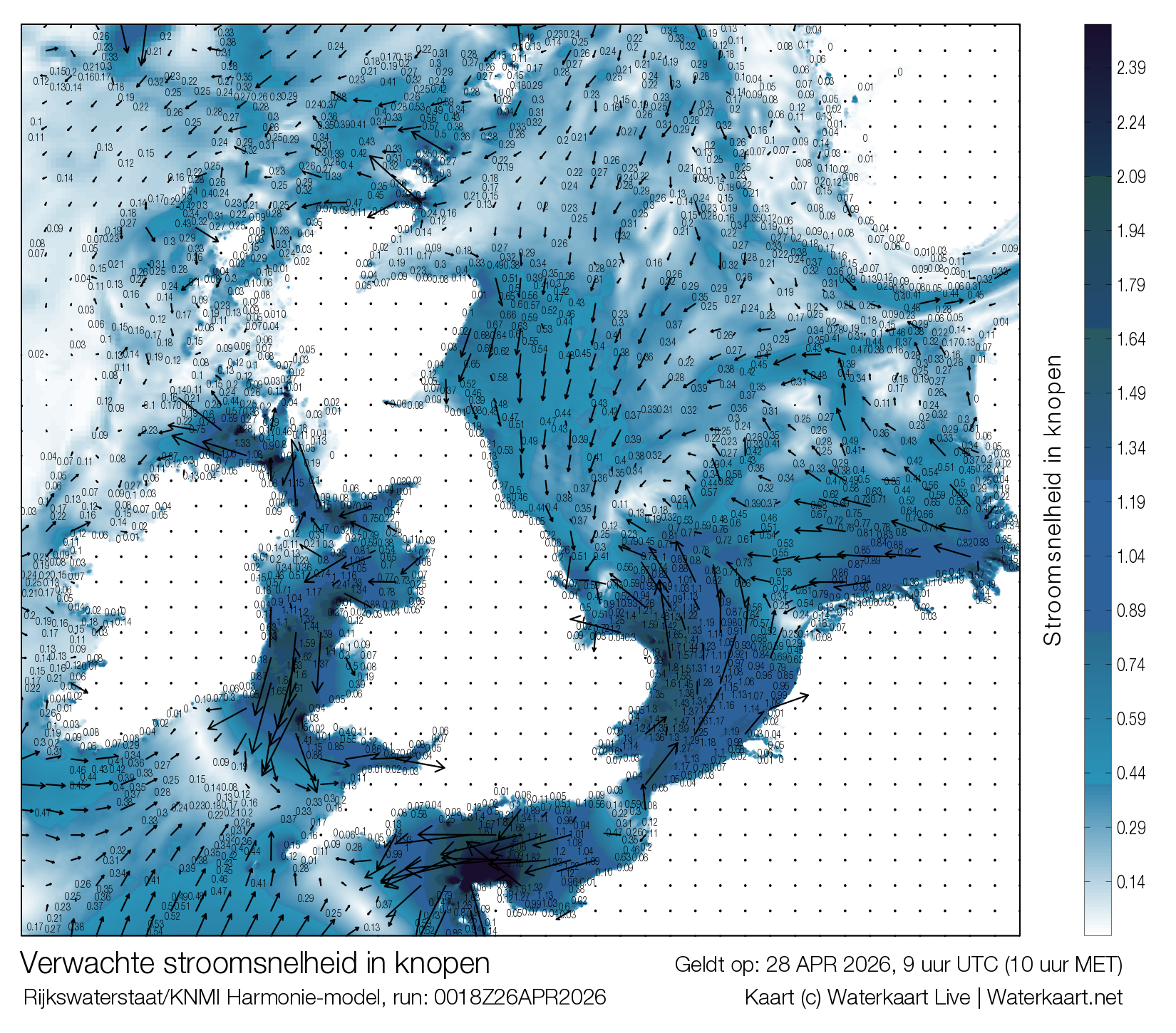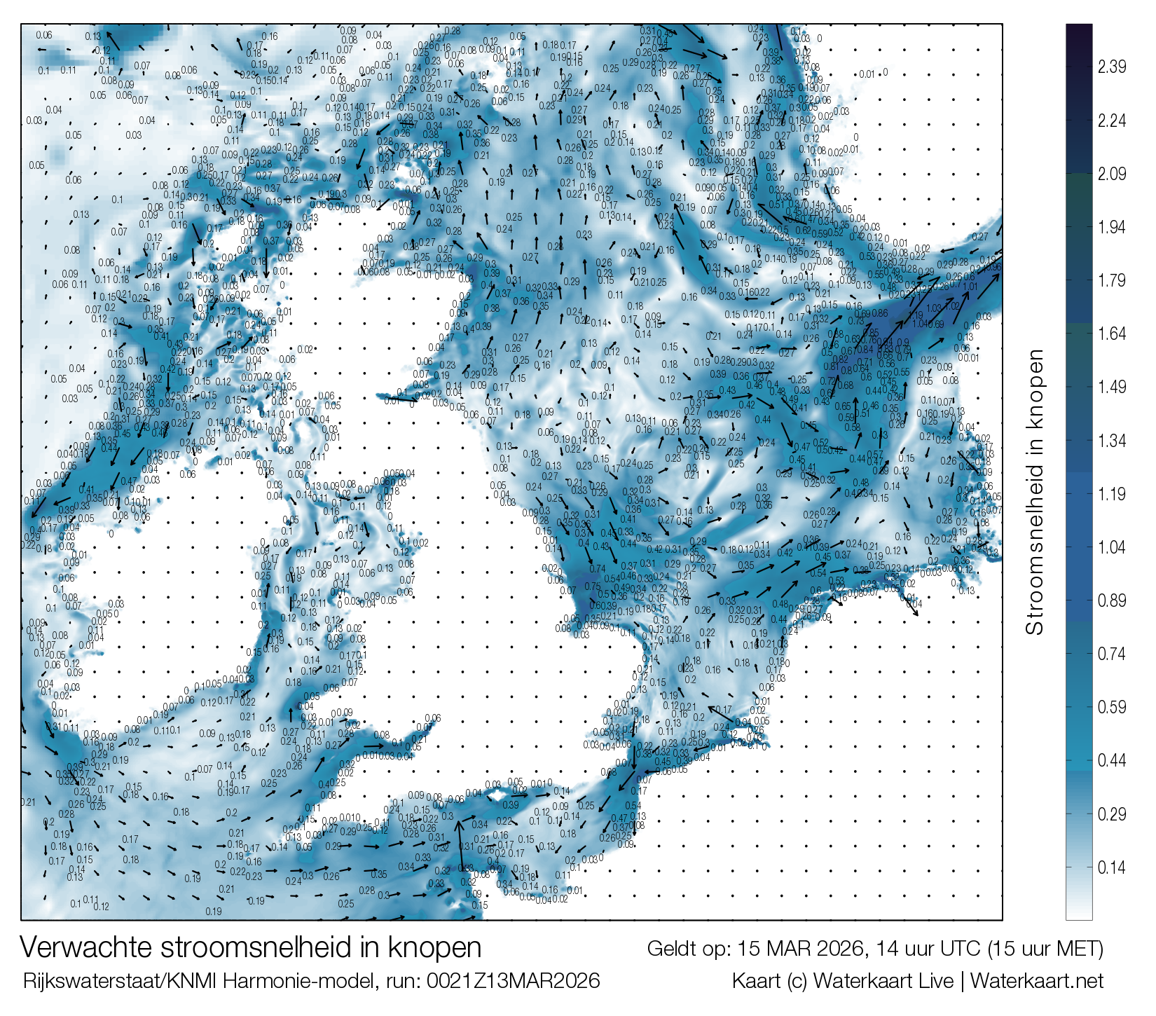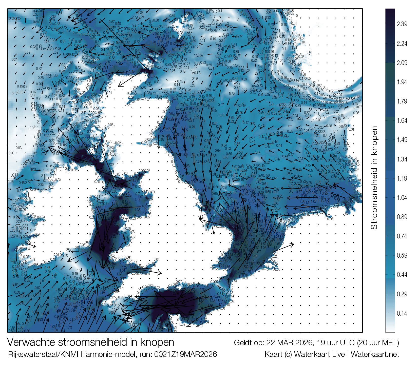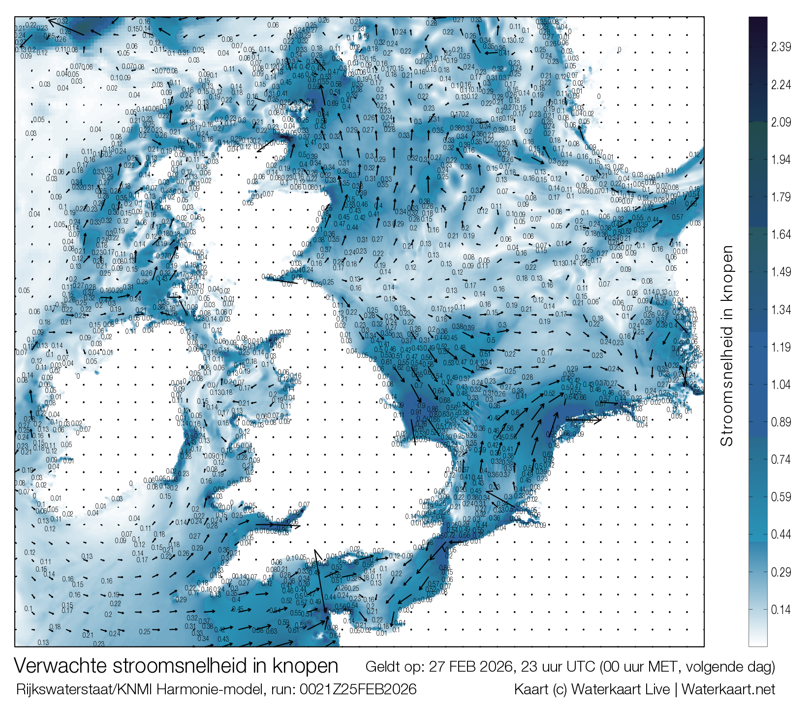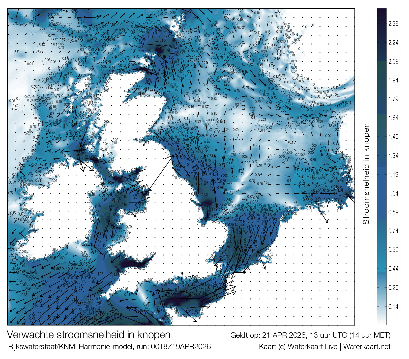 Stroomsnelheden in de Noordzee op basis van de Stroomatlas, verrekend met weersinvloeden. Deze worden iedere dag ververst met data uit het zeestromingen model van Rijkswaterstaat op basis van Harmonie weerdata, voor ieder uur een kaart, tot 48 uur in de toekomst. Lees hieronder meer over dit model