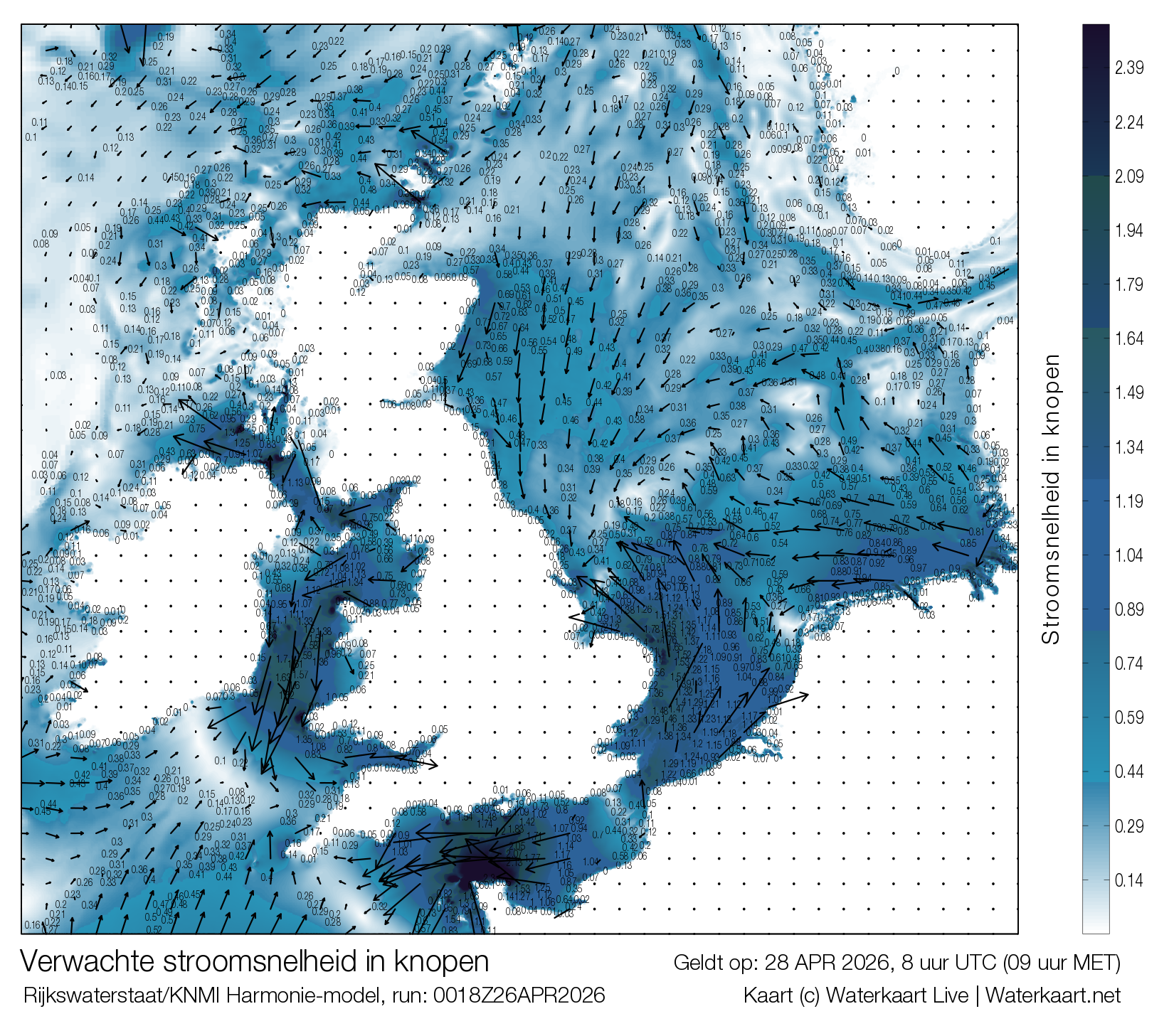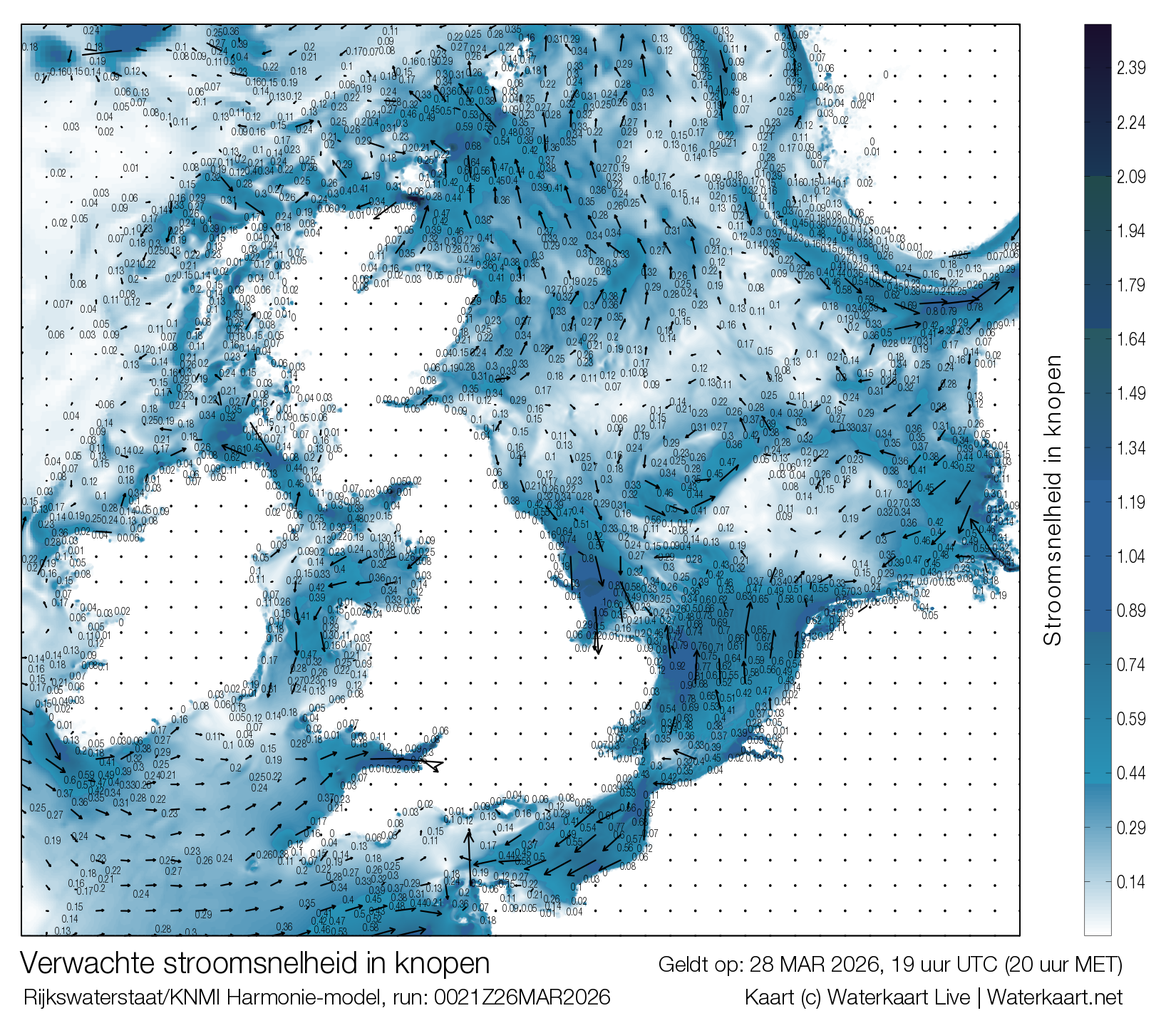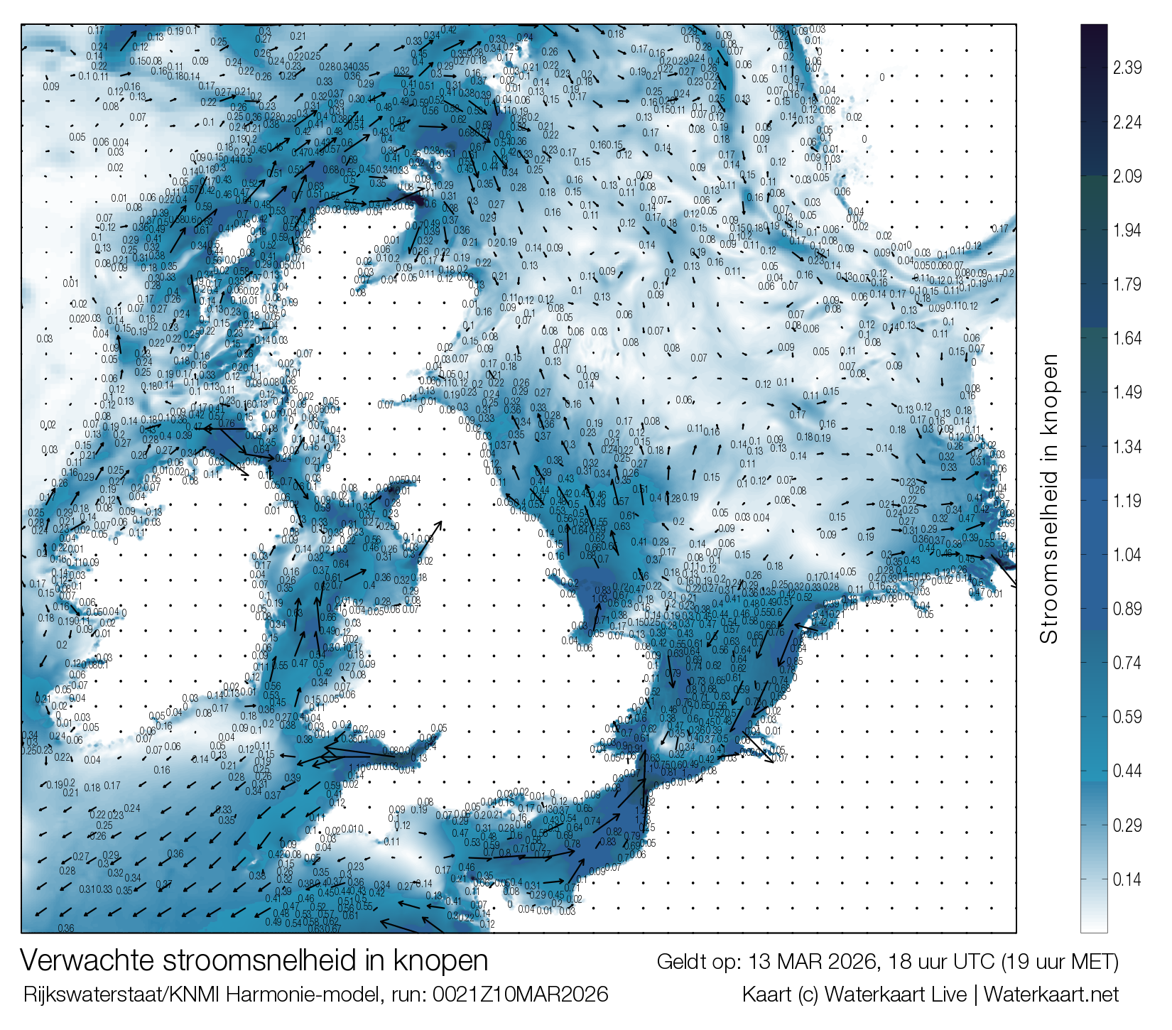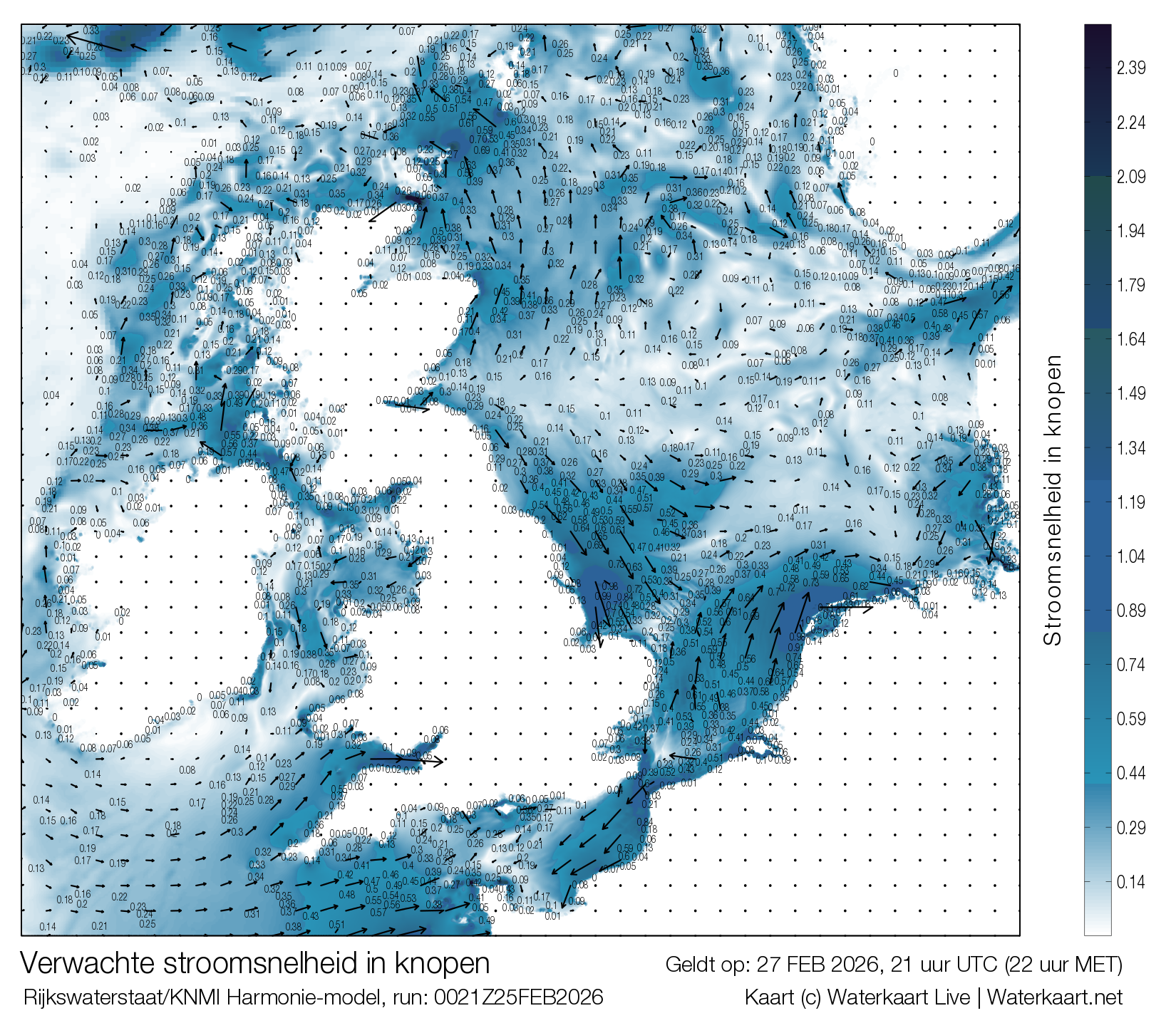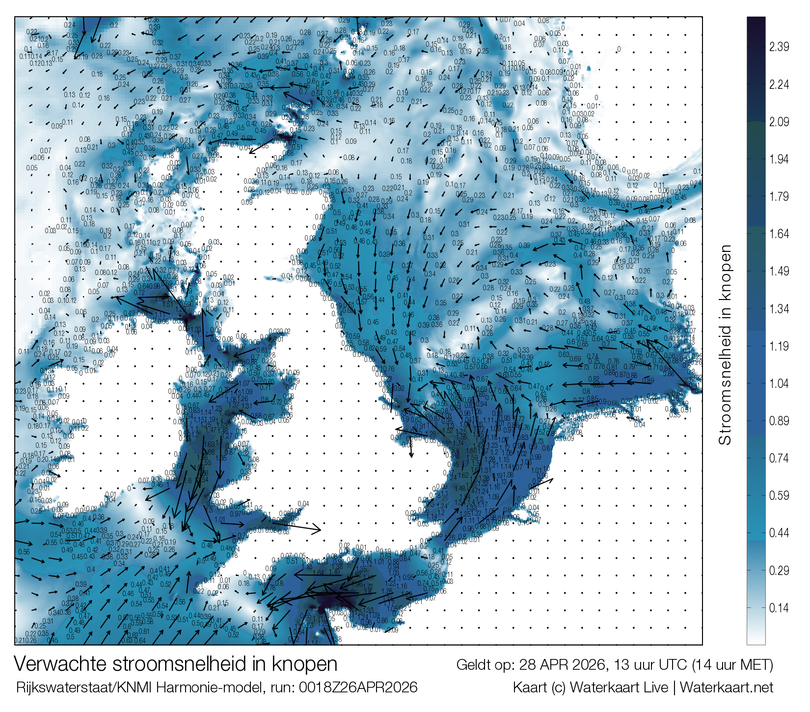 Stroomsnelheden in de Noordzee op basis van de Stroomatlas, verrekend met weersinvloeden. Deze worden iedere dag ververst met data uit het zeestromingen model van Rijkswaterstaat op basis van Harmonie weerdata, voor ieder uur een kaart, tot 48 uur in de toekomst. Lees hieronder meer over dit model