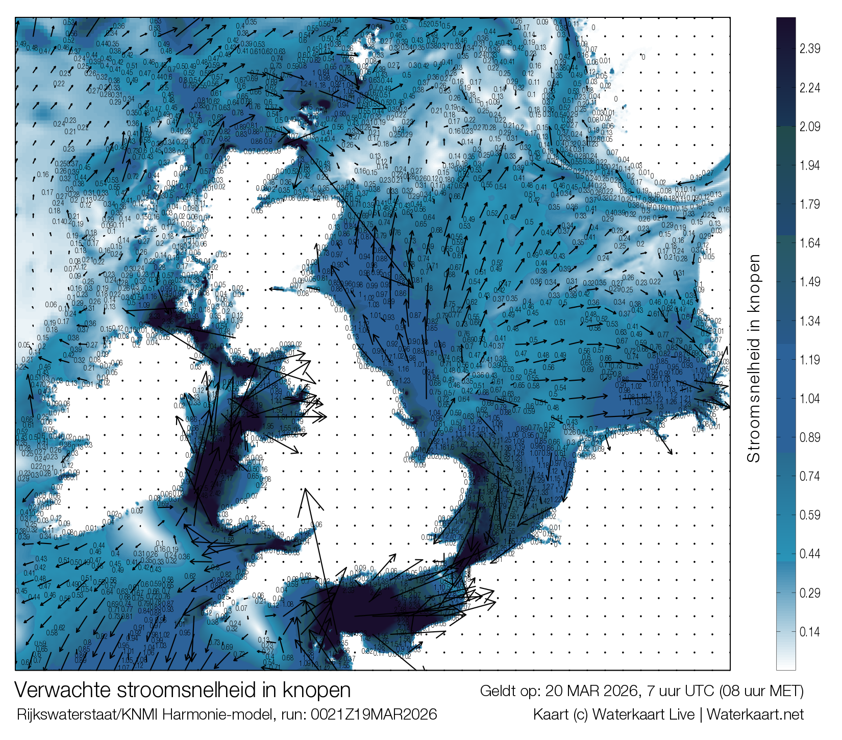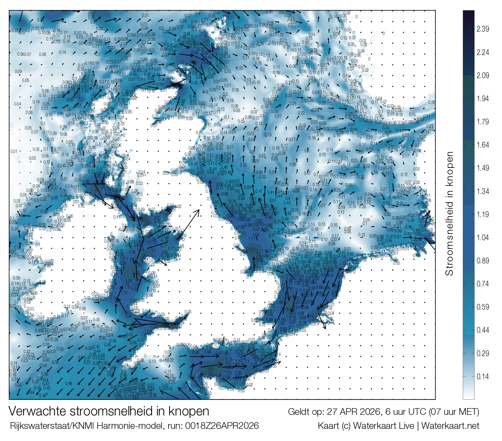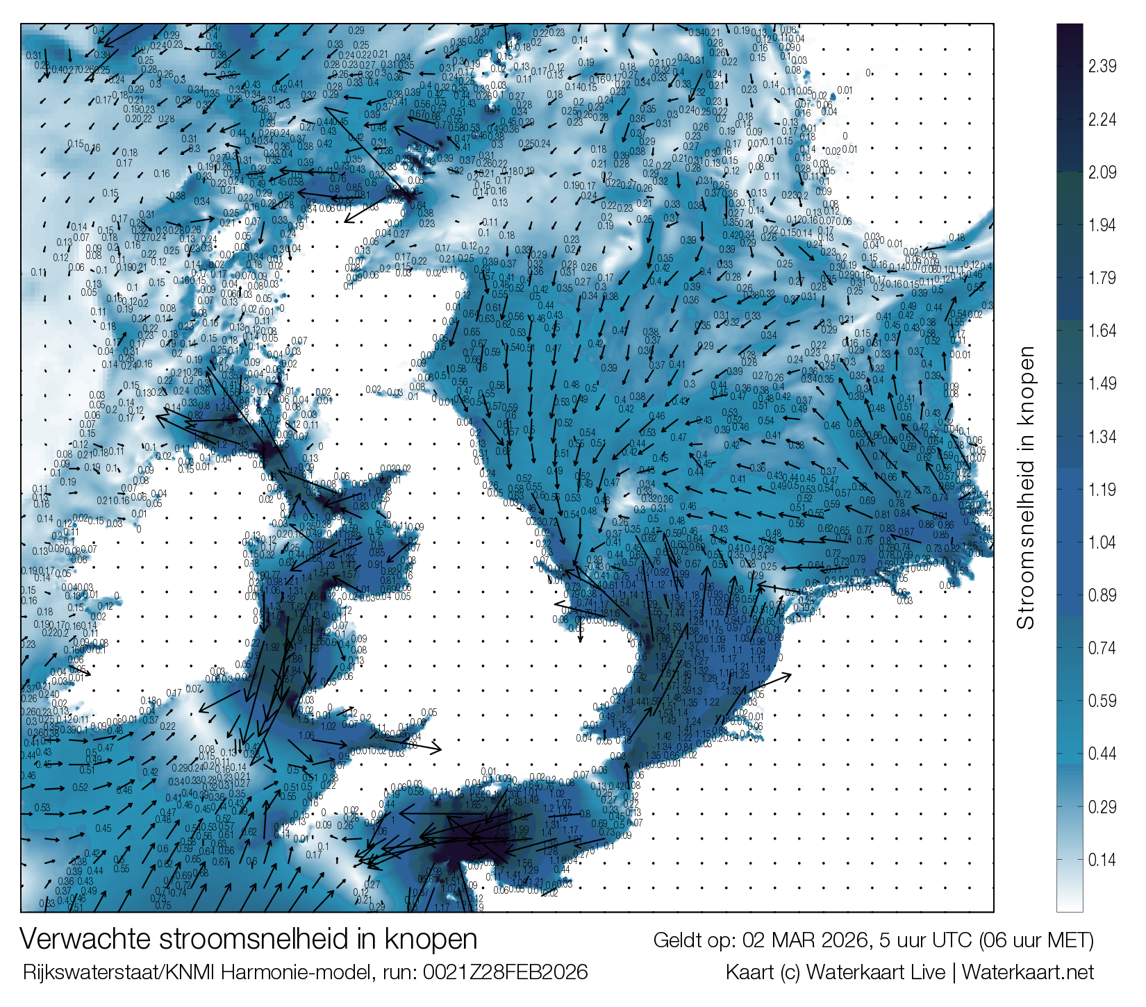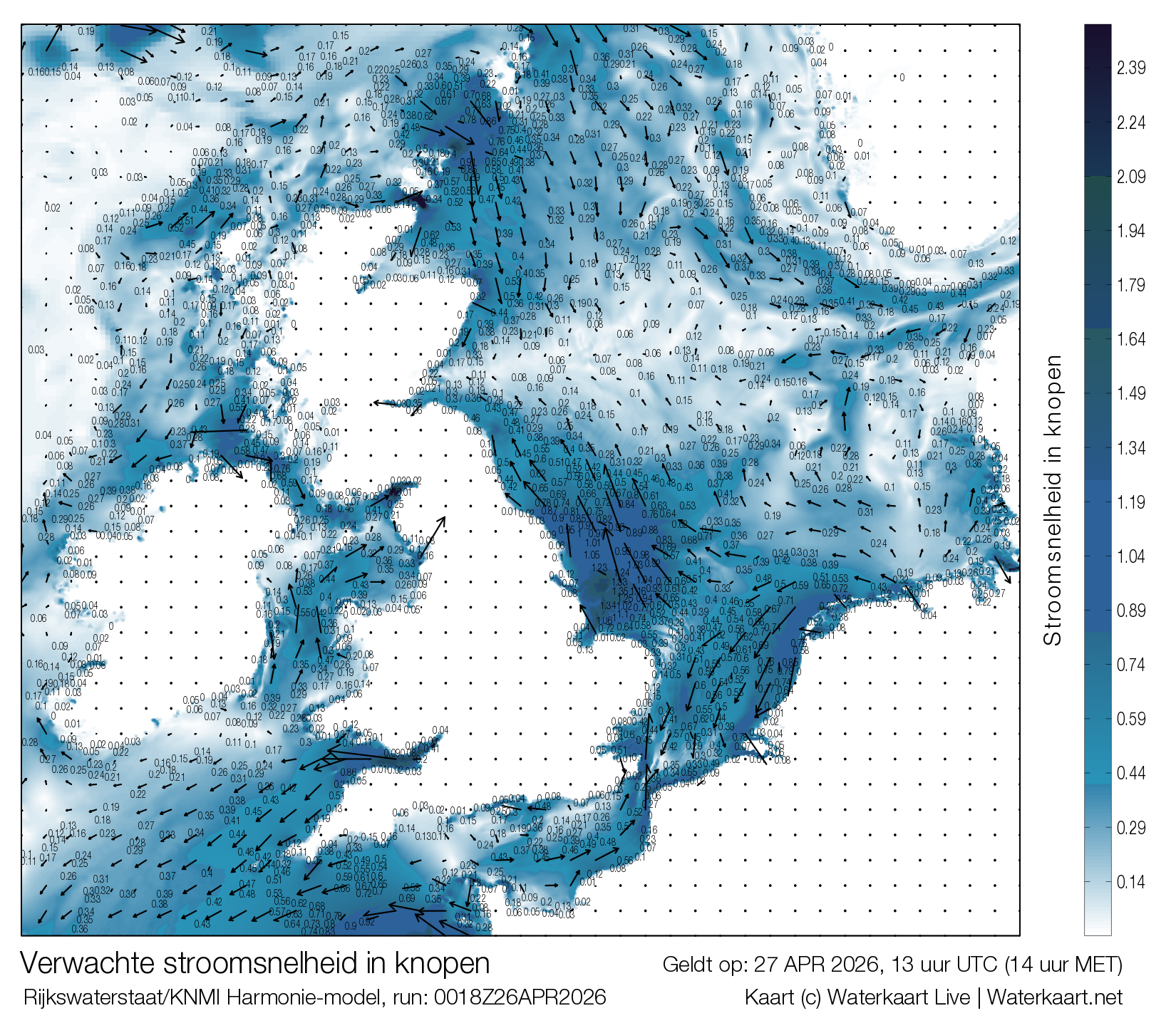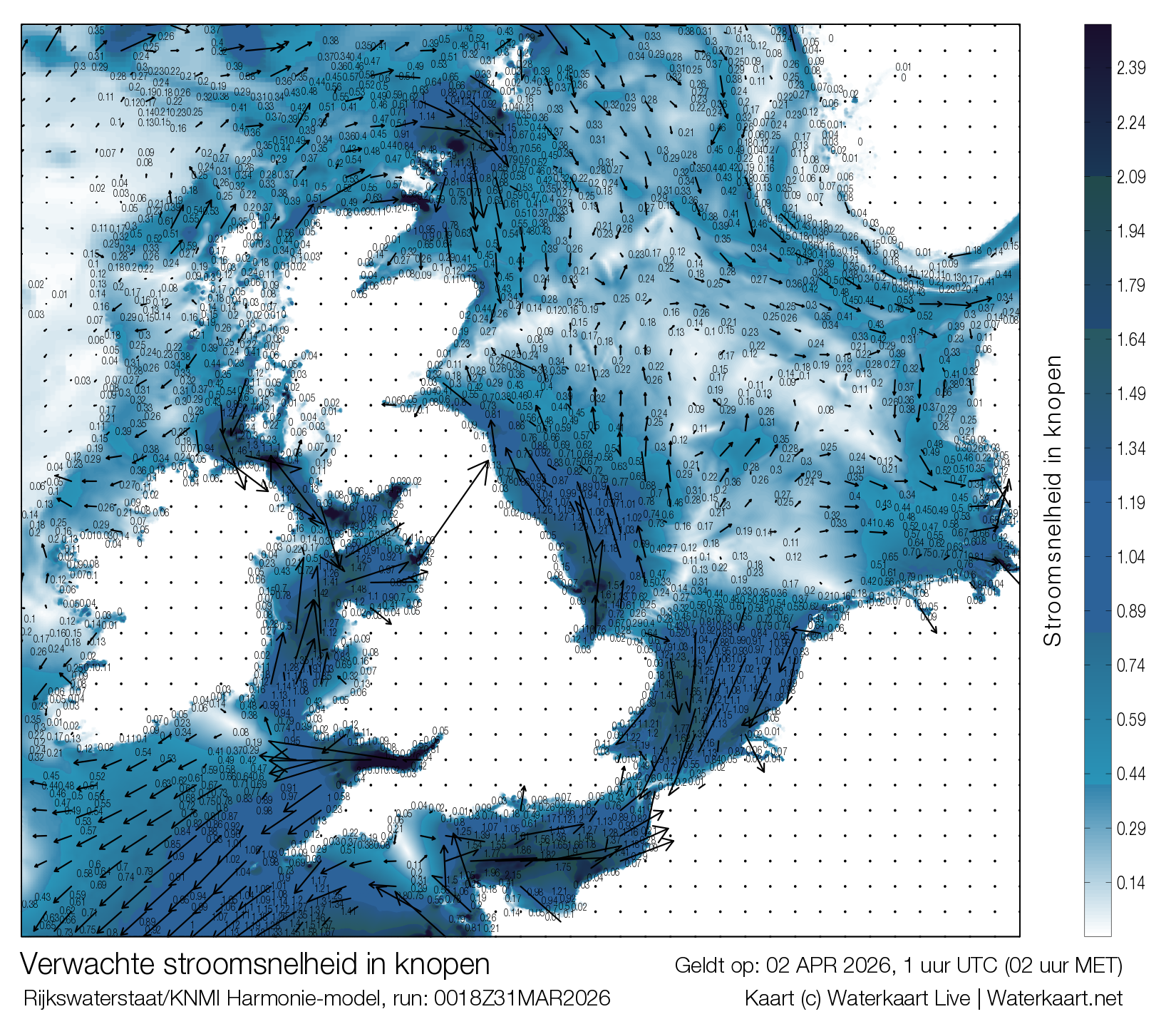 Stroomsnelheden in de Noordzee op basis van de Stroomatlas, verrekend met weersinvloeden. Deze worden iedere dag ververst met data uit het zeestromingen model van Rijkswaterstaat op basis van Harmonie weerdata, voor ieder uur een kaart, tot 48 uur in de toekomst. Lees hieronder meer over dit model