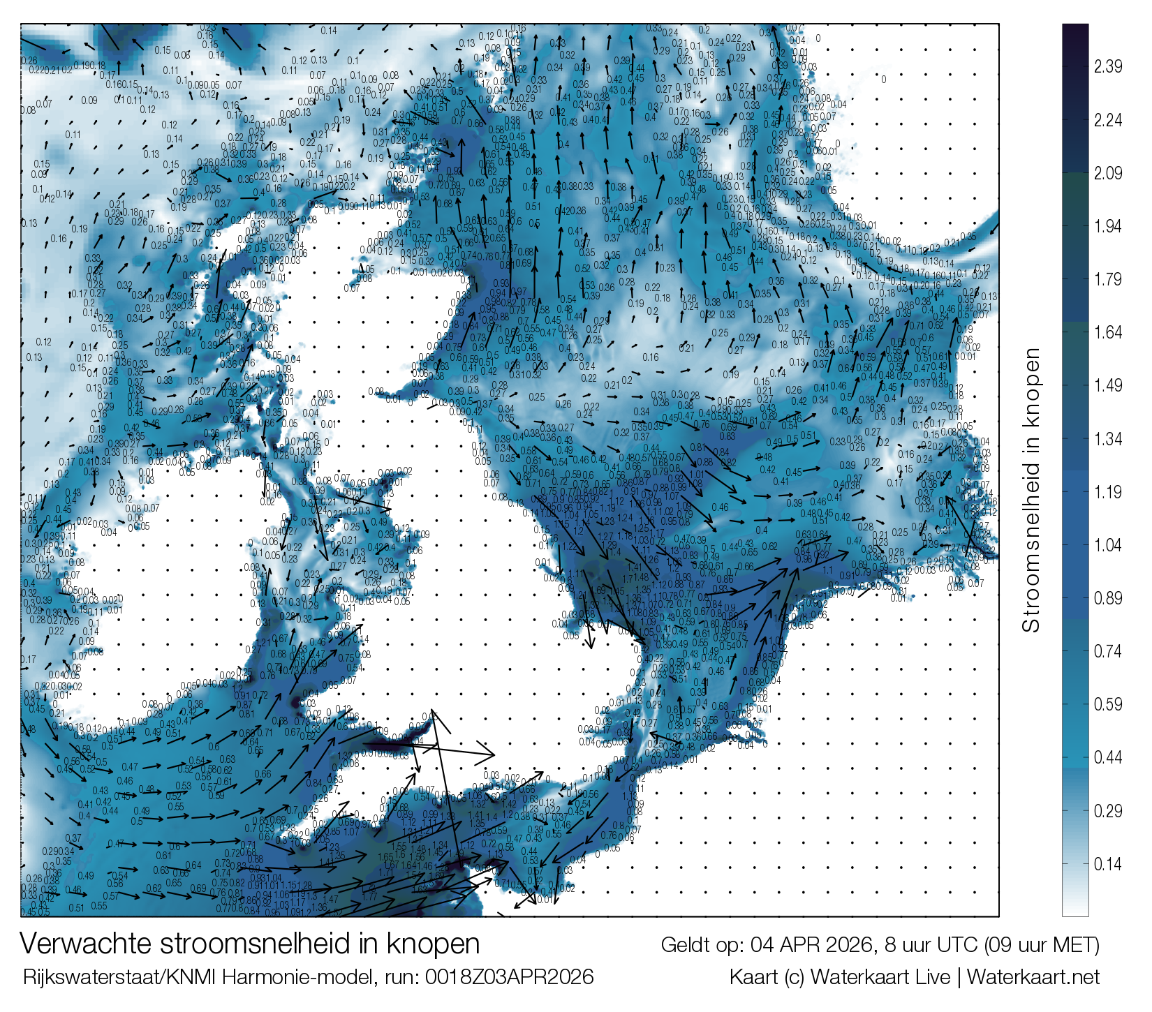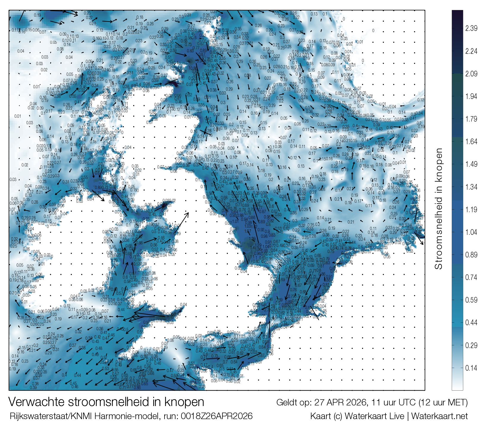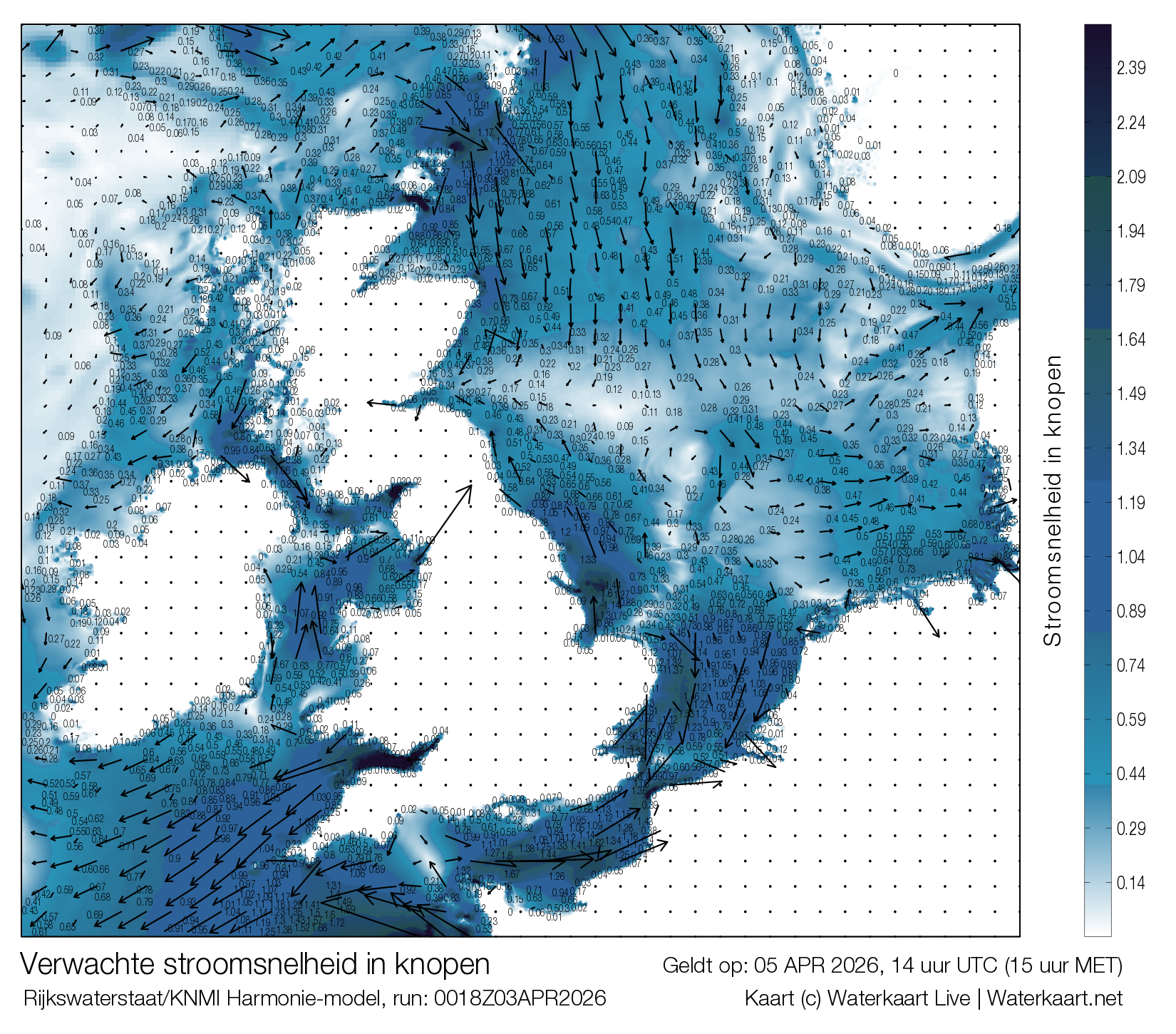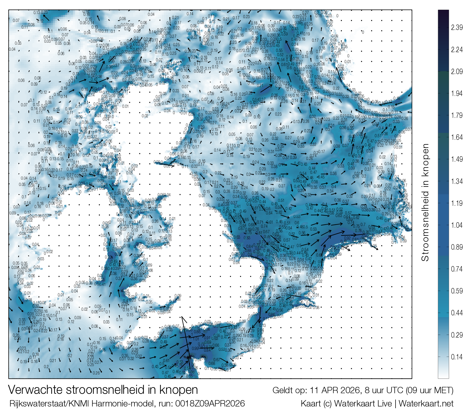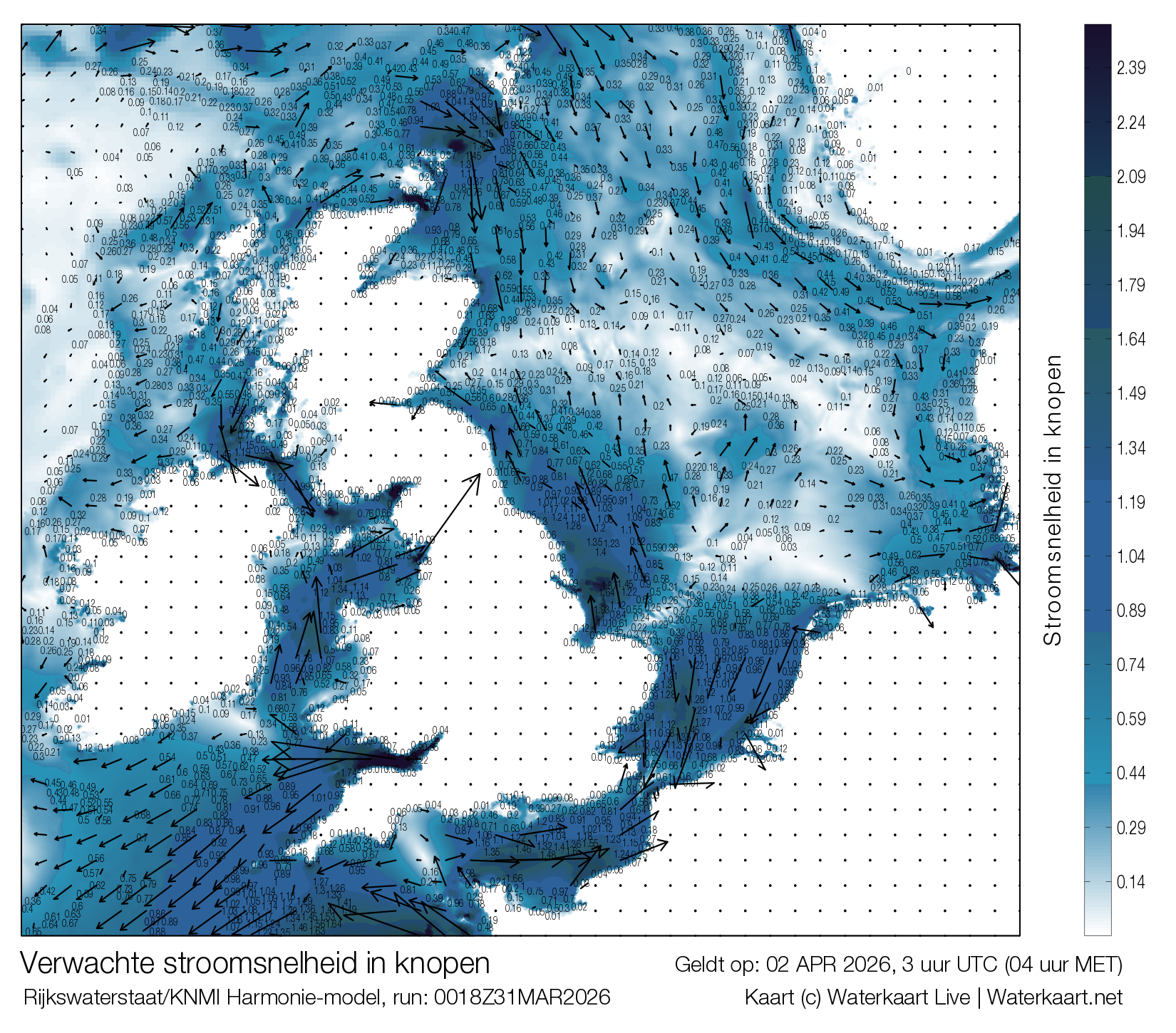 Stroomsnelheden in de Noordzee op basis van de Stroomatlas, verrekend met weersinvloeden. Deze worden iedere dag ververst met data uit het zeestromingen model van Rijkswaterstaat op basis van Harmonie weerdata, voor ieder uur een kaart, tot 48 uur in de toekomst. Lees hieronder meer over dit model