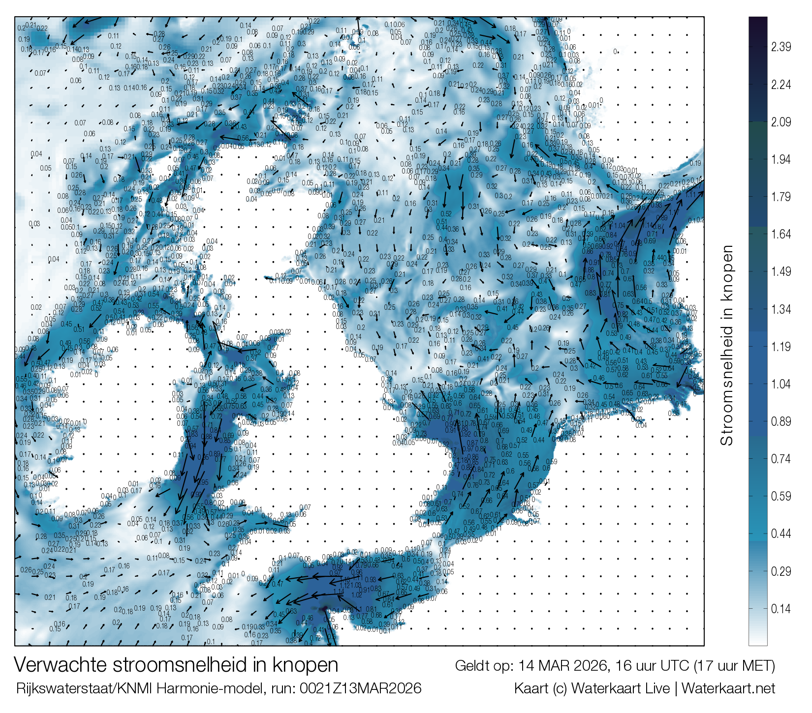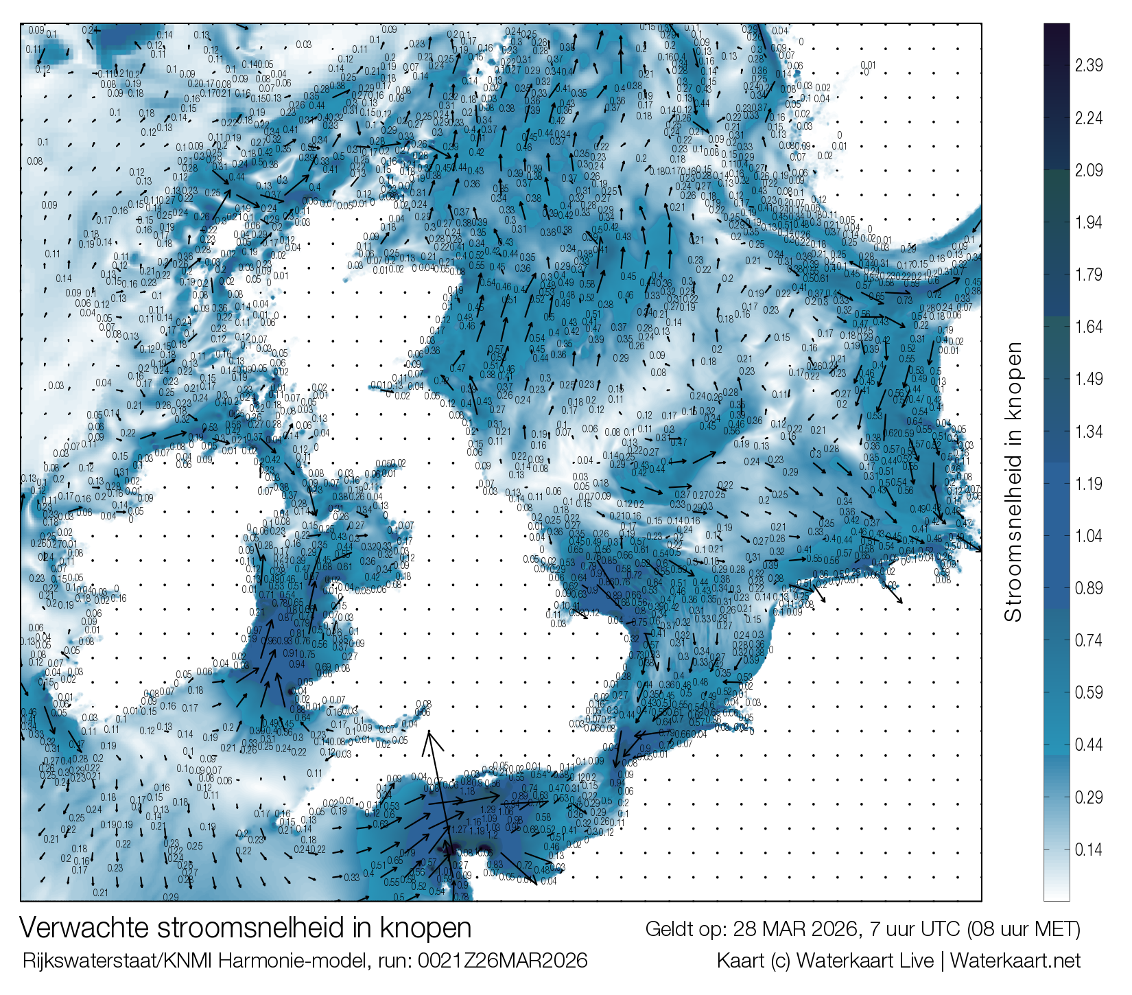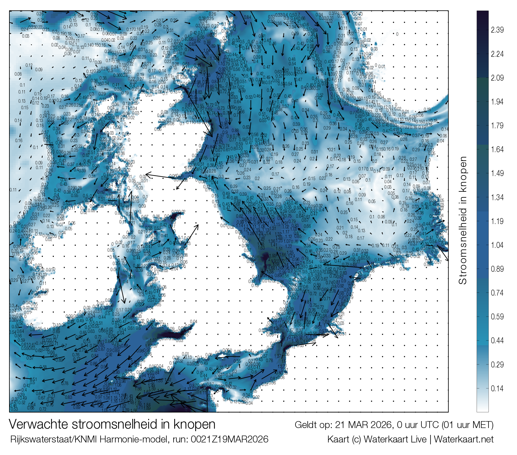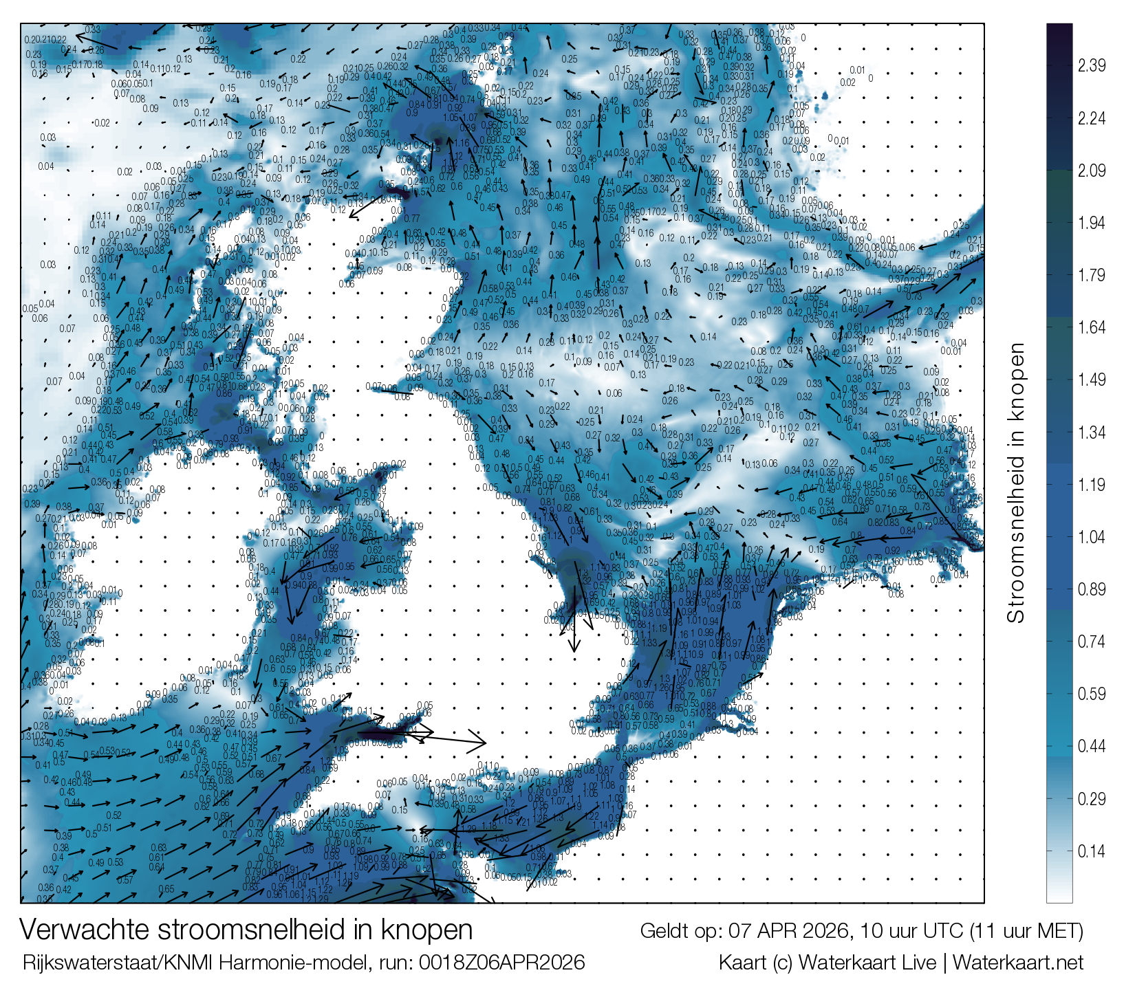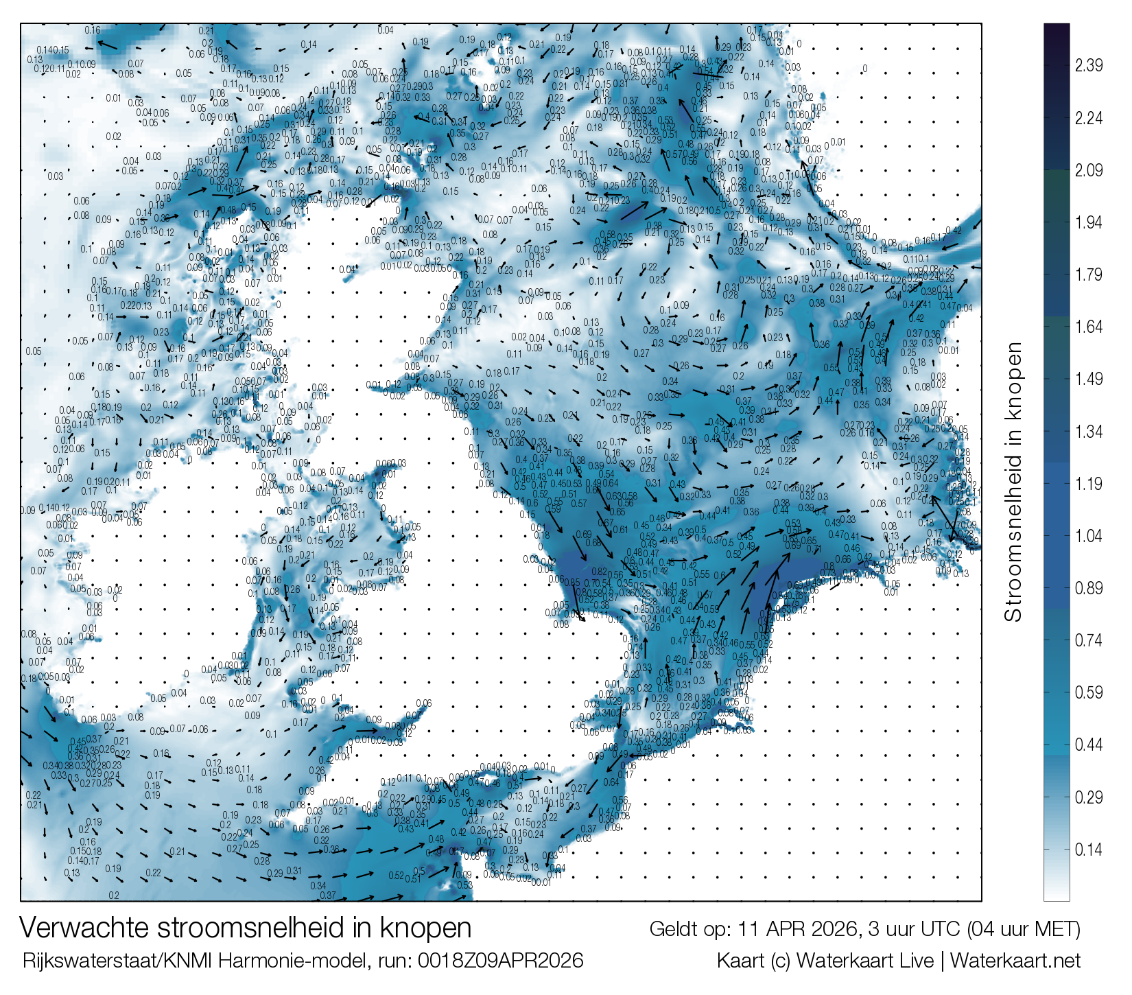 Stroomsnelheden in de Noordzee op basis van de Stroomatlas, verrekend met weersinvloeden. Deze worden iedere dag ververst met data uit het zeestromingen model van Rijkswaterstaat op basis van Harmonie weerdata, voor ieder uur een kaart, tot 48 uur in de toekomst. Lees hieronder meer over dit model