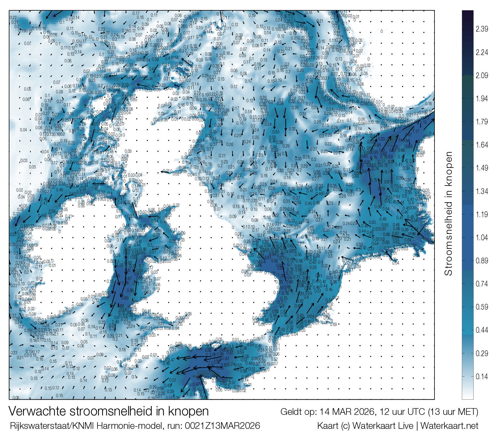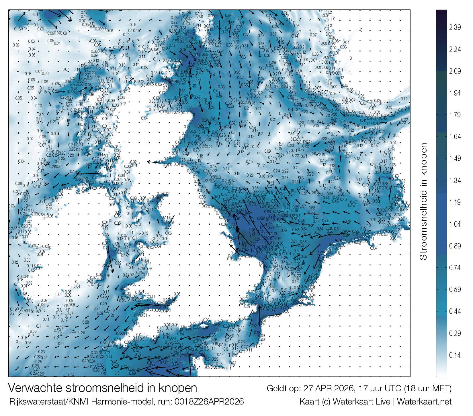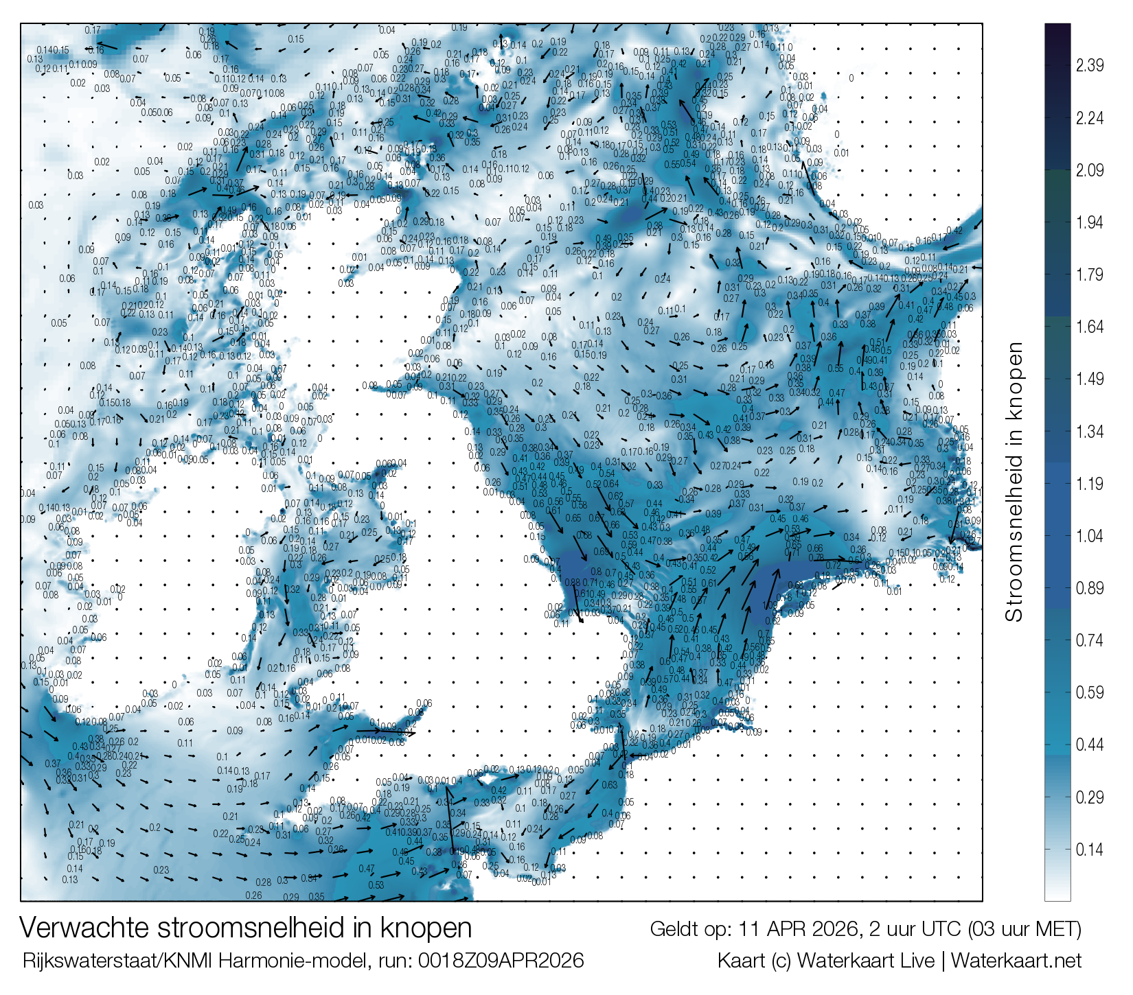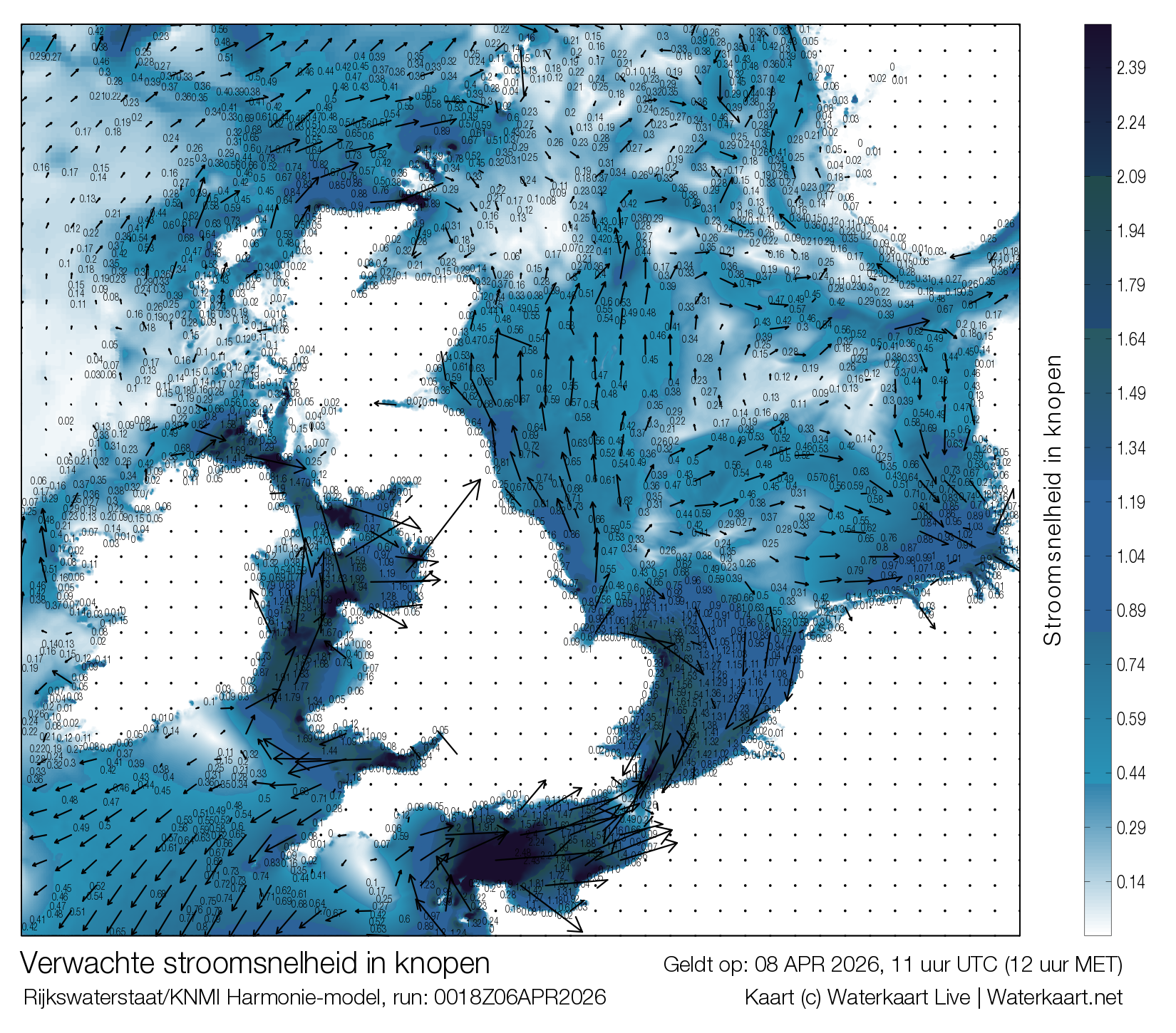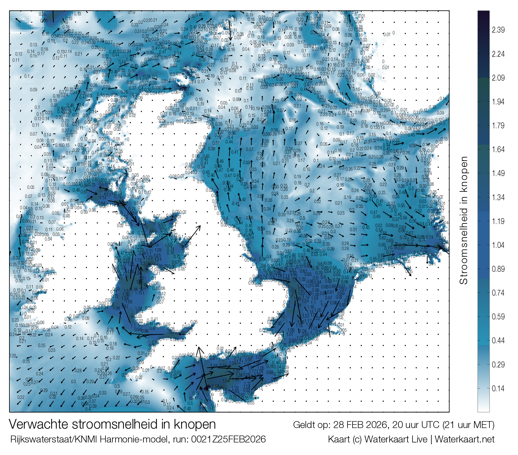 Stroomsnelheden in de Noordzee op basis van de Stroomatlas, verrekend met weersinvloeden. Deze worden iedere dag ververst met data uit het zeestromingen model van Rijkswaterstaat op basis van Harmonie weerdata, voor ieder uur een kaart, tot 48 uur in de toekomst. Lees hieronder meer over dit model