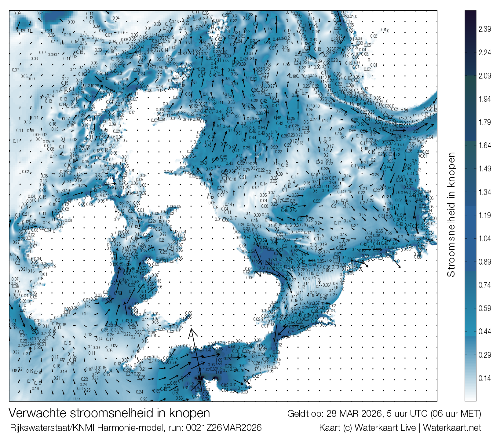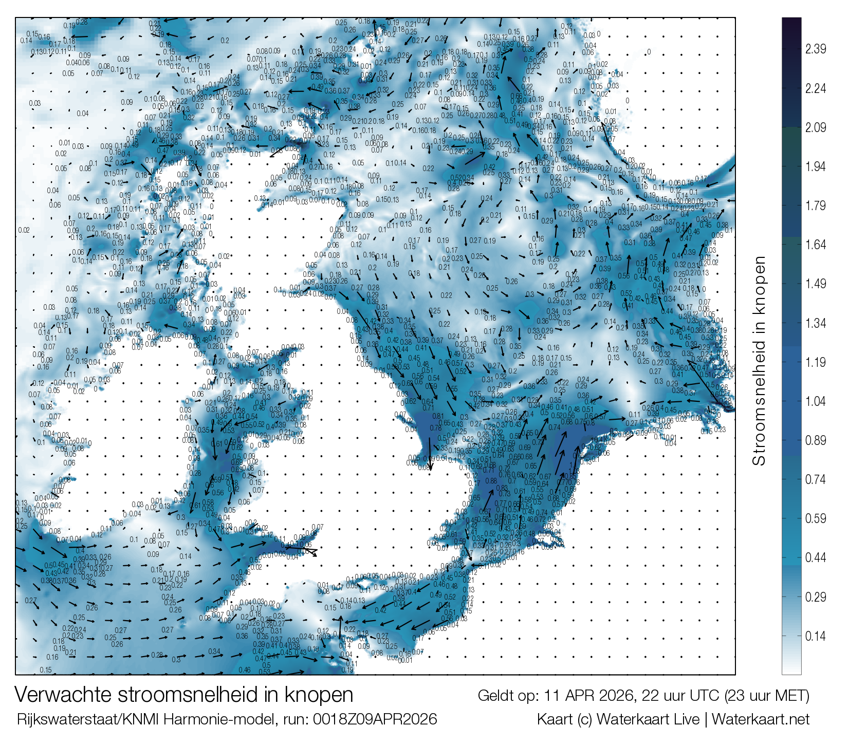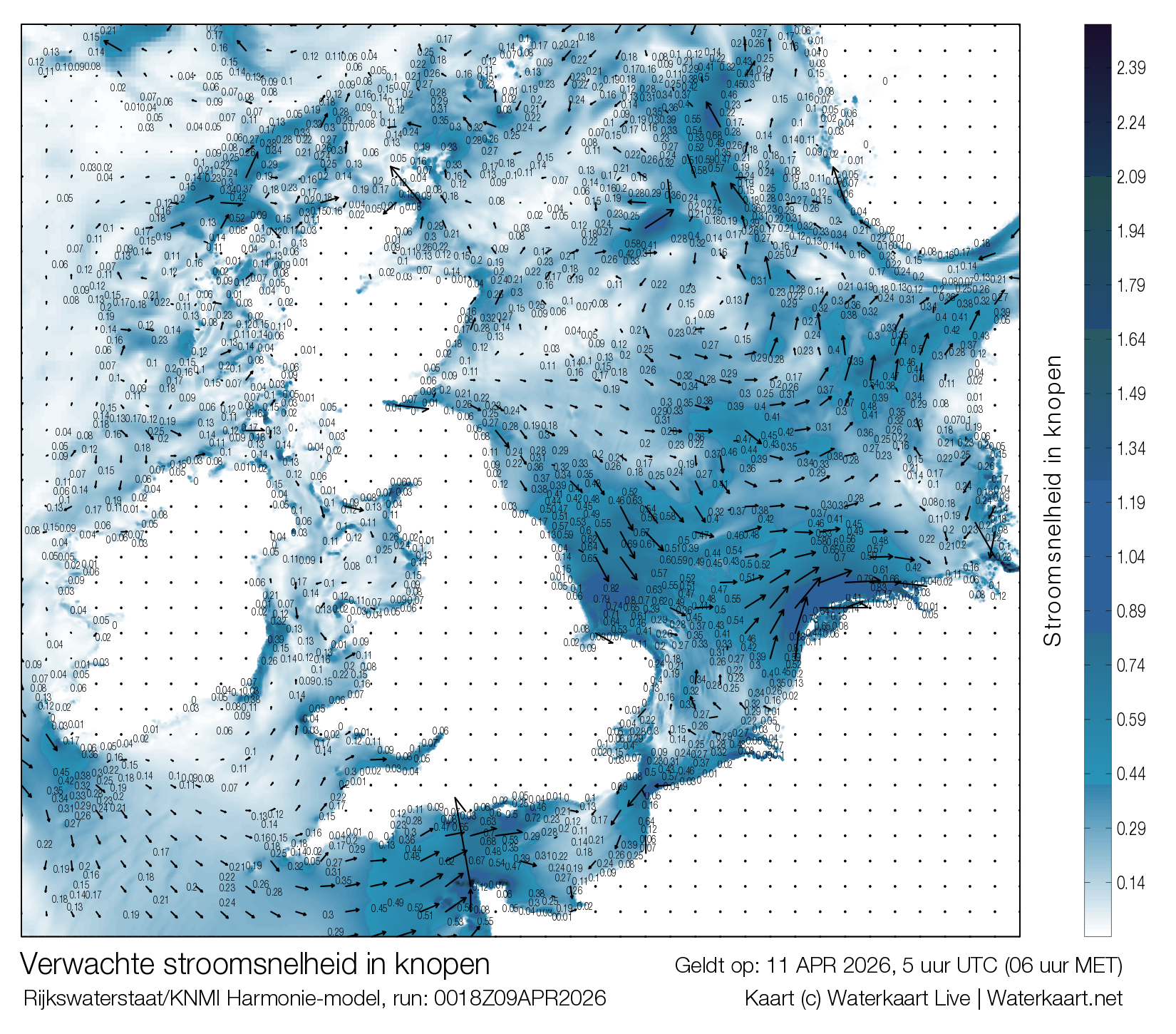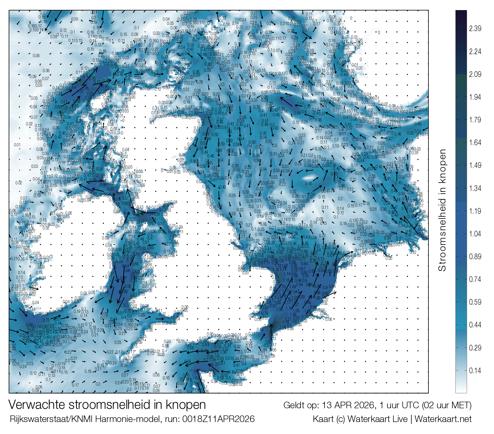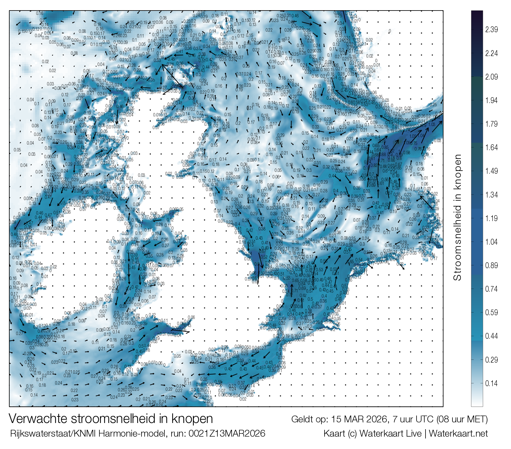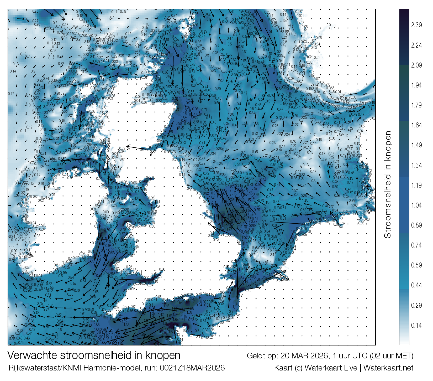 Stroomsnelheden in de Noordzee op basis van de Stroomatlas, verrekend met weersinvloeden. Deze worden iedere dag ververst met data uit het zeestromingen model van Rijkswaterstaat op basis van Harmonie weerdata, voor ieder uur een kaart, tot 48 uur in de toekomst. Lees hieronder meer over dit model