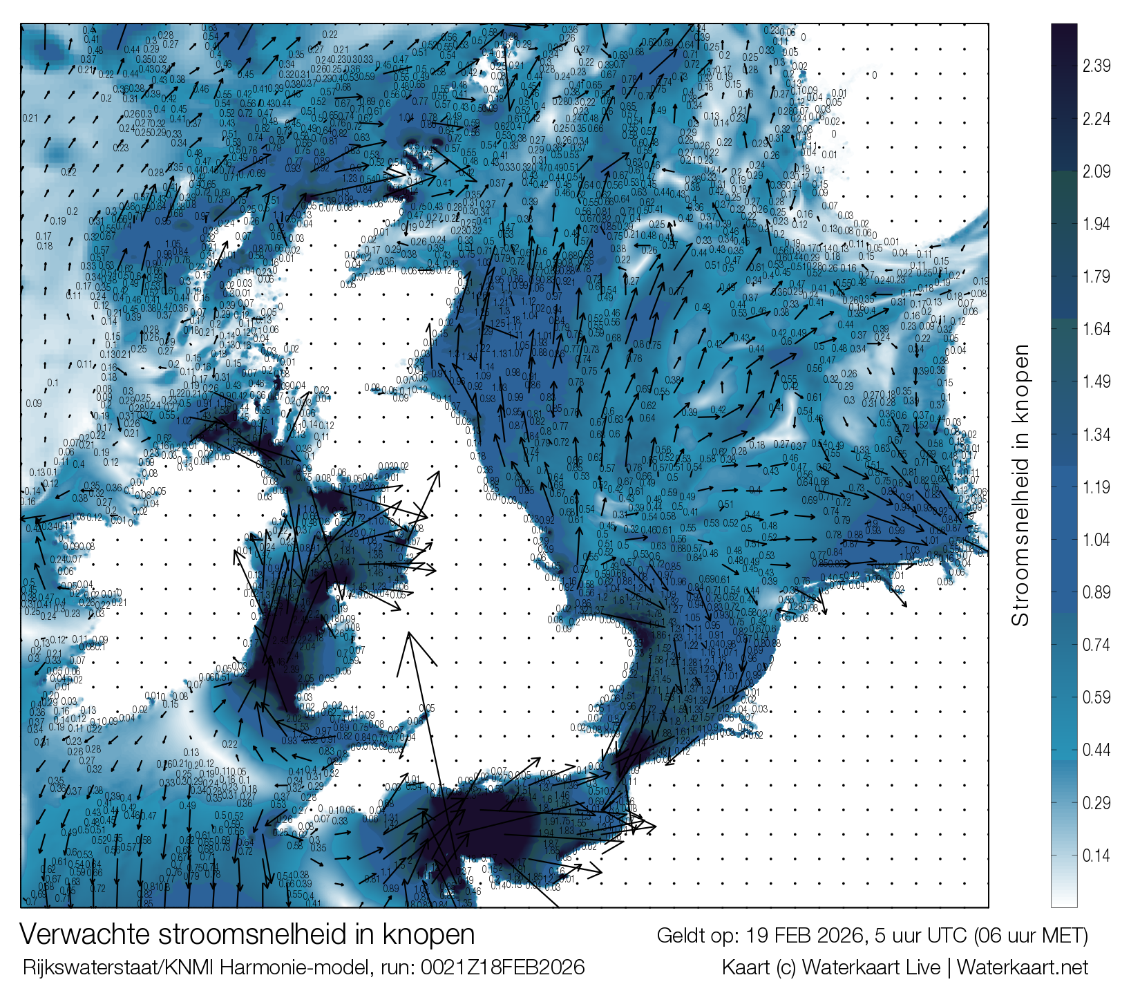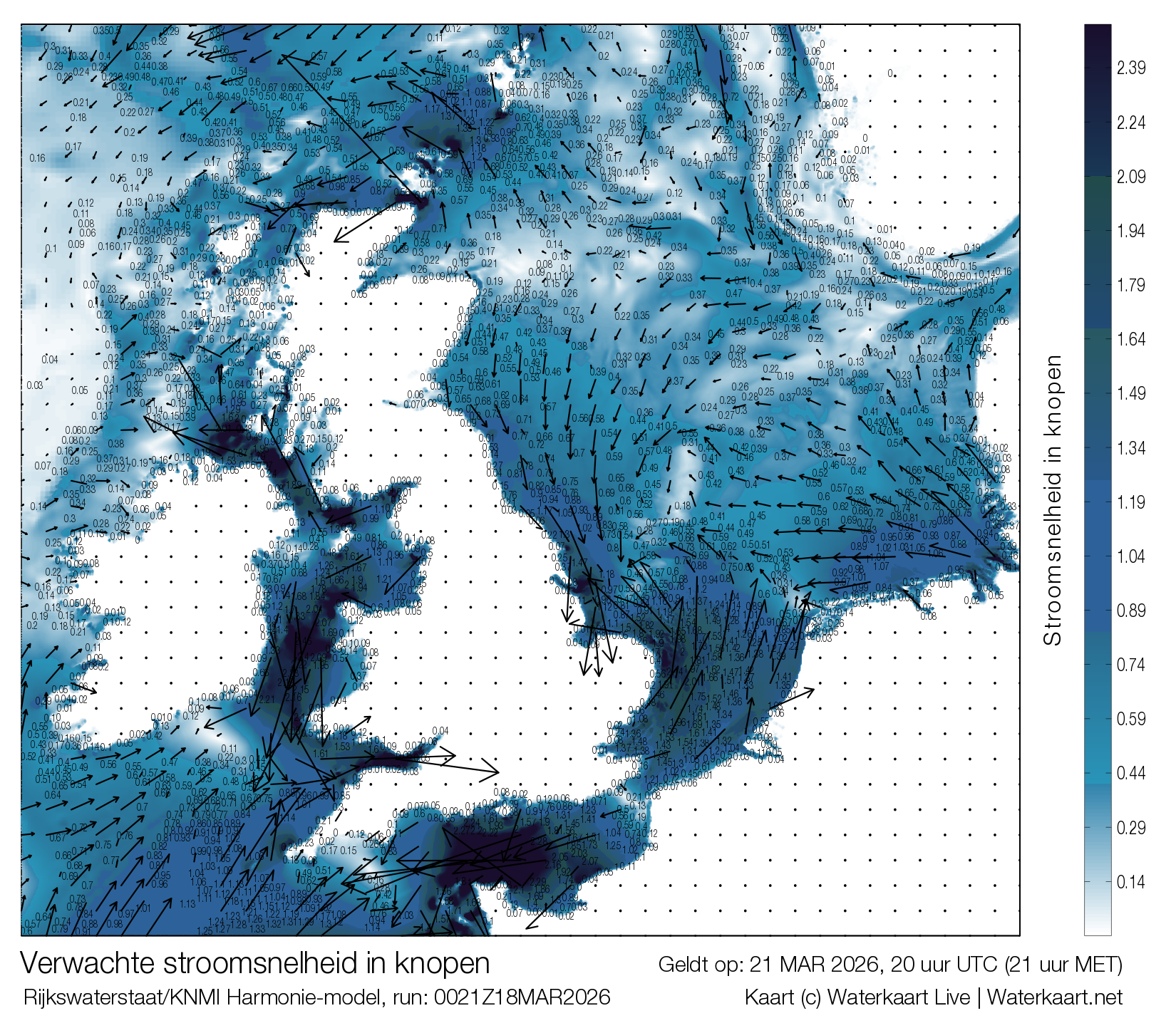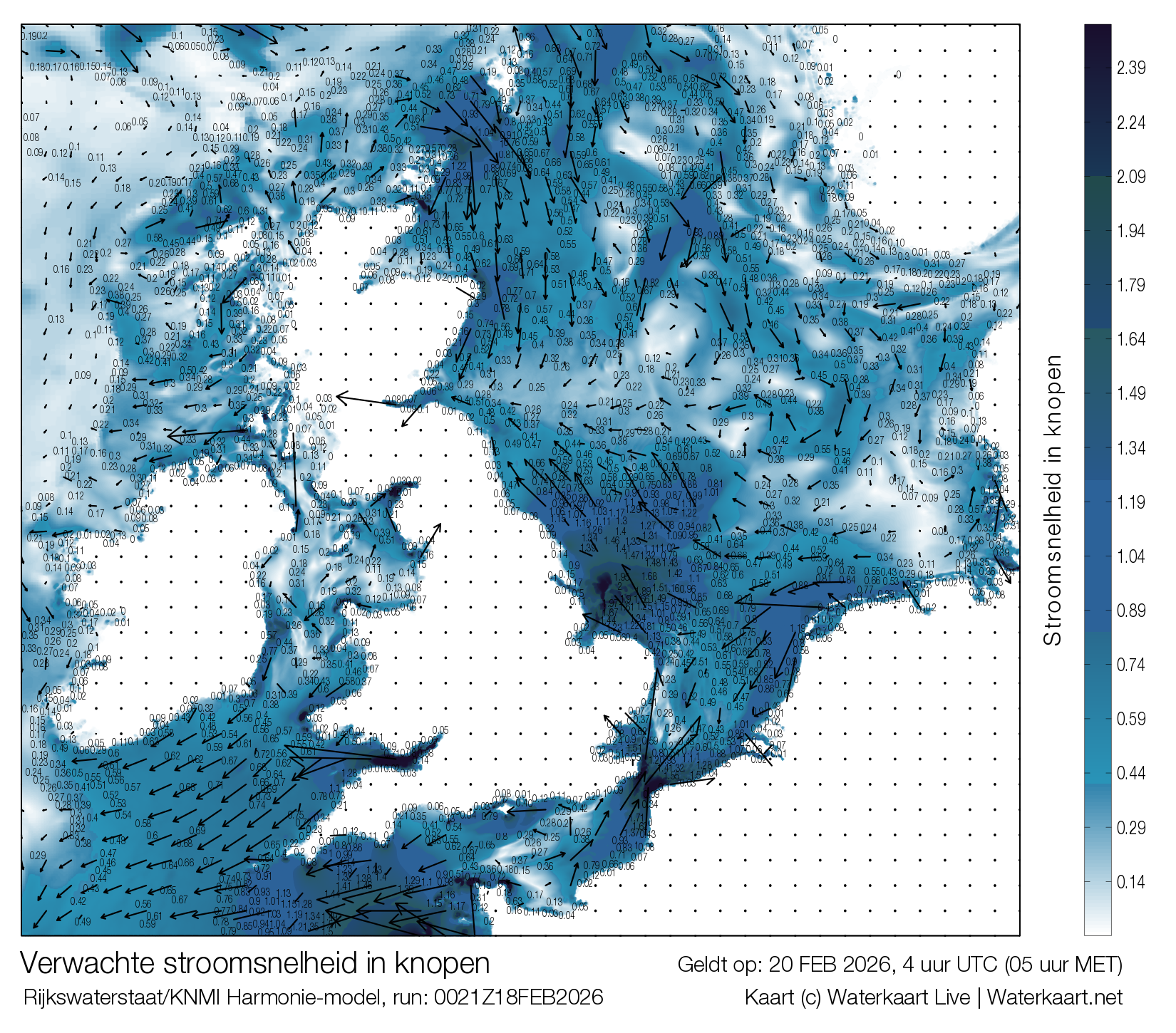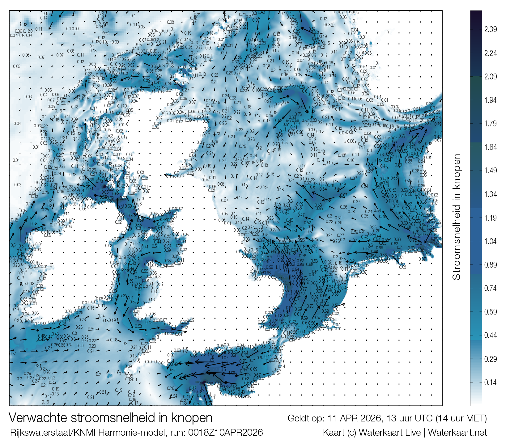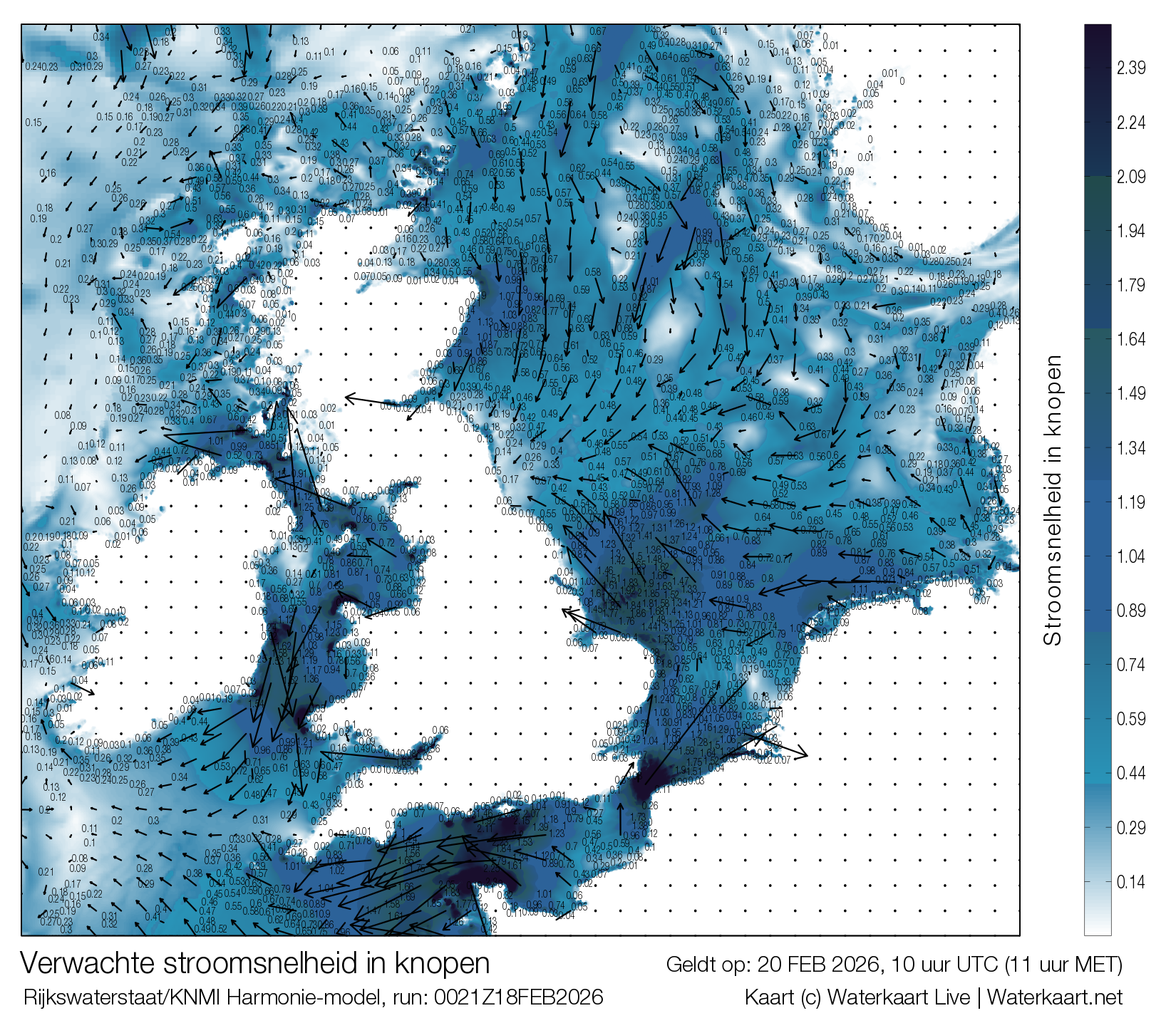 Stroomsnelheden in de Noordzee op basis van de Stroomatlas, verrekend met weersinvloeden. Deze worden iedere dag ververst met data uit het zeestromingen model van Rijkswaterstaat op basis van Harmonie weerdata, voor ieder uur een kaart, tot 48 uur in de toekomst. Lees hieronder meer over dit model