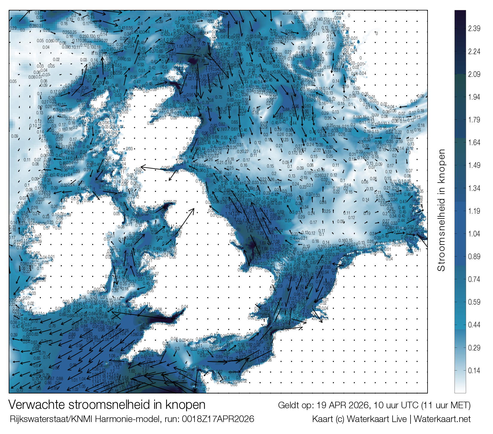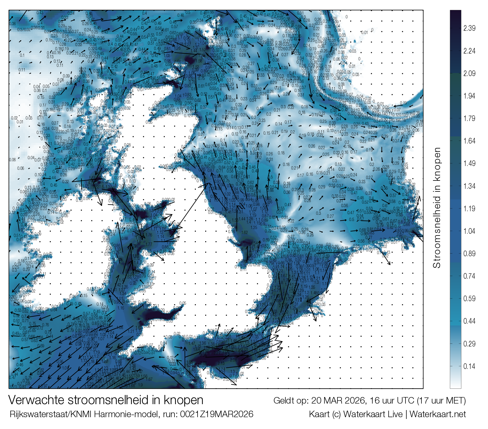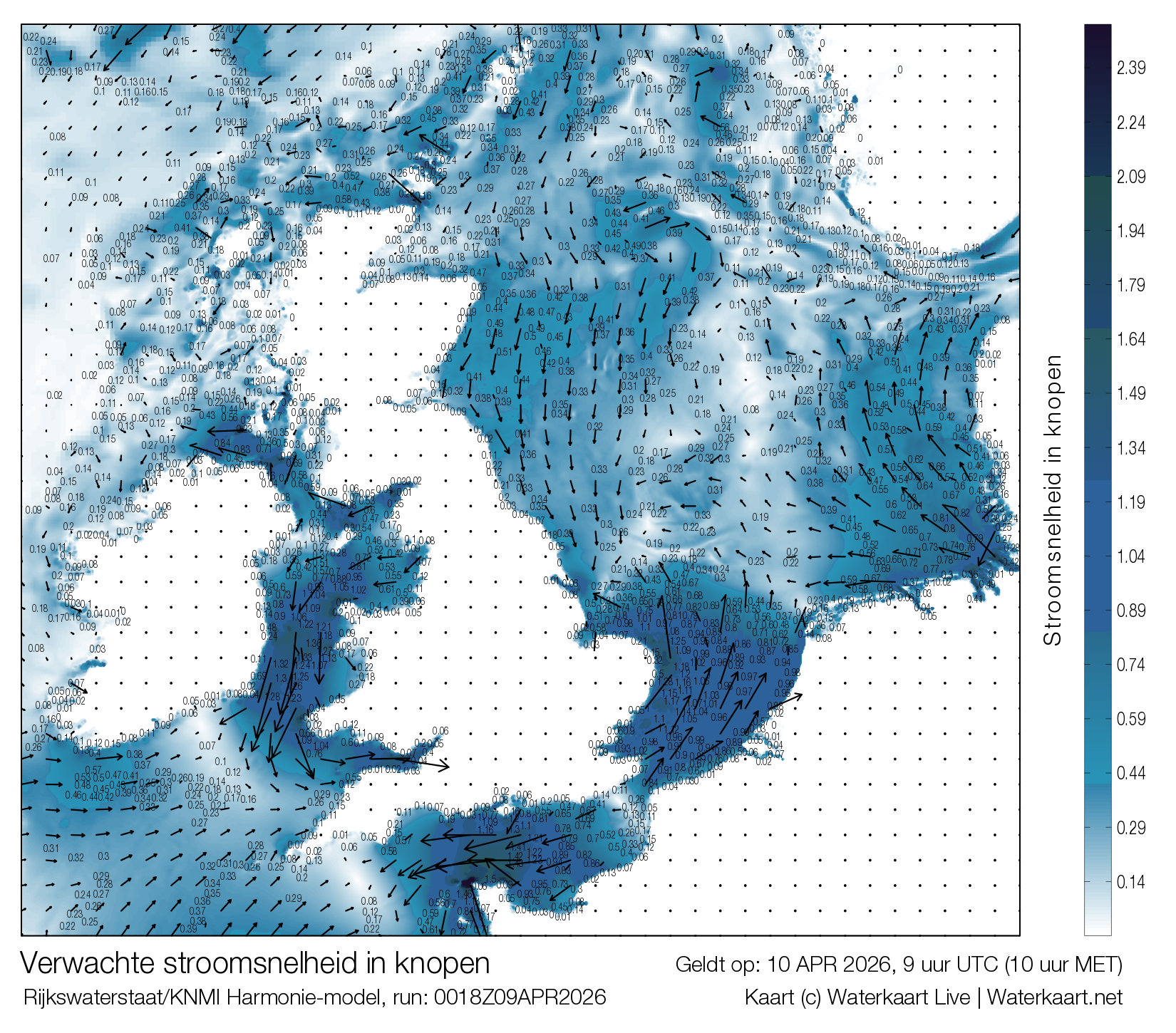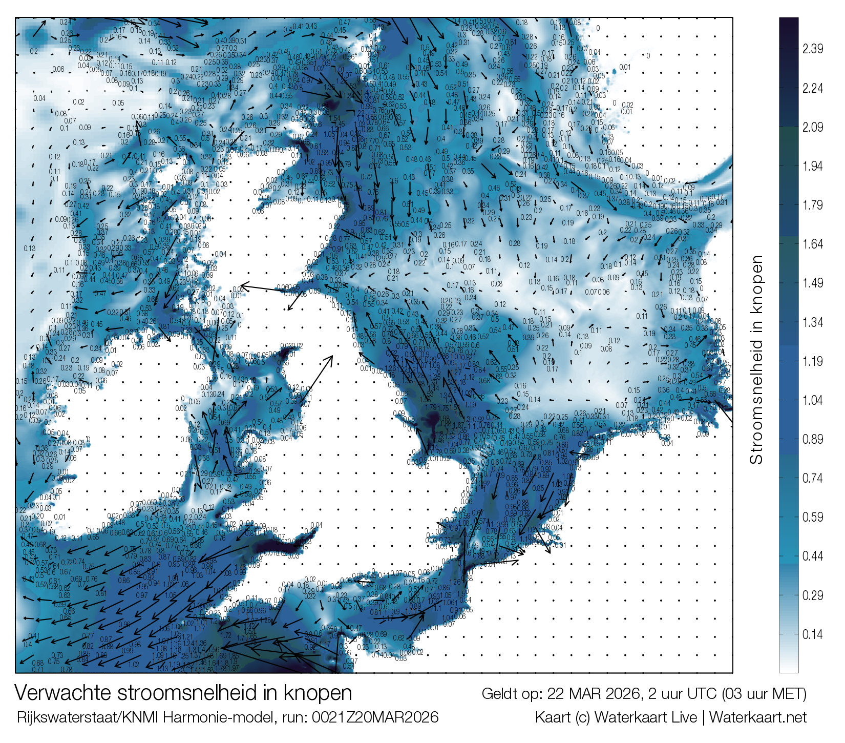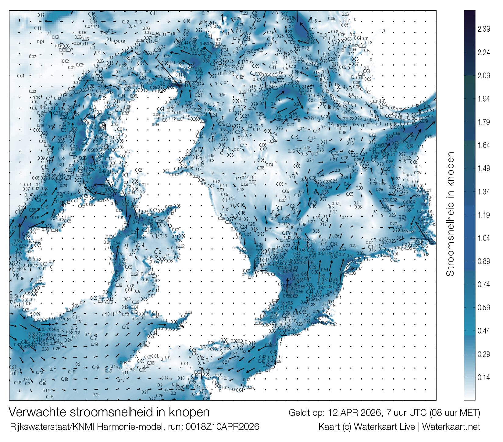 Stroomsnelheden in de Noordzee op basis van de Stroomatlas, verrekend met weersinvloeden. Deze worden iedere dag ververst met data uit het zeestromingen model van Rijkswaterstaat op basis van Harmonie weerdata, voor ieder uur een kaart, tot 48 uur in de toekomst. Lees hieronder meer over dit model