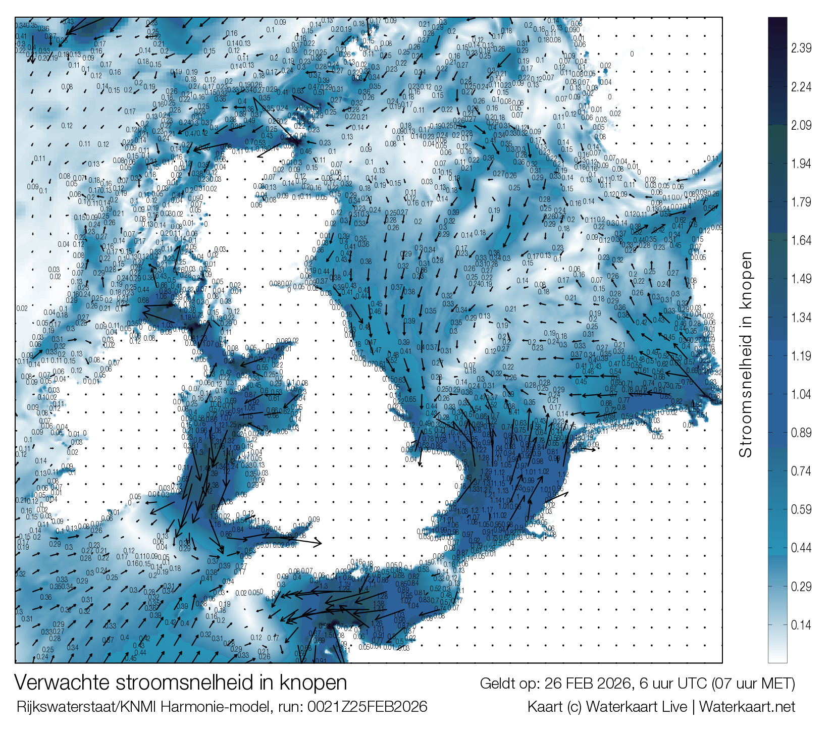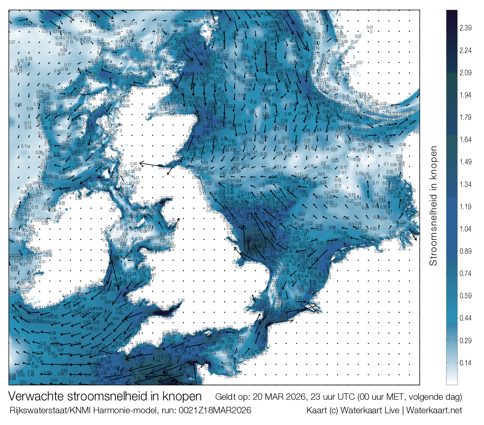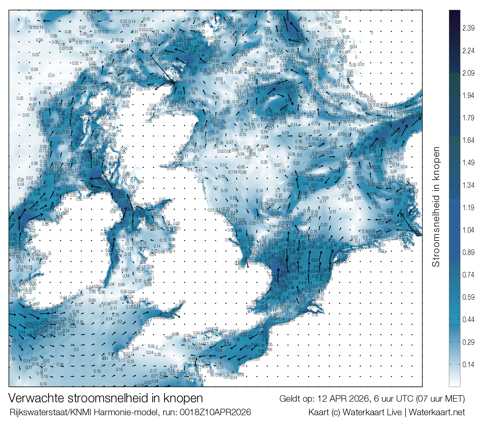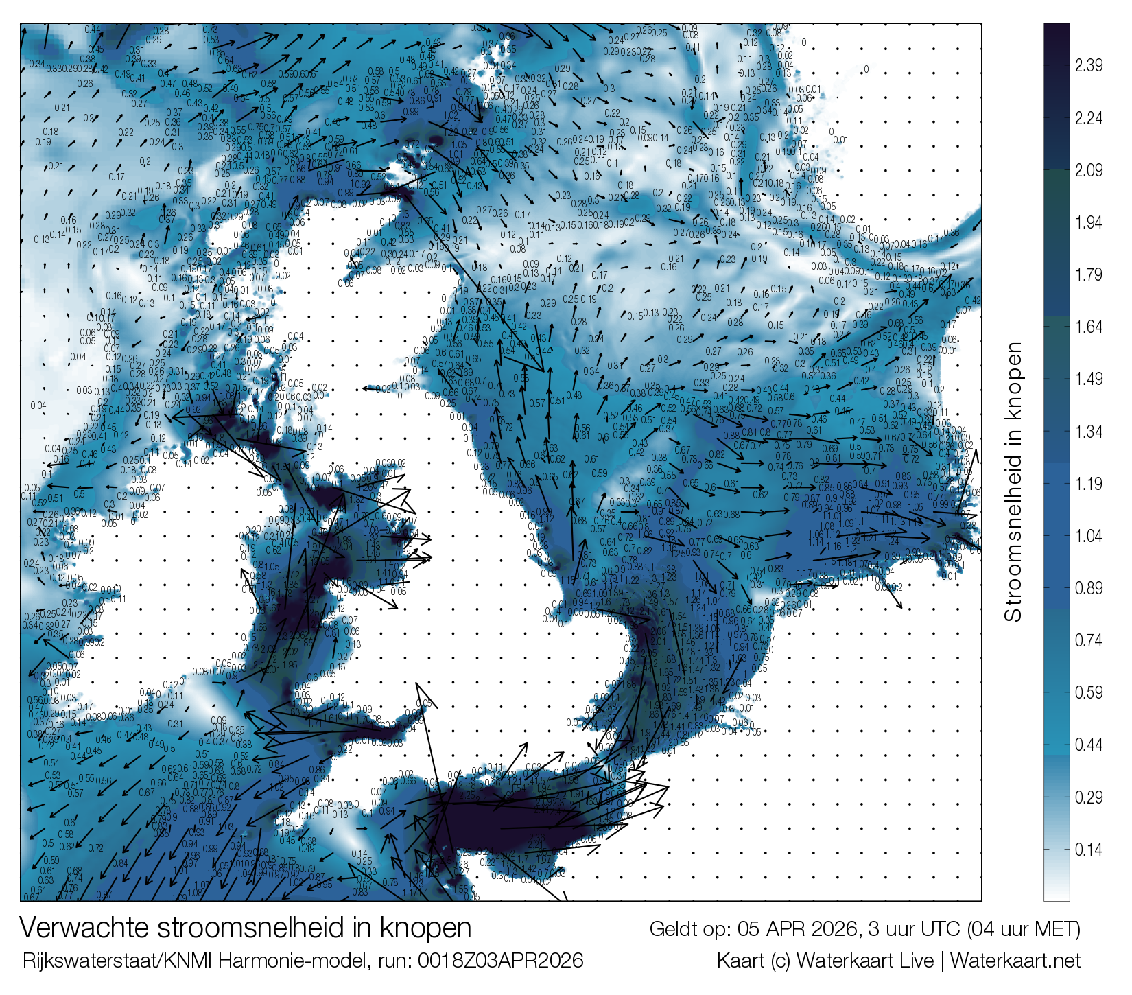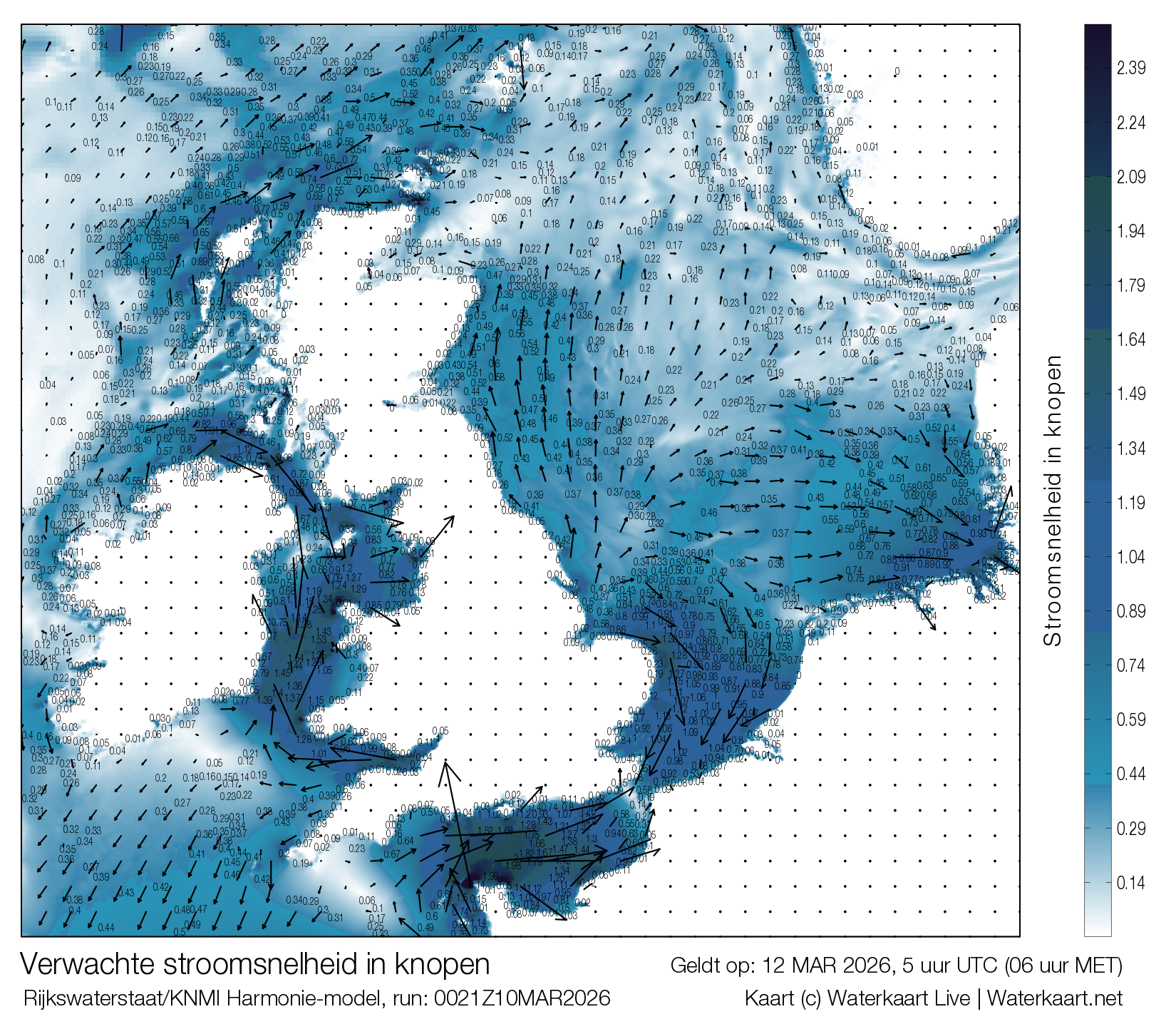 Stroomsnelheden in de Noordzee op basis van de Stroomatlas, verrekend met weersinvloeden. Deze worden iedere dag ververst met data uit het zeestromingen model van Rijkswaterstaat op basis van Harmonie weerdata, voor ieder uur een kaart, tot 48 uur in de toekomst. Lees hieronder meer over dit model