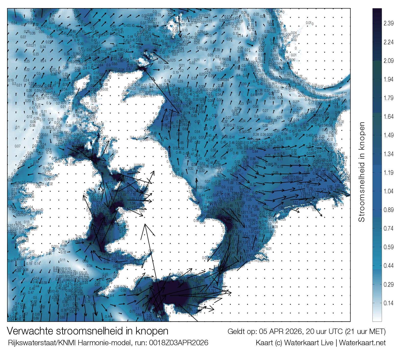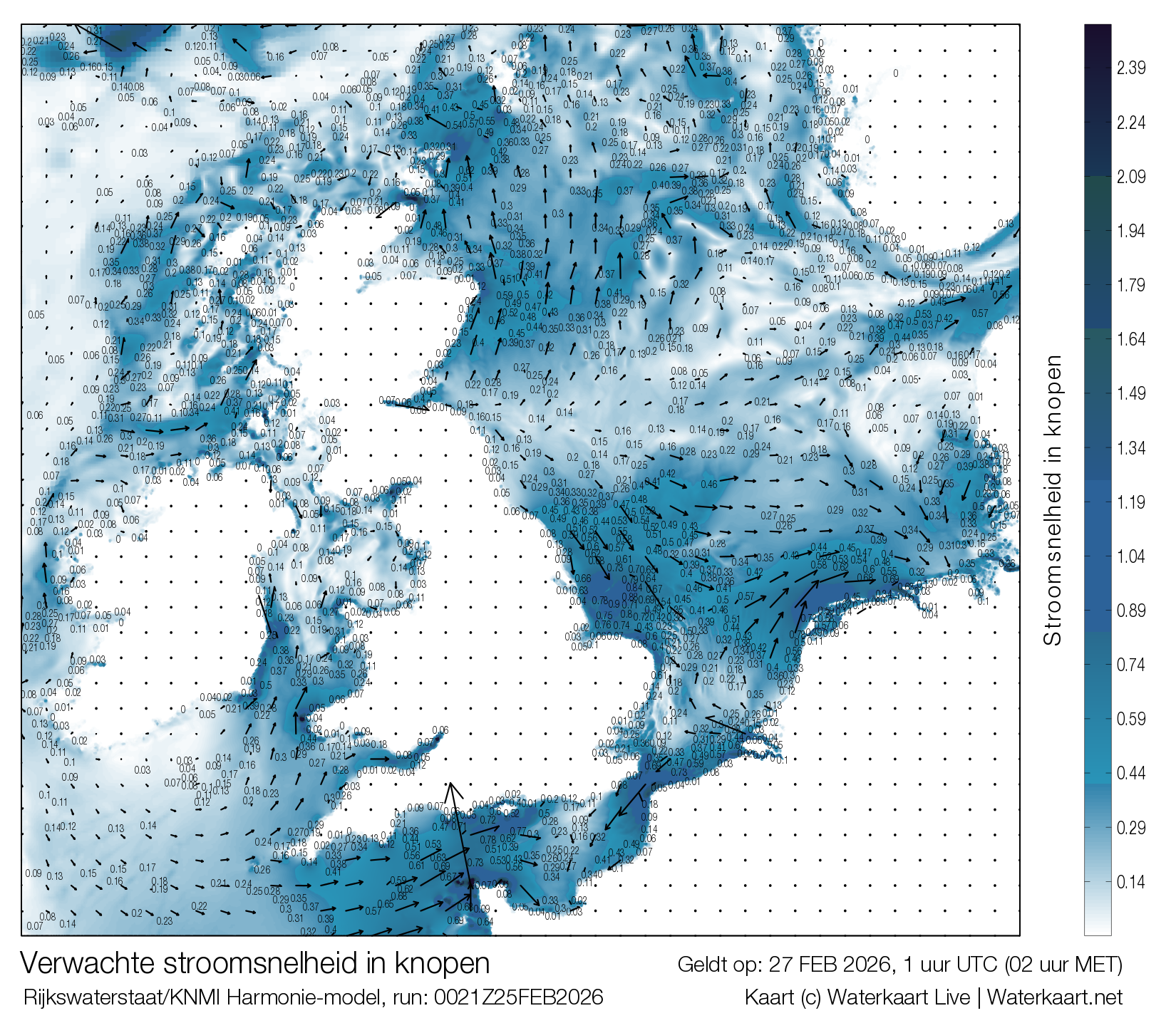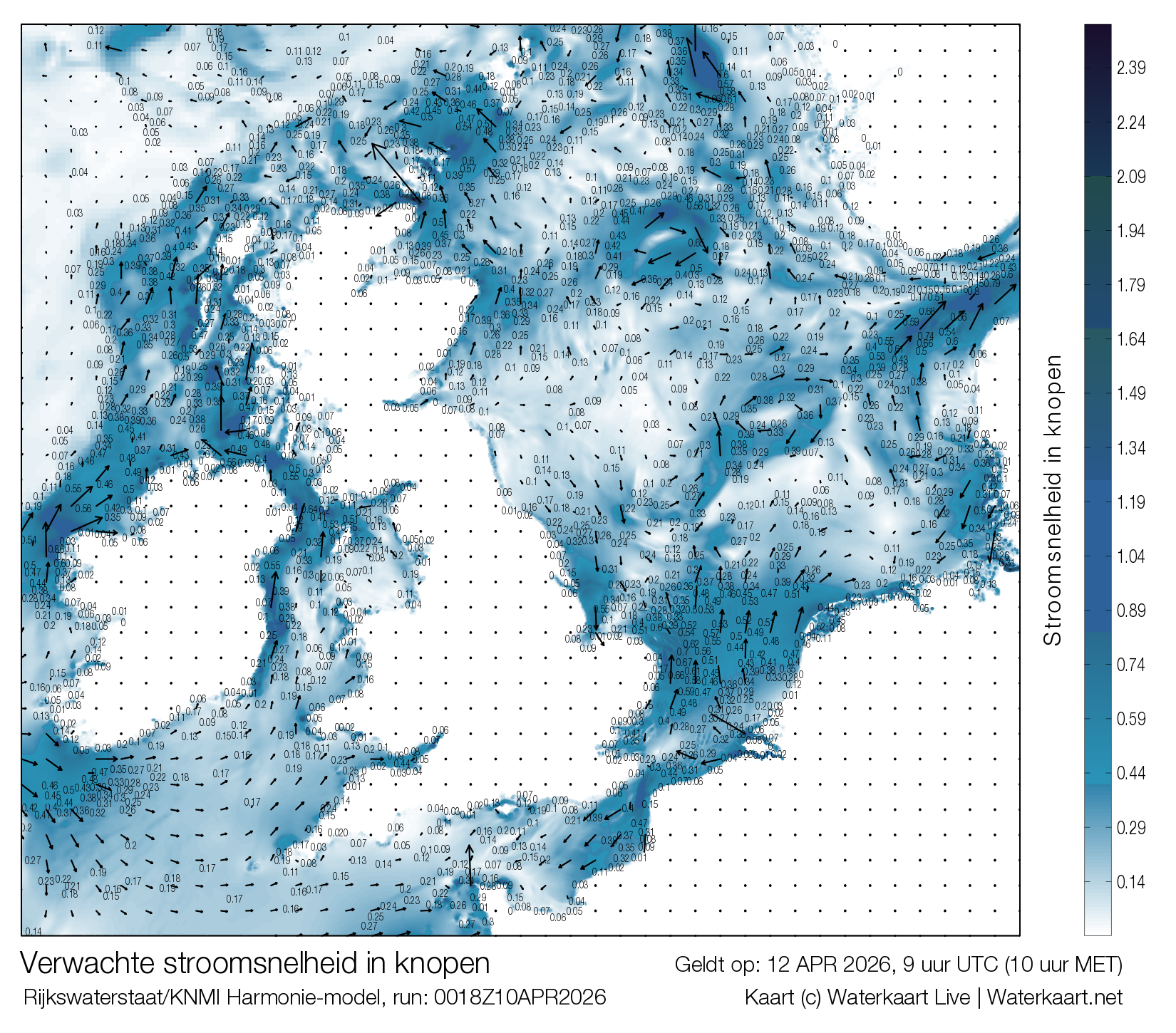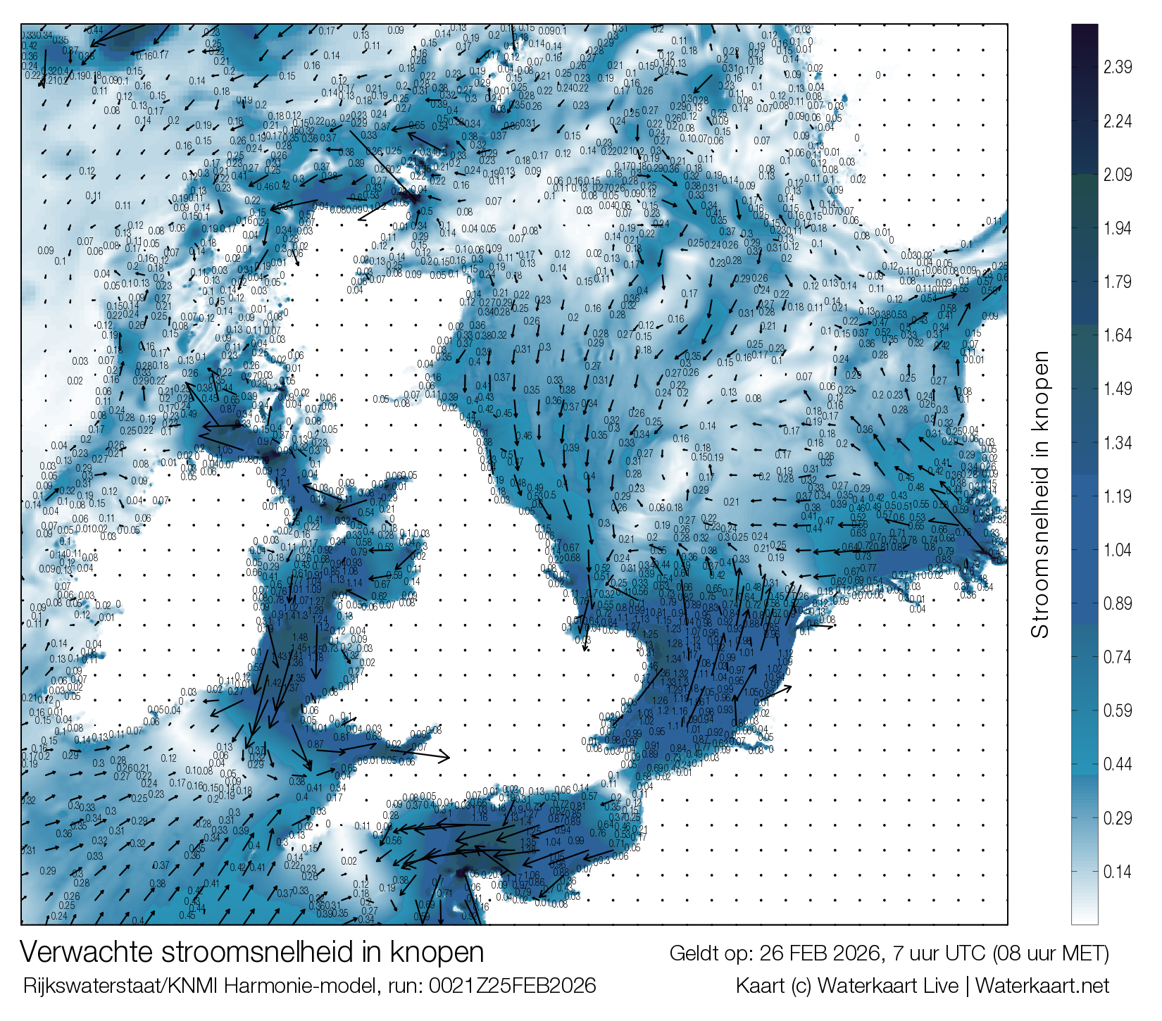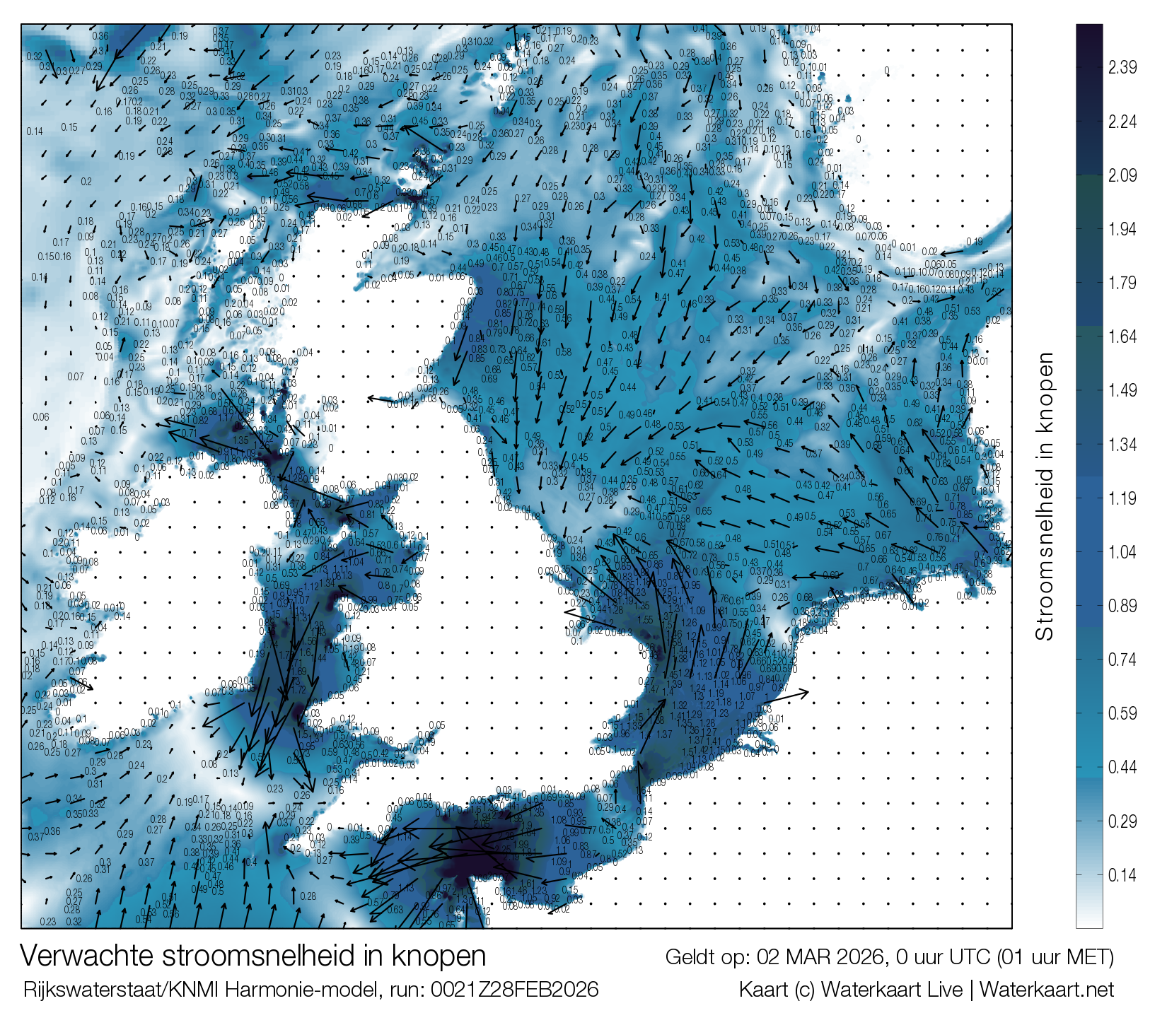 Stroomsnelheden in de Noordzee op basis van de Stroomatlas, verrekend met weersinvloeden. Deze worden iedere dag ververst met data uit het zeestromingen model van Rijkswaterstaat op basis van Harmonie weerdata, voor ieder uur een kaart, tot 48 uur in de toekomst. Lees hieronder meer over dit model