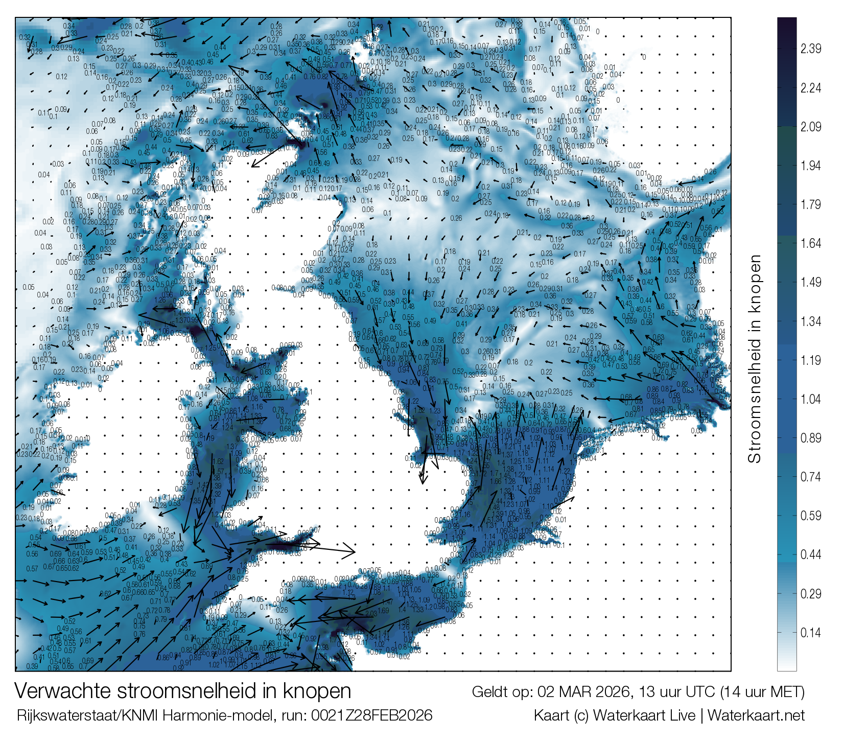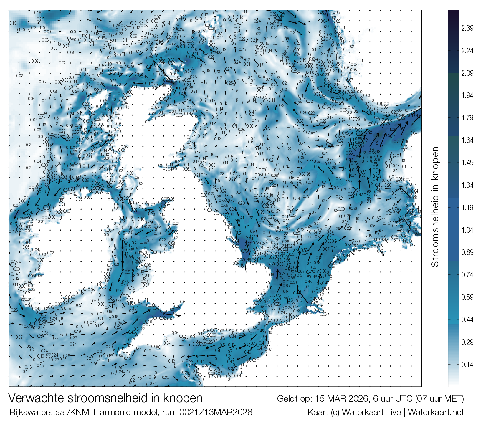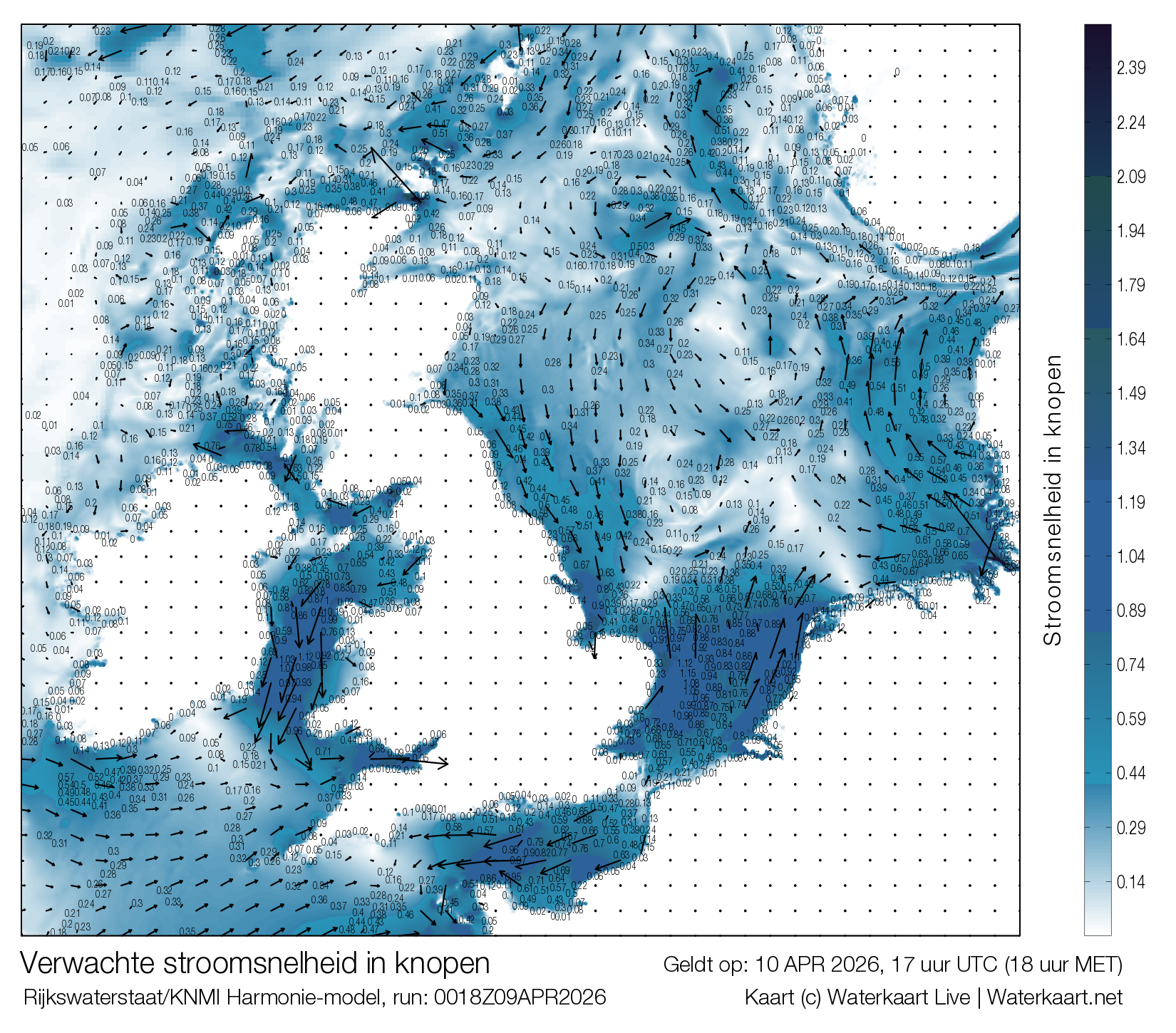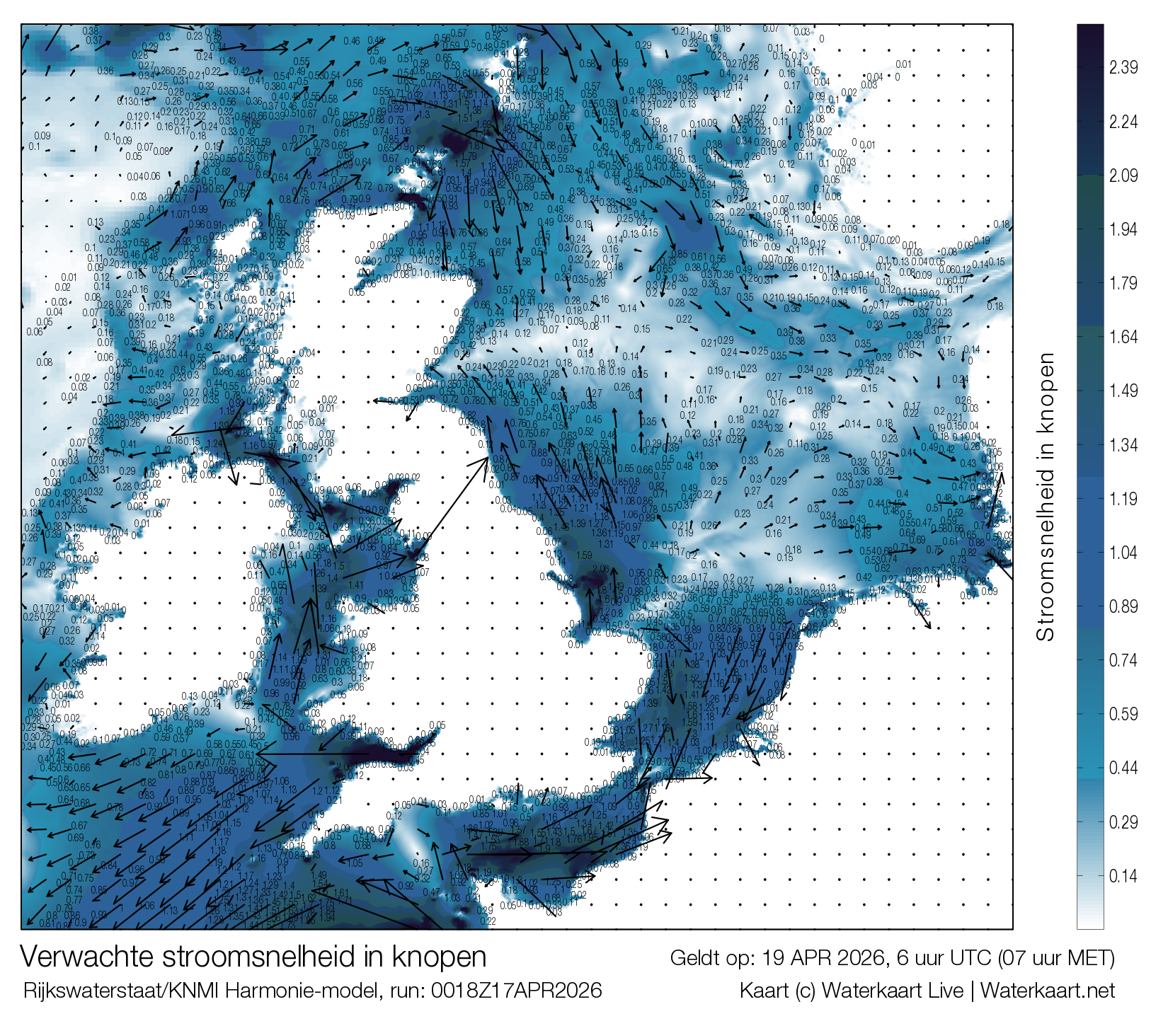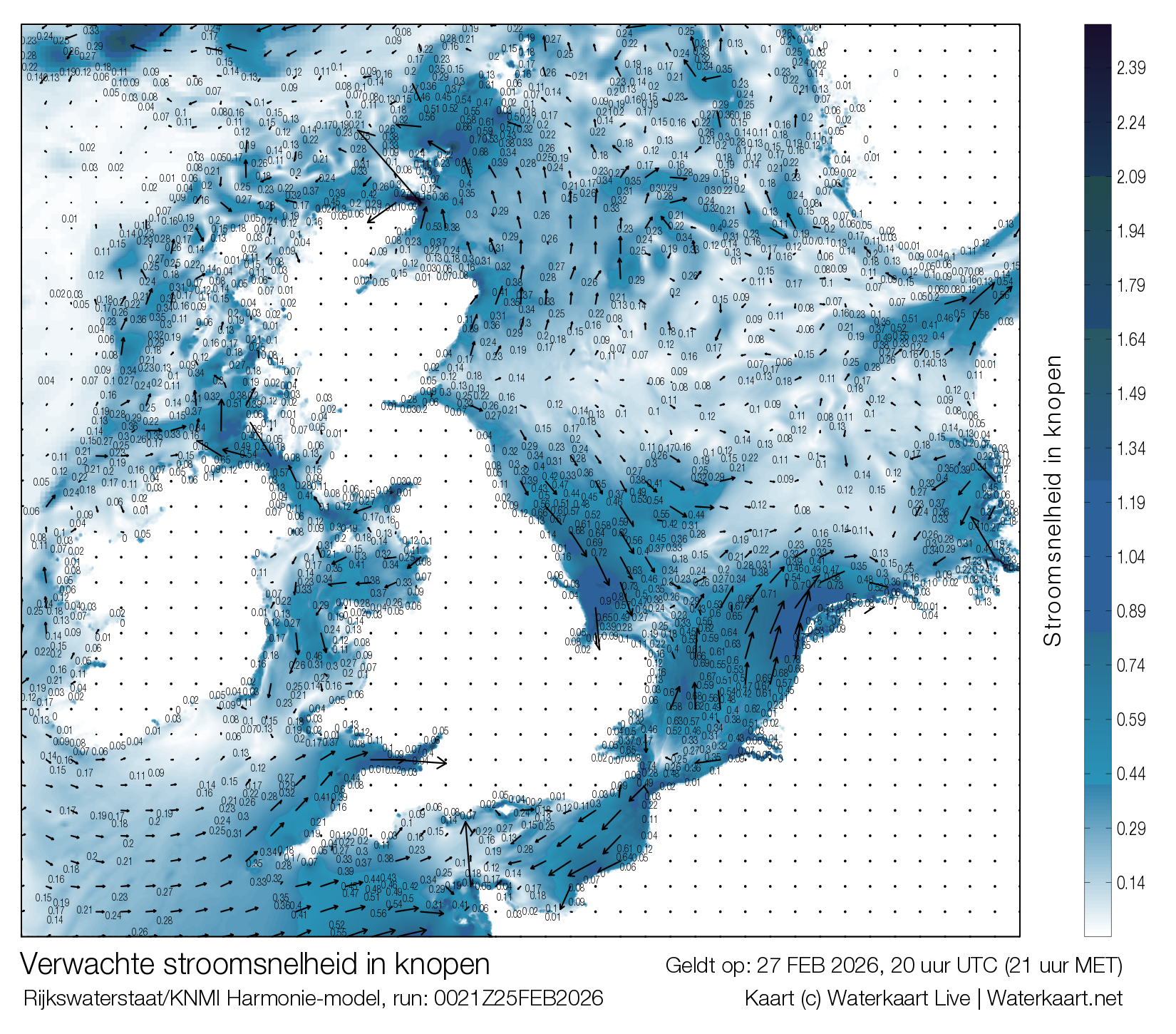 Stroomsnelheden in de Noordzee op basis van de Stroomatlas, verrekend met weersinvloeden. Deze worden iedere dag ververst met data uit het zeestromingen model van Rijkswaterstaat op basis van Harmonie weerdata, voor ieder uur een kaart, tot 48 uur in de toekomst. Lees hieronder meer over dit model