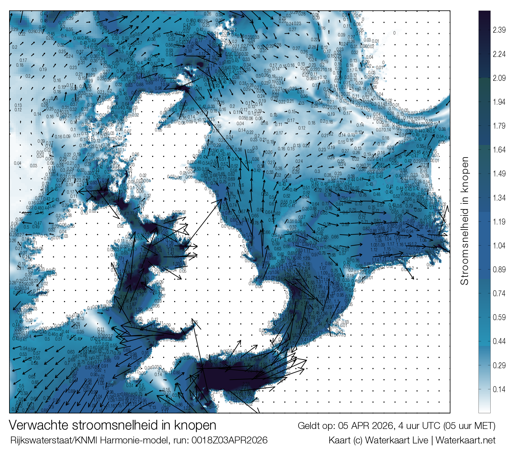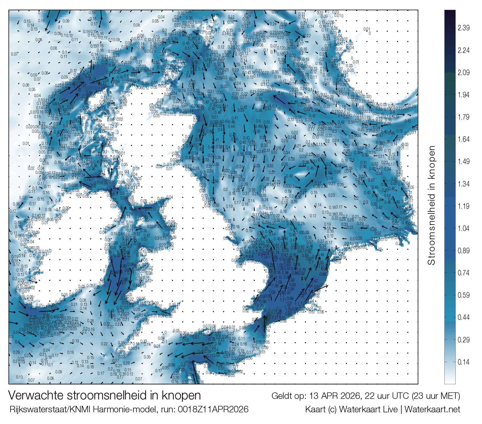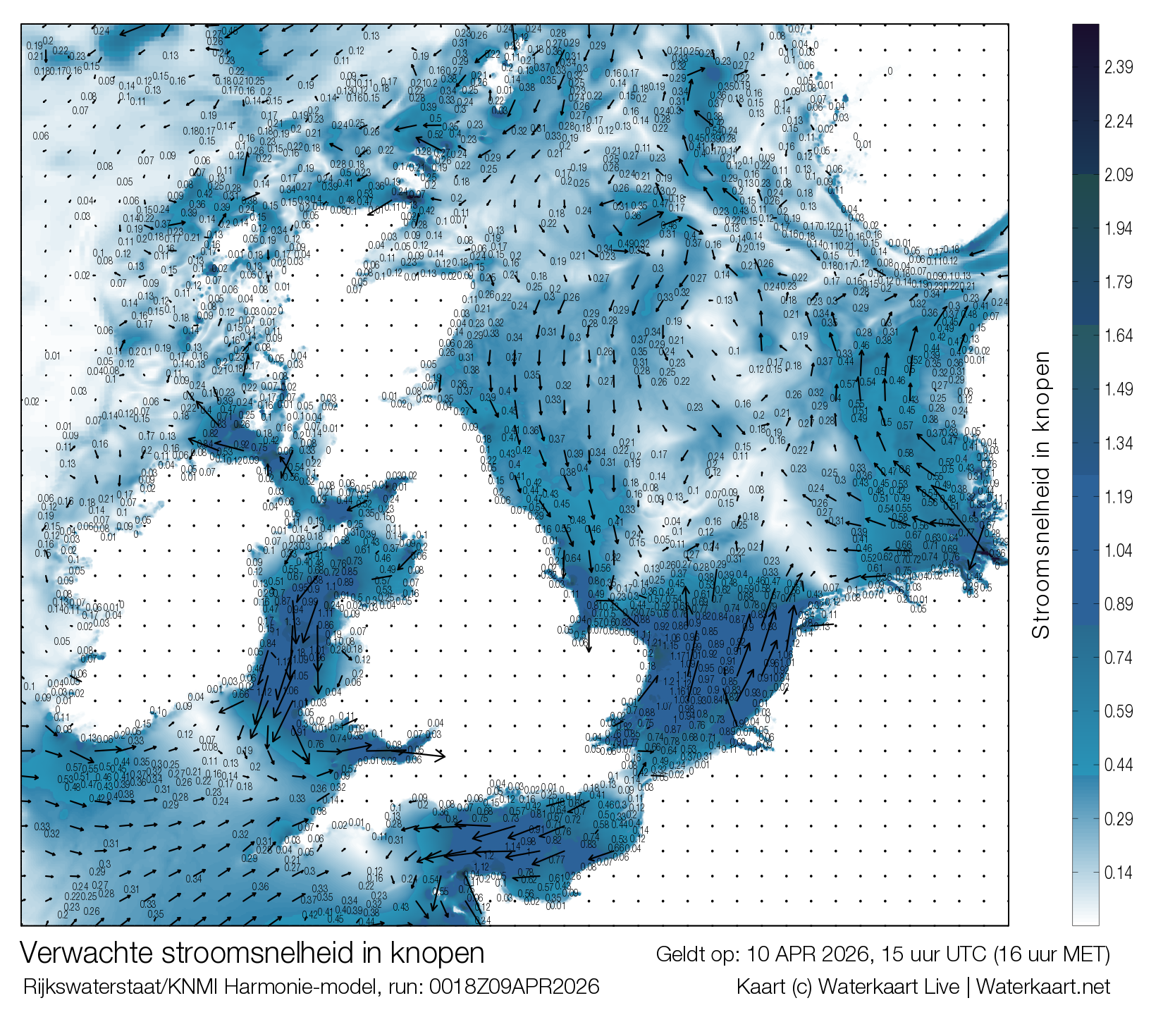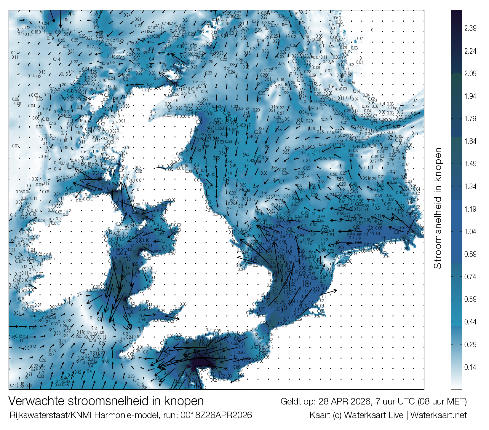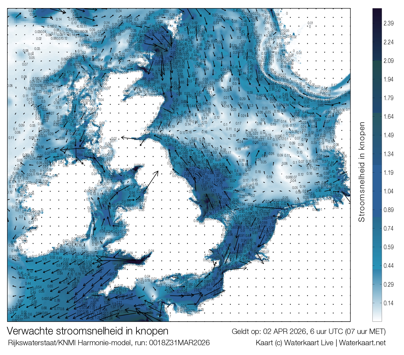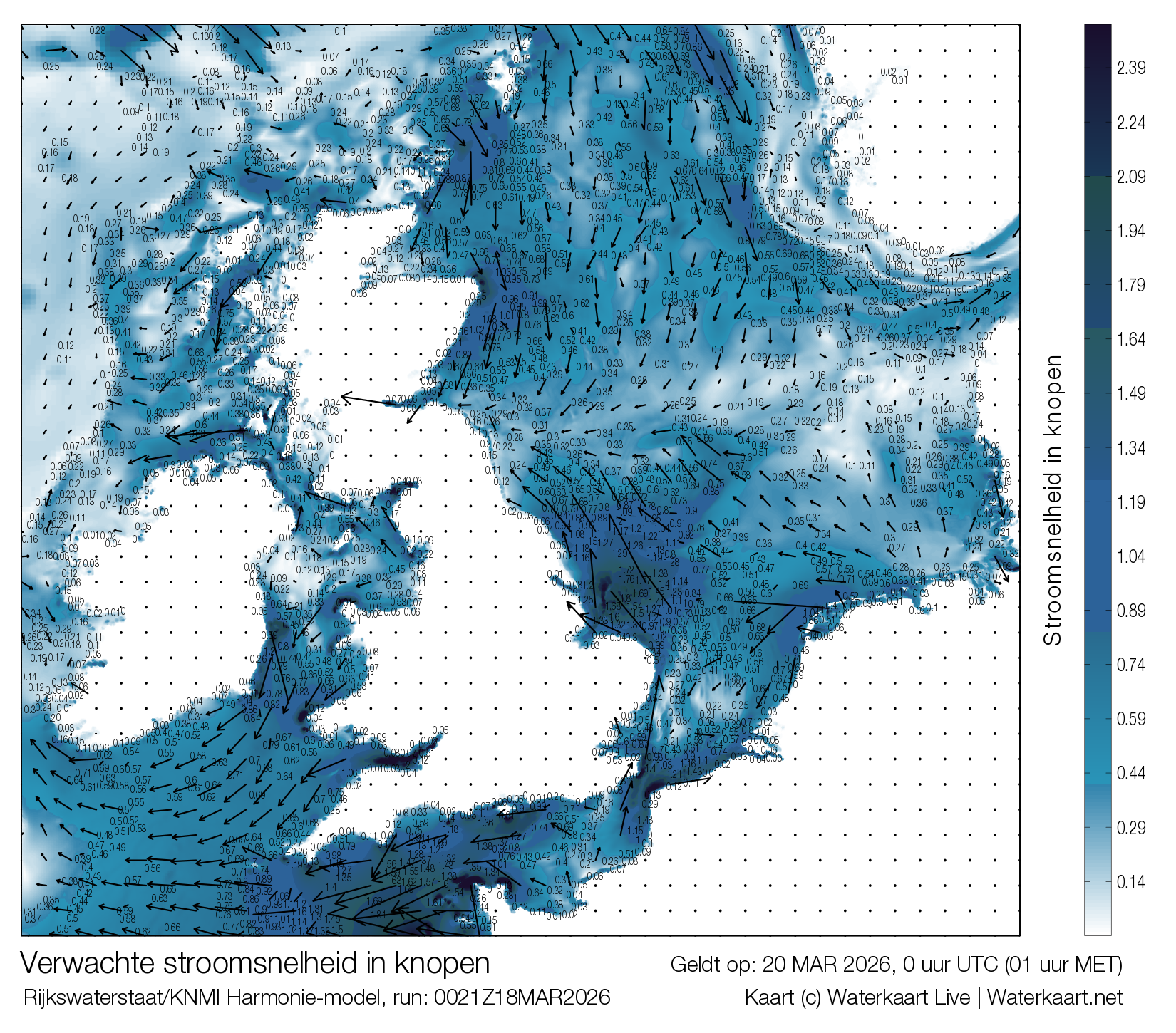 Stroomsnelheden in de Noordzee op basis van de Stroomatlas, verrekend met weersinvloeden. Deze worden iedere dag ververst met data uit het zeestromingen model van Rijkswaterstaat op basis van Harmonie weerdata, voor ieder uur een kaart, tot 48 uur in de toekomst. Lees hieronder meer over dit model