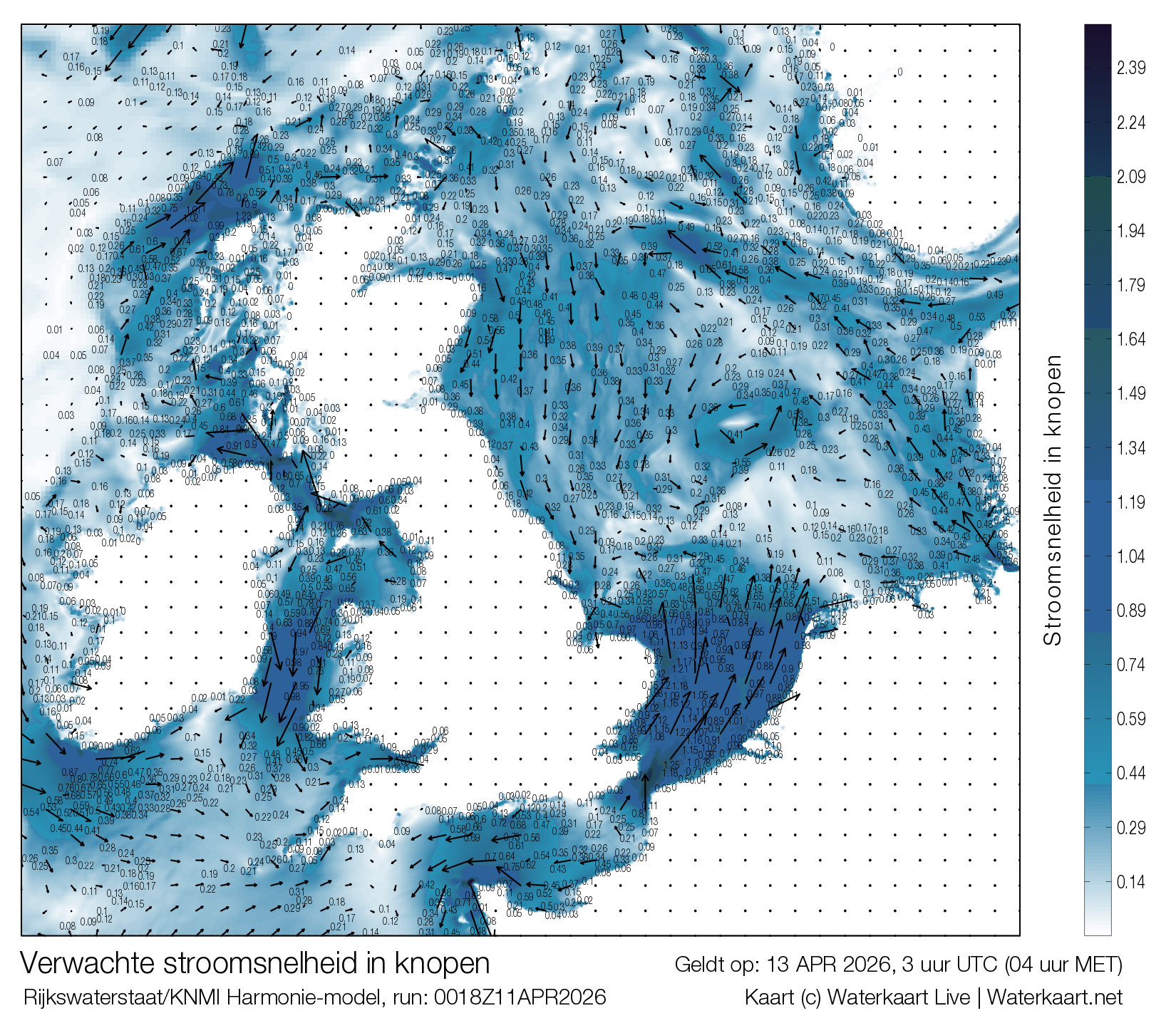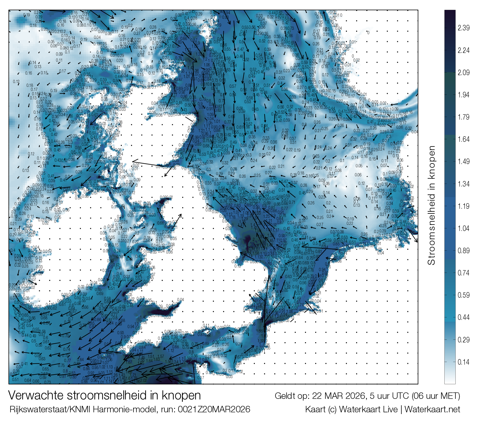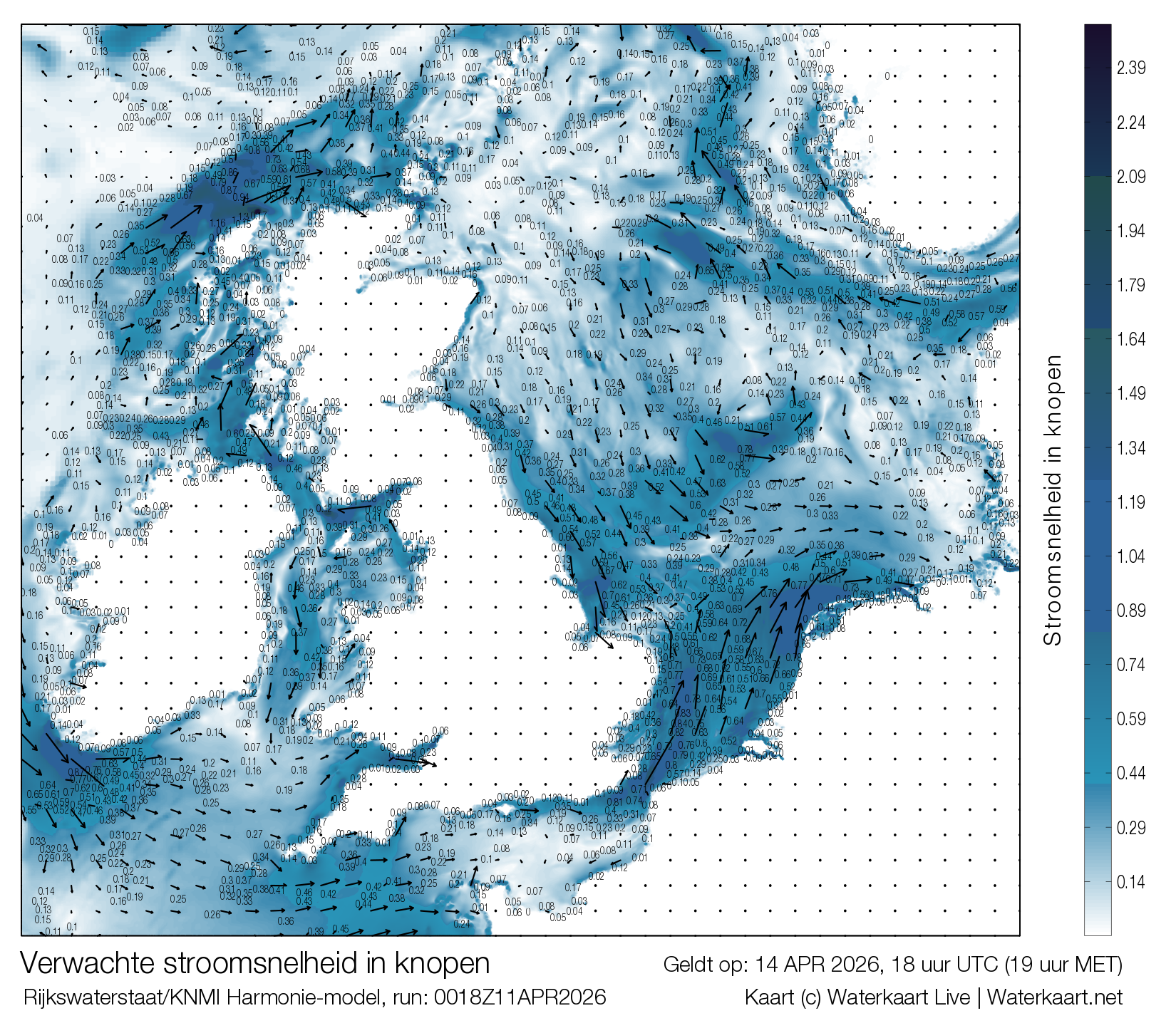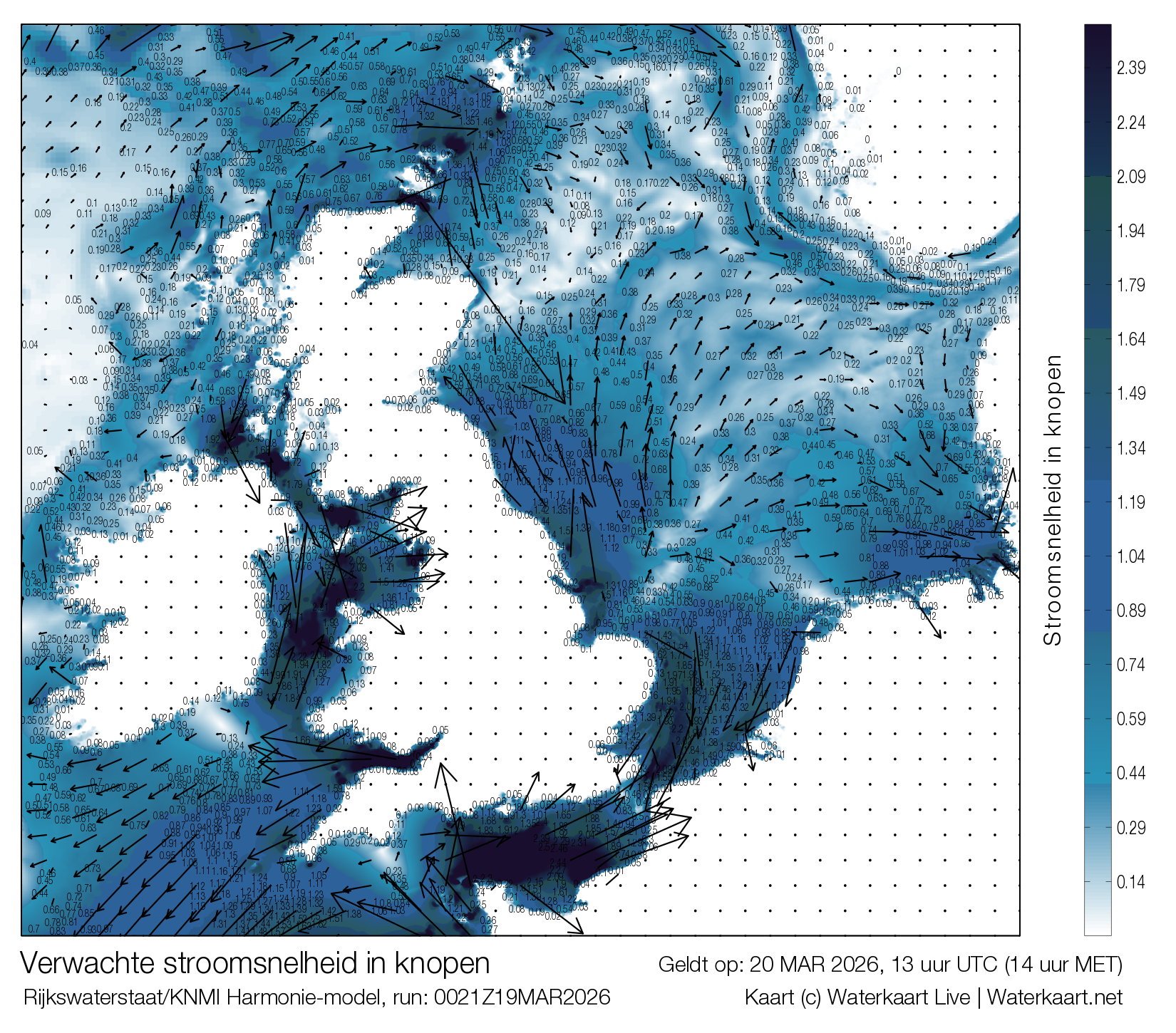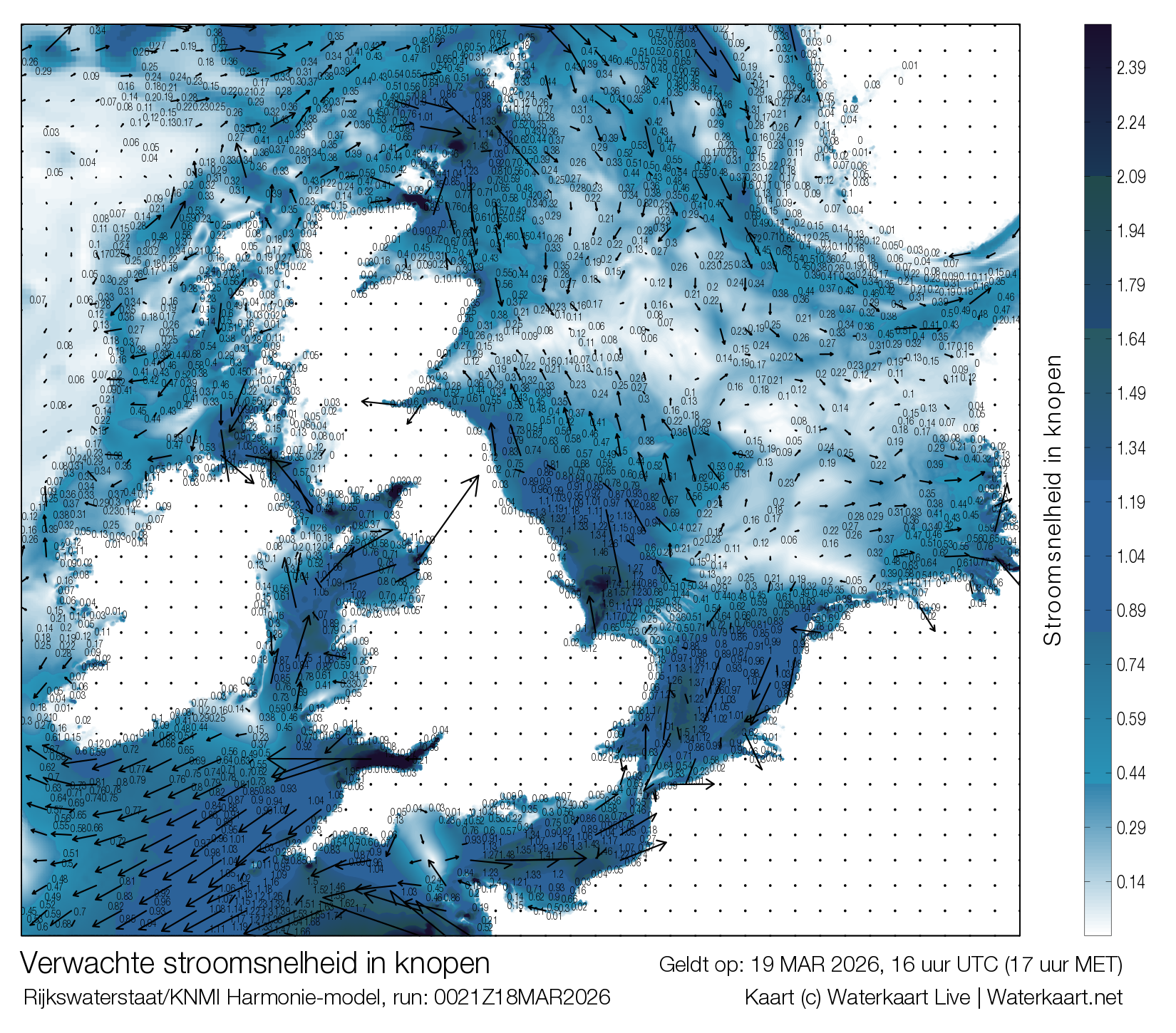 Stroomsnelheden in de Noordzee op basis van de Stroomatlas, verrekend met weersinvloeden. Deze worden iedere dag ververst met data uit het zeestromingen model van Rijkswaterstaat op basis van Harmonie weerdata, voor ieder uur een kaart, tot 48 uur in de toekomst. Lees hieronder meer over dit model