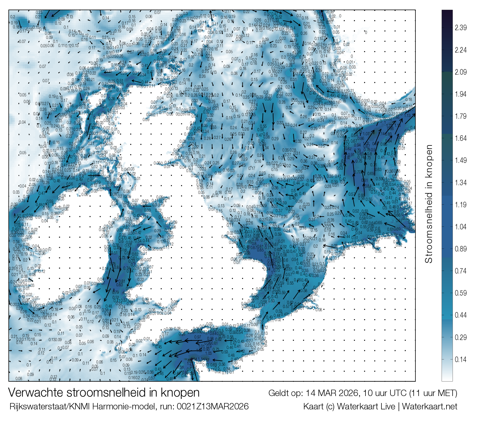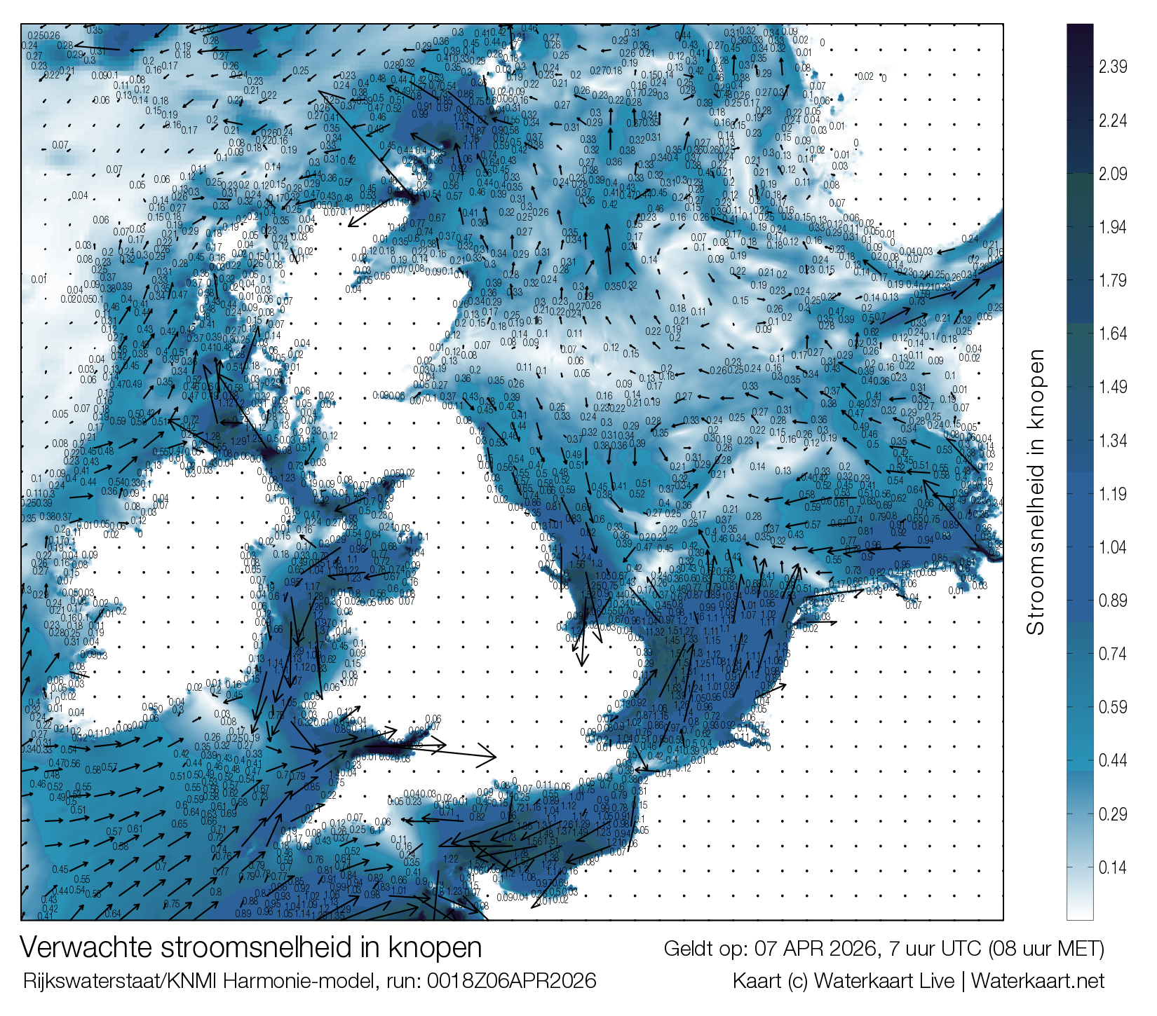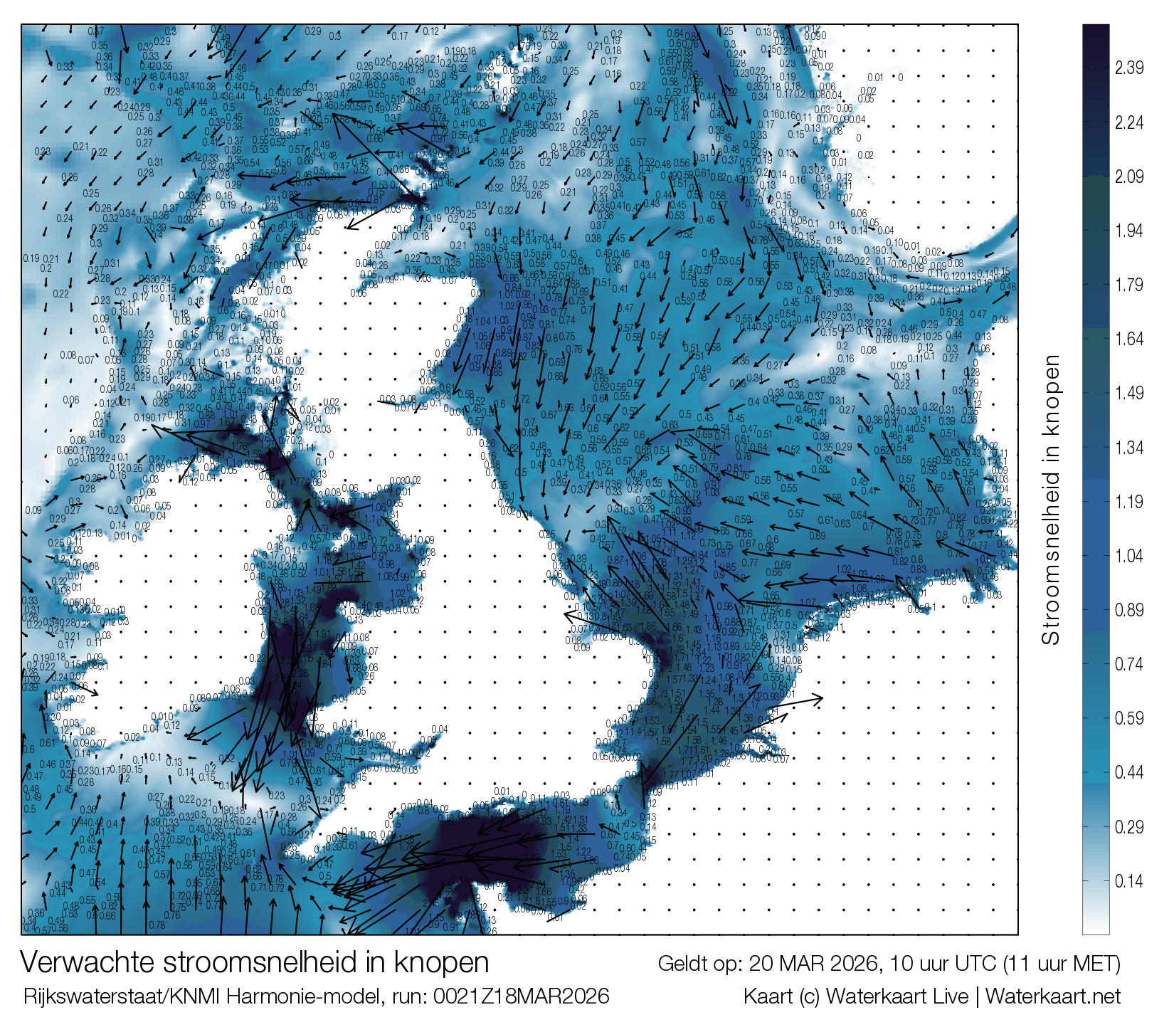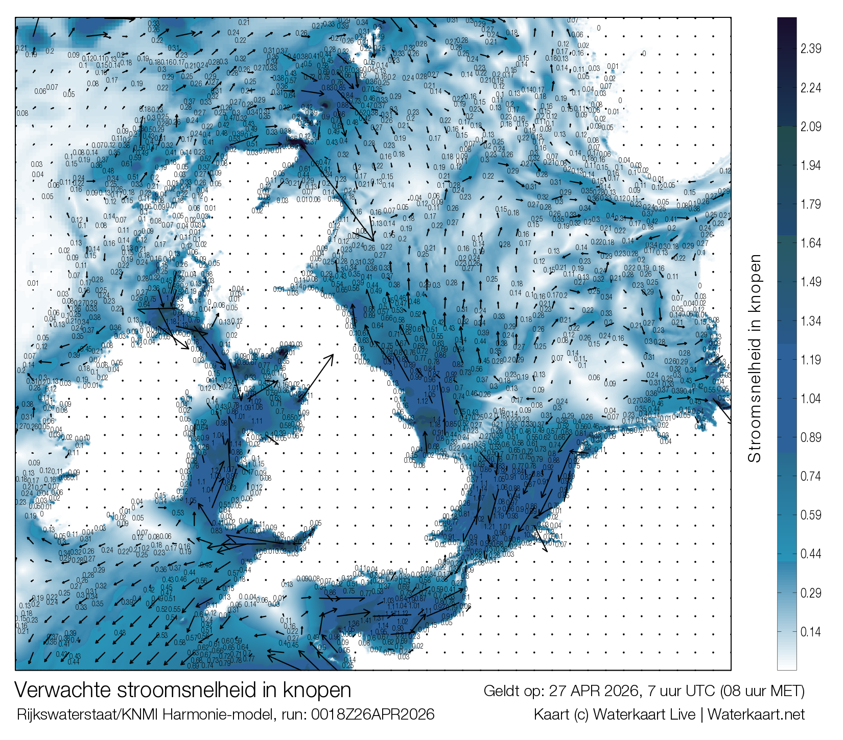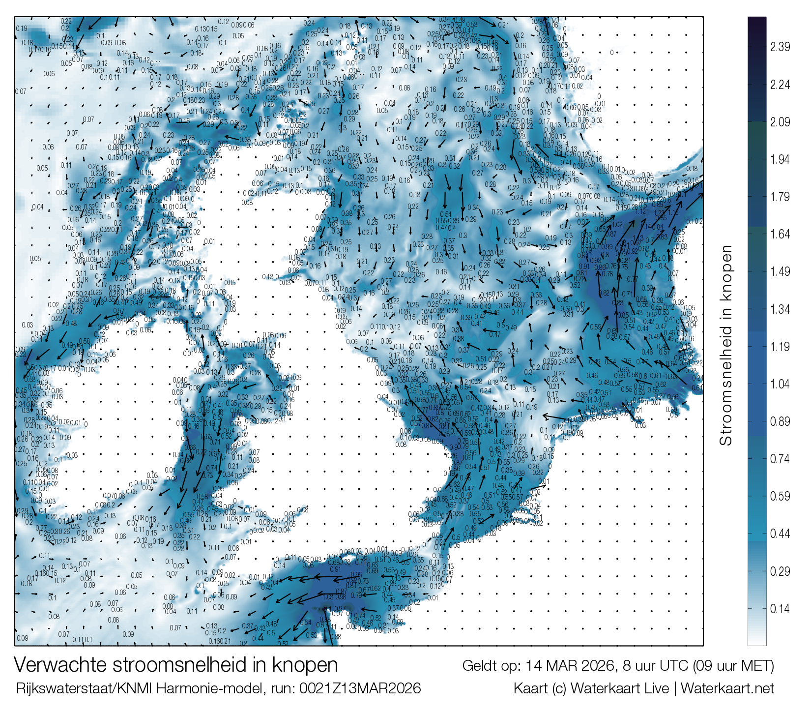 Stroomsnelheden in de Noordzee op basis van de Stroomatlas, verrekend met weersinvloeden. Deze worden iedere dag ververst met data uit het zeestromingen model van Rijkswaterstaat op basis van Harmonie weerdata, voor ieder uur een kaart, tot 48 uur in de toekomst. Lees hieronder meer over dit model