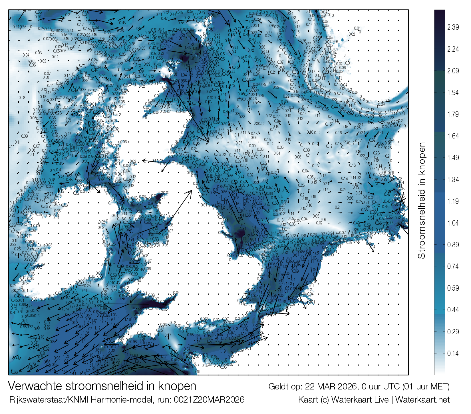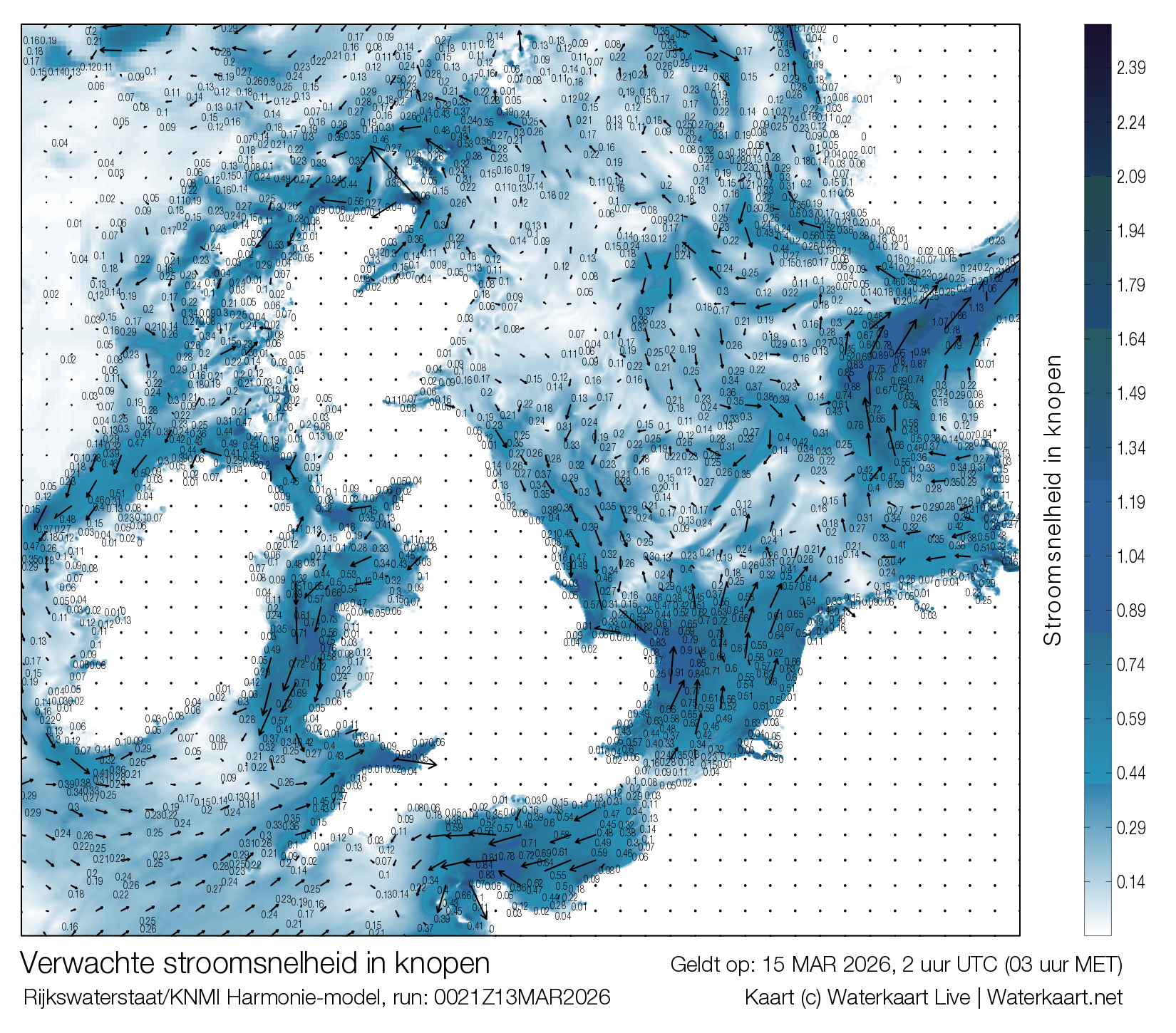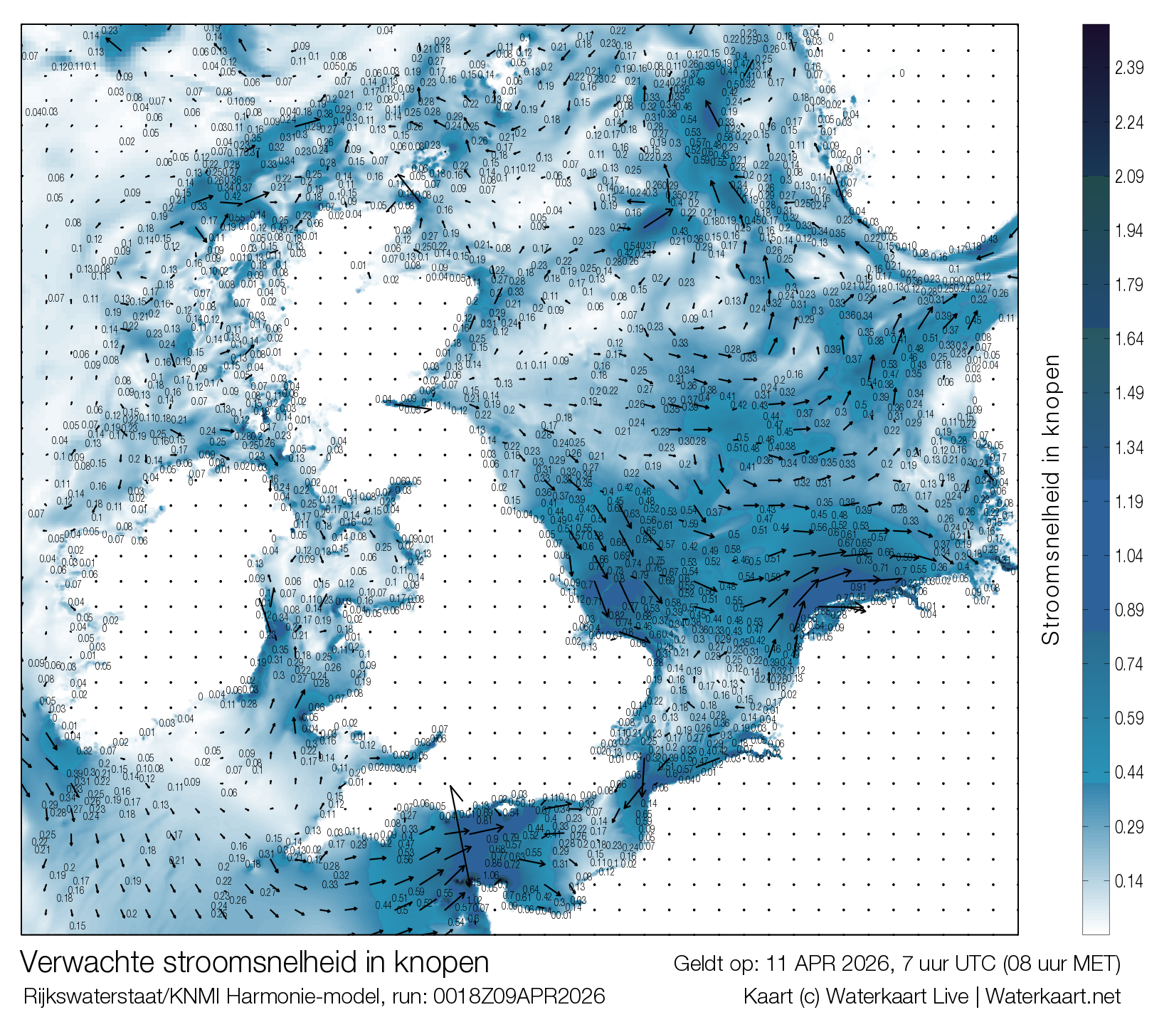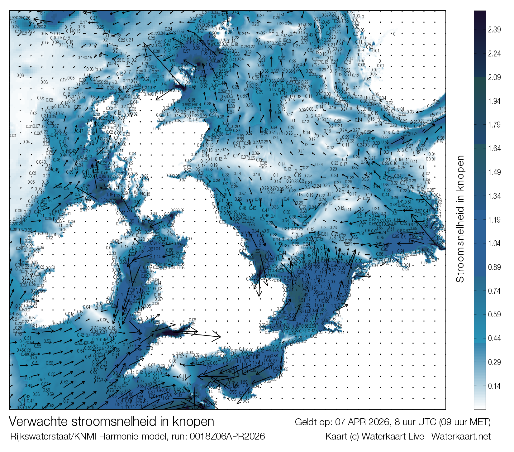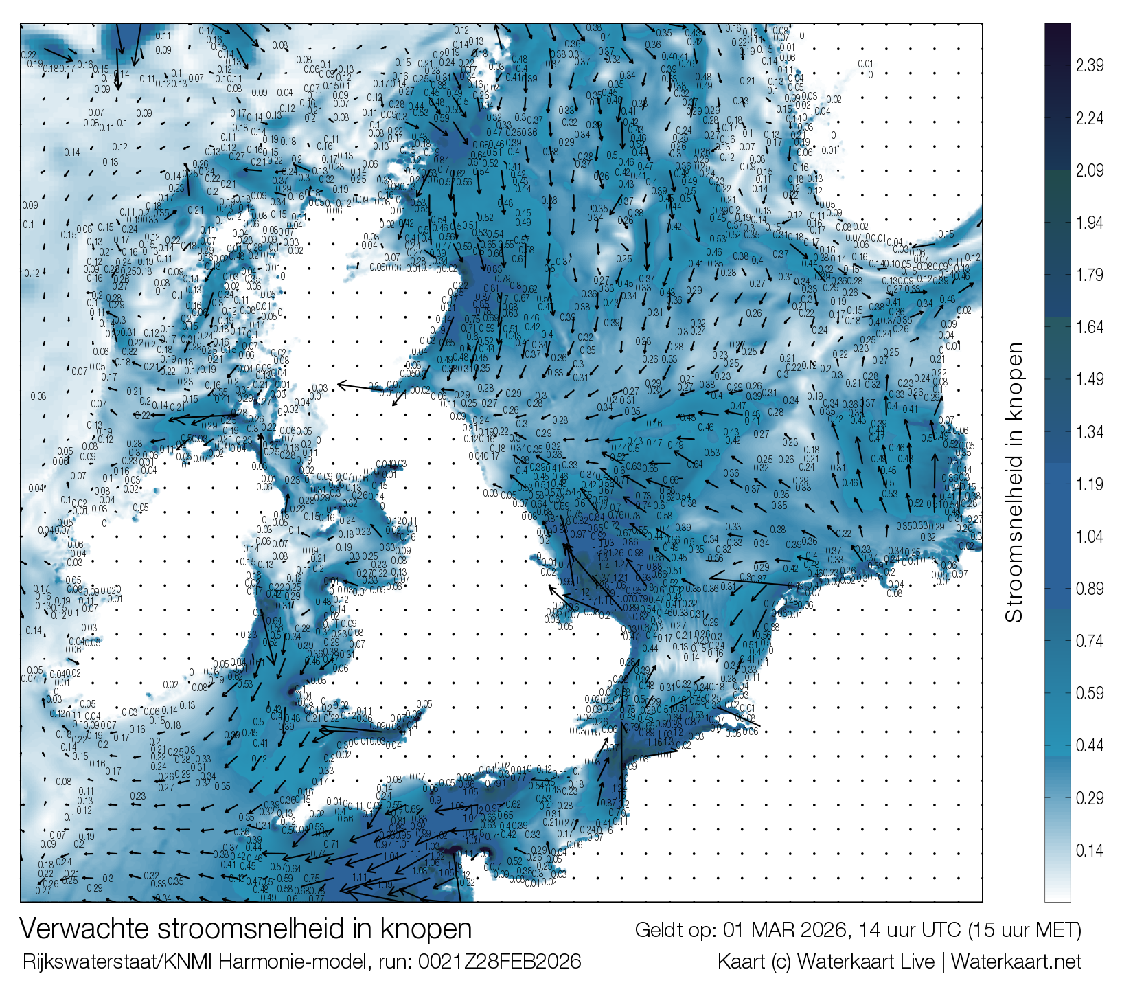 Stroomsnelheden in de Noordzee op basis van de Stroomatlas, verrekend met weersinvloeden. Deze worden iedere dag ververst met data uit het zeestromingen model van Rijkswaterstaat op basis van Harmonie weerdata, voor ieder uur een kaart, tot 48 uur in de toekomst. Lees hieronder meer over dit model