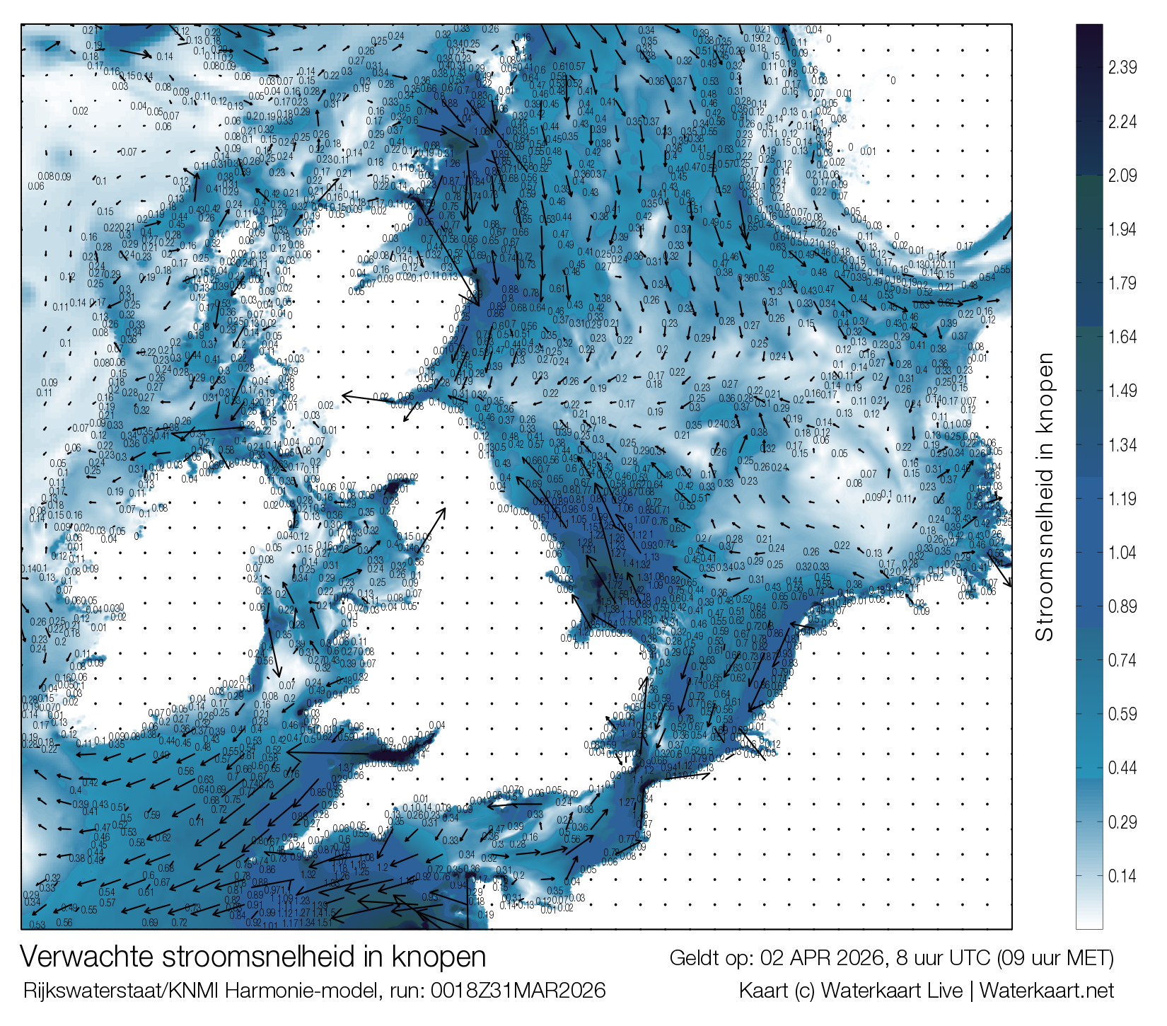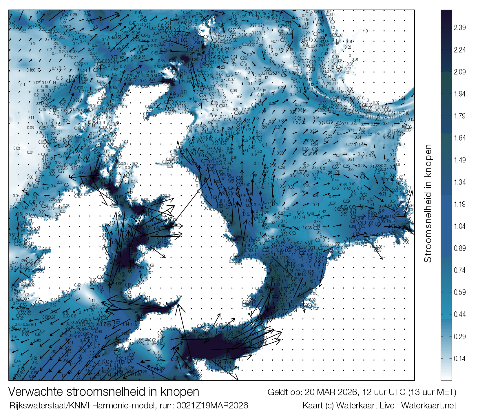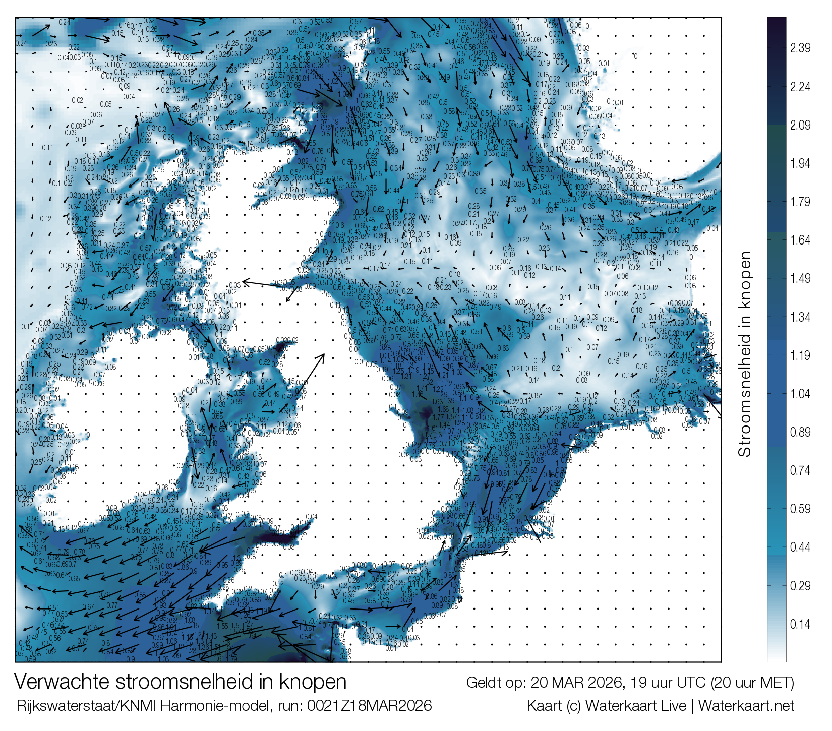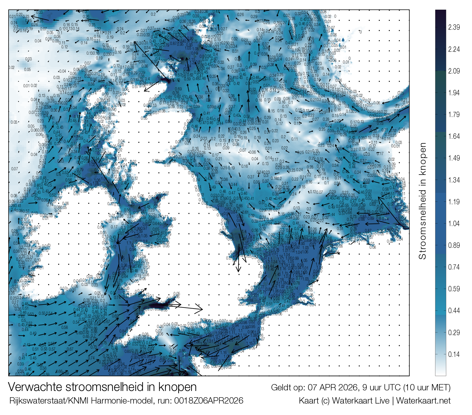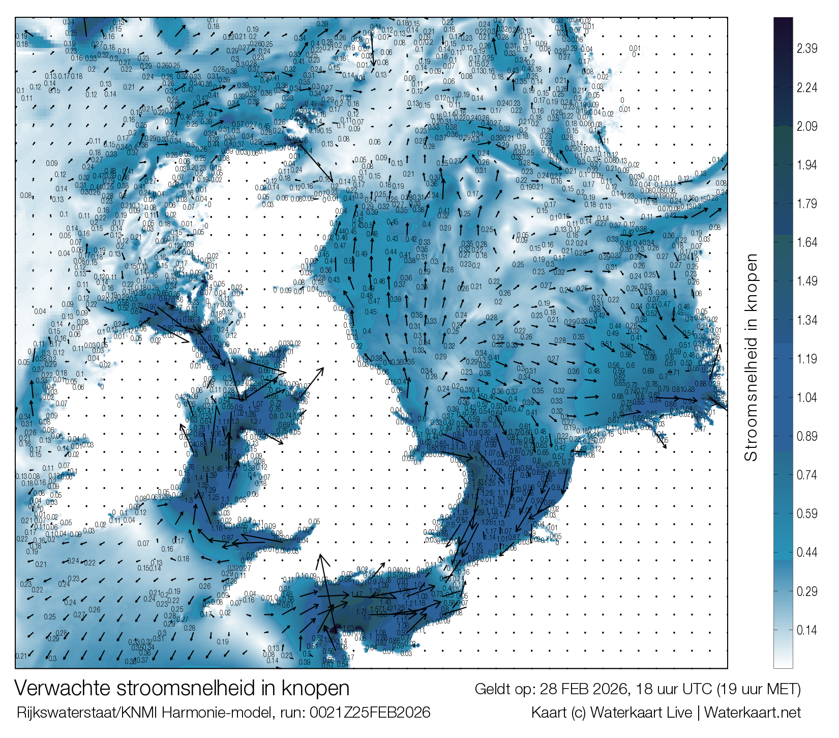 Stroomsnelheden in de Noordzee op basis van de Stroomatlas, verrekend met weersinvloeden. Deze worden iedere dag ververst met data uit het zeestromingen model van Rijkswaterstaat op basis van Harmonie weerdata, voor ieder uur een kaart, tot 48 uur in de toekomst. Lees hieronder meer over dit model